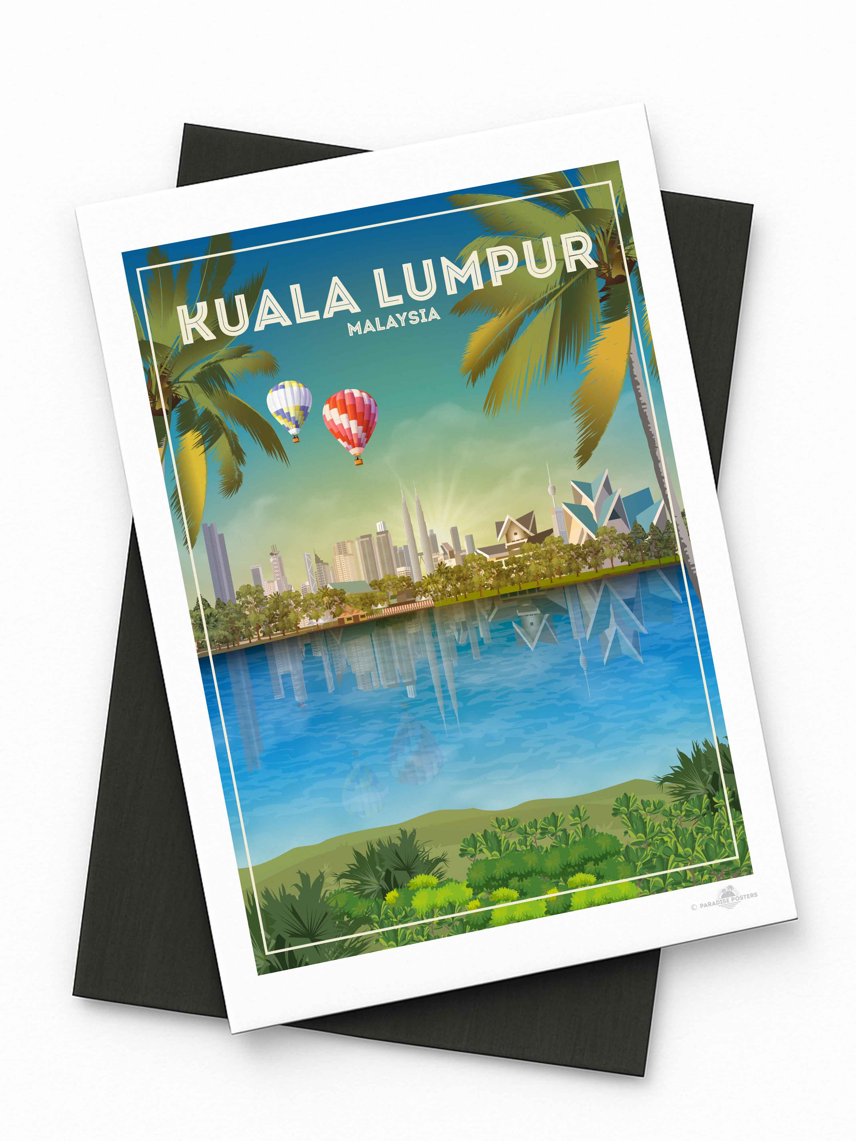 Our poster design shows the wonderful Kuala Lumpur skyline from across Lake Titiwangsa (which is just as breath-taking at night time). Some of the citys main buildings can be seen including the TM Tower, home of Telekom Malaysia. Also visible is the Petronas Towers; a twin tower building that stand is one of the tallest in the world at 452 metres high, which makes it a great sightseeing spot. One of the most quirky buildings to be seen is the Istana Budaya to the right of the design, which is also known as the Palace of Culture. Officially opened in 1999 following a 3yr construction, it serves as Malaysias main venue for theatre performances of all kinds.