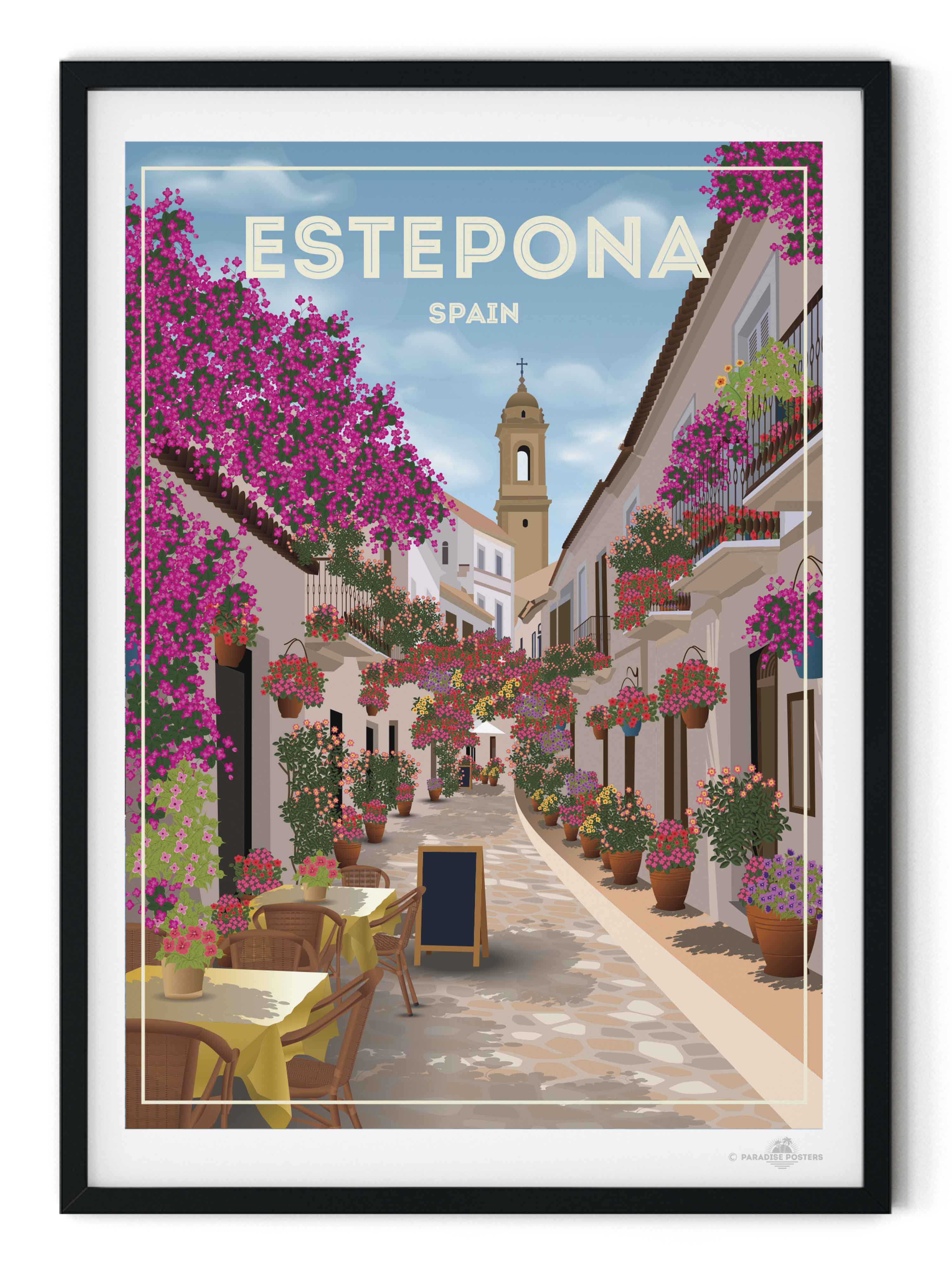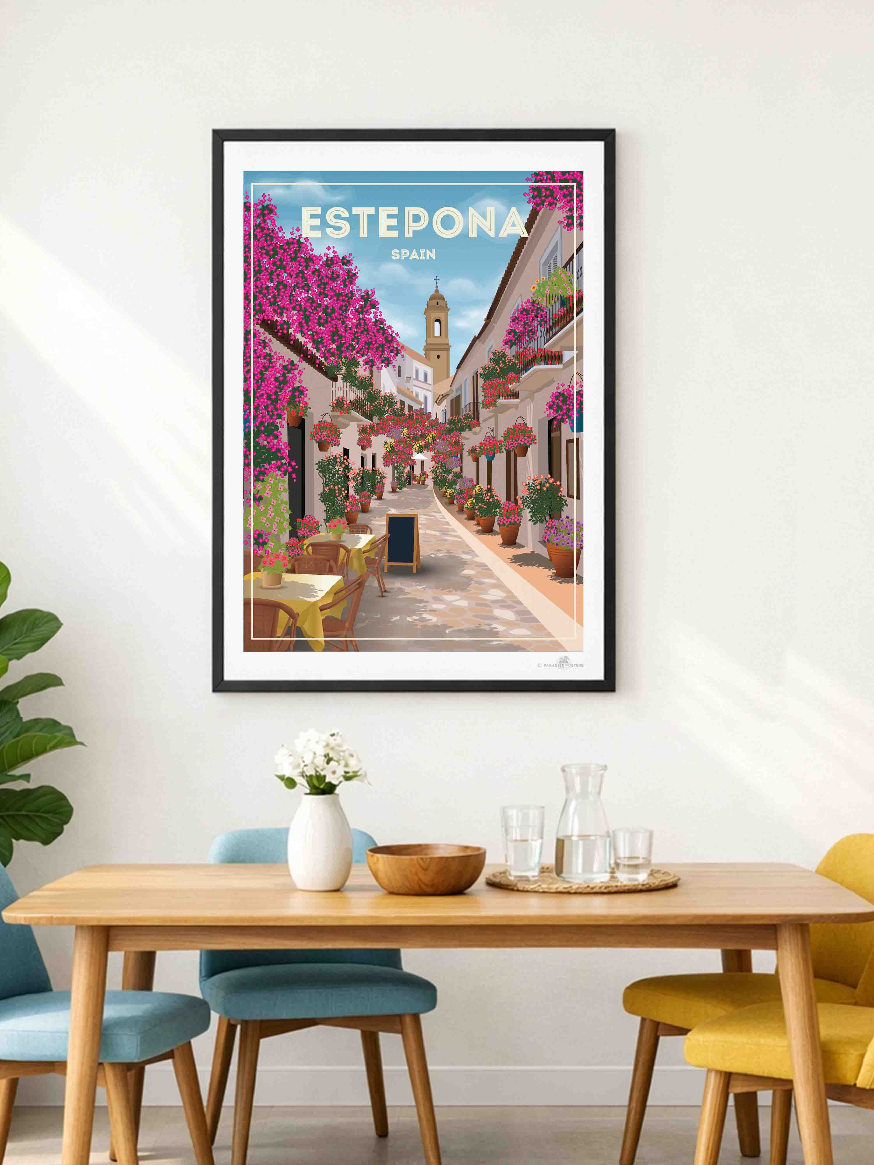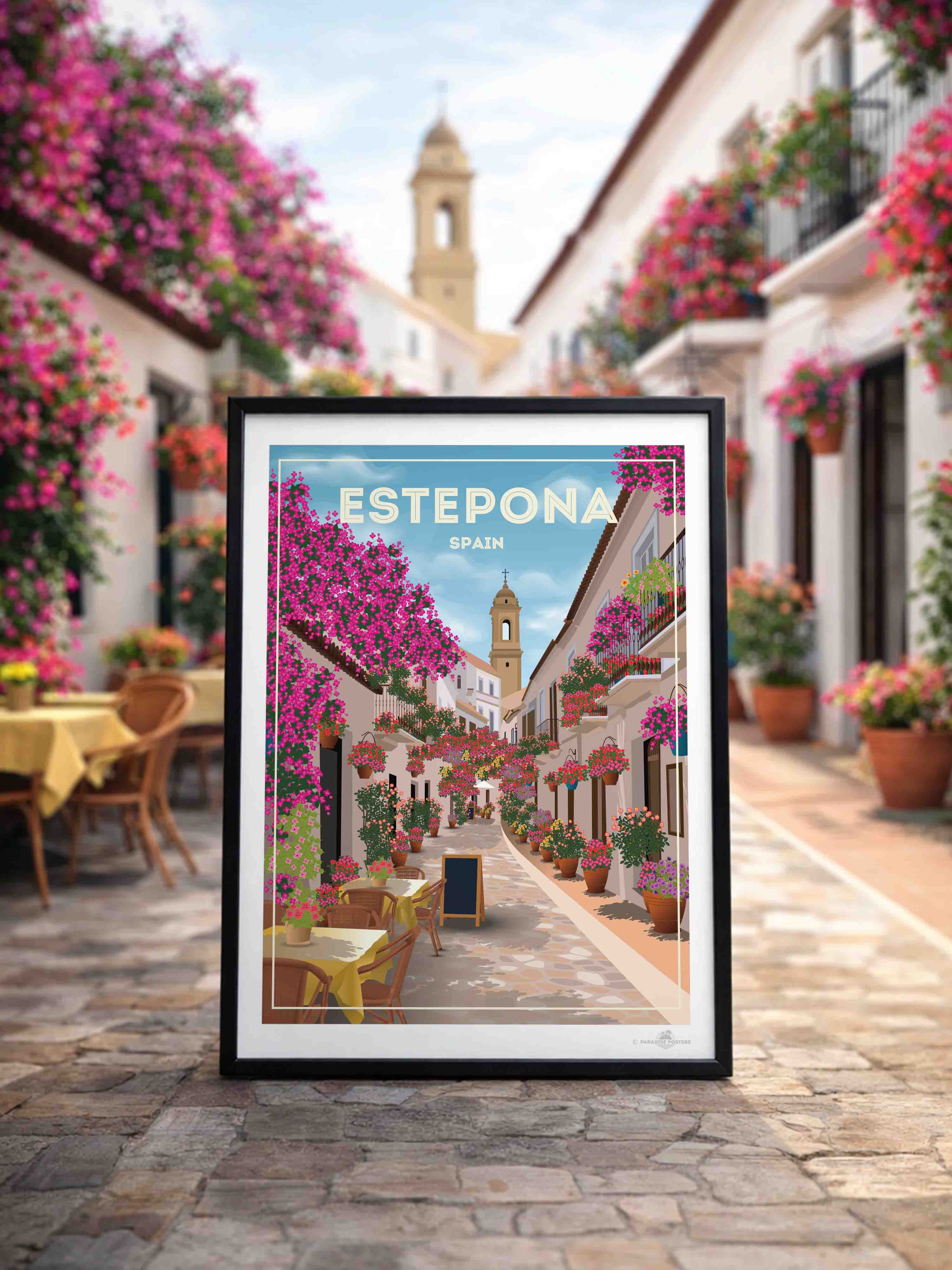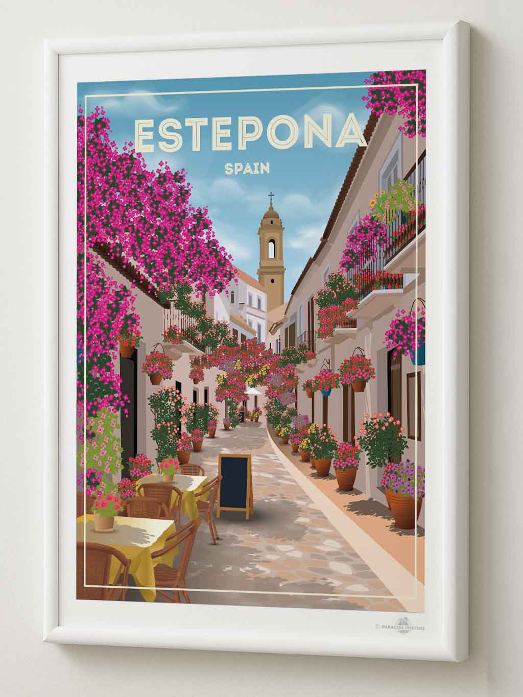 Step into the charming streets of Estepona, Spain, where vibrant bougainvillea spills over whitewashed buildings under a serene sky. This beautifully detailed art print captures the quaint, sunlit alleyways and colourful floral displays that bring warmth and life to any space.