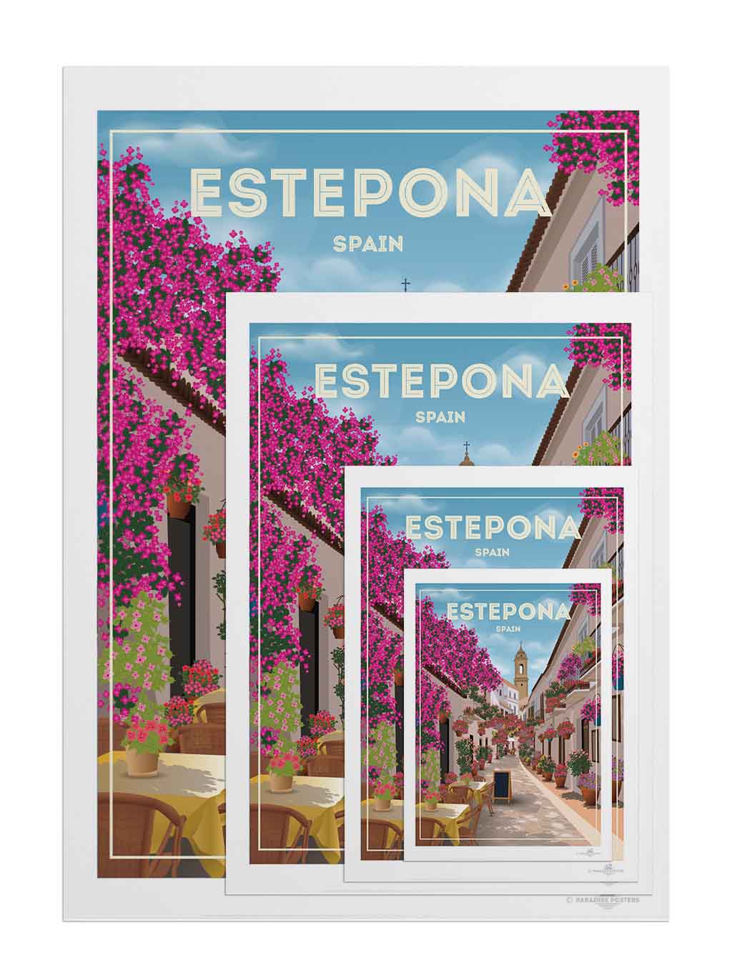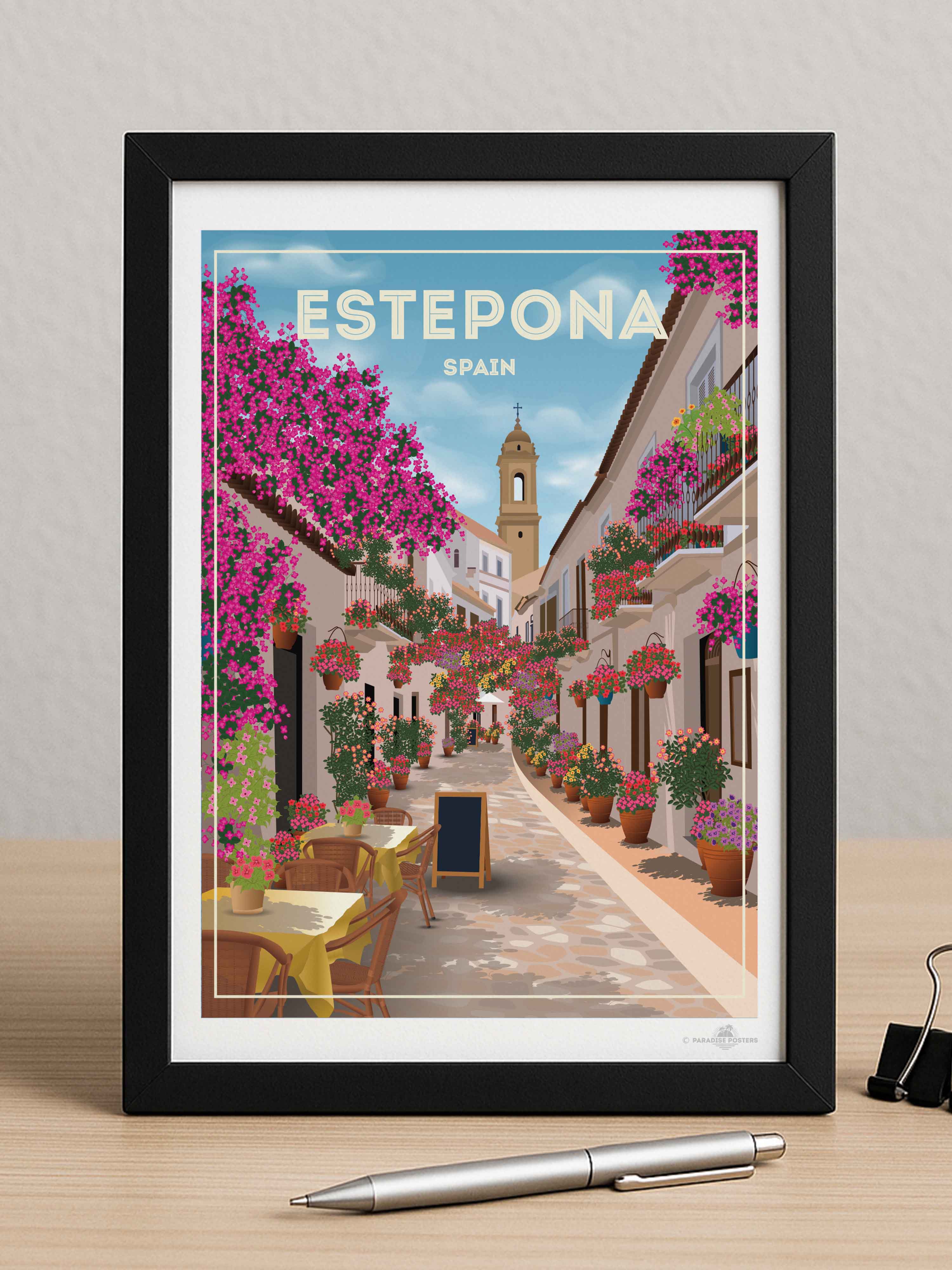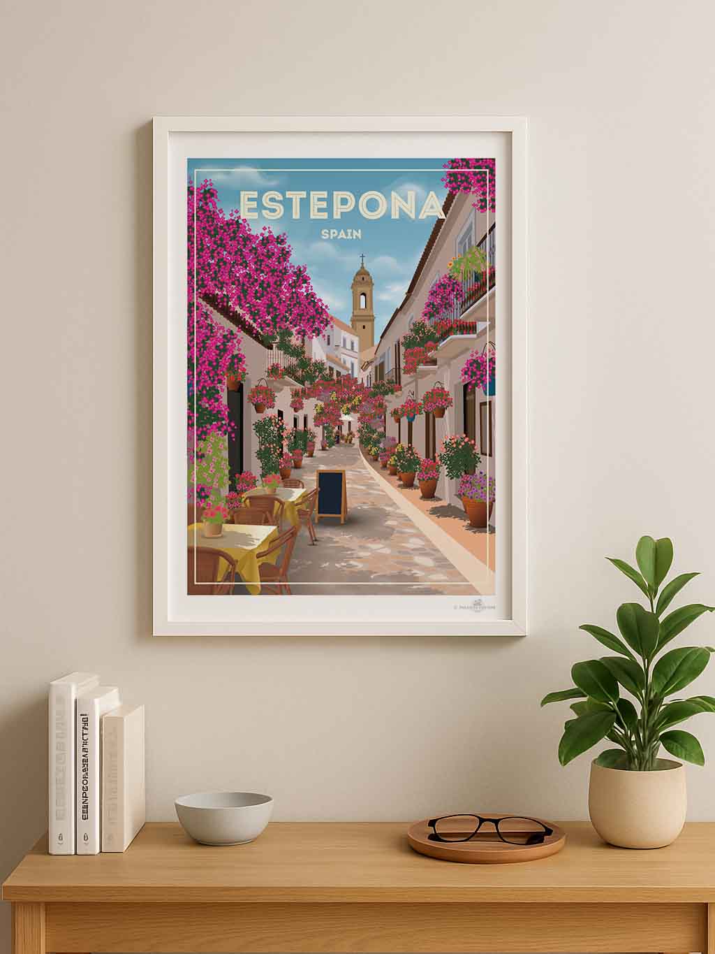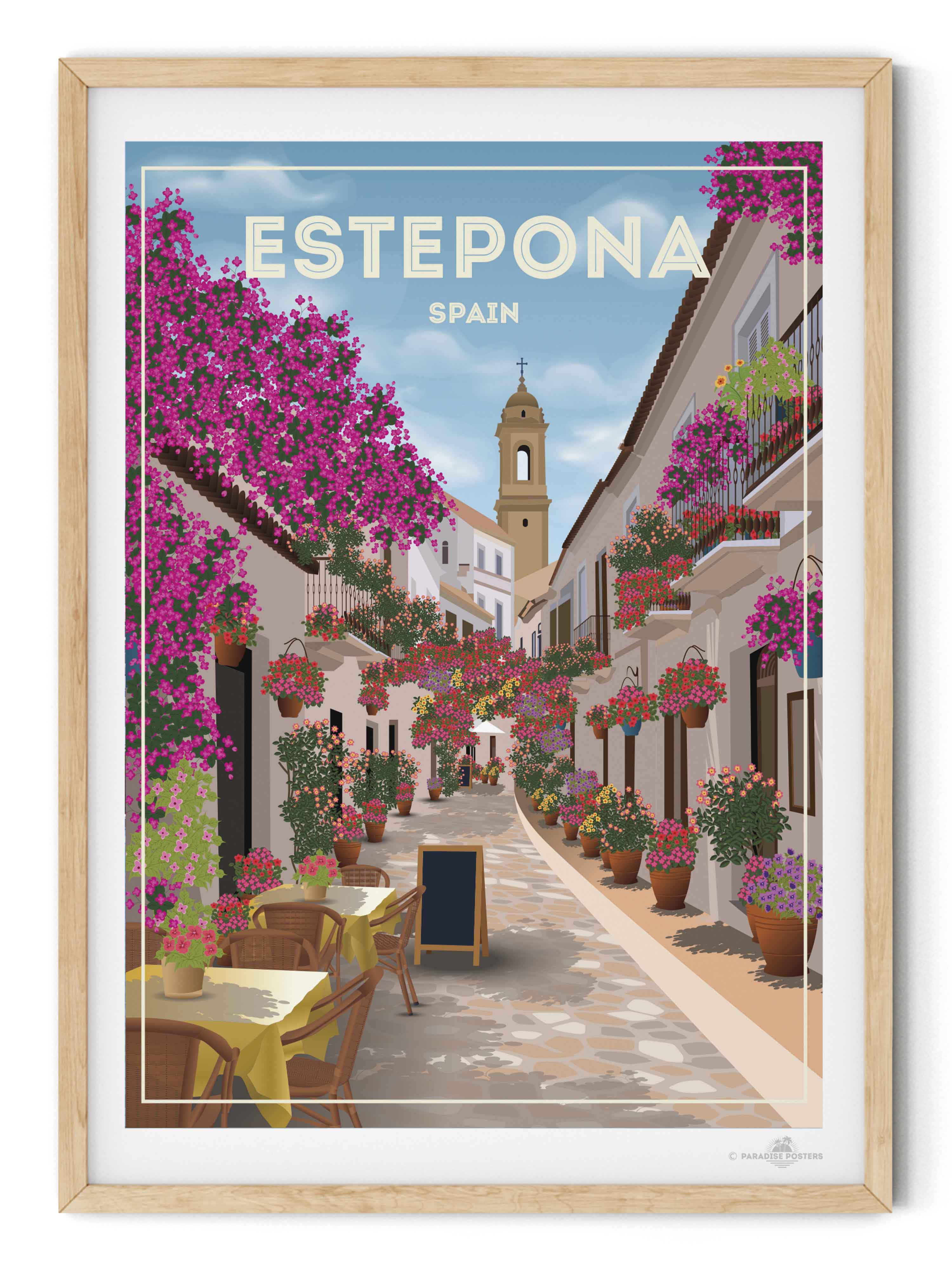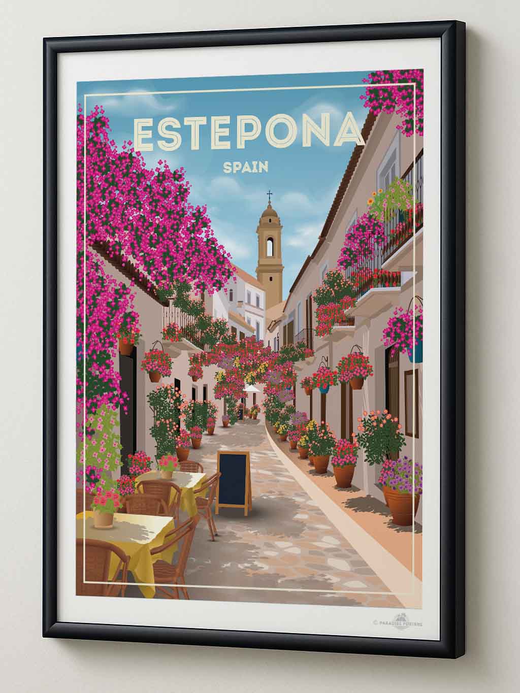 Step into the charming streets of Estepona, Spain, where vibrant bougainvillea spills over whitewashed buildings under a serene sky. This beautifully detailed art print captures the quaint, sunlit alleyways and colourful floral displays that bring warmth and life to any space.