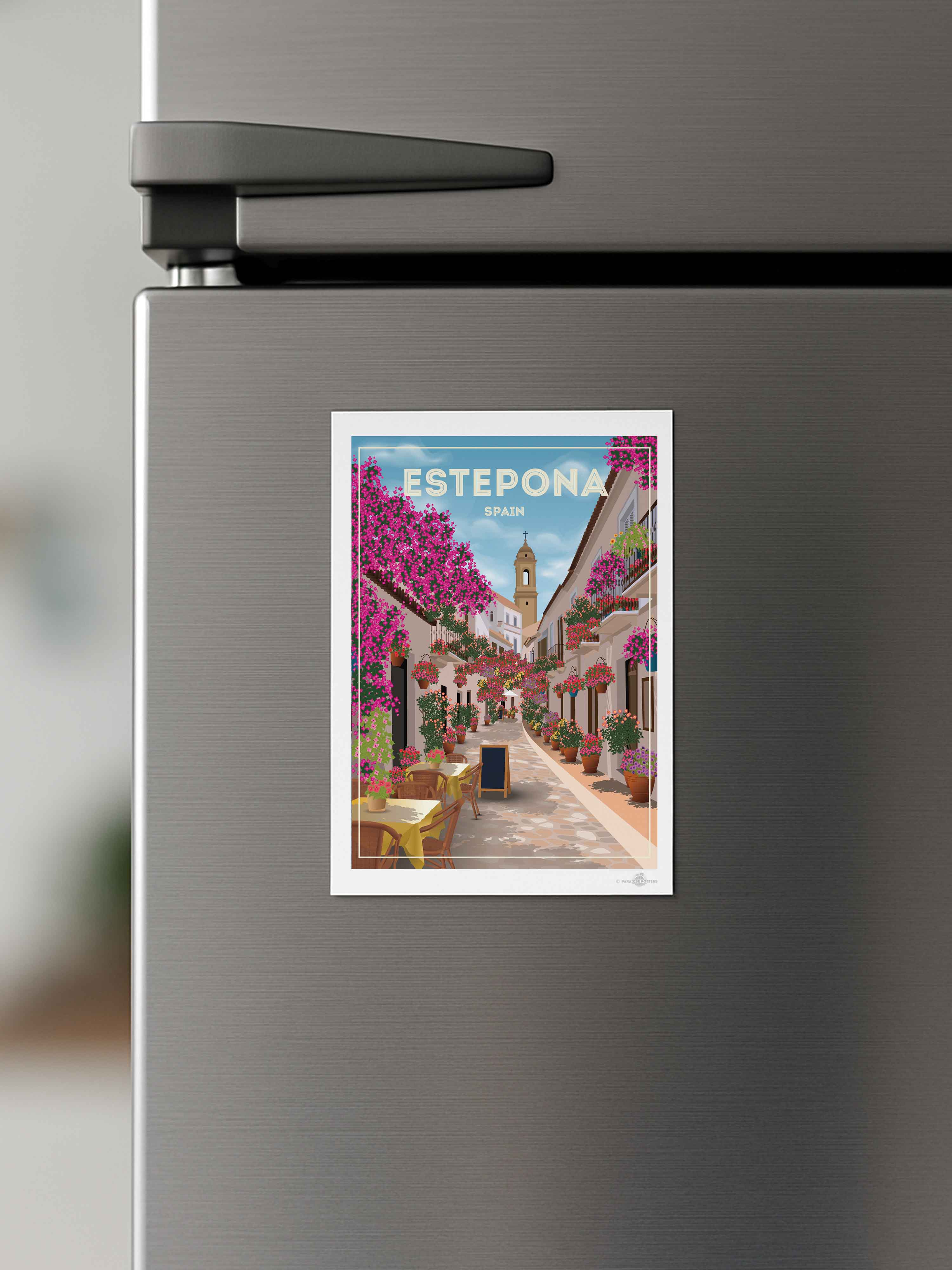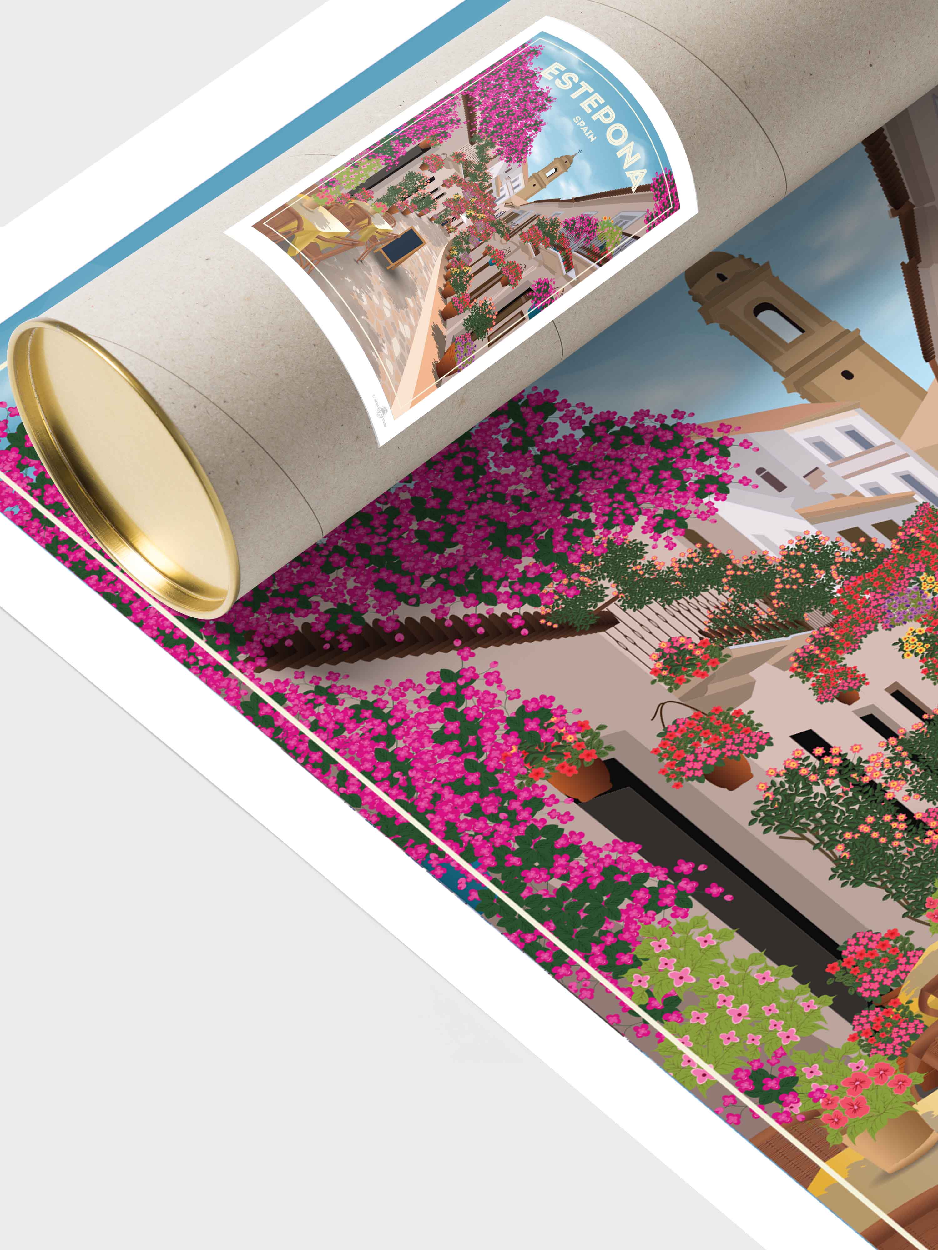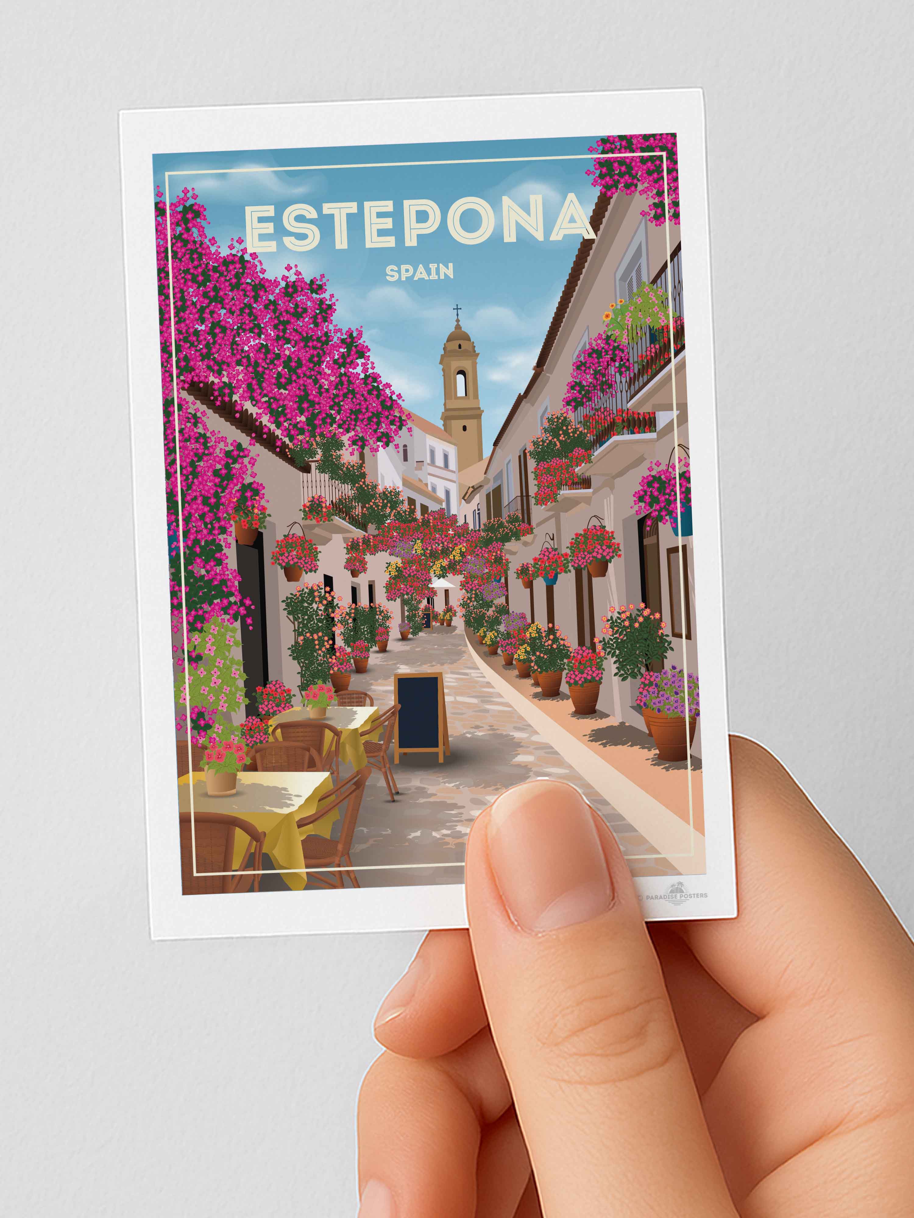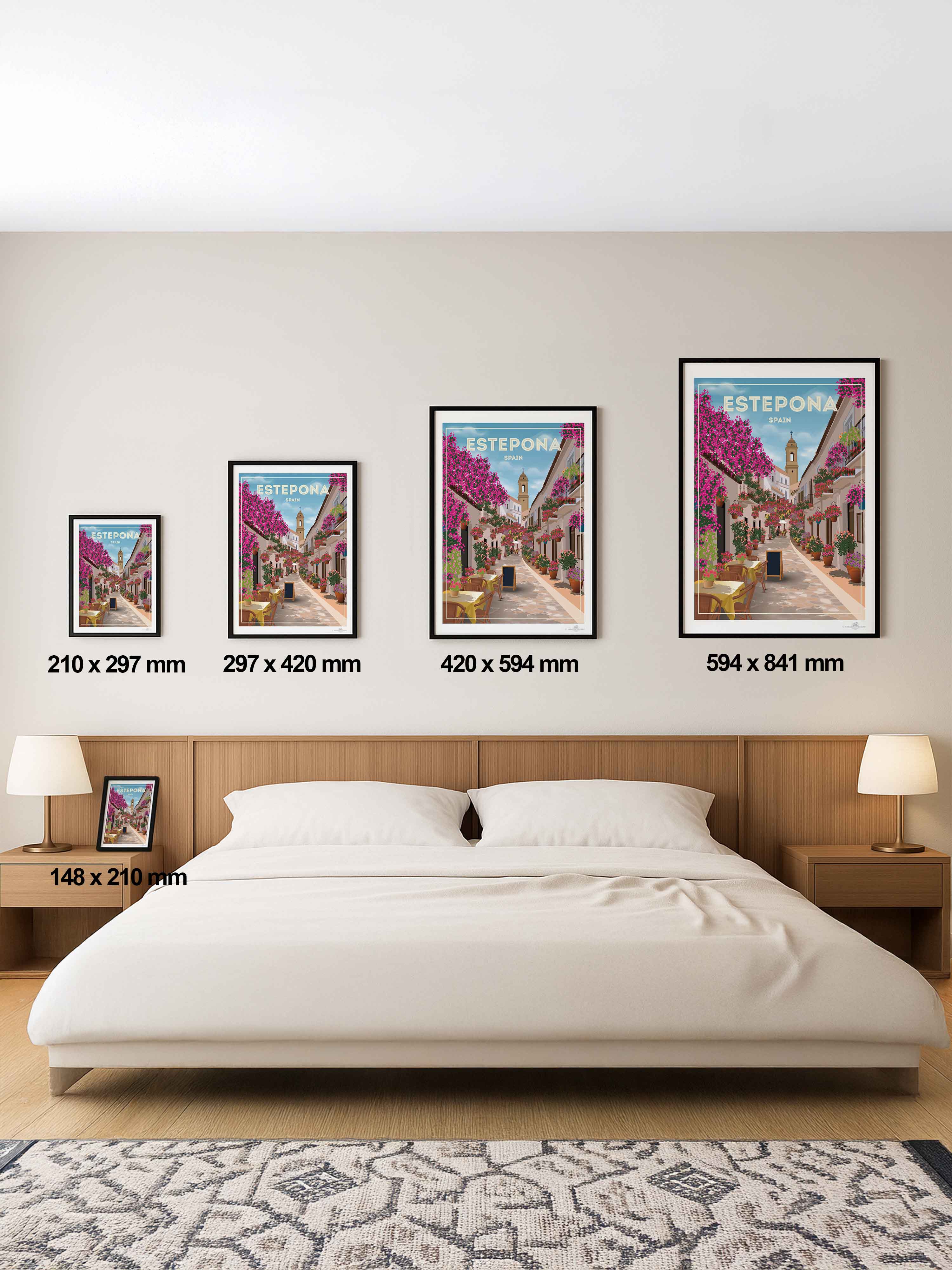 Step into the charming streets of Estepona, Spain, where vibrant bougainvillea spills over whitewashed buildings under a serene sky. This beautifully detailed art print captures the quaint, sunlit alleyways and colourful floral displays that bring warmth and life to any space.