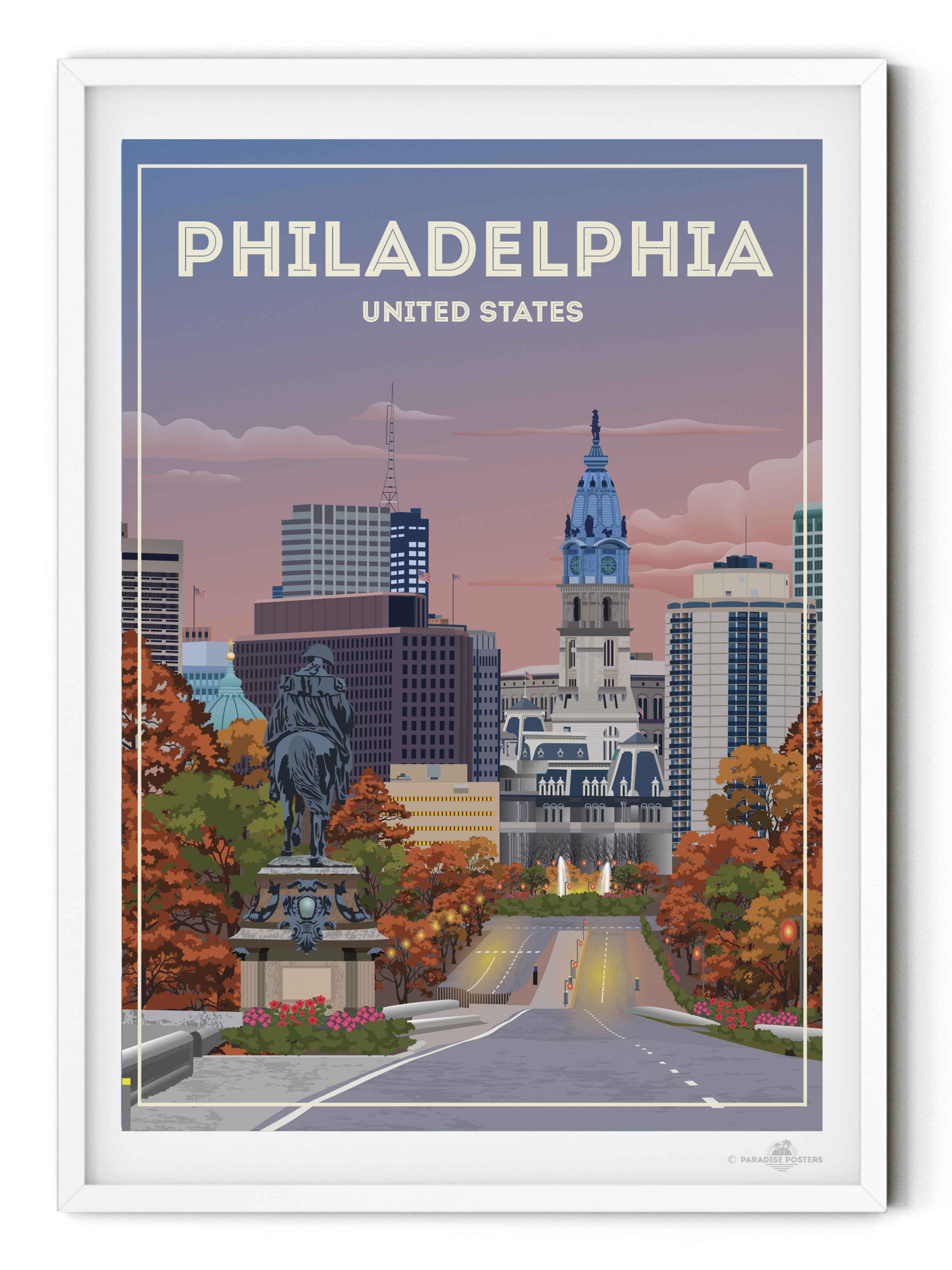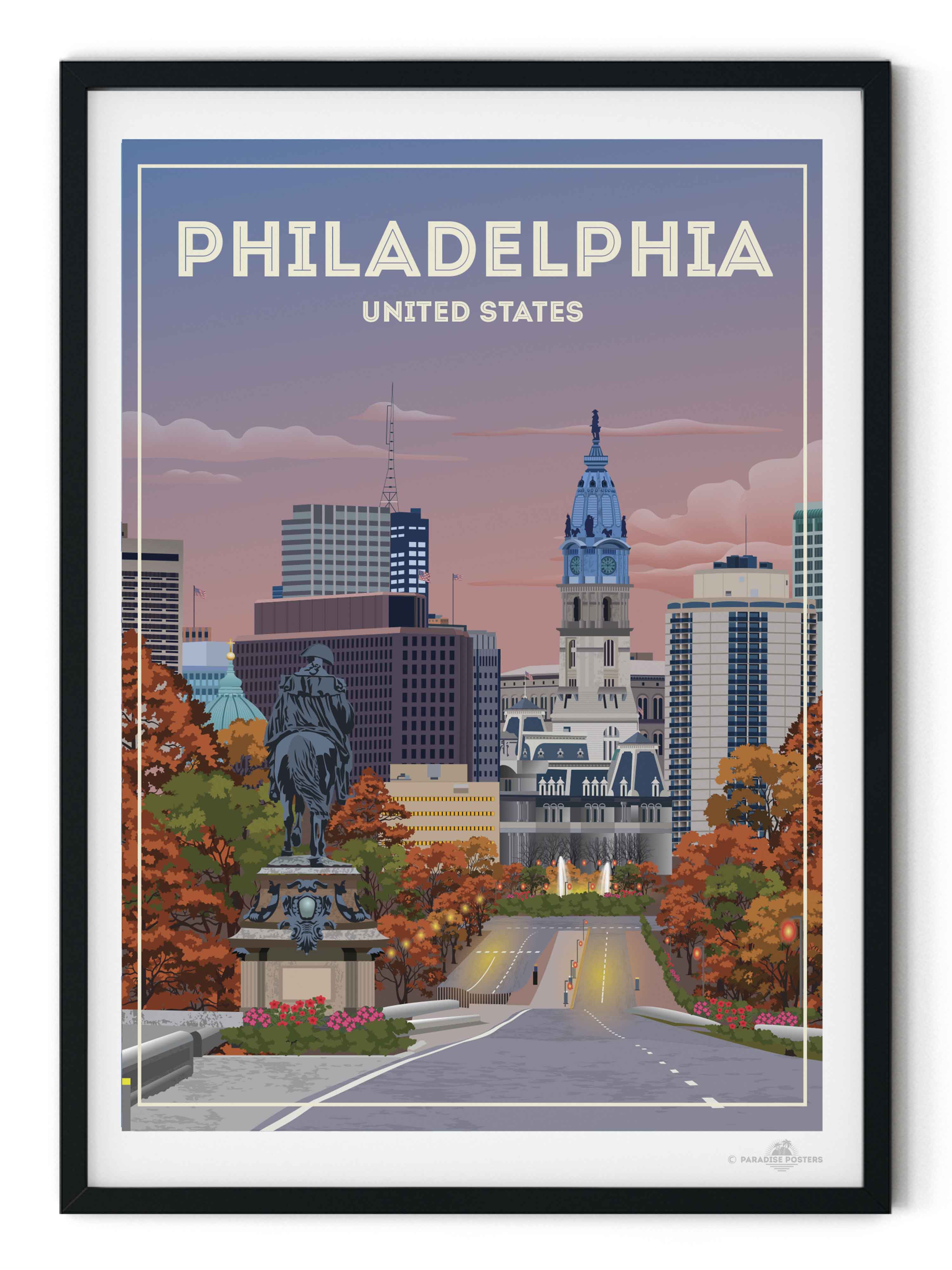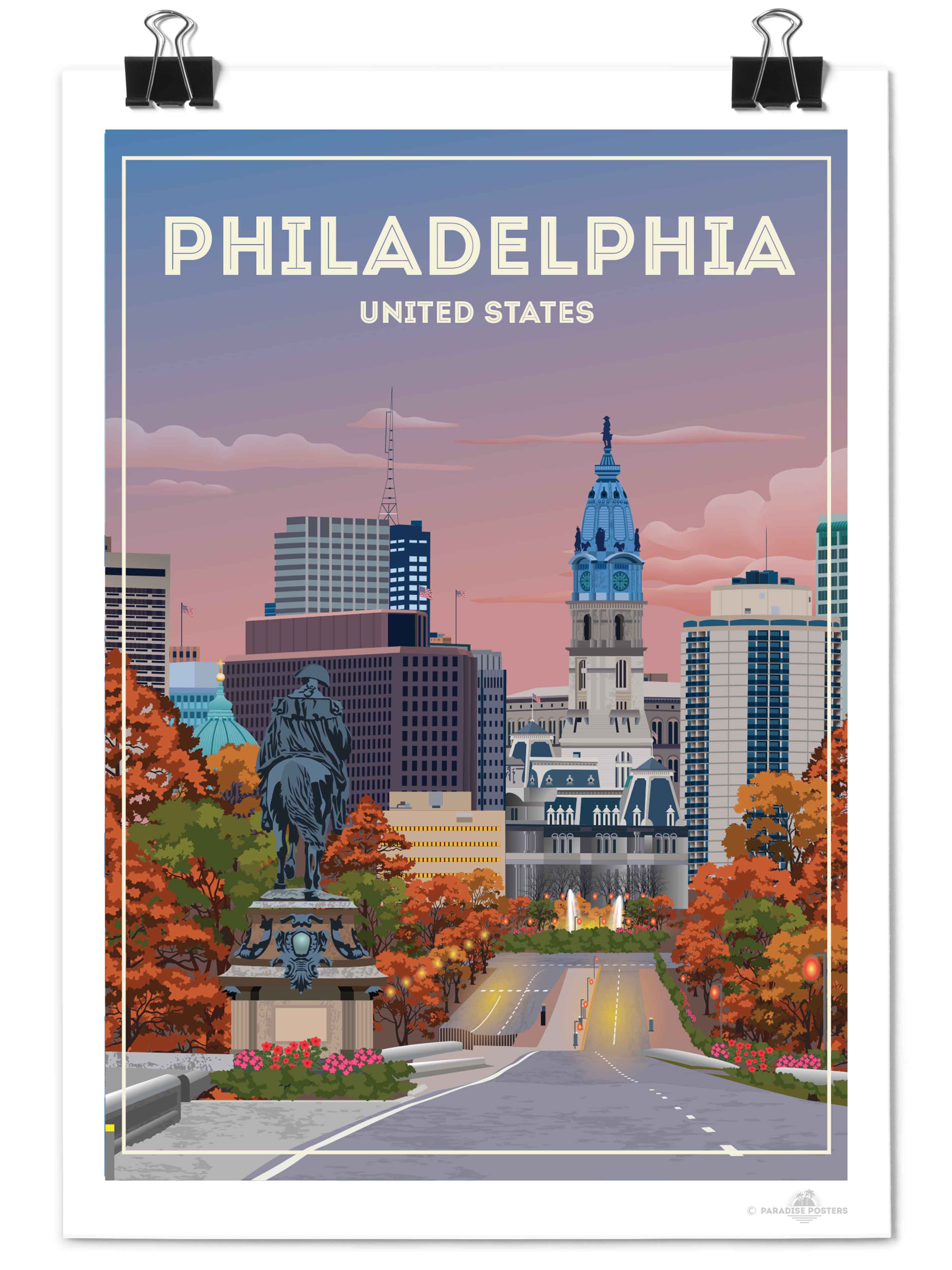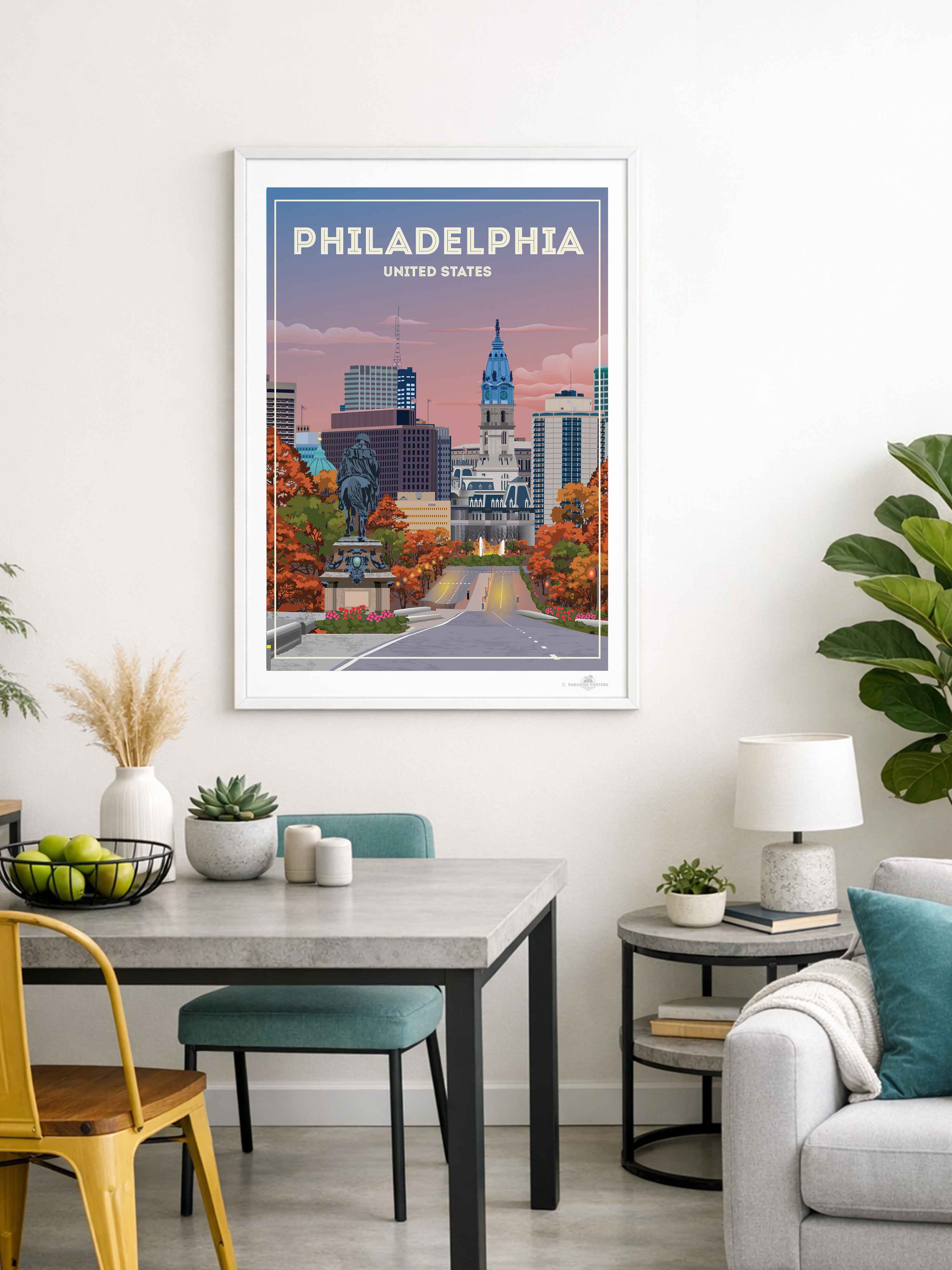 The vivid blend of autumn hues and a dusky sky invites you to wander through Philadelphia’s historic heart. This striking cityscape captures the iconic view of City Hall against a calming twilight, with rich oranges and soothing blues setting a serene yet vibrant mood.