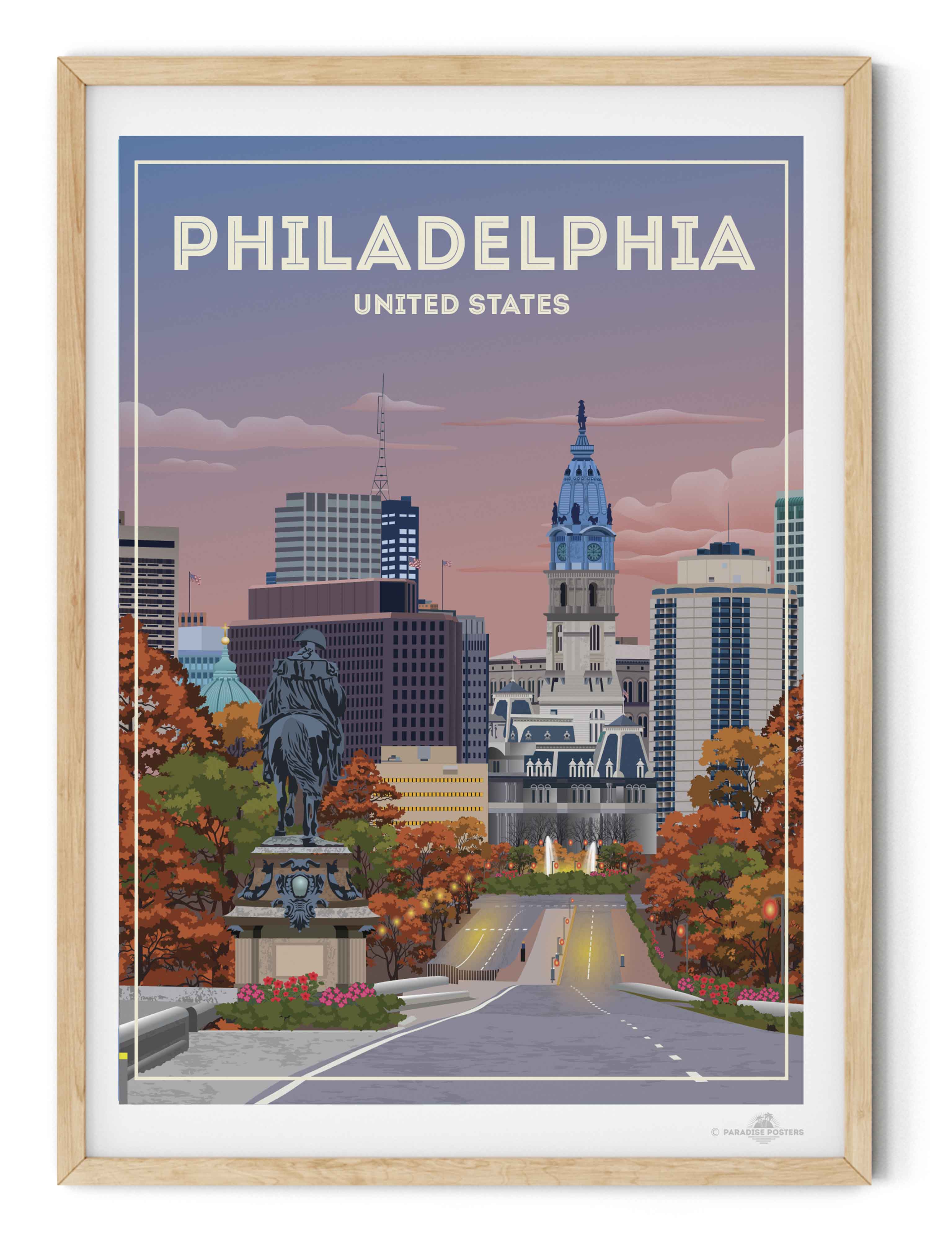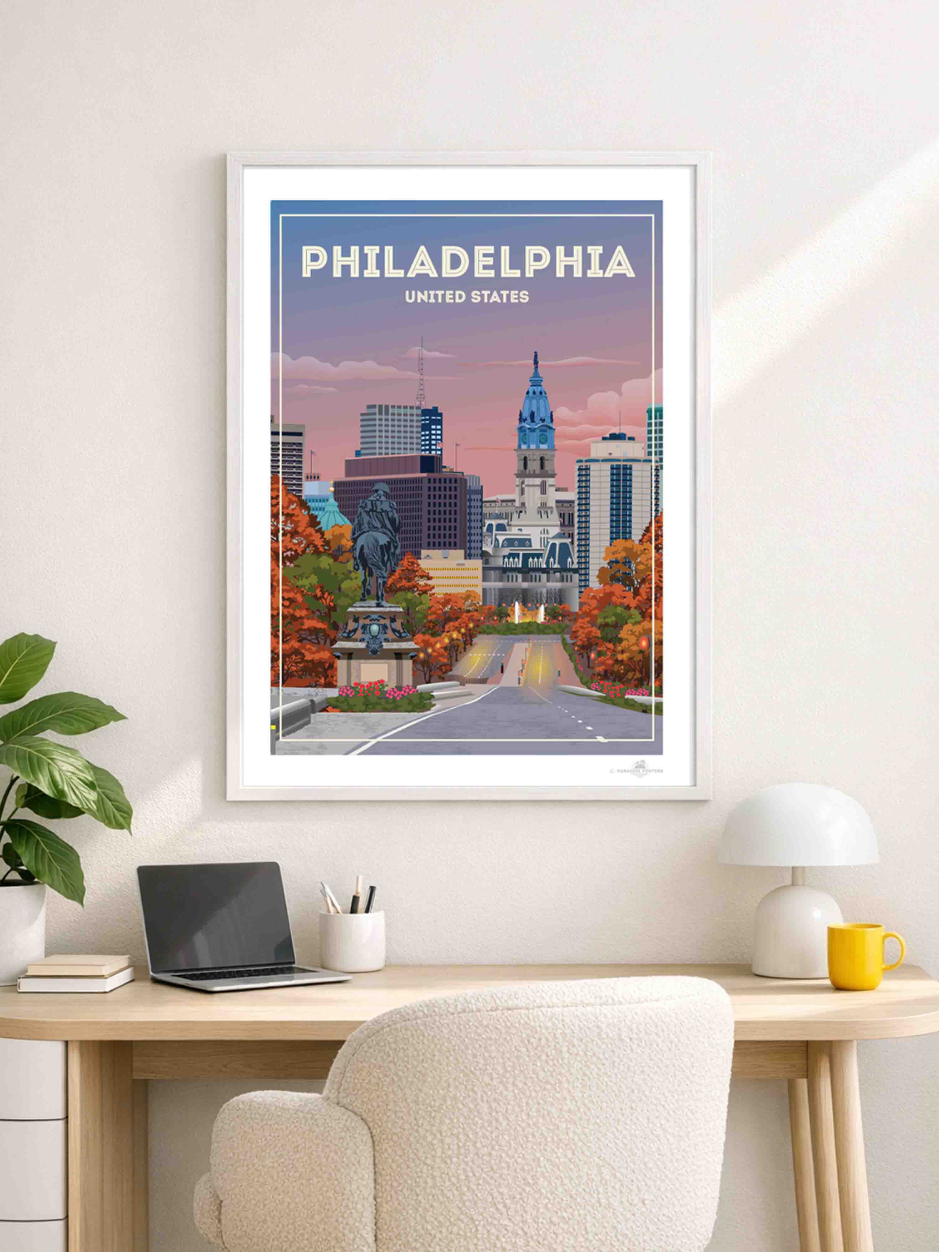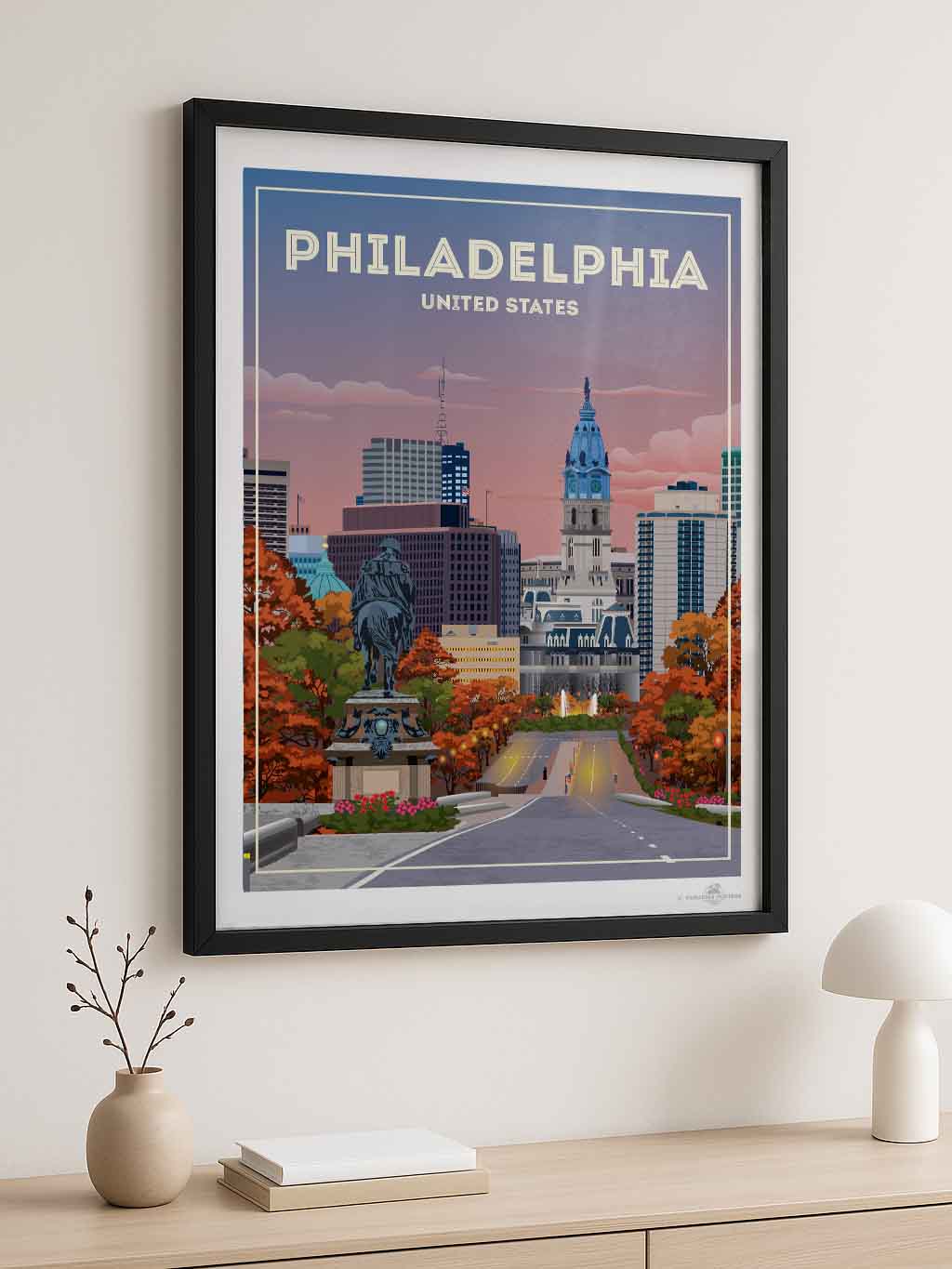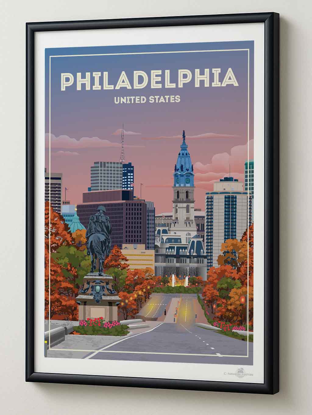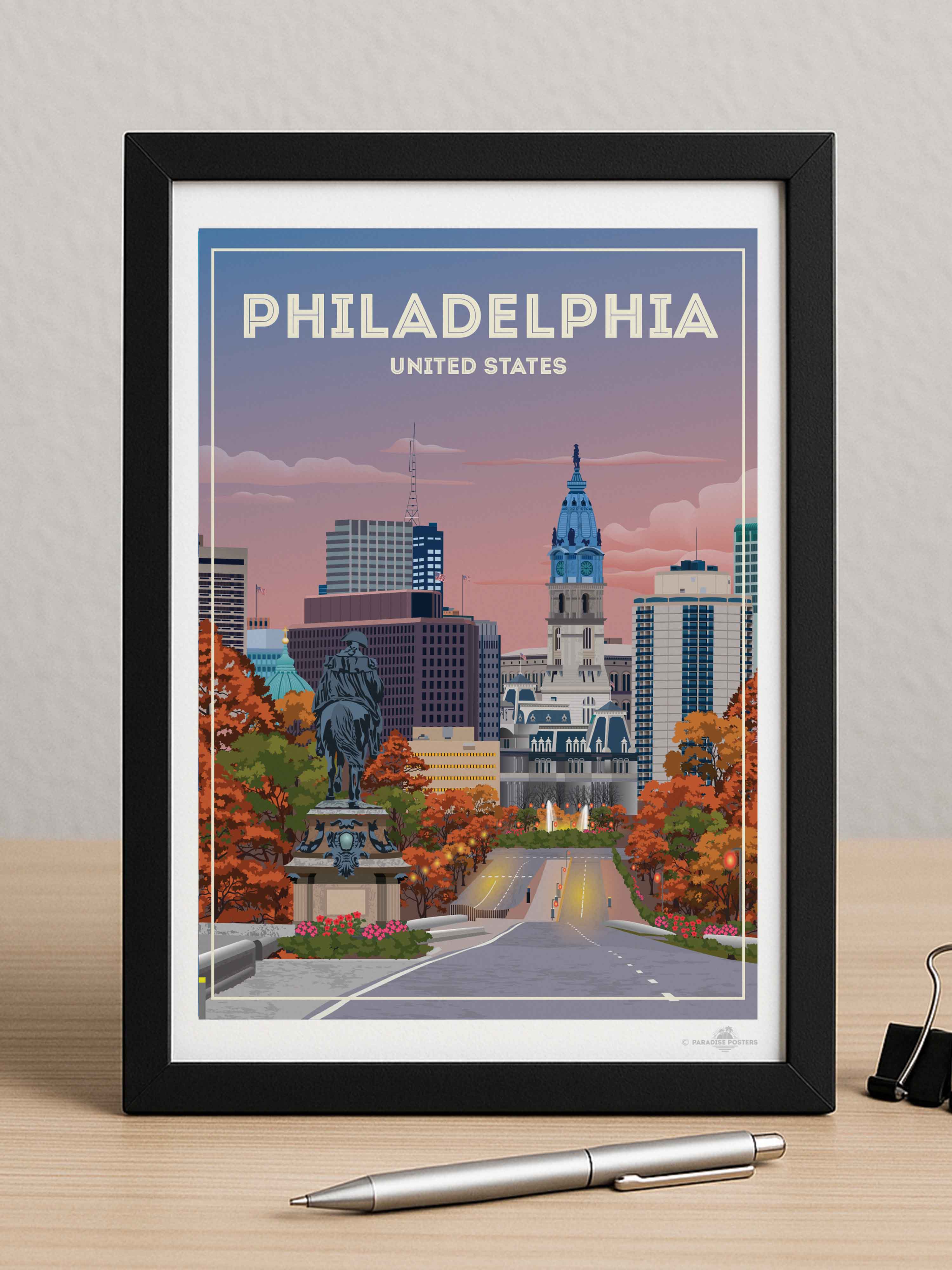 The vivid blend of autumn hues and a dusky sky invites you to wander through Philadelphia’s historic heart. This striking cityscape captures the iconic view of City Hall against a calming twilight, with rich oranges and soothing blues setting a serene yet vibrant mood.