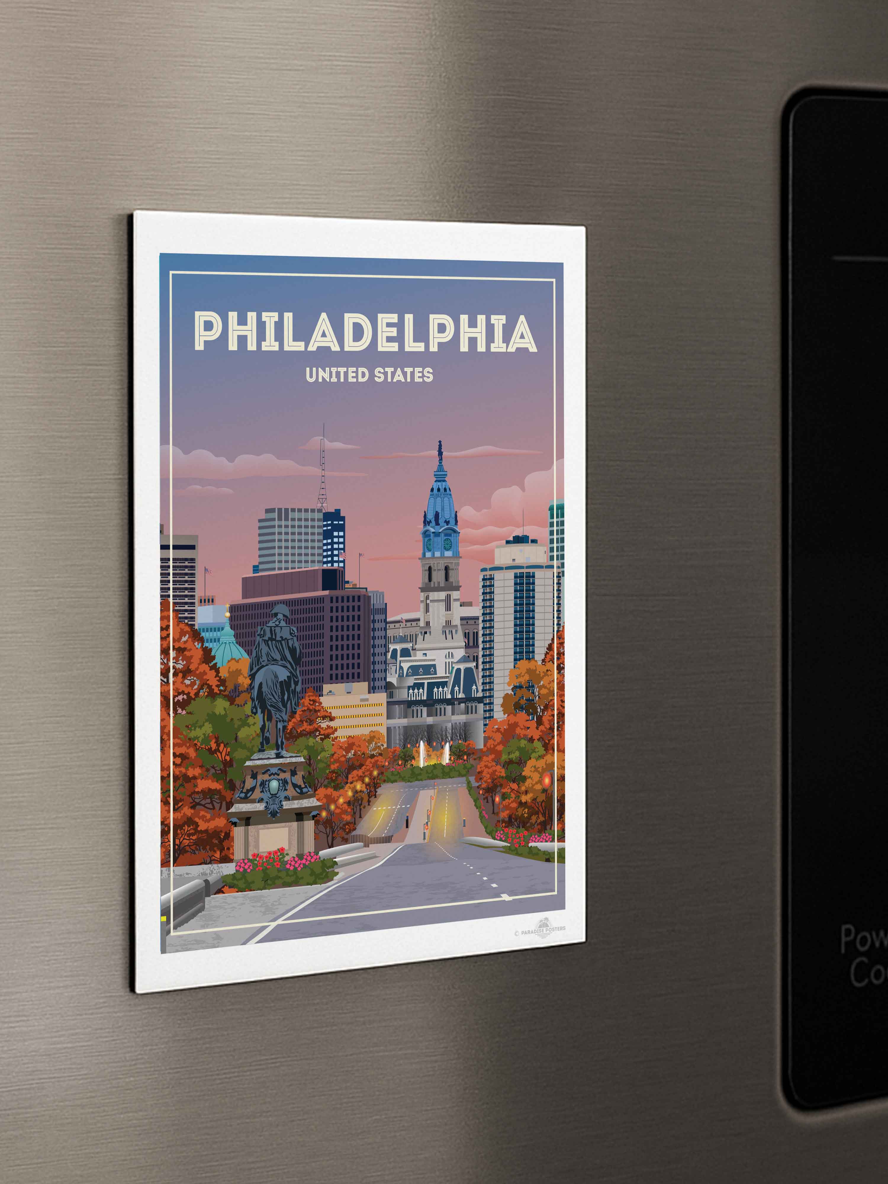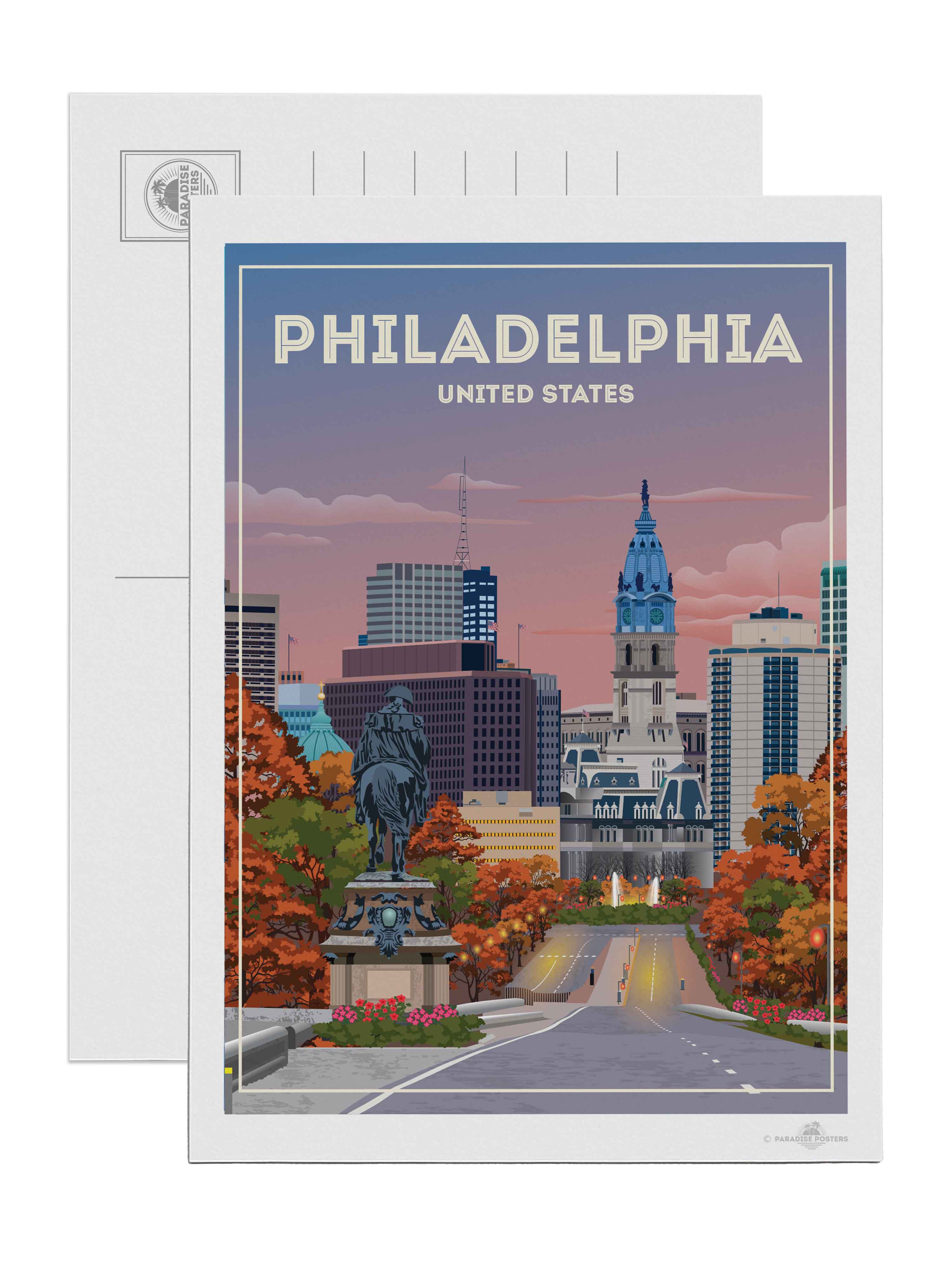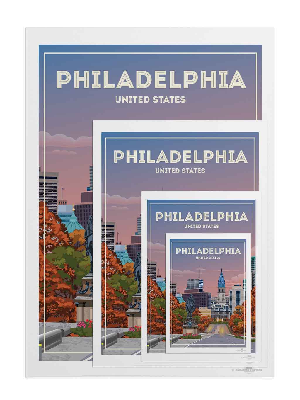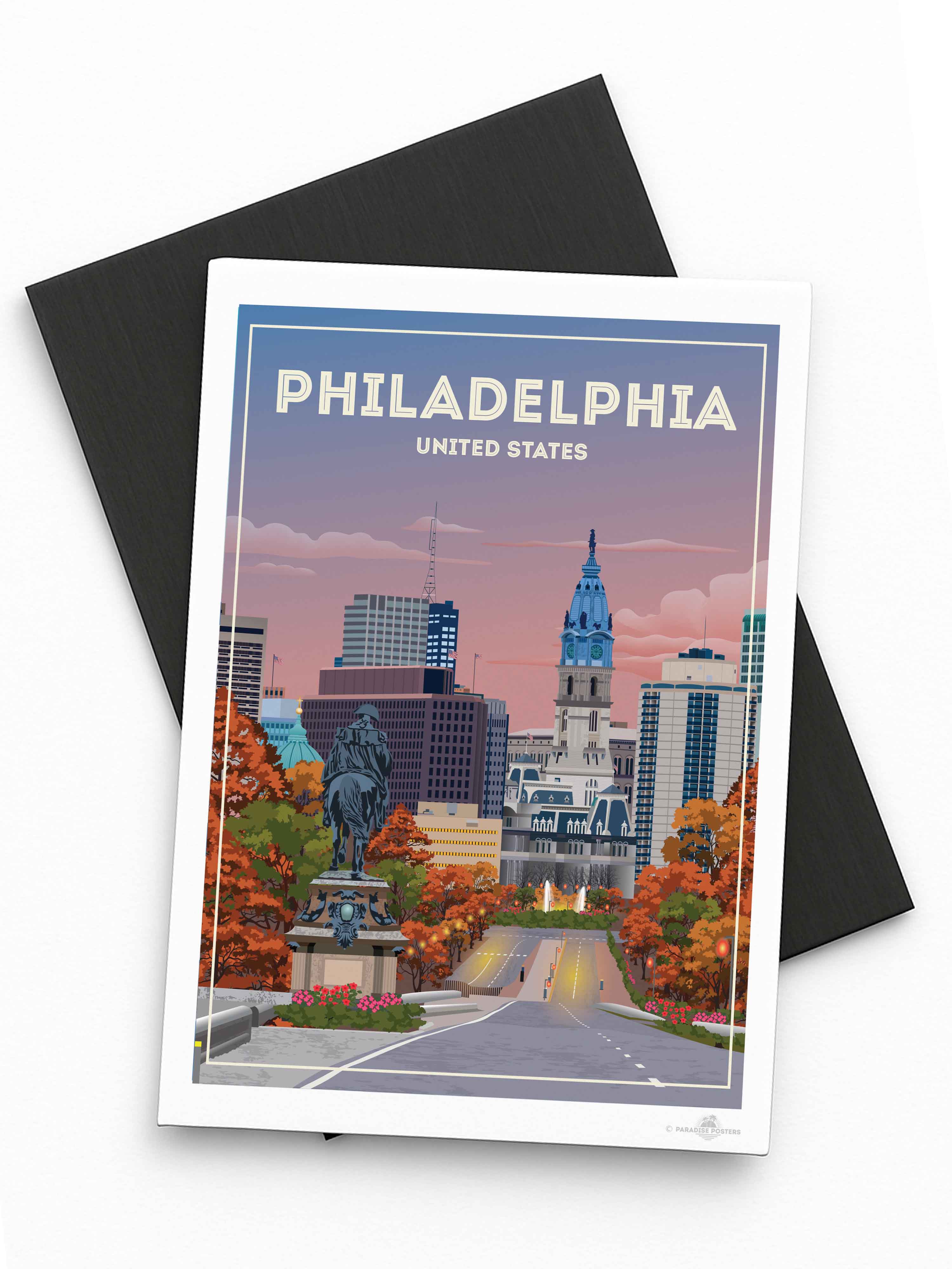The vivid blend of autumn hues and a dusky sky invites you to wander through Philadelphia’s historic heart. This striking cityscape captures the iconic view of City Hall against a calming twilight, with rich oranges and soothing blues setting a serene yet vibrant mood.
