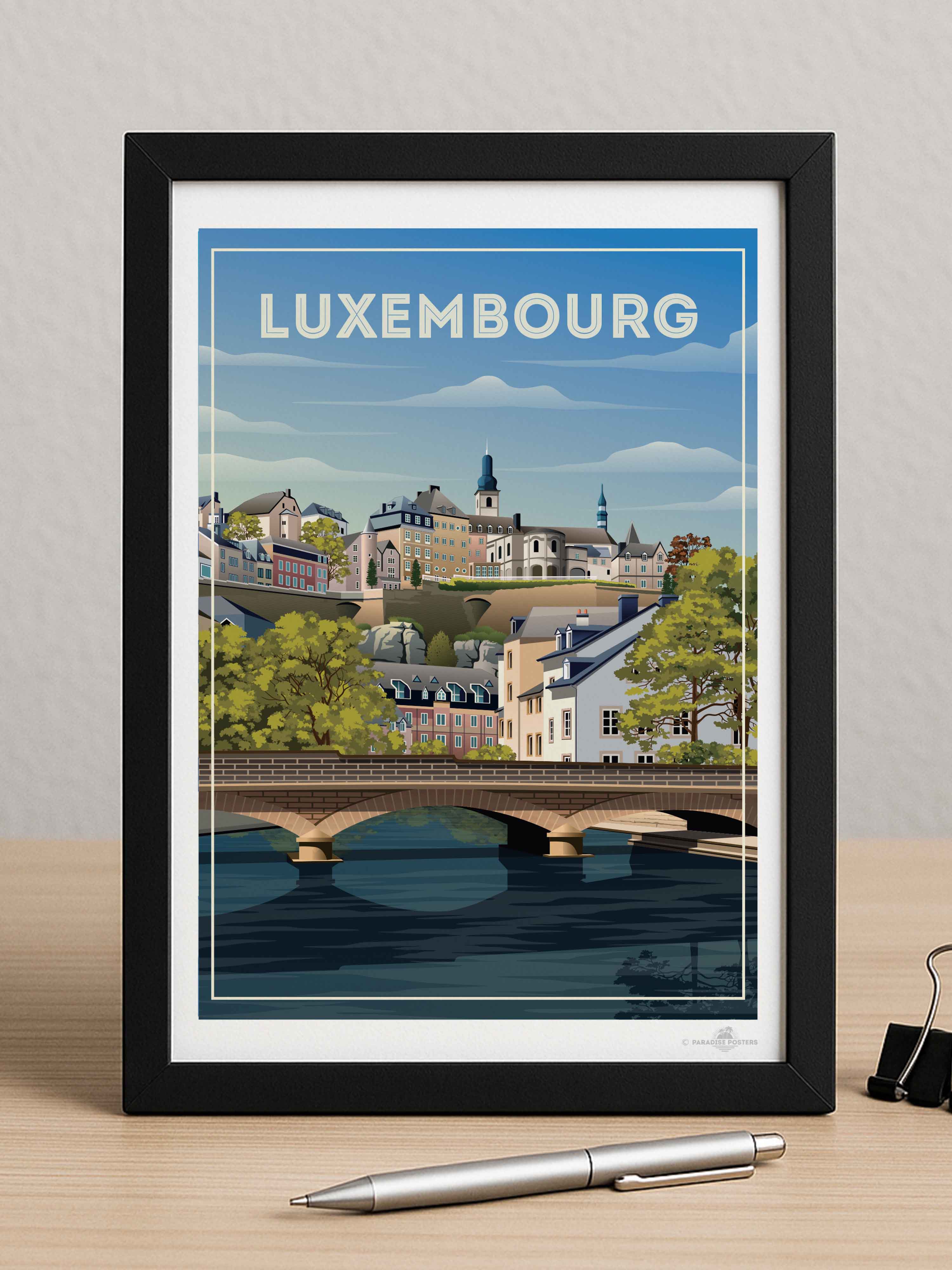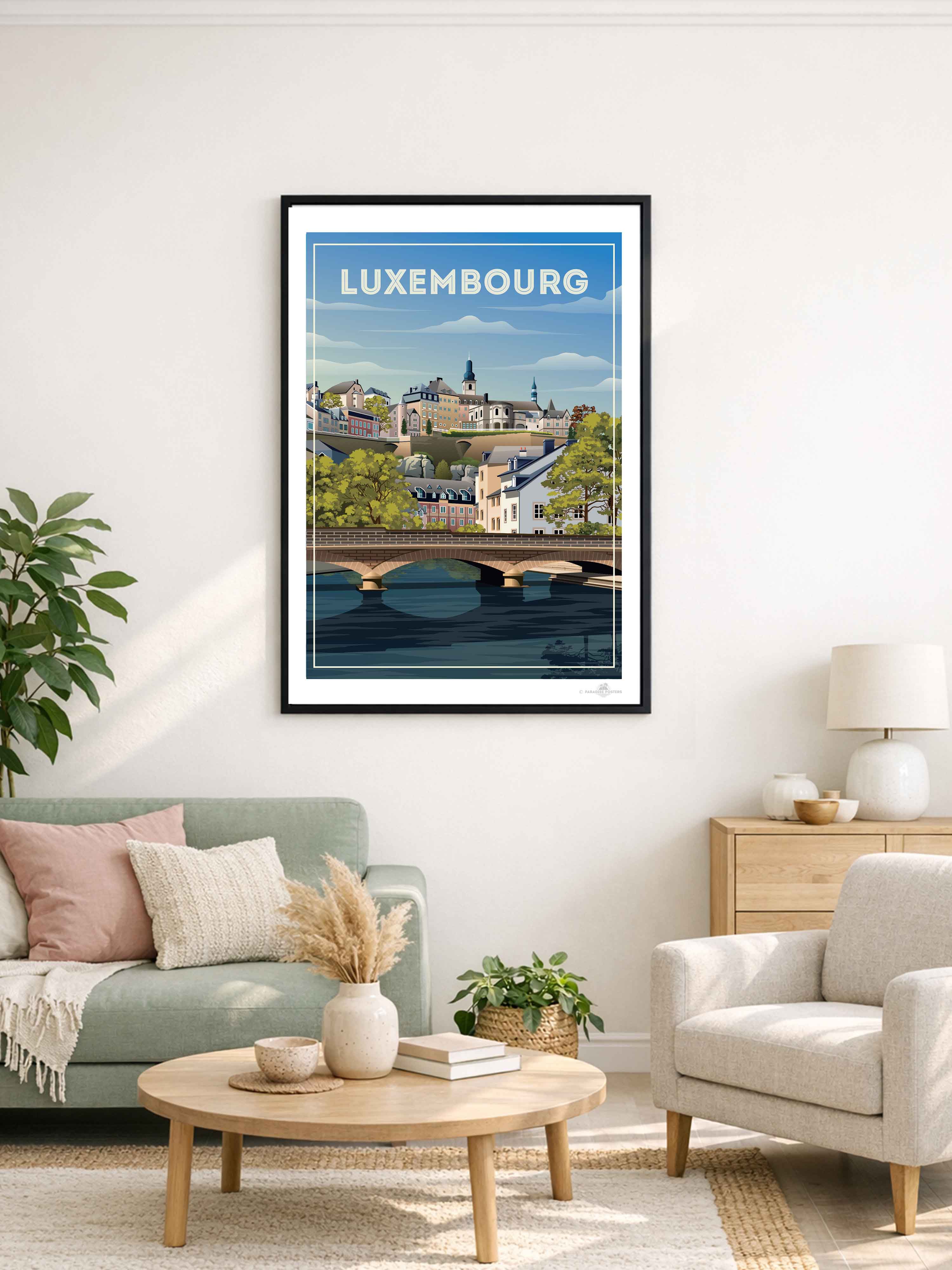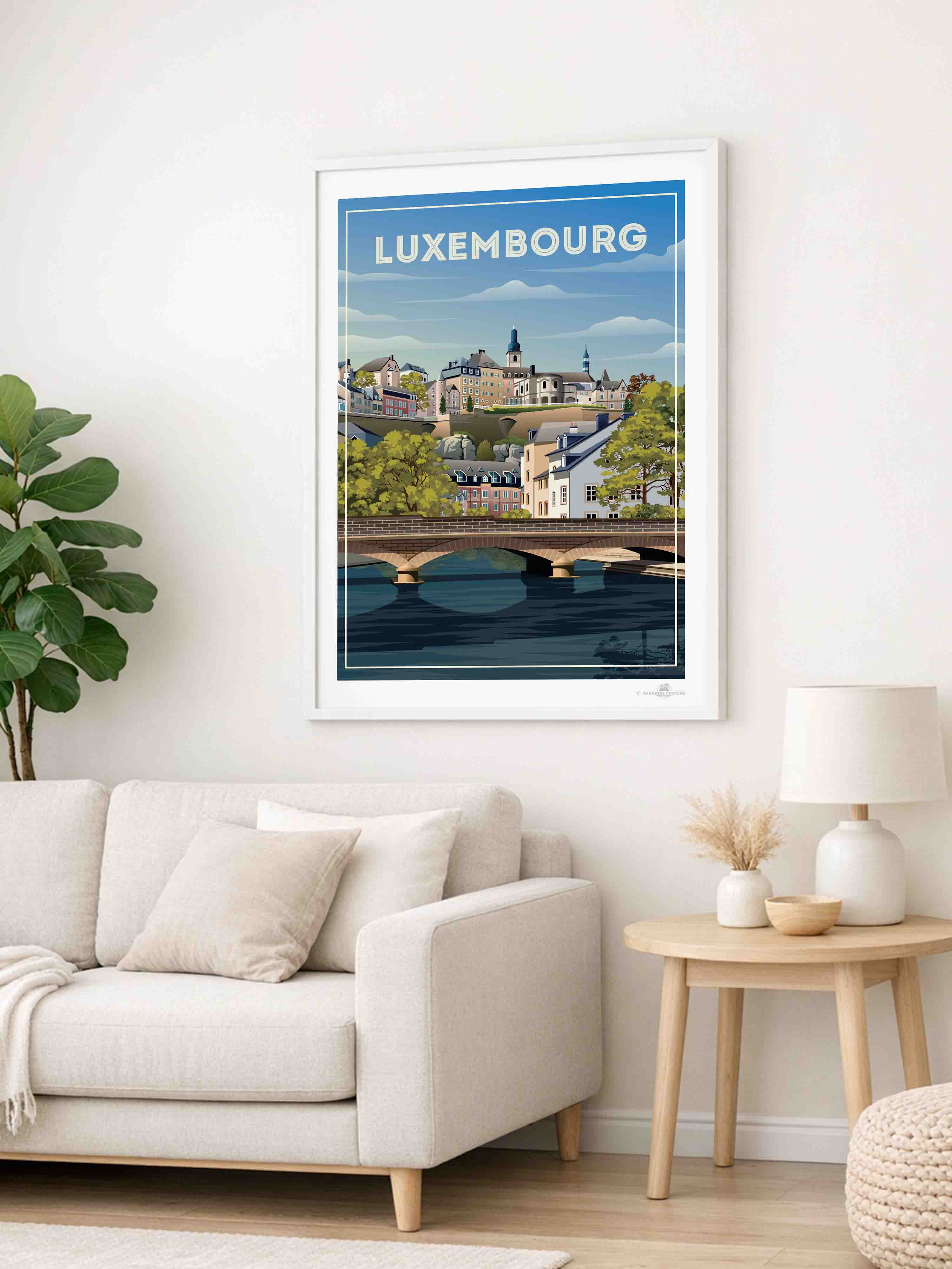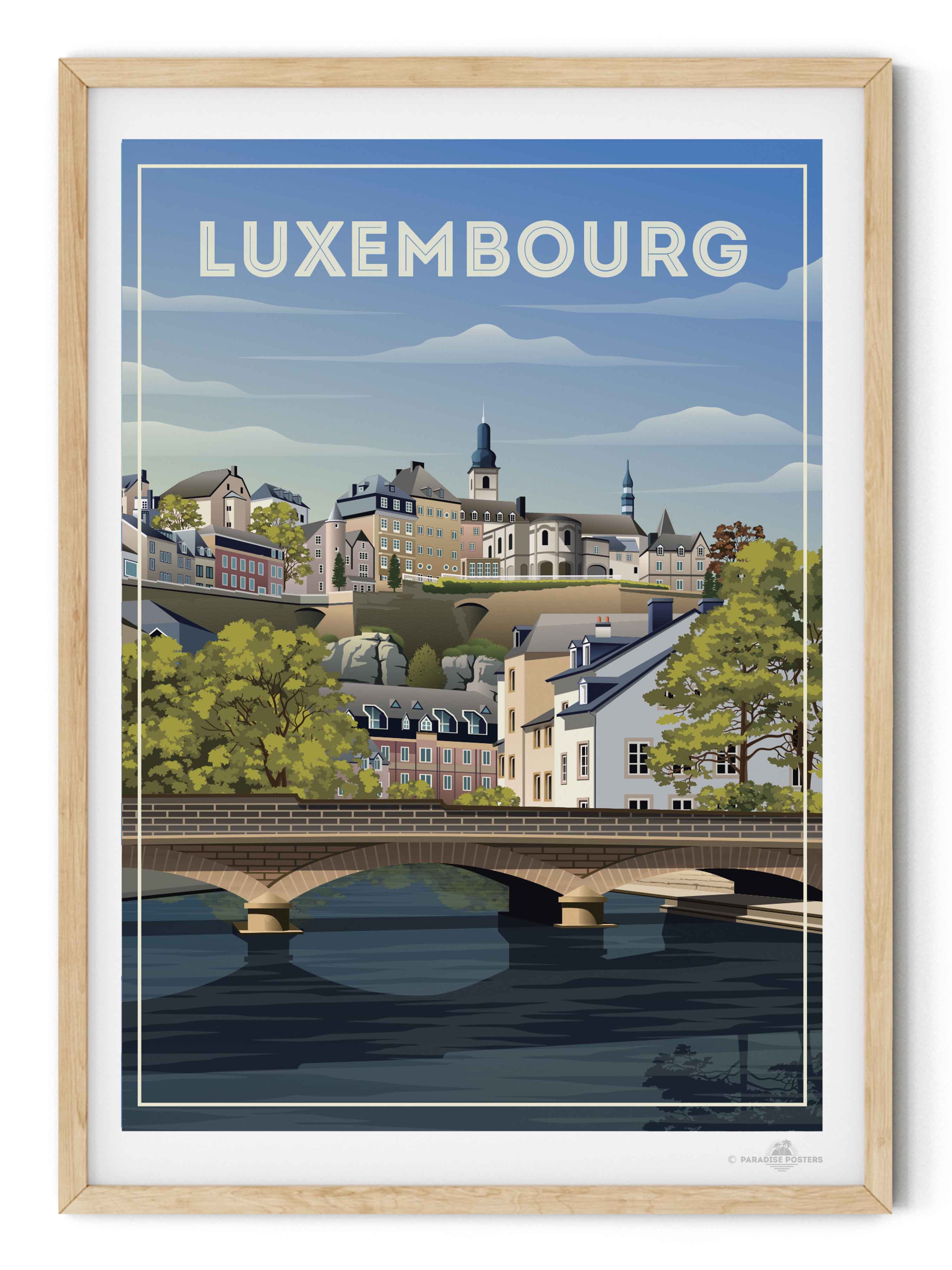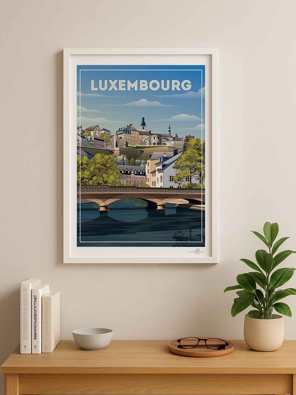 Step into the serene charm of Luxembourg with this beautifully crafted travel poster. Featuring a tranquil river scene framed by lush green trees, historic buildings, and a striking stone bridge, the artwork evokes a peaceful yet vibrant urban ambience.