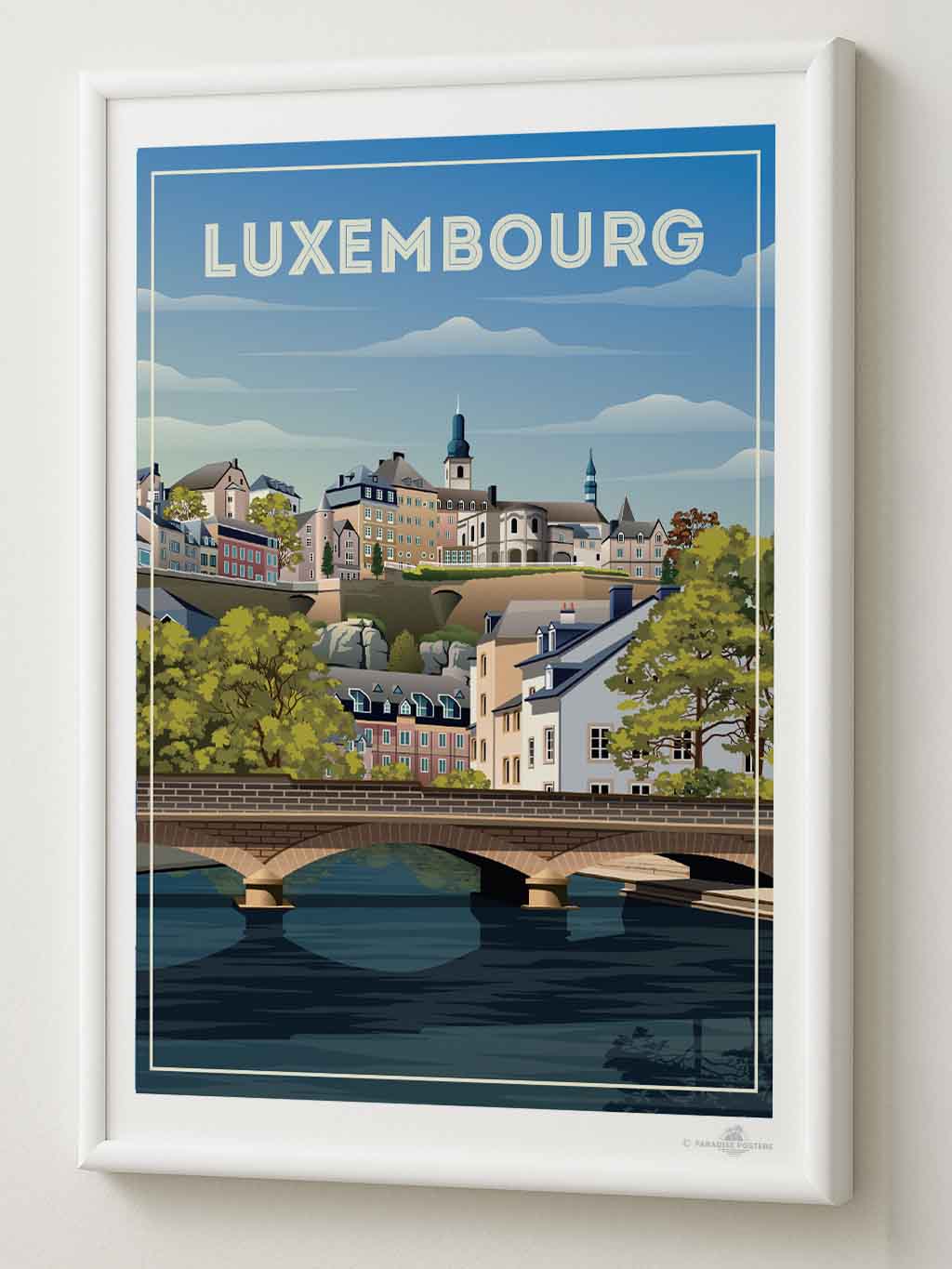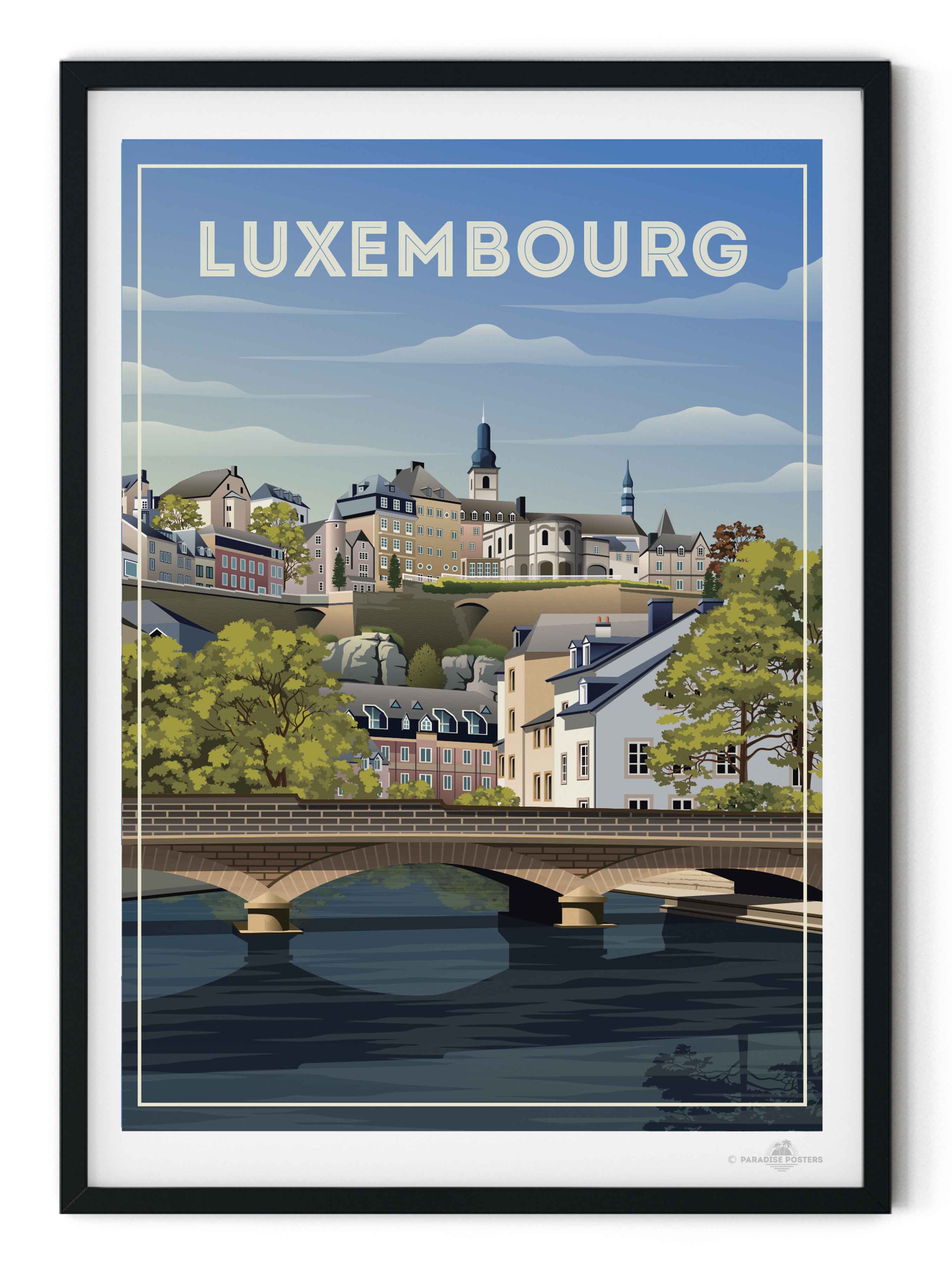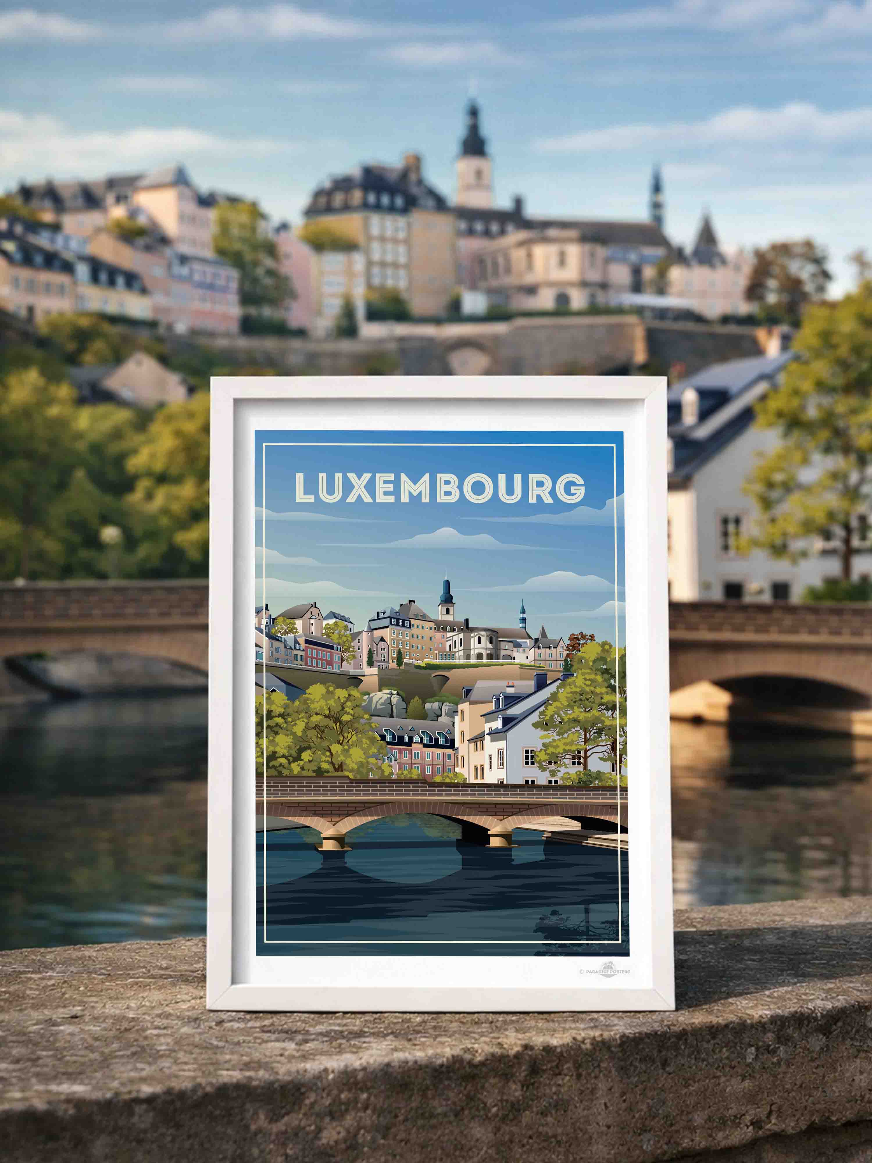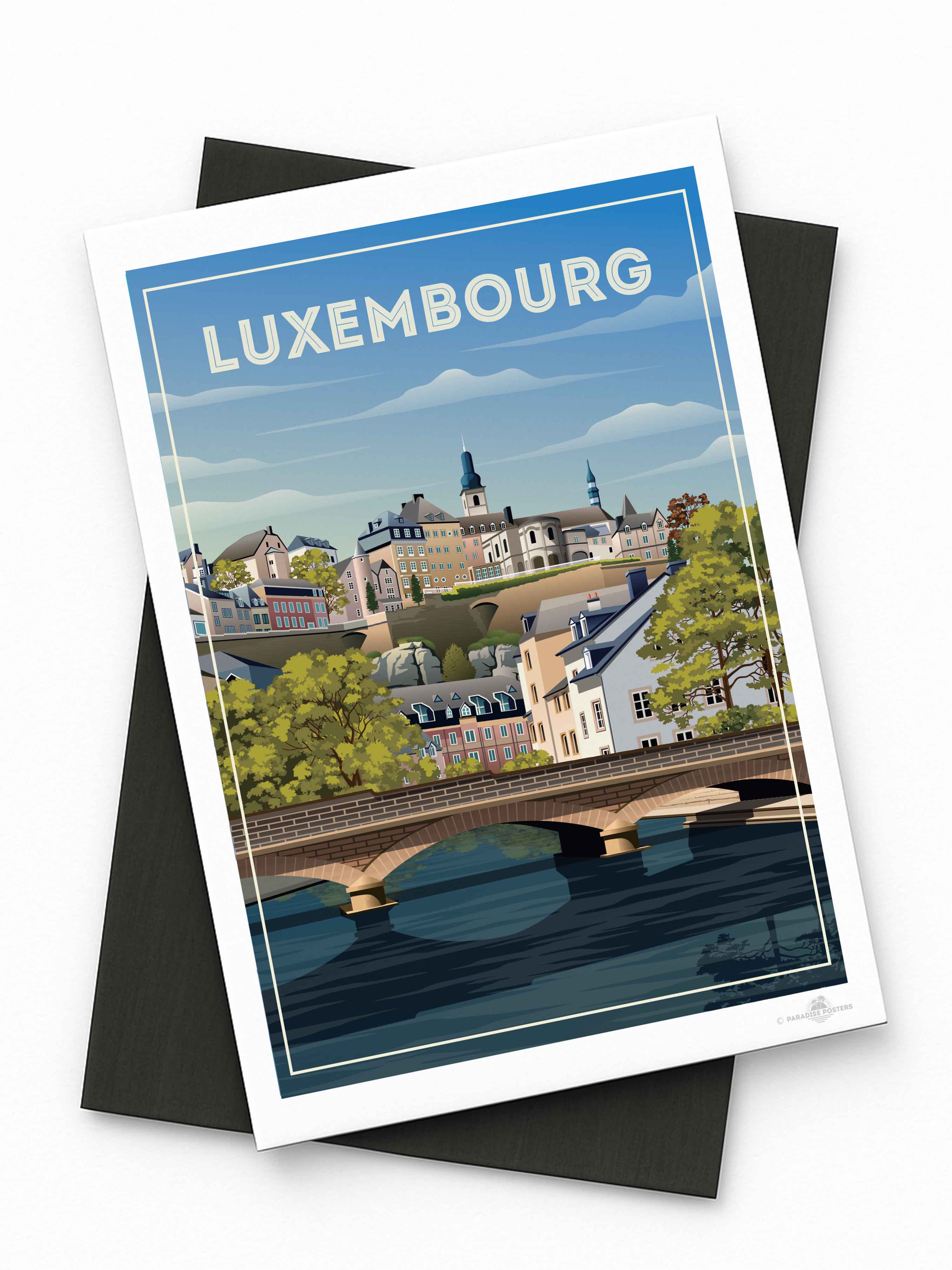 Step into the serene charm of Luxembourg with this beautifully crafted travel poster. Featuring a tranquil river scene framed by lush green trees, historic buildings, and a striking stone bridge, the artwork evokes a peaceful yet vibrant urban ambience.