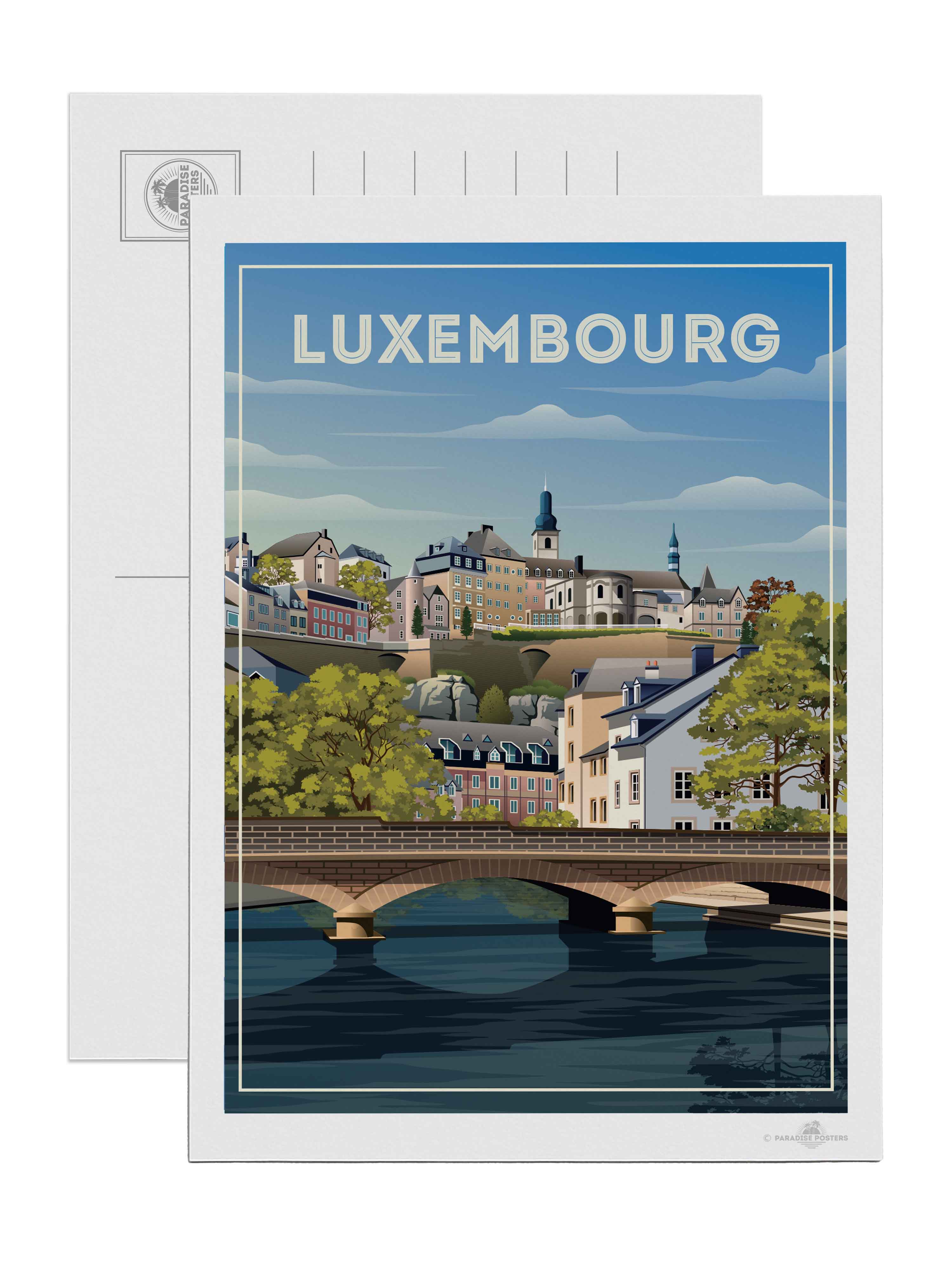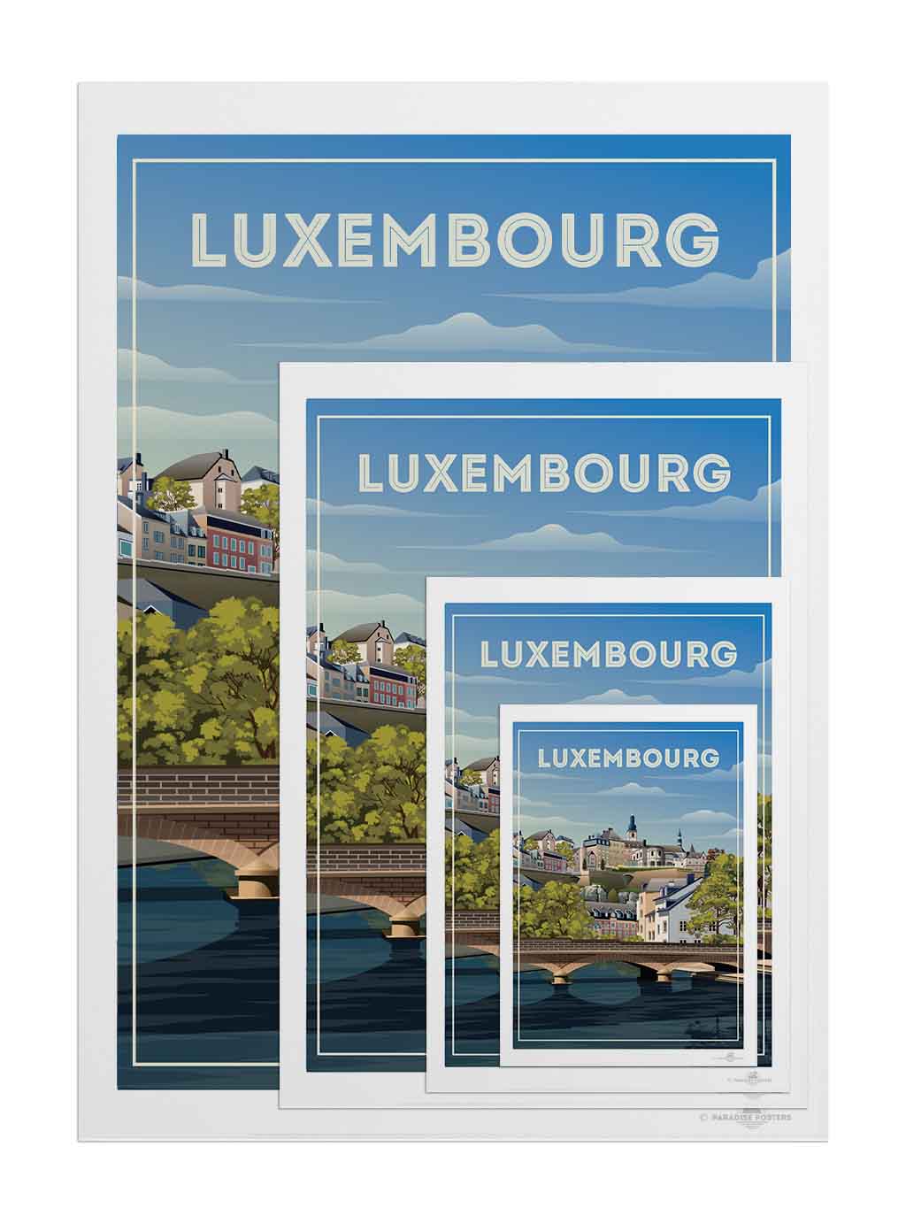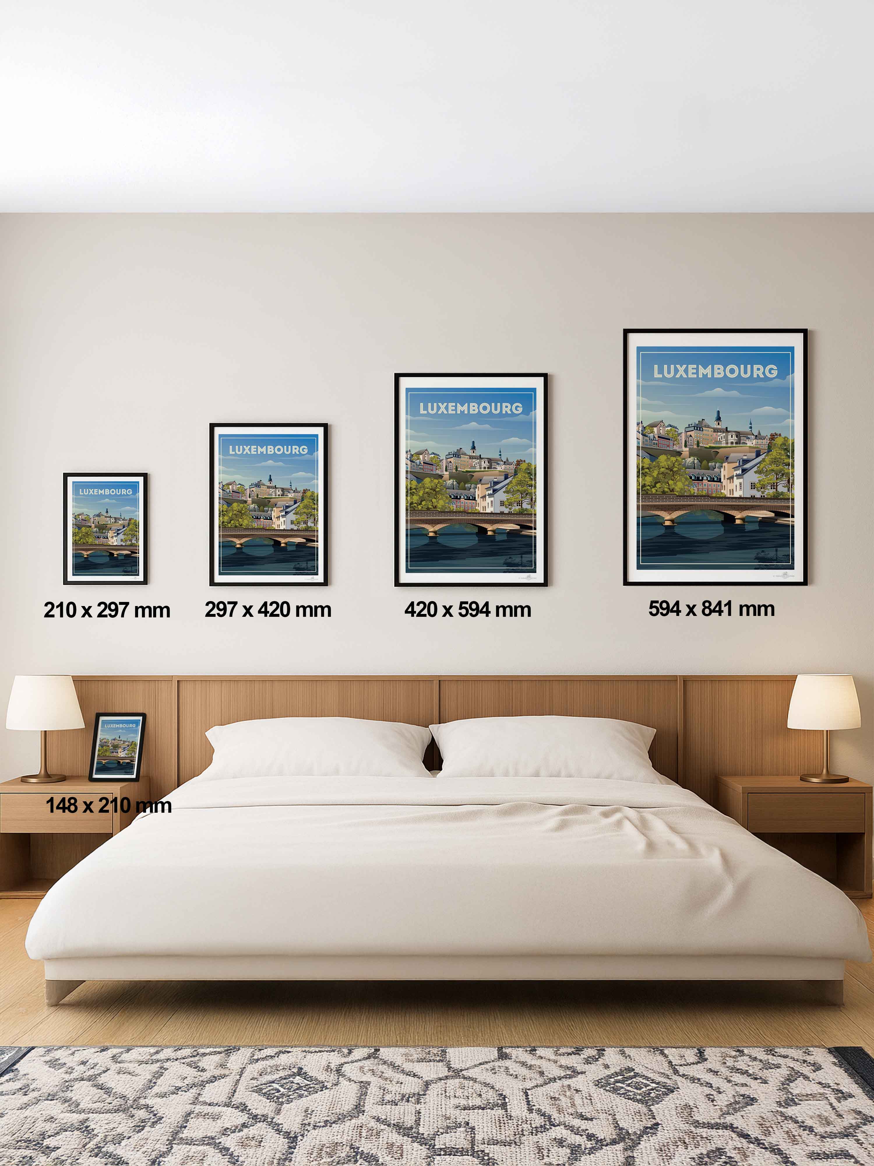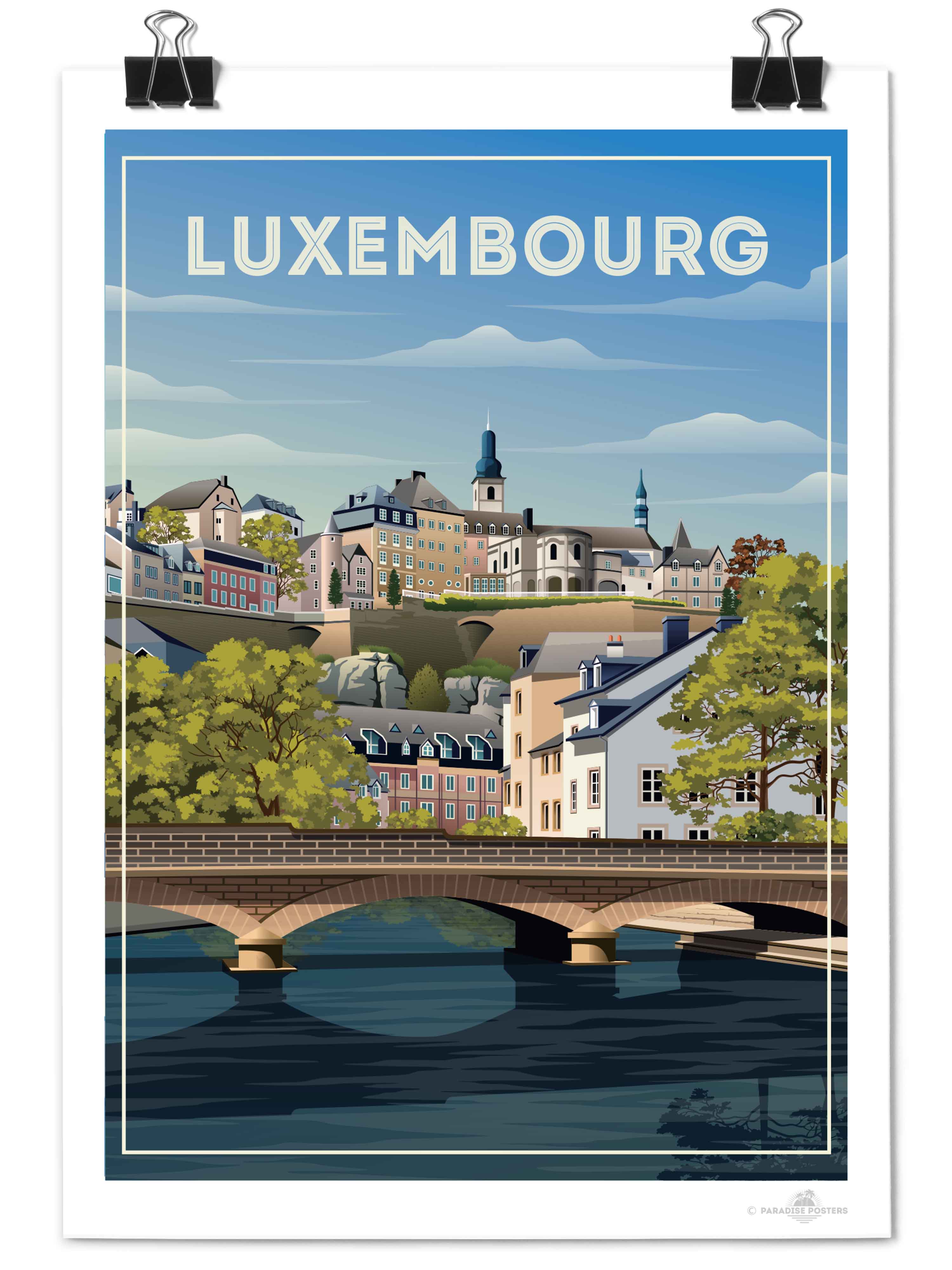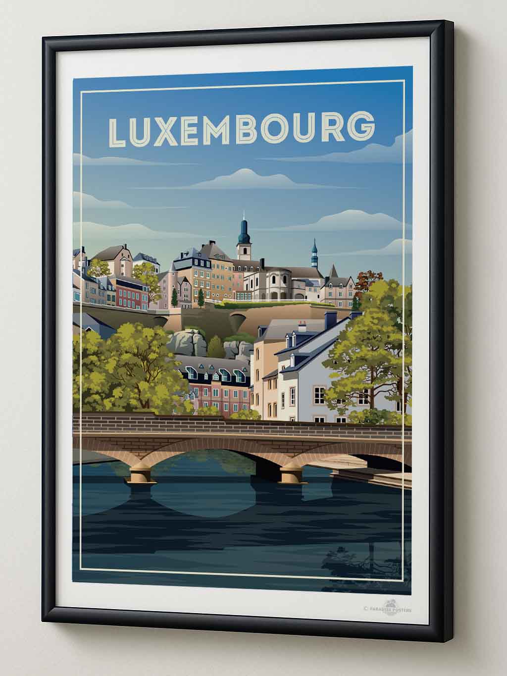 Step into the serene charm of Luxembourg with this beautifully crafted travel poster. Featuring a tranquil river scene framed by lush green trees, historic buildings, and a striking stone bridge, the artwork evokes a peaceful yet vibrant urban ambience.