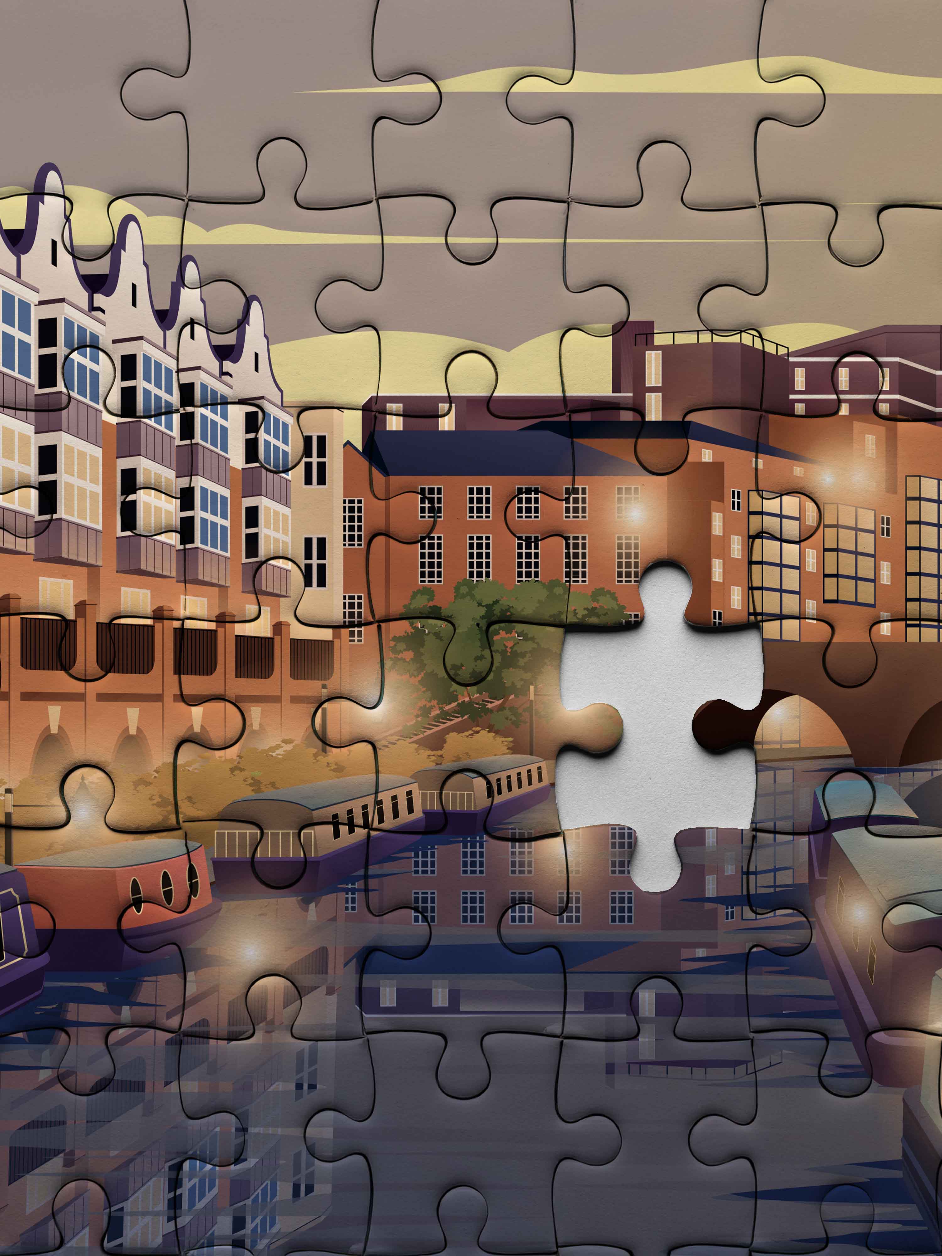 Birmingham, England, is captured here in a serene evening scene along its iconic canals. The puzzle brings to life the city’s blend of historic charm and contemporary urban calm, featuring classic canal boats and elegant riverside buildings glowing gently as dusk falls.