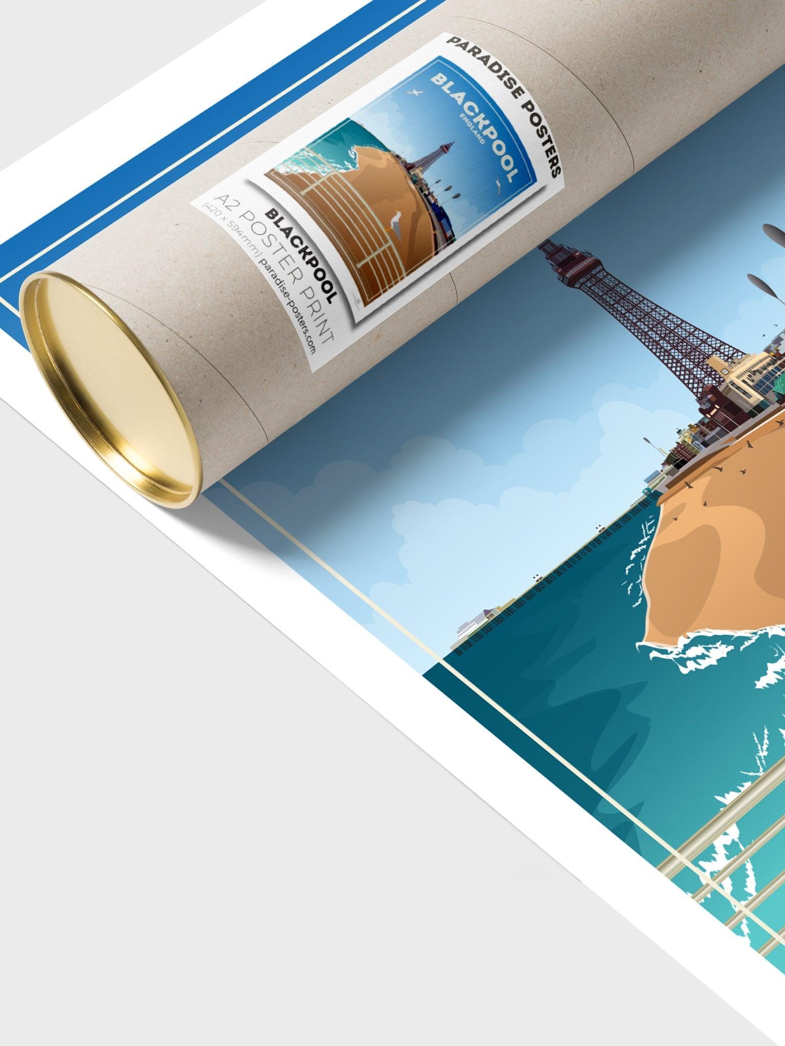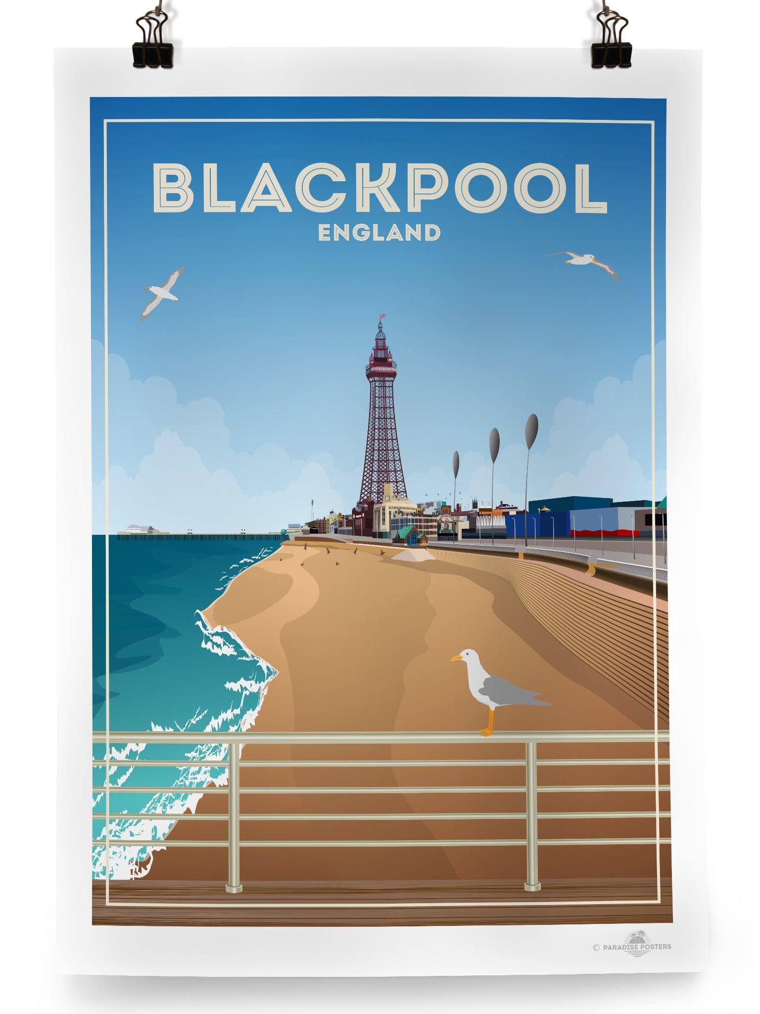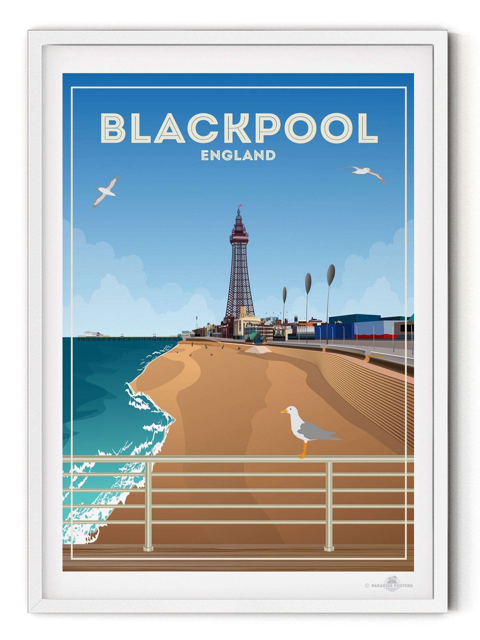 The most well-known landmark in town (and within the UK, for that matter) is Blackpool Tower, which can be seen just behind the beach in our poster design. At 158 metres tall and designed using inspiration of the Eiffel Tower, it first opened to the public in 1894. From the very top visitors can enjoy views across the promenade and Irish Sea, the brave ones can also walk across a section of glass floor that shows views of the tower 380ft directly below.