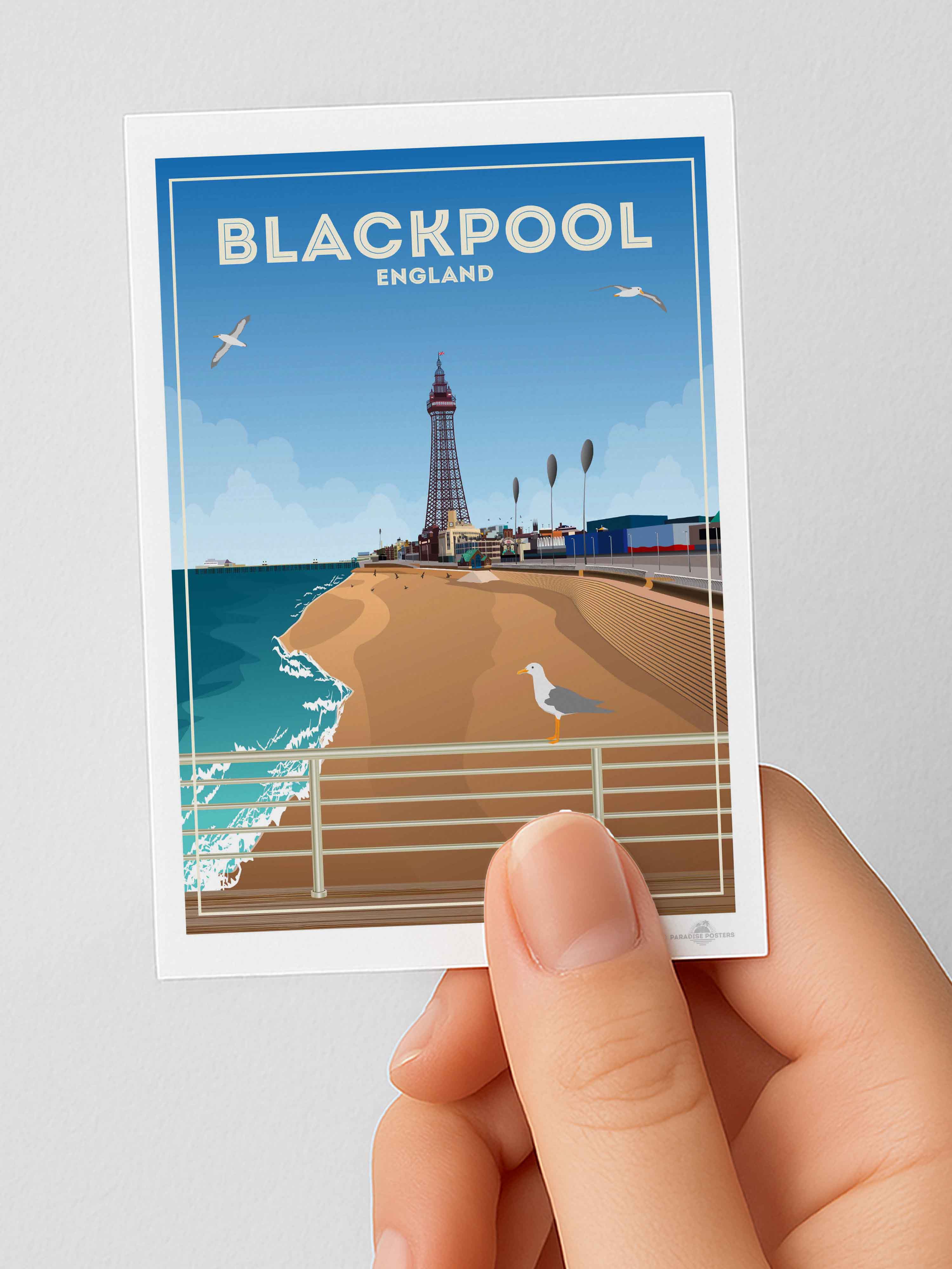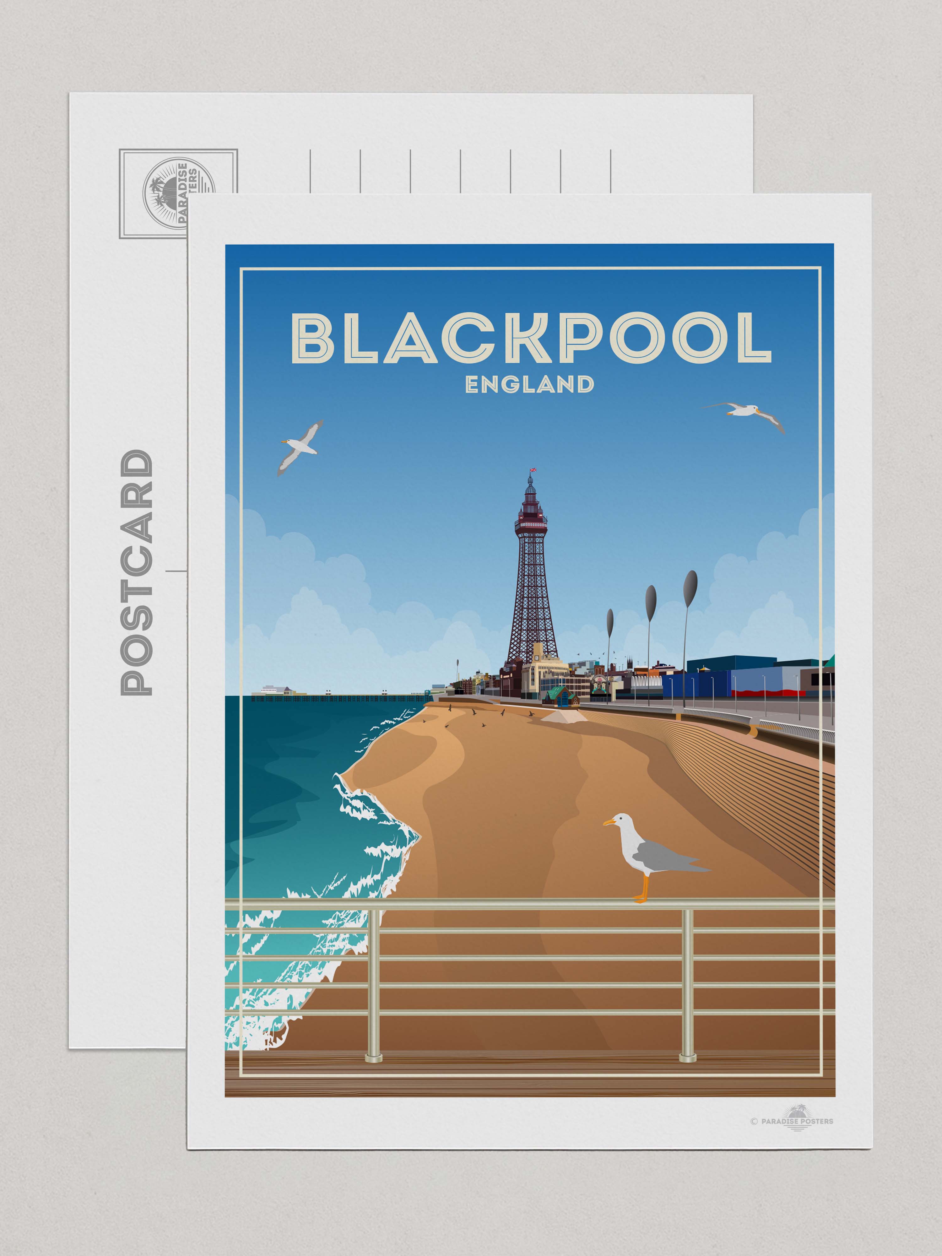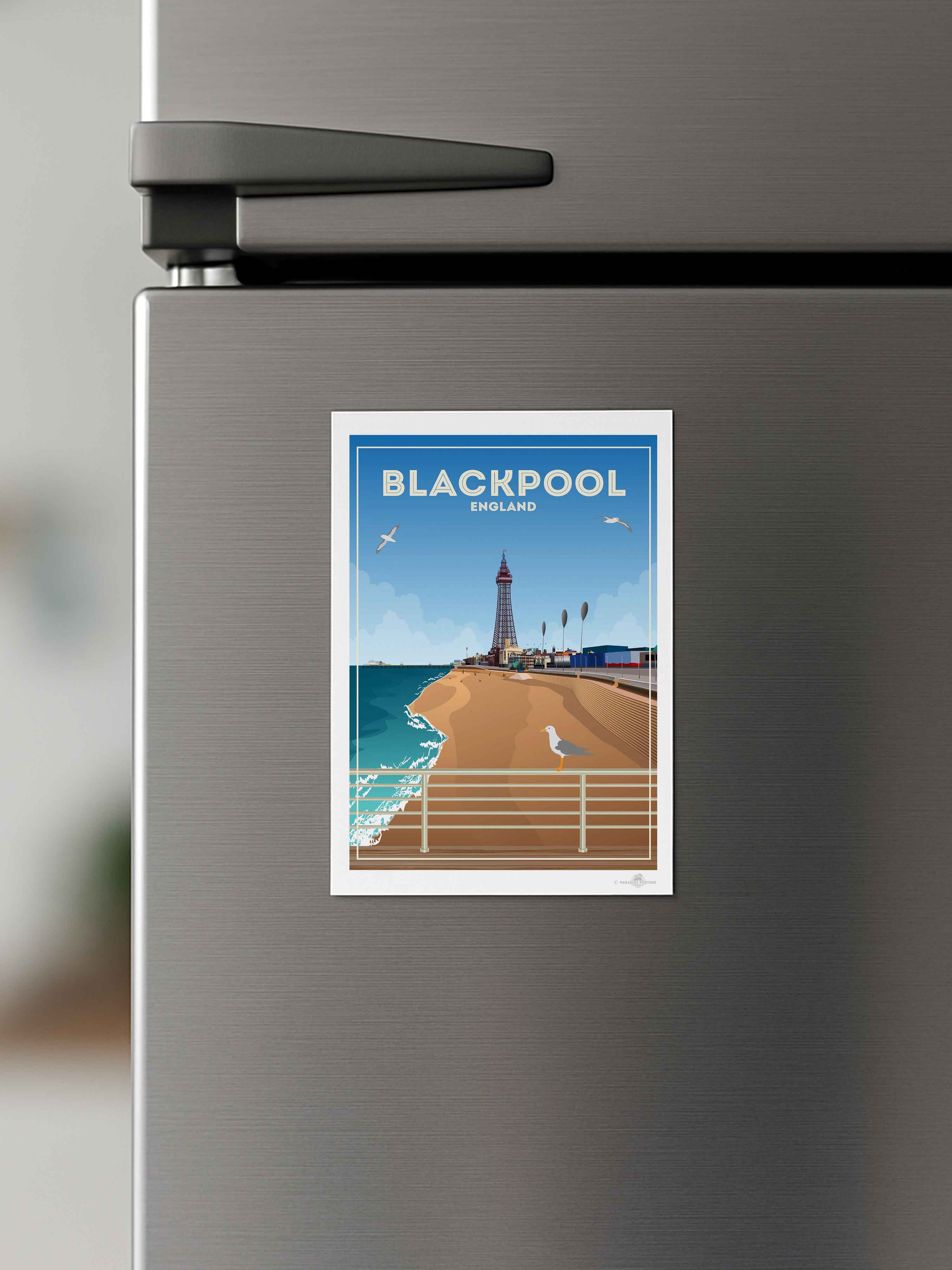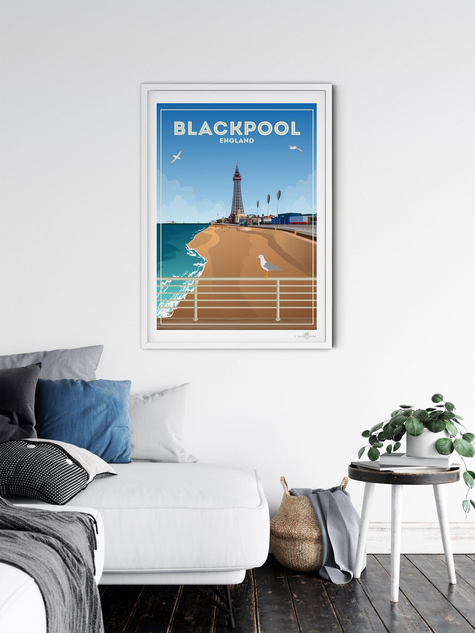 The most well-known landmark in town (and within the UK, for that matter) is Blackpool Tower, which can be seen just behind the beach in our poster design. At 158 metres tall and designed using inspiration of the Eiffel Tower, it first opened to the public in 1894. From the very top visitors can enjoy views across the promenade and Irish Sea, the brave ones can also walk across a section of glass floor that shows views of the tower 380ft directly below.