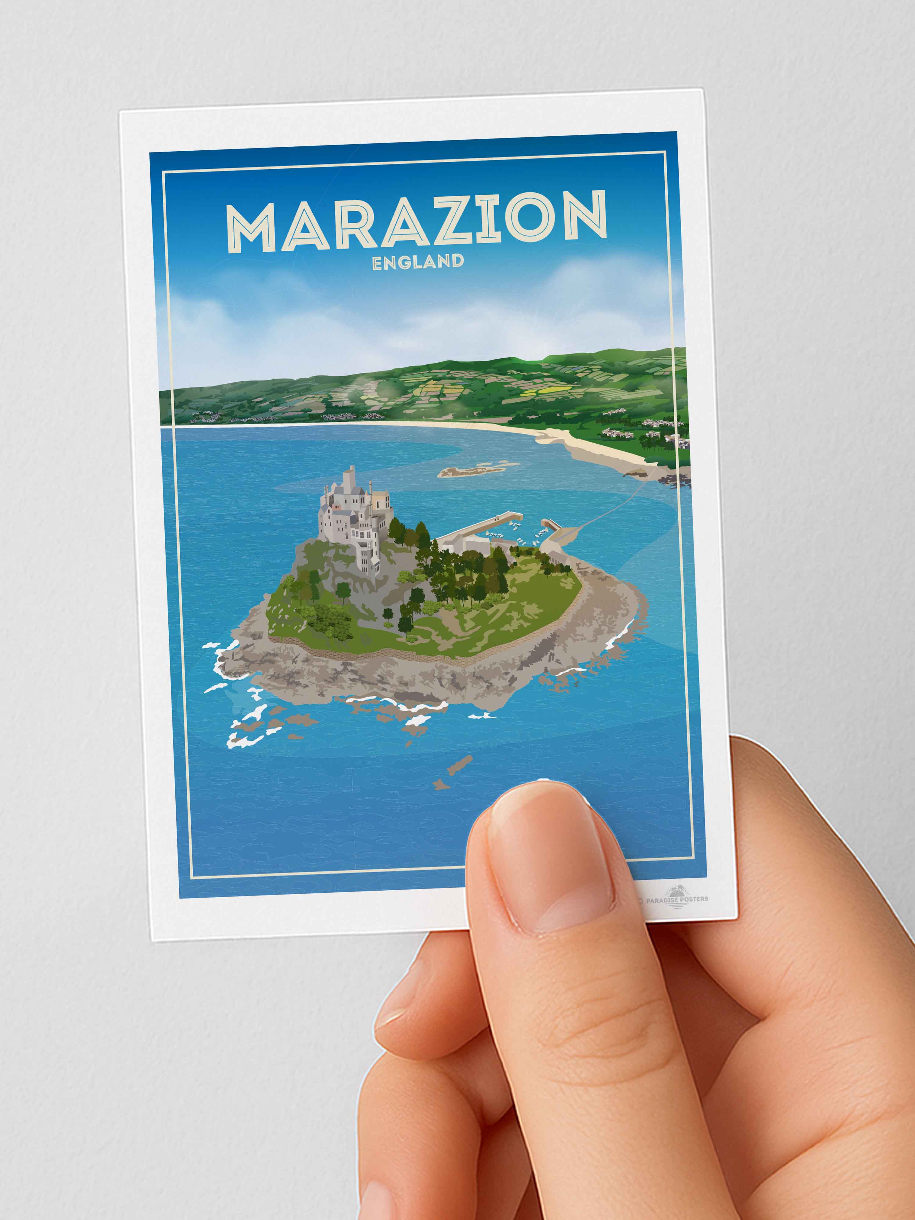 The most identifiable part of Marazion is St Michael's Mount, which is what can be seen in our poster design. This little island is half a mile off the shore and is accessed via a causeway or small boats. The castle sitting majestically on top is almost 230 feet above sea level and remains the home of the St Aubyn family (retained by a 999 year lease) who have opened the building and its grounds to the public. As well as the castle, the island has its own little village thats home to around 30 residents.