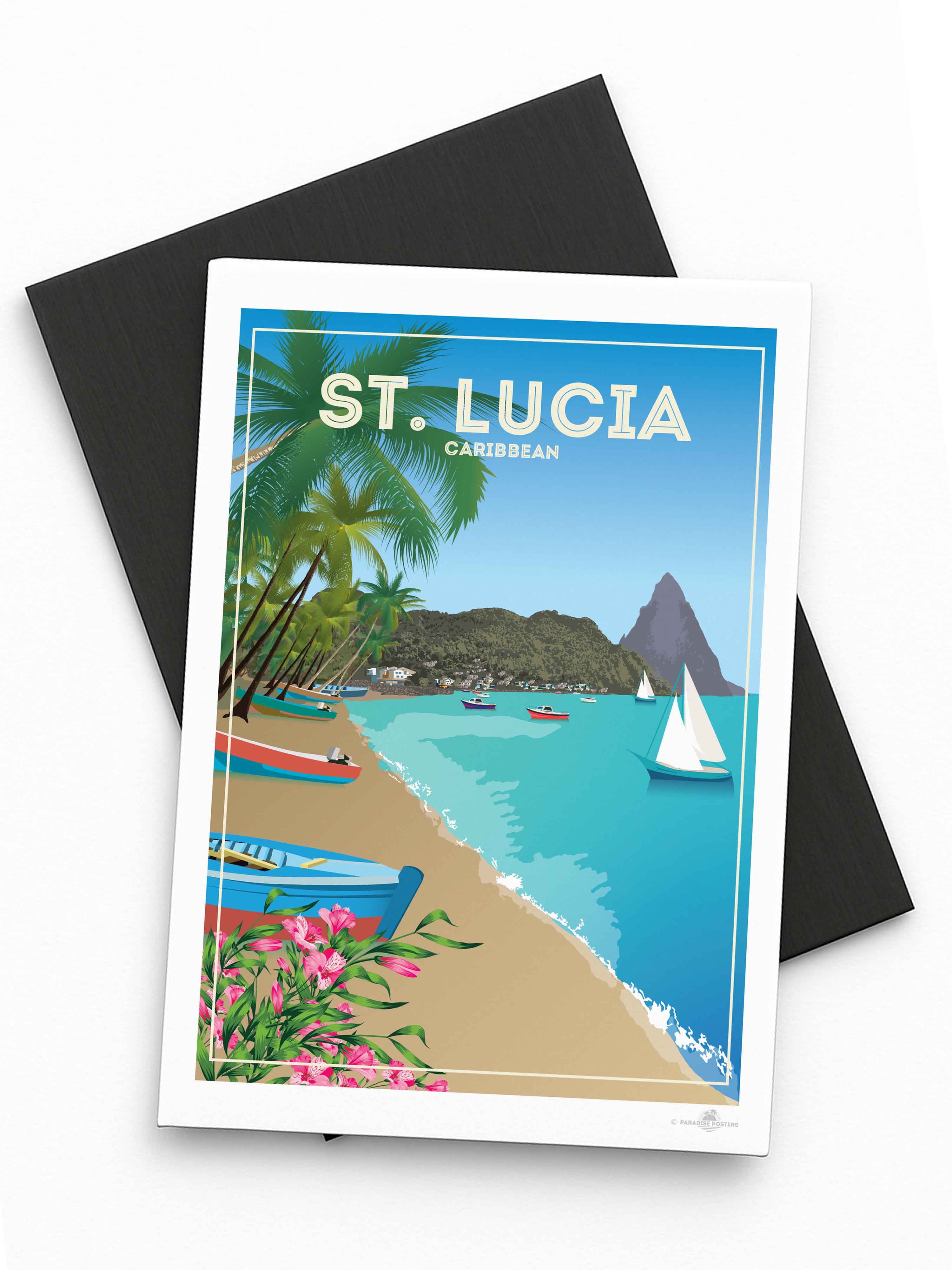 Die Aussicht in unserem Design ist vom Strand Anse des Pitons, der allgemein als der beste Ort in St. Lucia gilt. Er liegt zwischen den Gipfeln Gros und Petit Piton, vor einer 100 Hektar großen tropischen Waldkulisse und mit unberührtem weißen Sand (der aus Guyana importiert wird) und wird manchmal als Zuckerstrand bezeichnet. Das Wasser in dieser Bucht ist sehr ruhig und eignet sich daher ideal zum Schwimmen und Schnorcheln. Außerdem steht er unter dem Schutz des St. Lucia National Marine Reserve.