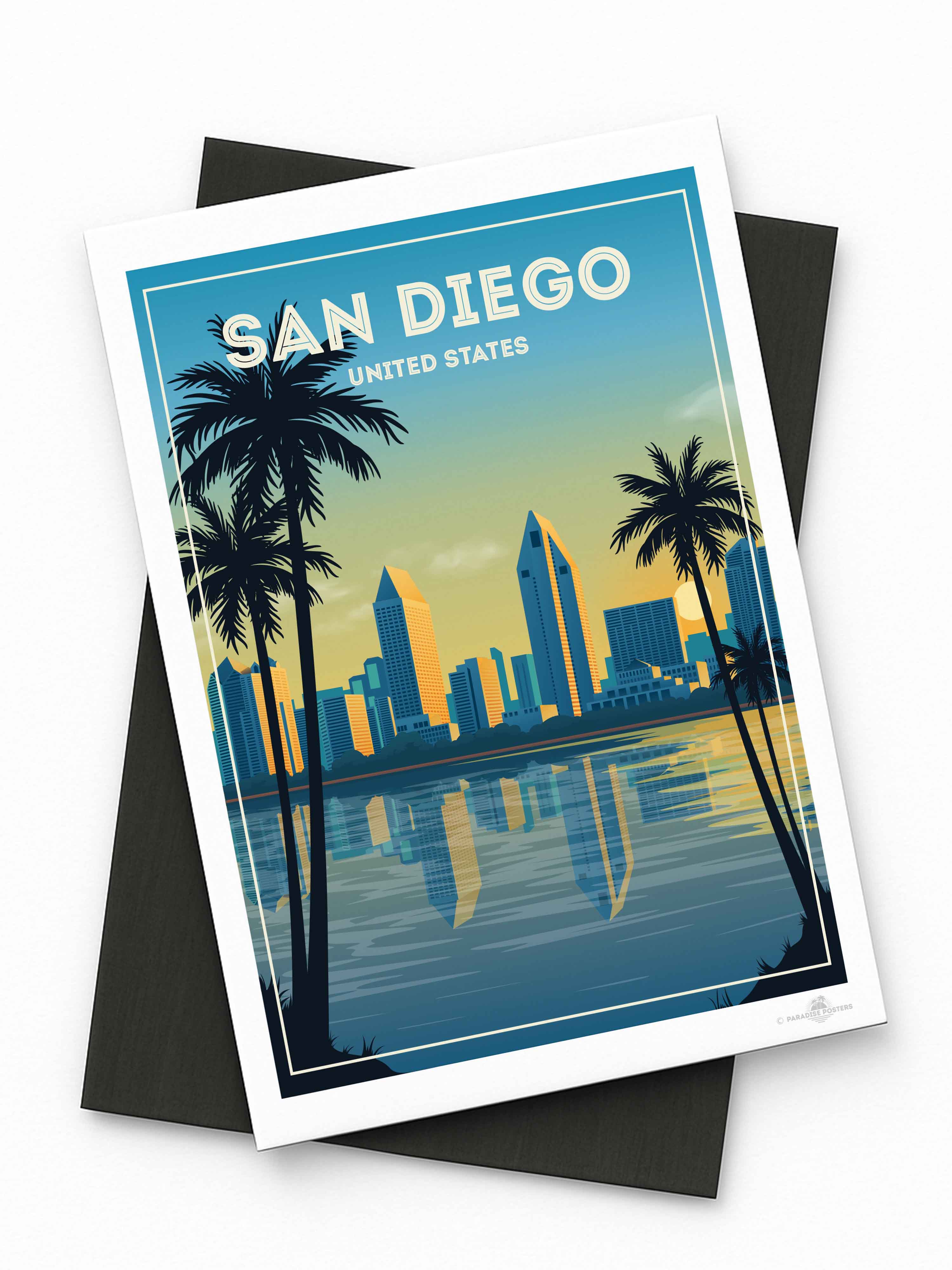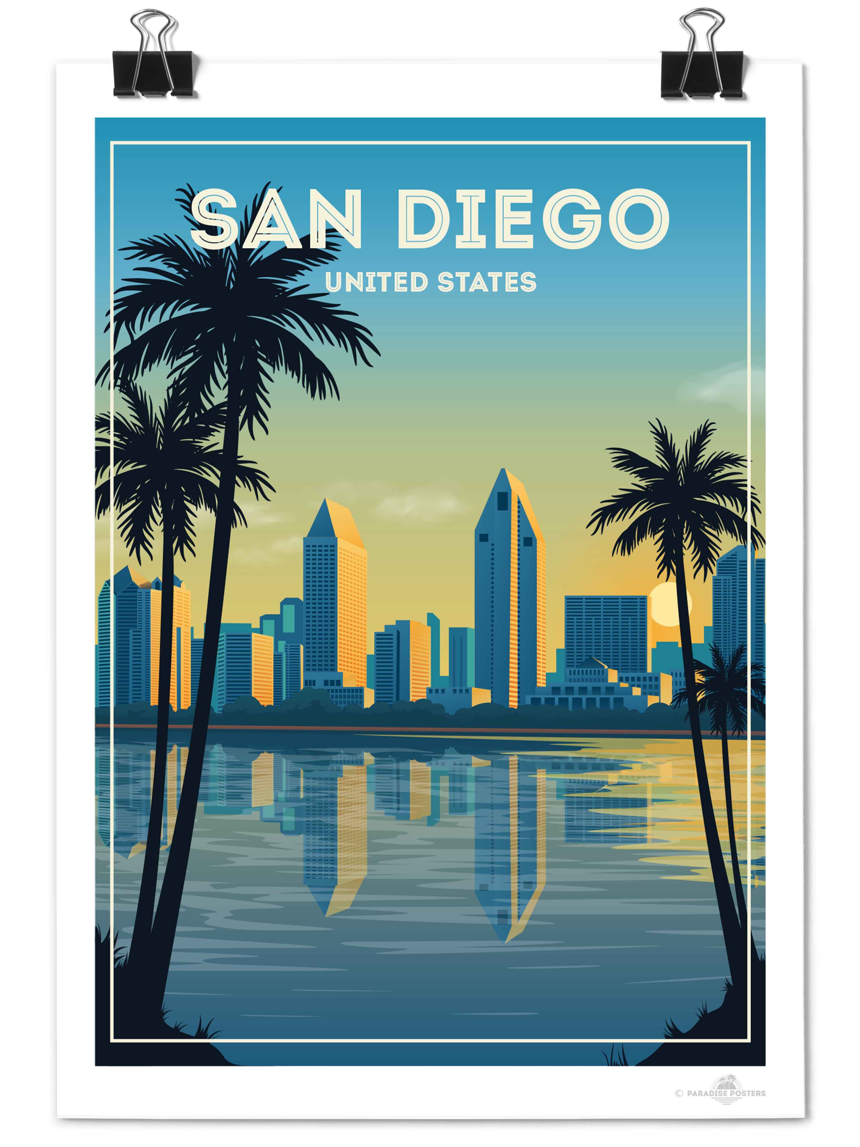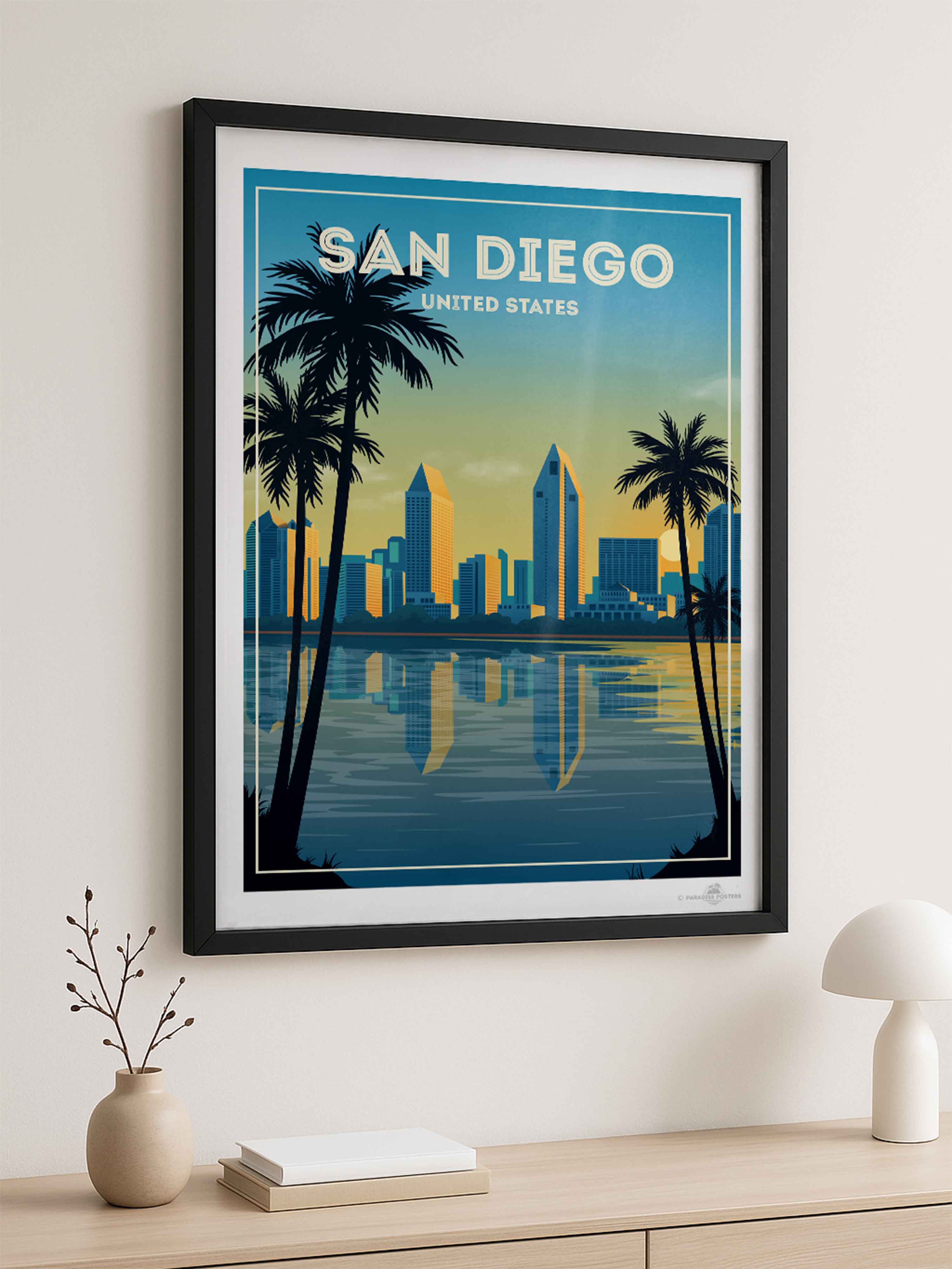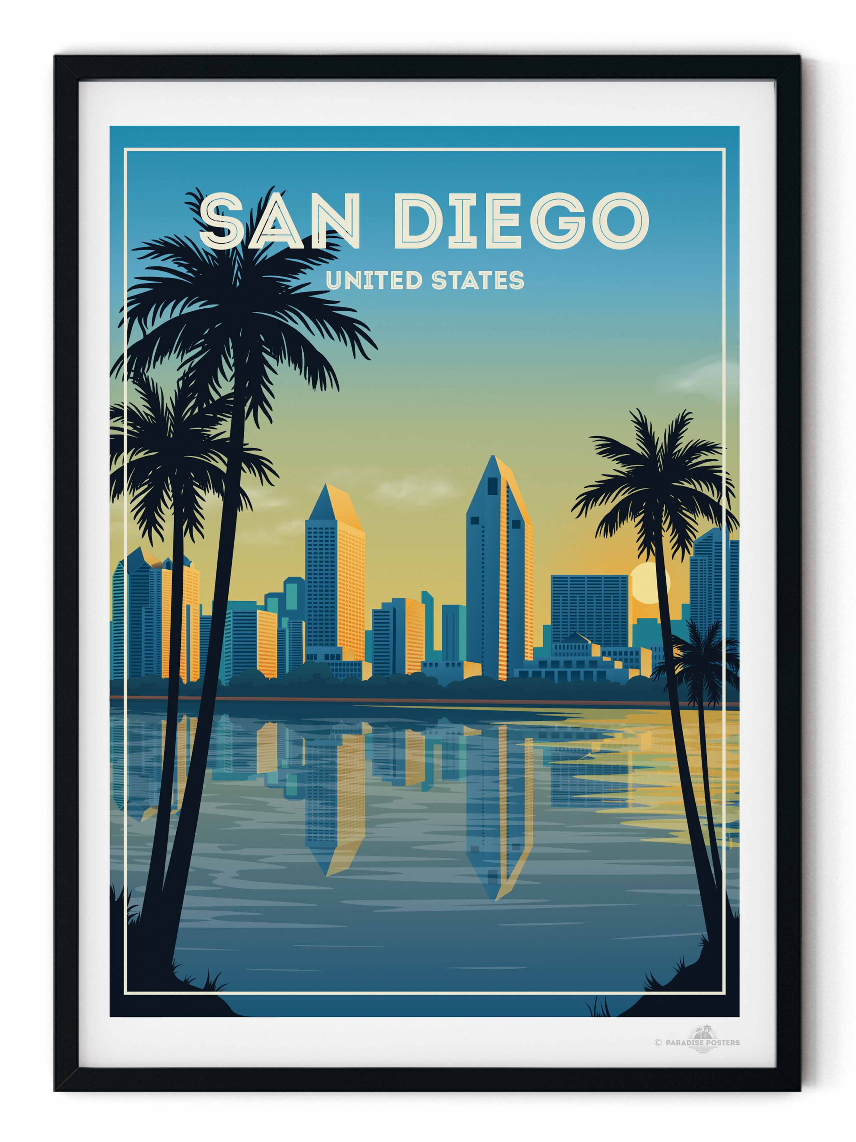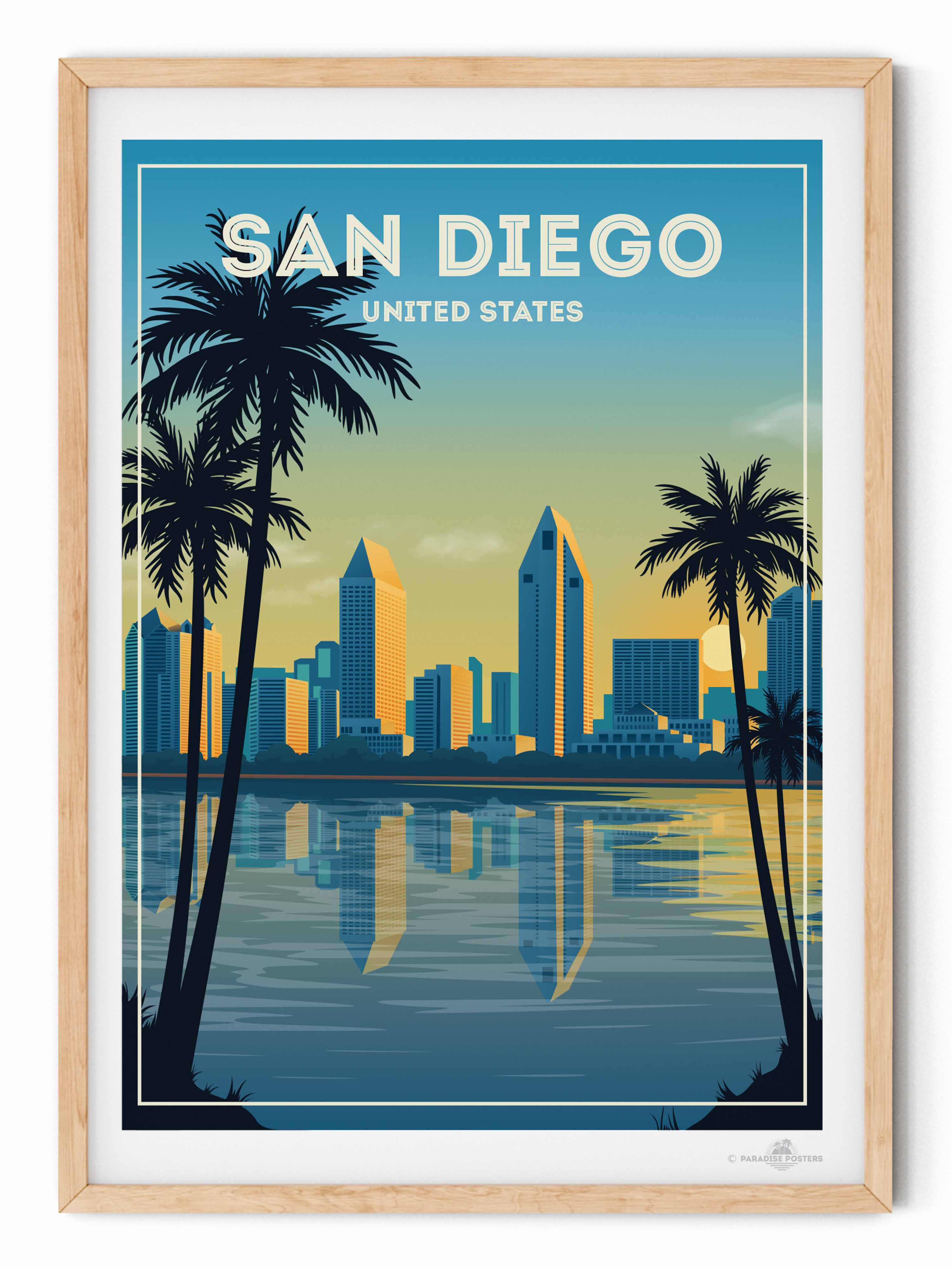 Αιχμαλωτίστε τη χαλαρή γοητεία και την παραλιακή κομψότητα της Νότιας Καλιφόρνια με αυτή τη ζωντανή ταξιδιωτική αφίσα στο Σαν Ντιέγκο από τη συλλογή μας Paradise Posters. Με έναν ορίζοντα γεμάτο το ηλιοβασίλεμα με τις εμβληματικές πολυκατοικίες της πόλης που καθρεφτίζονται στα ήρεμα νερά του κόλπου, αυτό το έργο τέχνης εκπέμπει ζεστασιά, ηρεμία και δροσιά στη Δυτική Ακτή.
