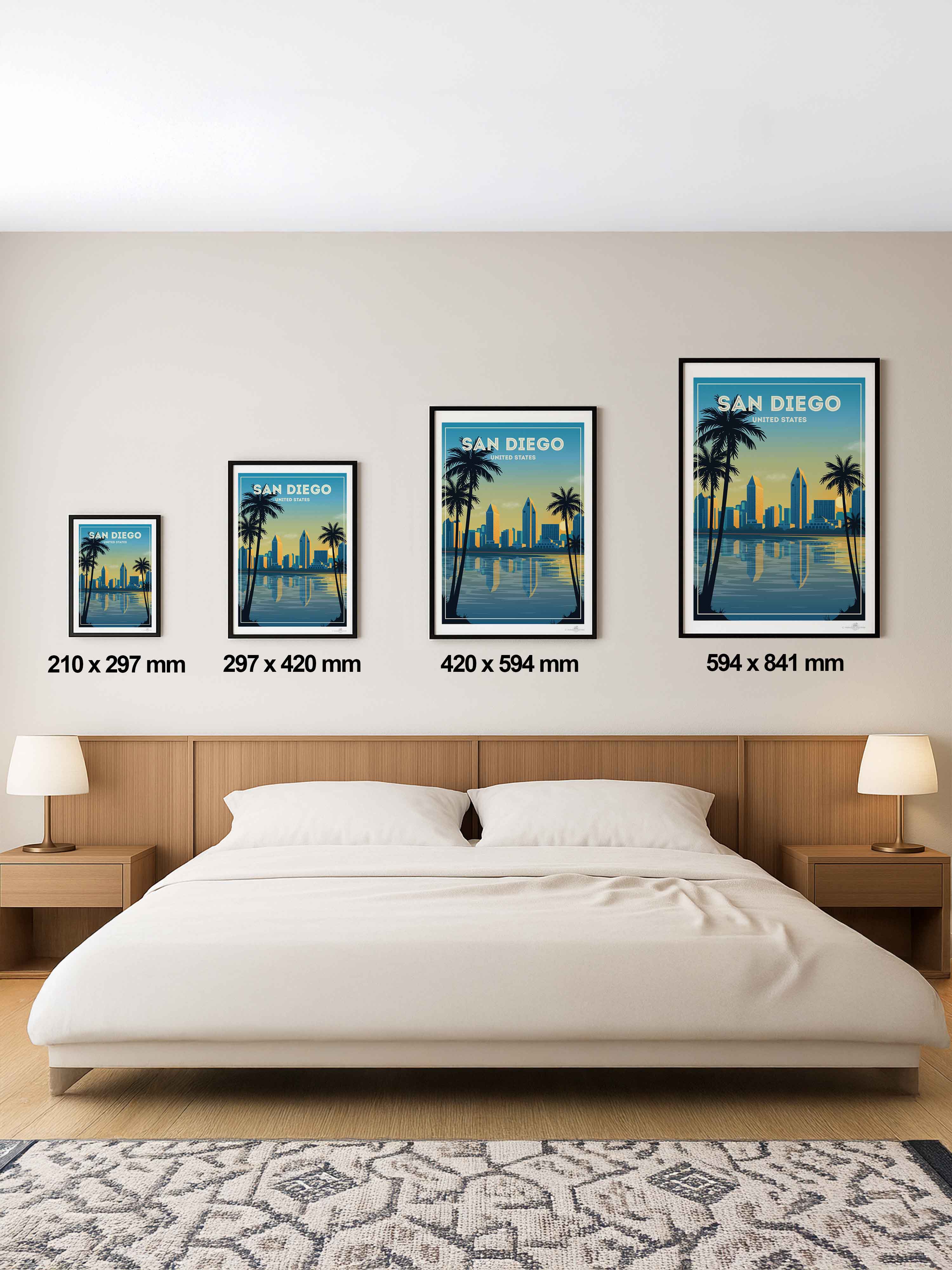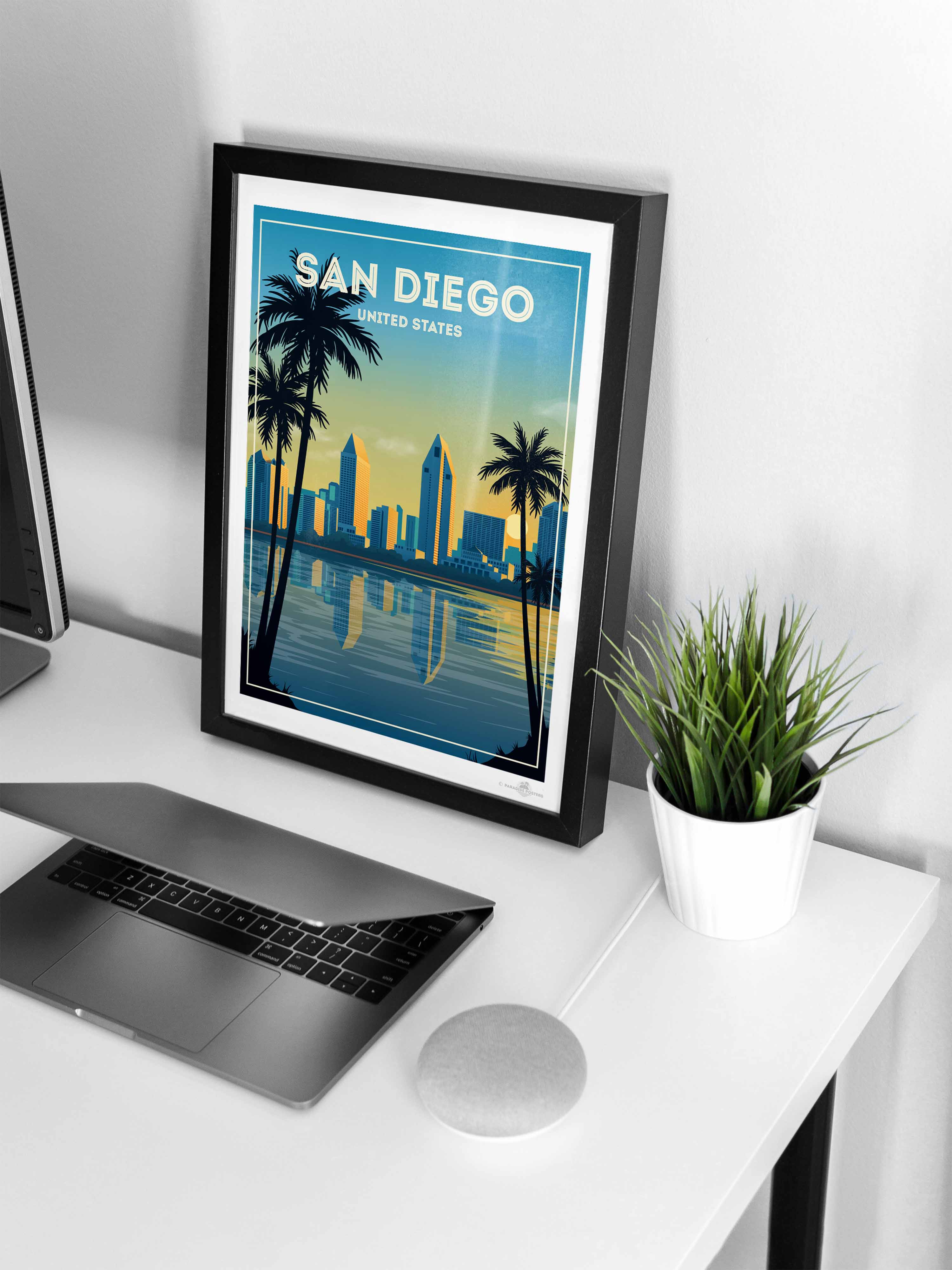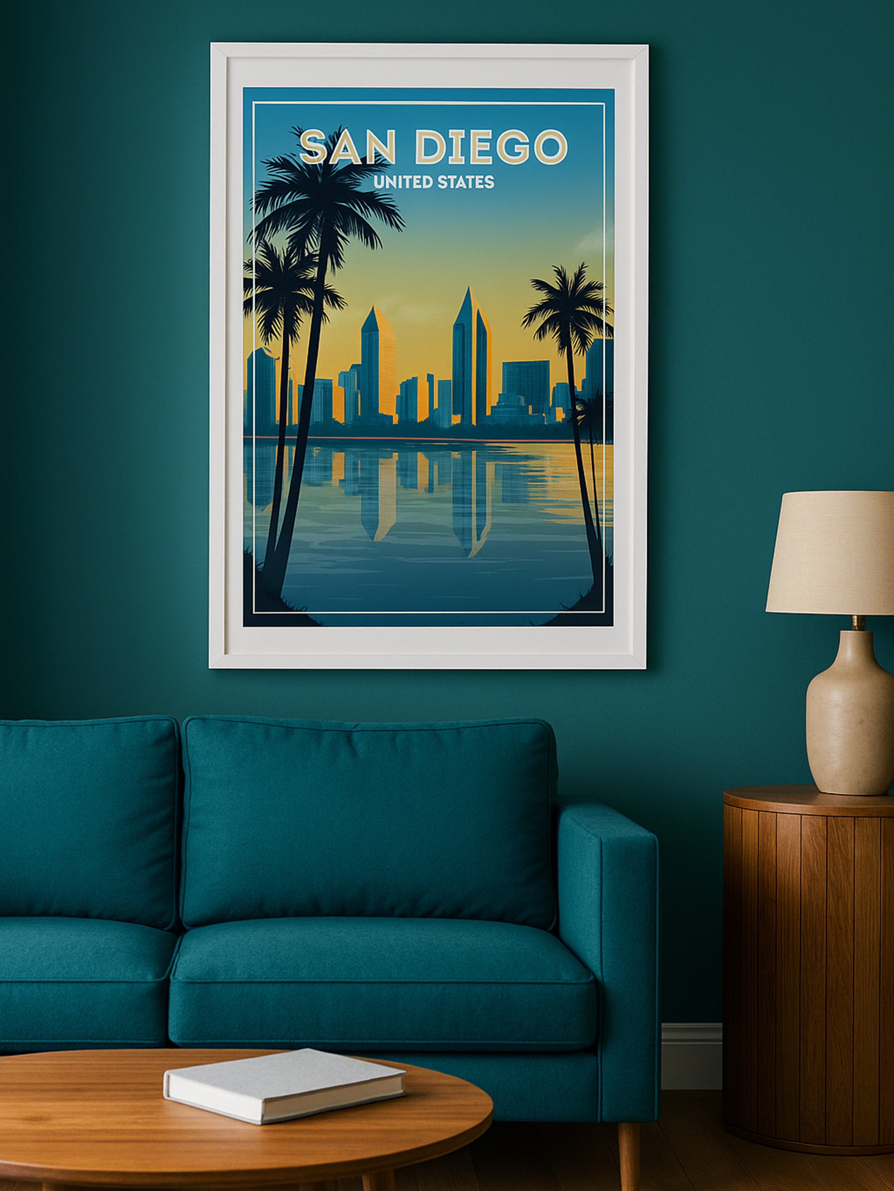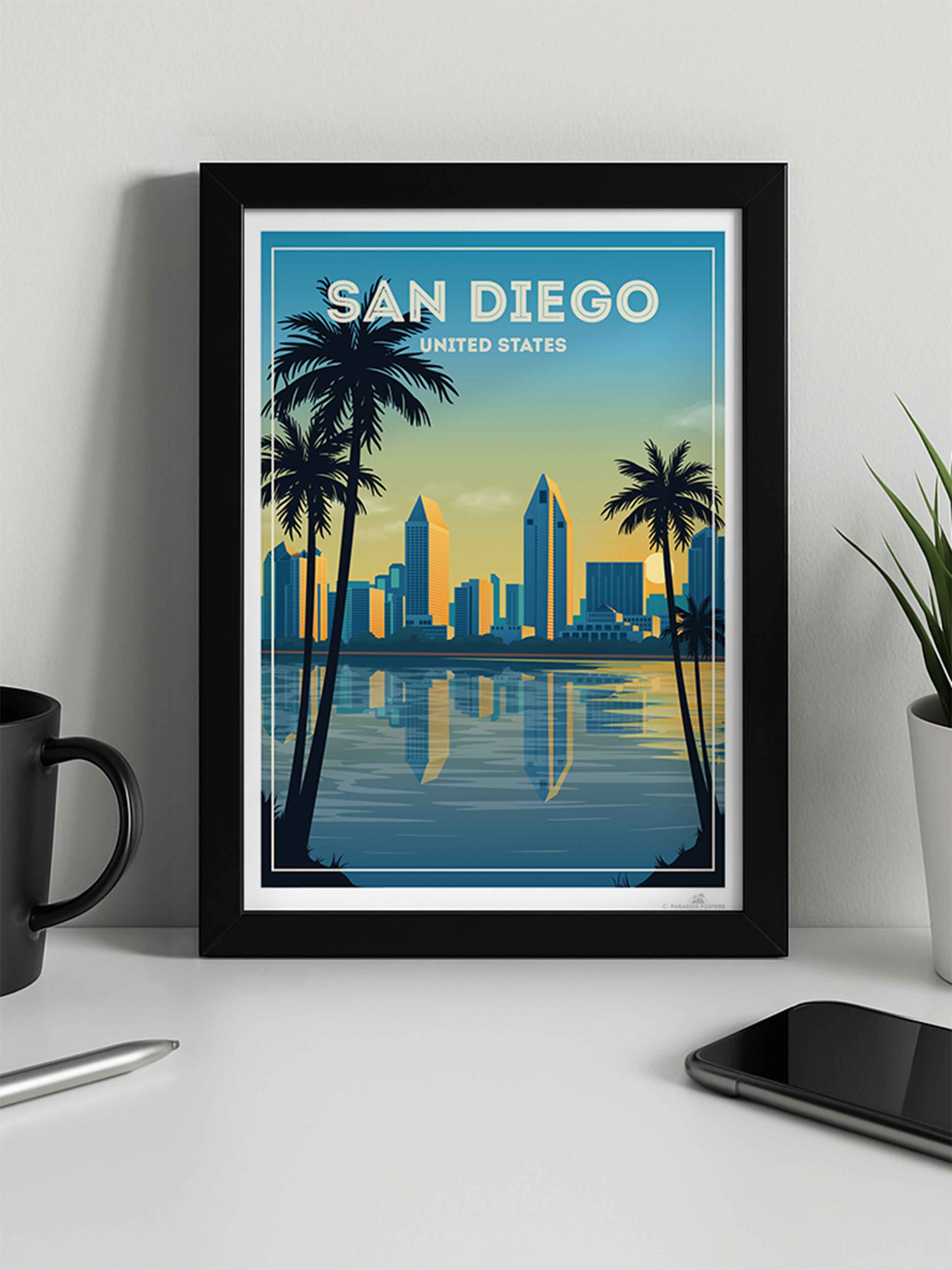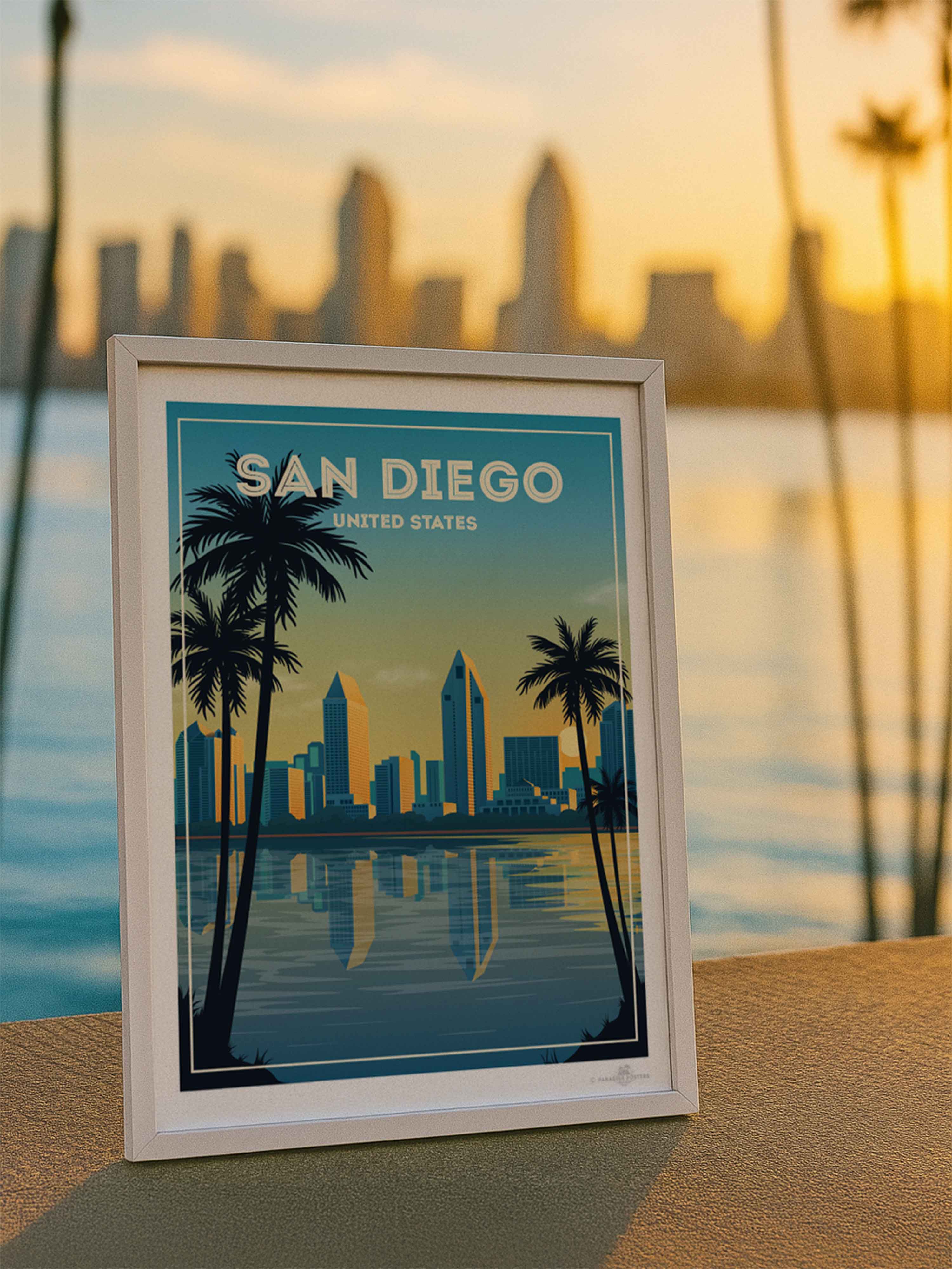 Καθαρισμένη από φοίνικες με σιλουέτα και λουσμένη σε χρυσές και μπλε αποχρώσεις, η σκηνή παραπέμπει στην τέλεια βραδιά του Σαν Ντιέγκο - όπου η πόλη συναντά τη θάλασσα σε έναν γαλήνιο προβληματισμό. Από την ξεχωριστή αρχιτεκτονική του κέντρου μέχρι την ακτογραμμή με τους φοίνικες, αυτή η αφίσα είναι απαραίτητη για τους ντόπιους, τους ταξιδιώτες ή οποιονδήποτε ονειρεύεται την αύρα του Ειρηνικού.