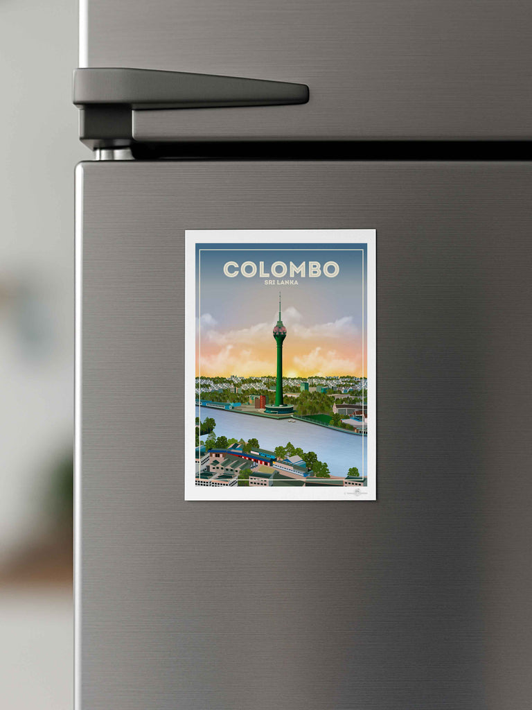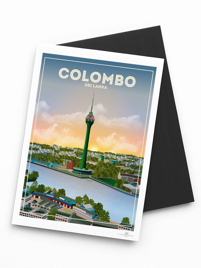 Το ψηλό κτίριο που φαίνεται στο σχέδιο της αφίσας μας είναι ο Πύργος του Lotus (ονομάστηκε λόγω του μοναδικού του σχήματος), που μερικές φορές αναφέρεται ως Colombo Lotus Tower και έχει γίνει κάτι σαν συμβολικό ορόσημο για τη χώρα. Με ύψος 350 μέτρα είναι ο 19ο ψηλότερος πύργος στον κόσμο και χρησιμοποιείται για επικοινωνία, αναψυχή και γενική παρατήρηση. Ο πύργος βρίσκεται μπροστά από τη λίμνη Beira στο κέντρο του Κολόμπο, η οποία περιβάλλεται από πολλές από τις μεγάλες επιχειρήσεις της πόλης. Στη λίμνη δόθηκε ένα πορτογαλικό όνομα μετά την κατοχή της περιοχής (μαζί με τους Άγγλους και τους Ολλανδούς) στην εποχή της αποικίας.