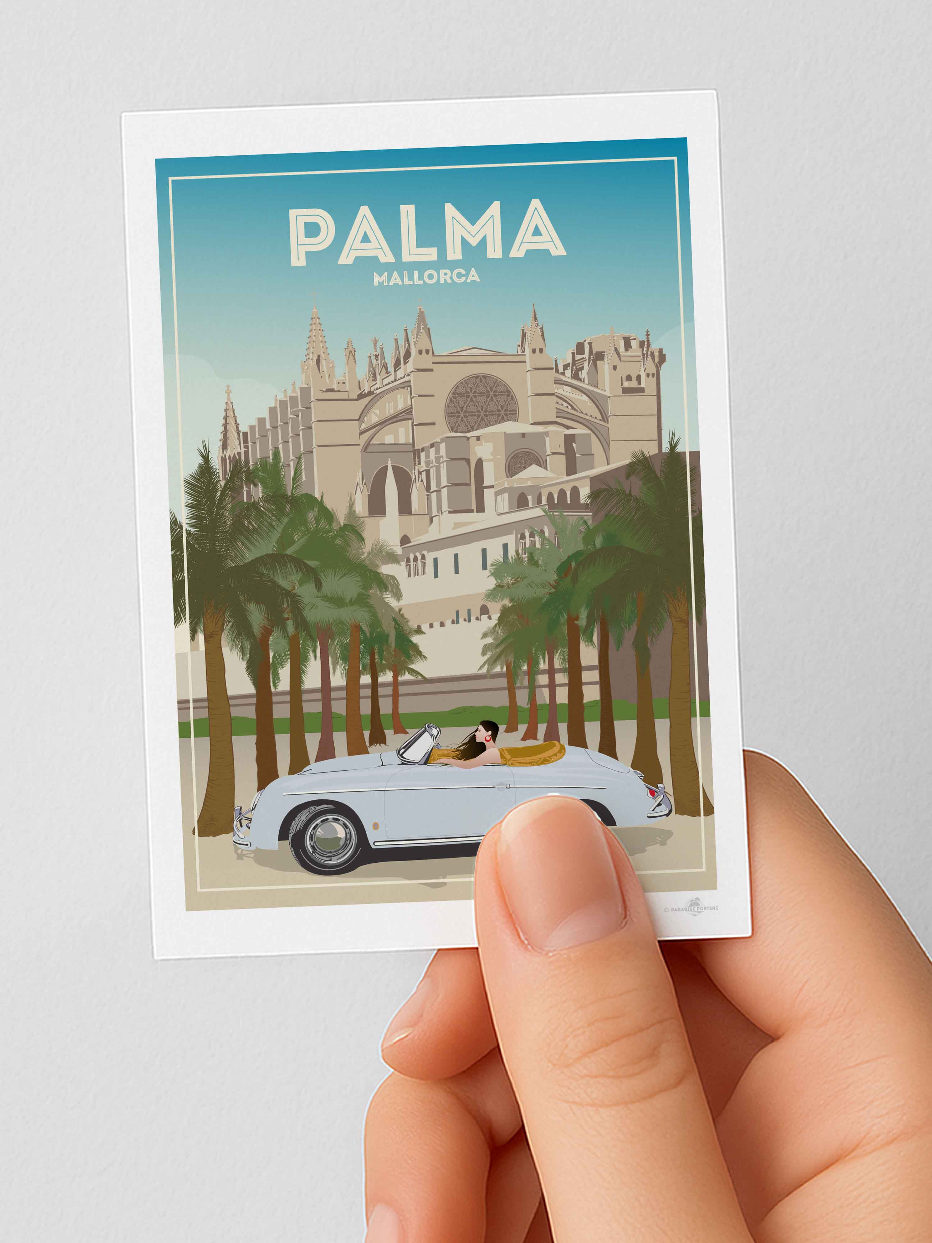 Βυθιστείτε στην ομορφιά της Πάλμα ντε Μαγιόρκα με αυτήν την εκπληκτική ταξιδιωτική αφίσα. Ο ζωντανός τιρκουάζ ουρανός και οι καταπράσινοι φοίνικες συμπληρώνουν τέλεια την εκπληκτική γοτθική αρχιτεκτονική του καθεδρικού ναού της πόλης. Ένα must-have για κάθε λάτρη των ταξιδιών που θέλει να συλλάβει την ουσία αυτής της γοητευτικής μεσογειακής πόλης. Προσθέστε μια νότα κομψότητας στη διακόσμηση του σπιτιού ή του γραφείου σας και μεταφερθείτε στις ηλιόλουστες ακτές της Πάλμα ντε Μαγιόρκα. Ιδανικό για τους λάτρεις της μεσογειακής κουλτούρας, ιστορίας και τέχνης.