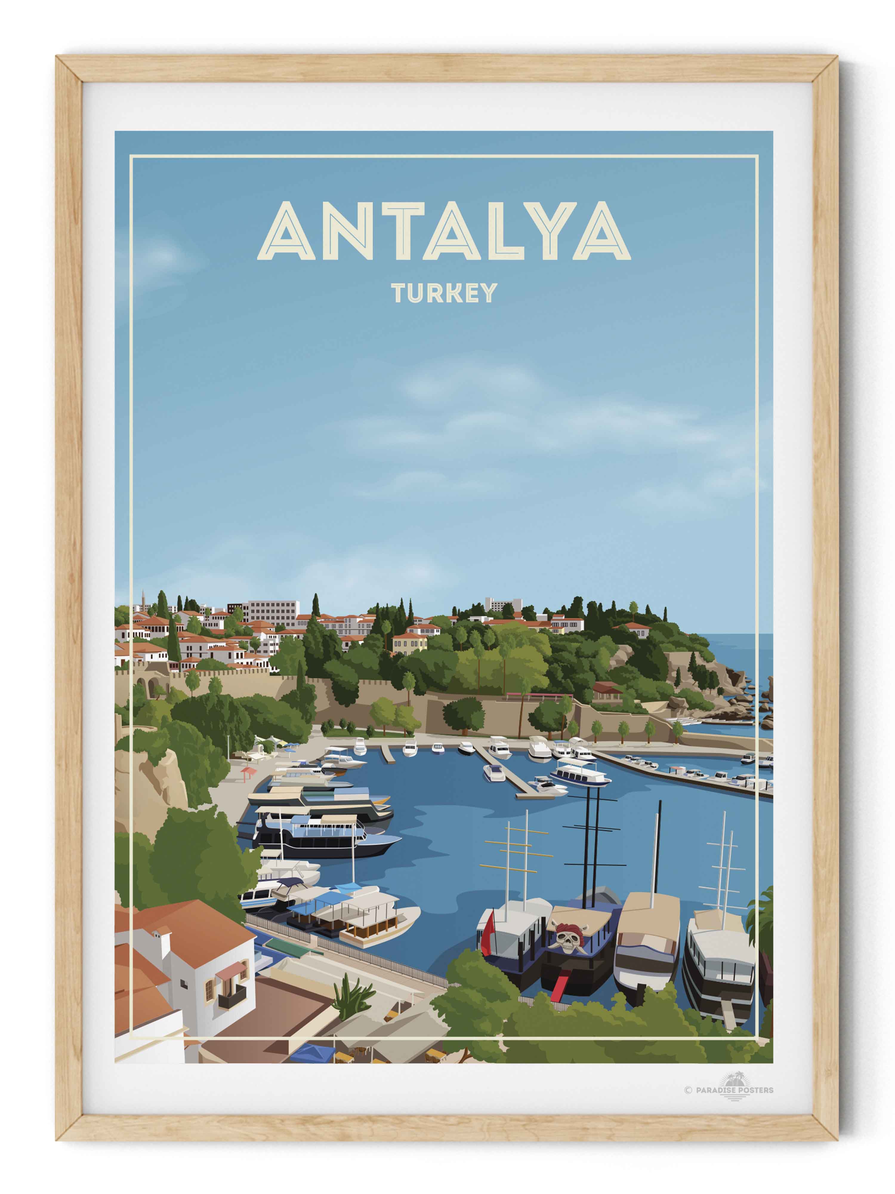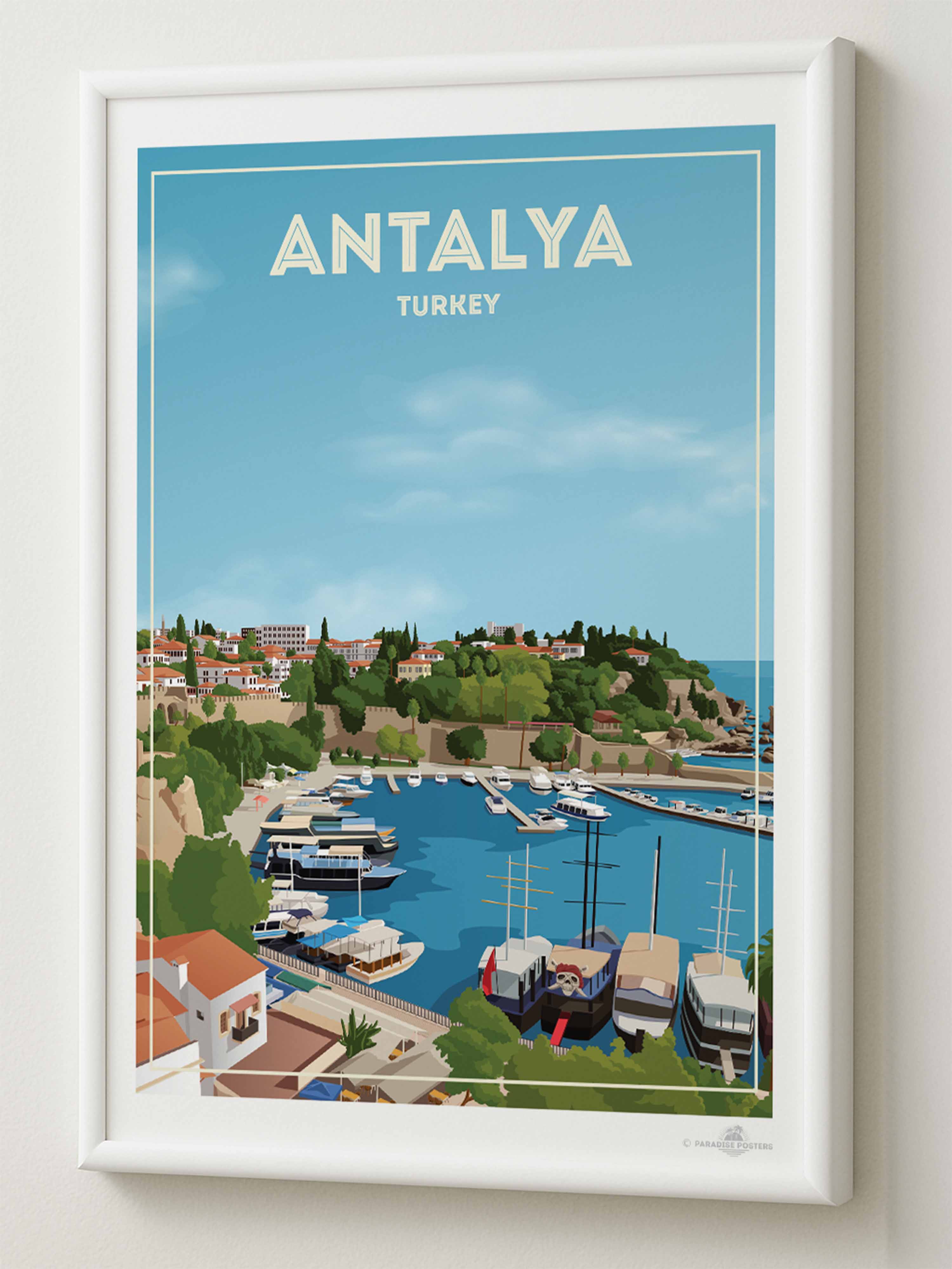 Τυπωμένο με έντονα χρώματα και πλούσιες λεπτομέρειες, αυτό το κομμάτι είναι ιδανικό για όποιον έχει εξερευνήσει το λιμάνι της Αντάλια, έχει περπατήσει στους δρόμους πάνω από τα βράχια ή απλά ονειρεύεται να αποδράσει σε μια ζεστή, ηλιόλουστη ακτή.