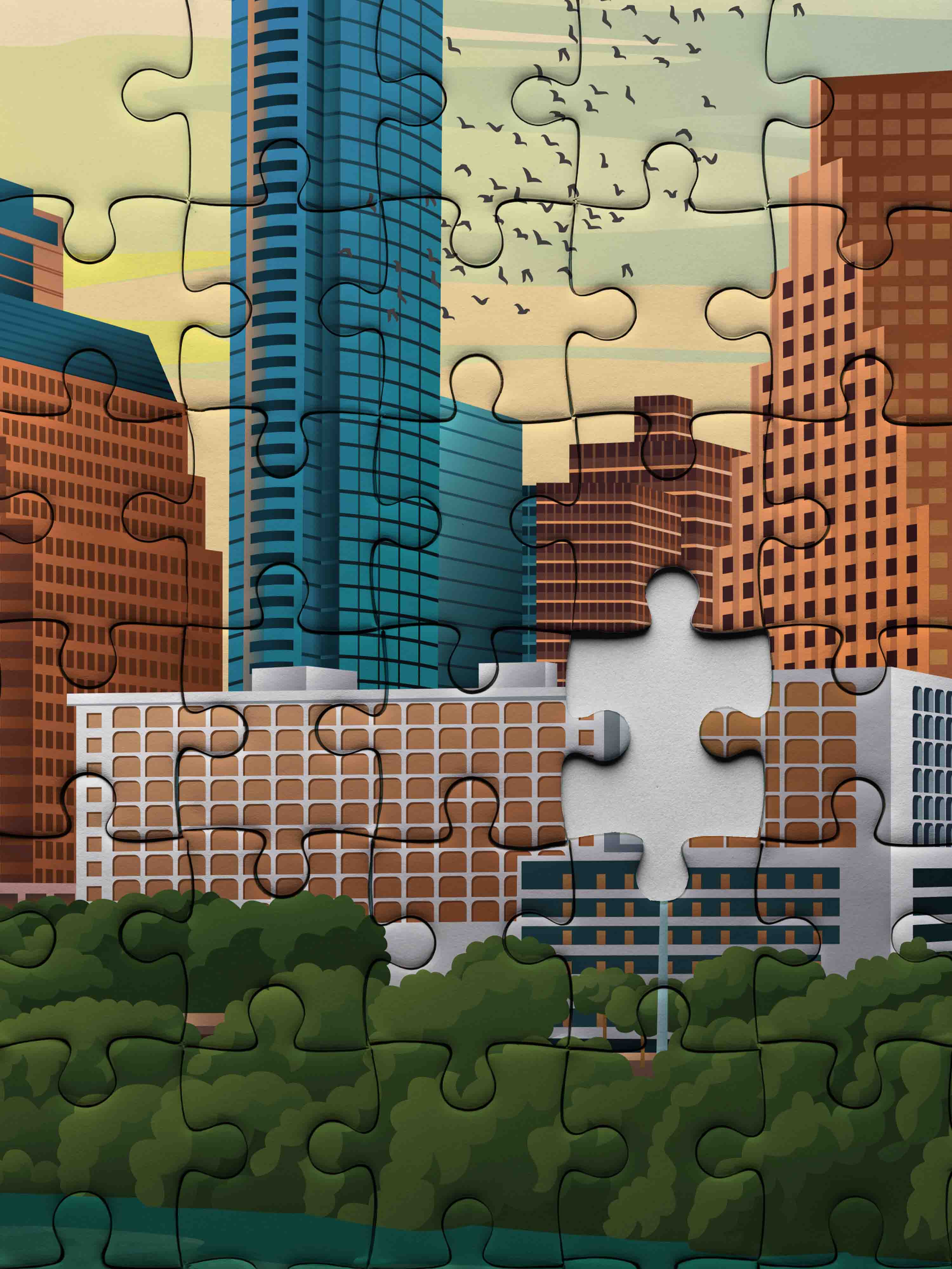 Ήσυχες στιγμές δίπλα στο νερό, ο ορίζοντας του Austin να αντανακλάται σε απαλούς κυματισμούς — αυτό το παζλ αποτυπώνει τη ζωντανή αστική θέα του Texas στο λυκόφως. Ο καταπραϋντικός συνδυασμός ζεστών ώχρας και δροσερών μπλε αποπνέει μια ήρεμη αλλά ζωντανή ατμόσφαιρα.
