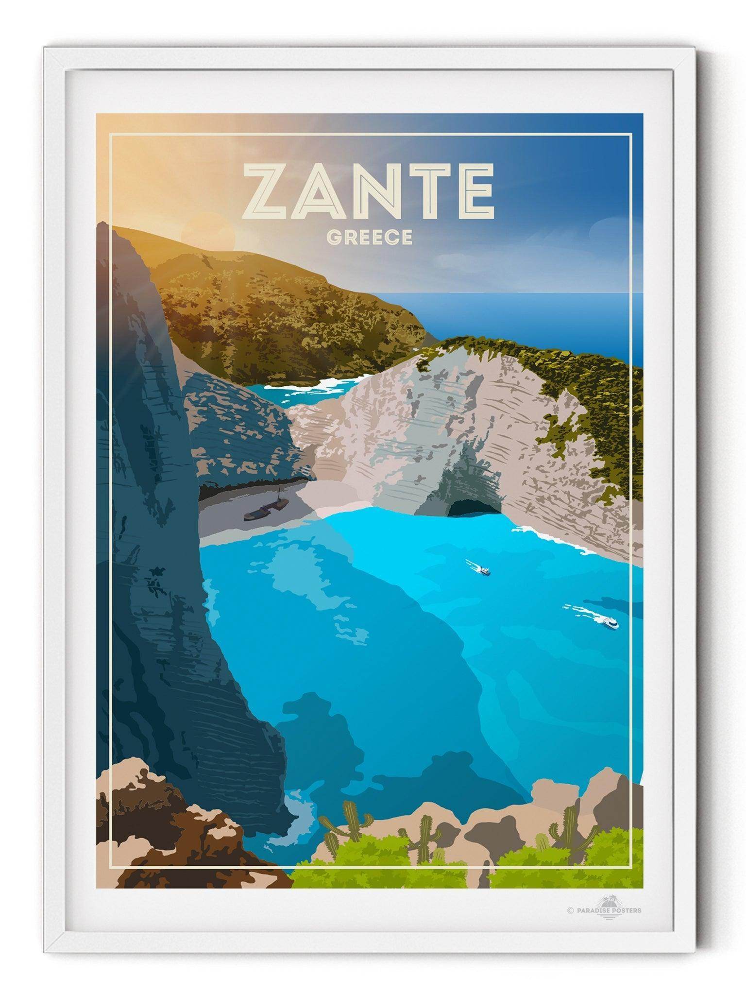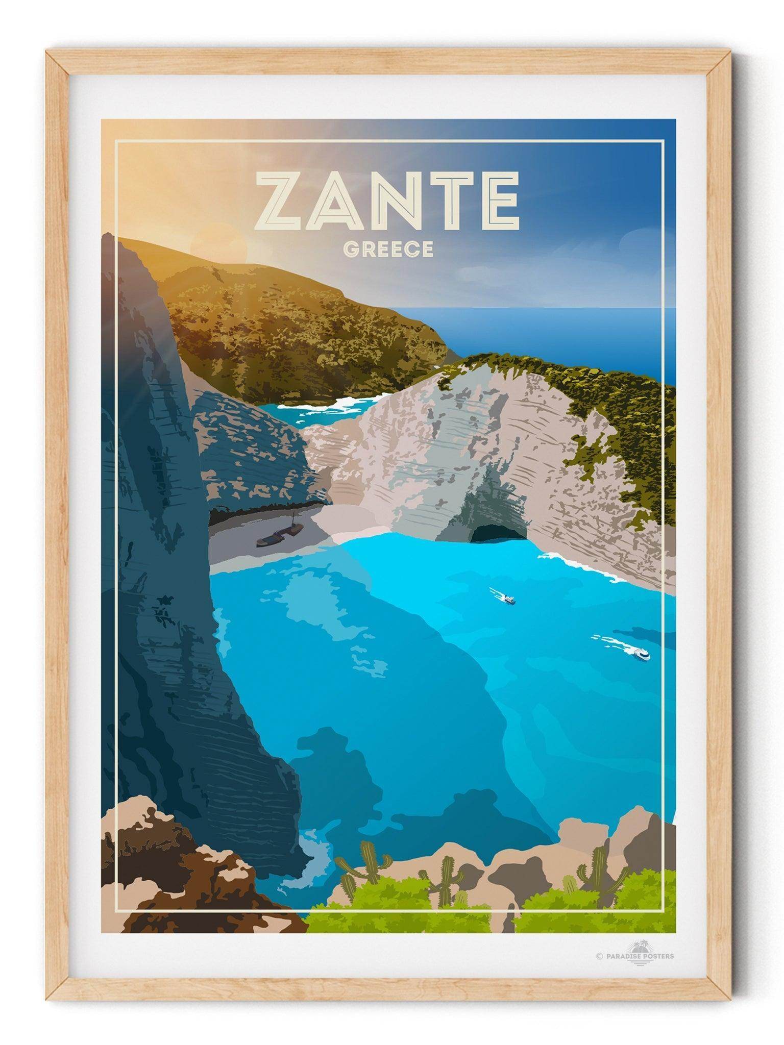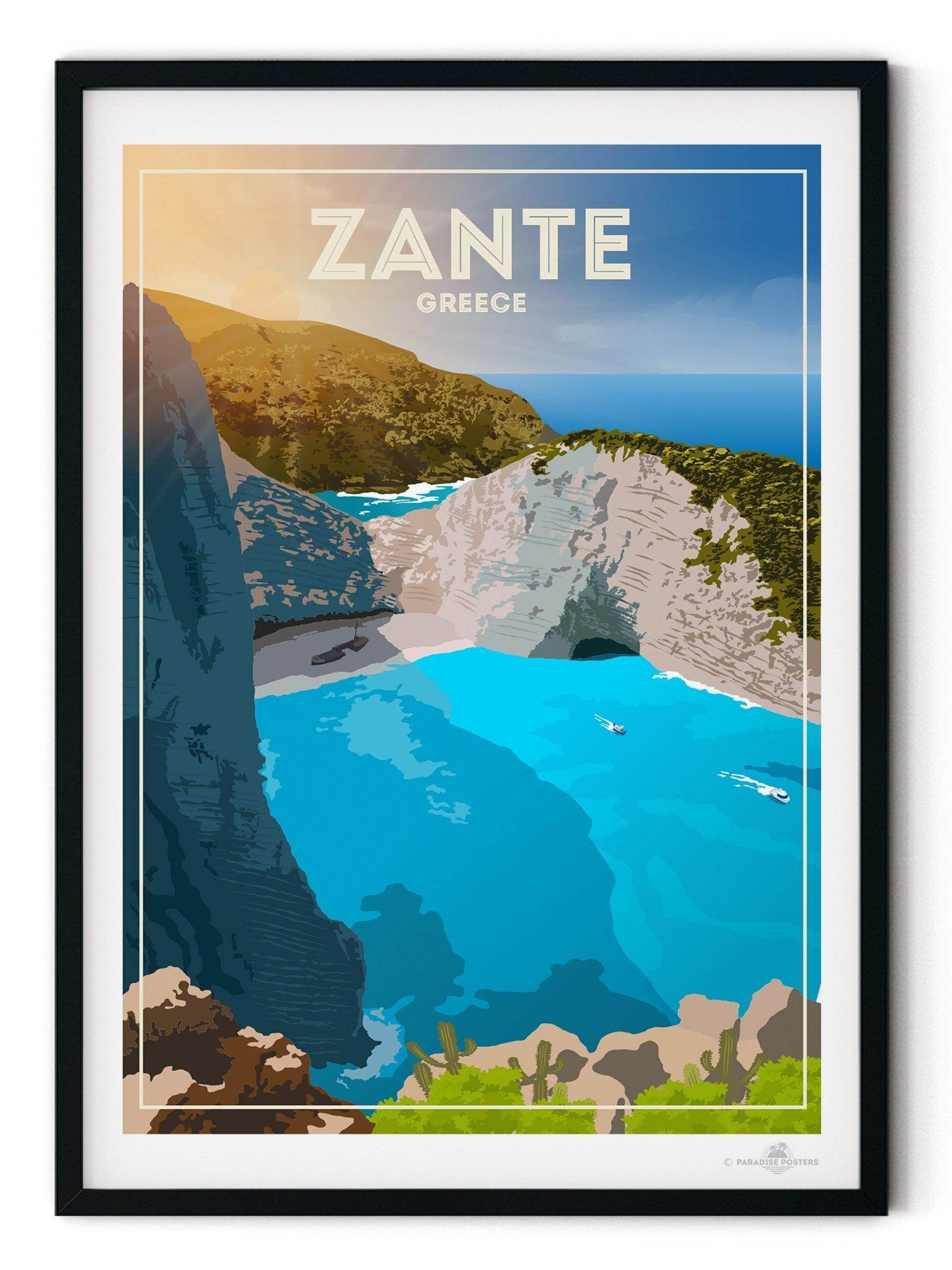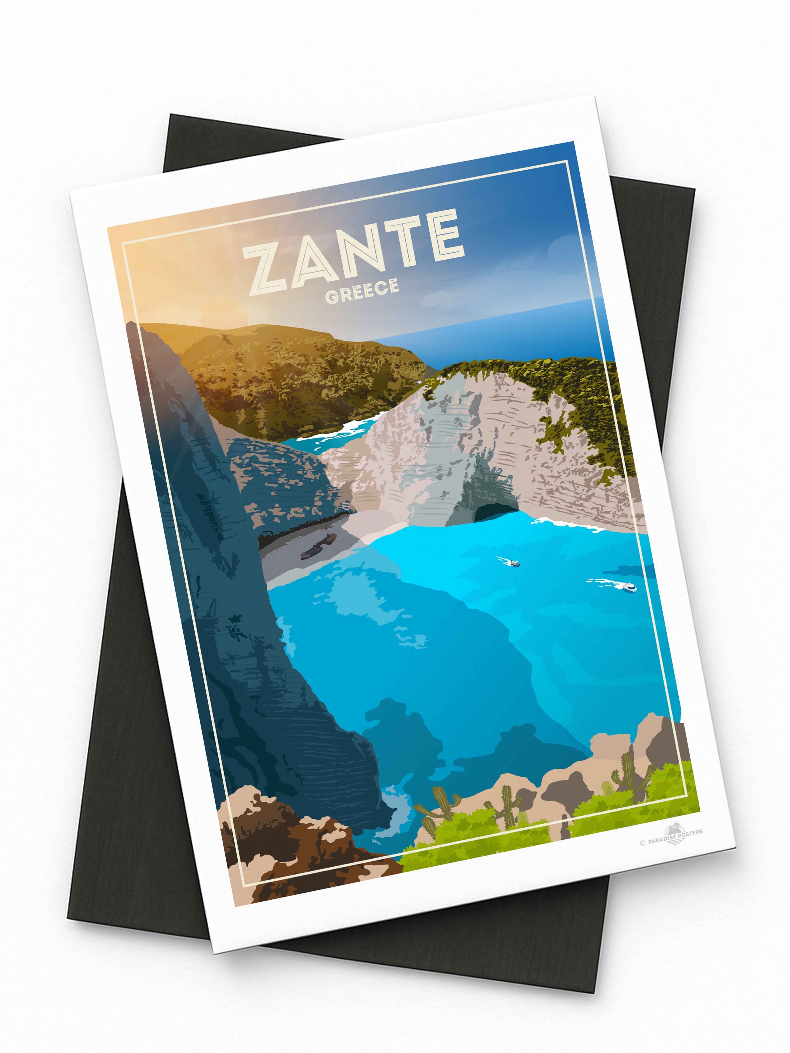 Η παραλία στο σχεδιασμό της αφίσας μας είναι το Navagio Bay, ή το "Shipwreck Beach's" είναι πιο γνωστό χάρη στα υπολείμματα του MV Panagiotis που ξεβράστηκε το 1980 στην παραλία Navagioit one of the most popular. από τις πιο πολυφωτογραφημένες παραλίες της Ελλάδας) παρά το γεγονός ότι είναι προσβάσιμο μόνο με σκάφος. Όσοι θέλουν να απολαύσουν μια πανοραμική θέα στον όρμο κατευθύνονται λίγο έξω από την Αναφωνήτρια και οι φωτογραφίες είναι 100% χωρίς φίλτρα - η θάλασσα είναι πραγματικά μια τόσο όμορφη απόχρωση του τιρκουάζ χάρη στη μεγάλη ποσότητα θειούχων σπηλαίων στην περιοχή.