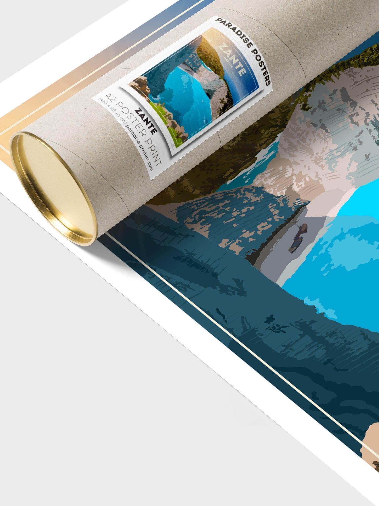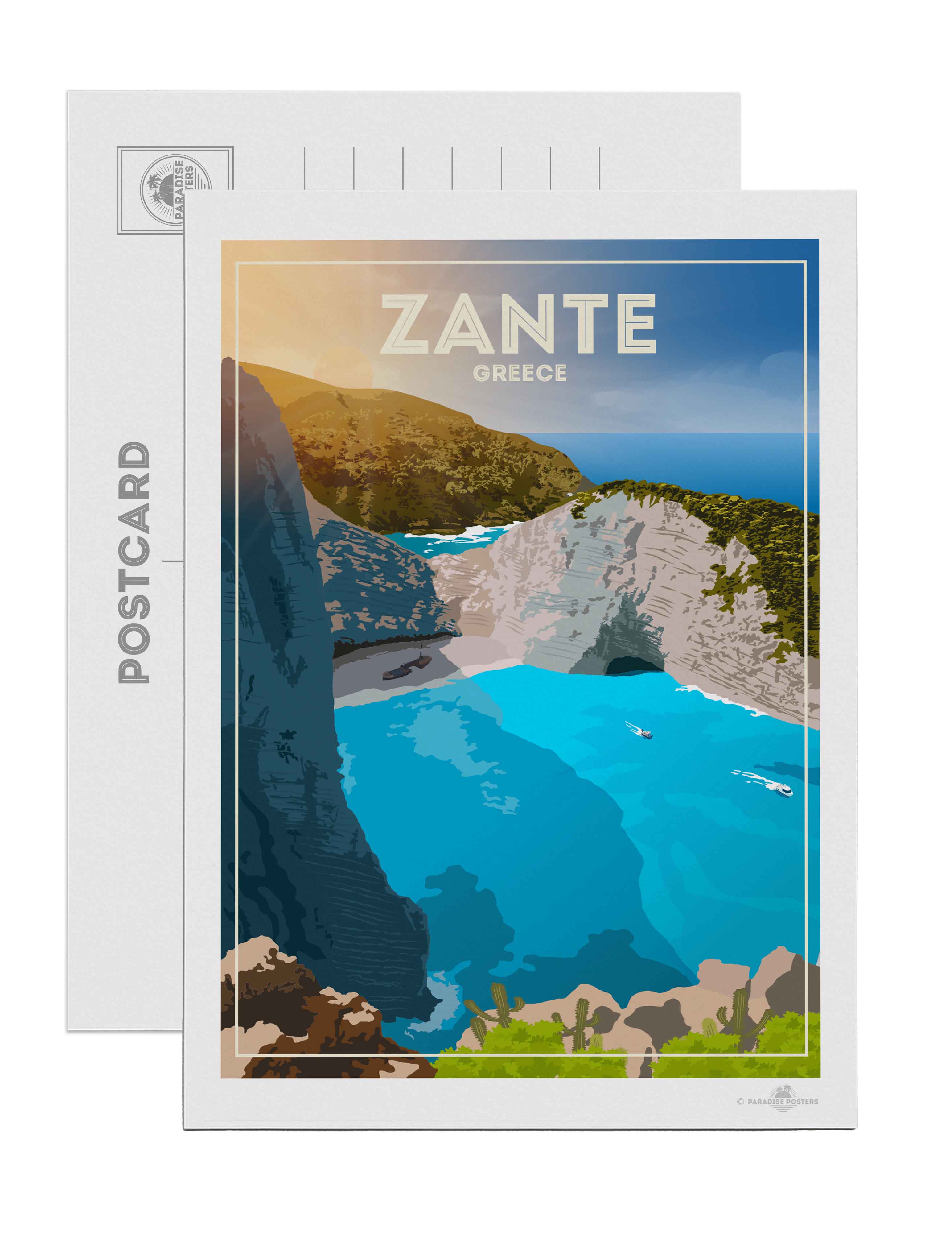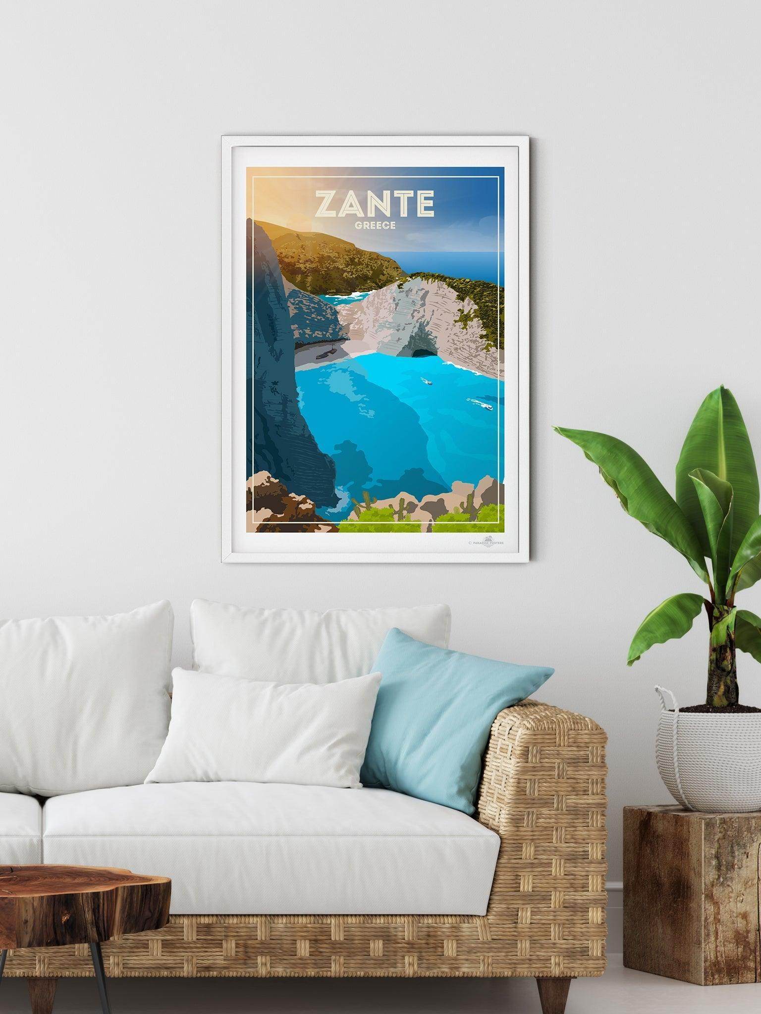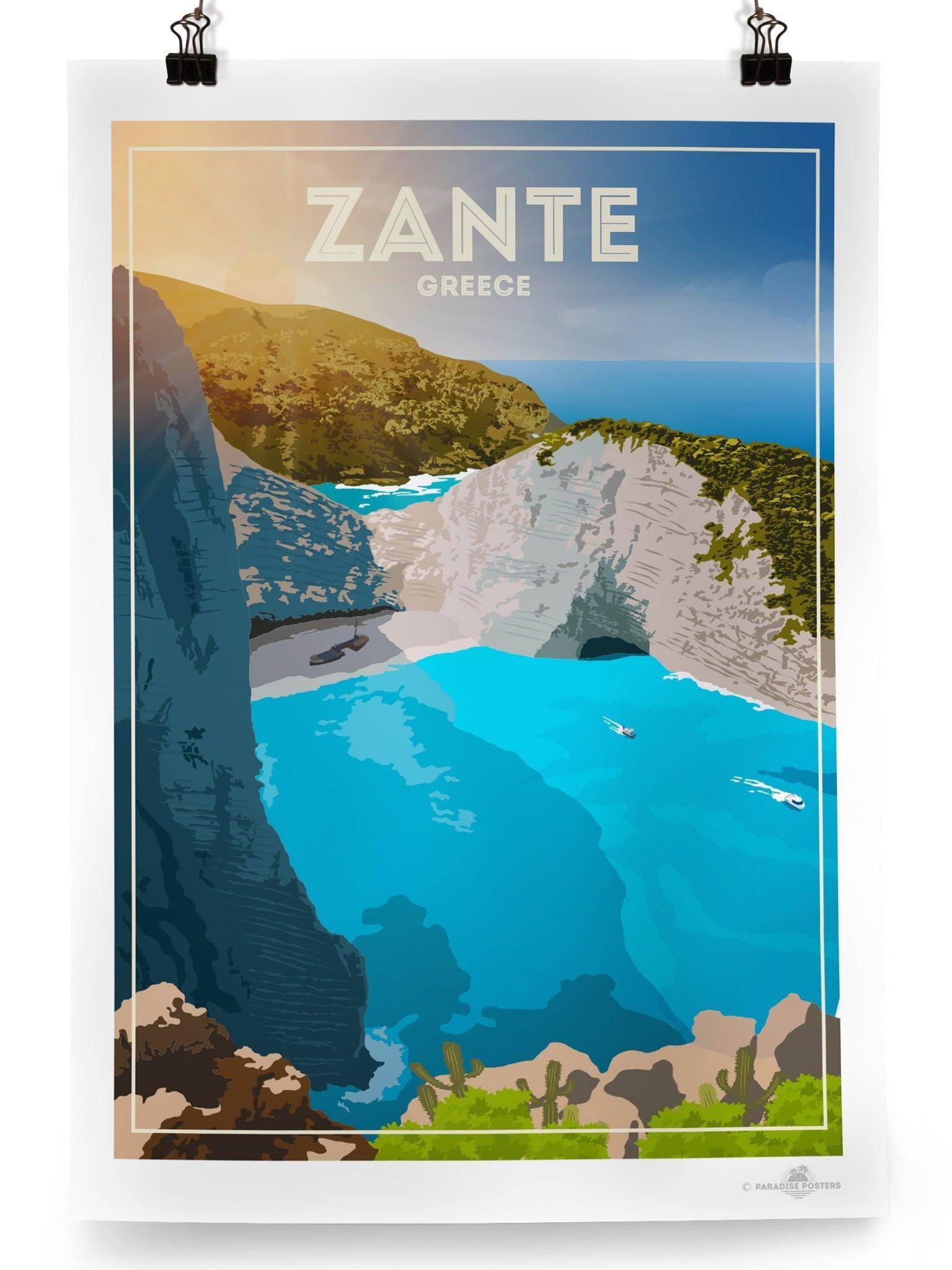 Η παραλία στο σχεδιασμό της αφίσας μας είναι το Navagio Bay, ή το "Shipwreck Beach's" είναι πιο γνωστό χάρη στα υπολείμματα του MV Panagiotis που ξεβράστηκε το 1980 στην παραλία Navagioit one of the most popular. από τις πιο πολυφωτογραφημένες παραλίες της Ελλάδας) παρά το γεγονός ότι είναι προσβάσιμο μόνο με σκάφος. Όσοι θέλουν να απολαύσουν μια πανοραμική θέα στον όρμο κατευθύνονται λίγο έξω από την Αναφωνήτρια και οι φωτογραφίες είναι 100% χωρίς φίλτρα - η θάλασσα είναι πραγματικά μια τόσο όμορφη απόχρωση του τιρκουάζ χάρη στη μεγάλη ποσότητα θειούχων σπηλαίων στην περιοχή.