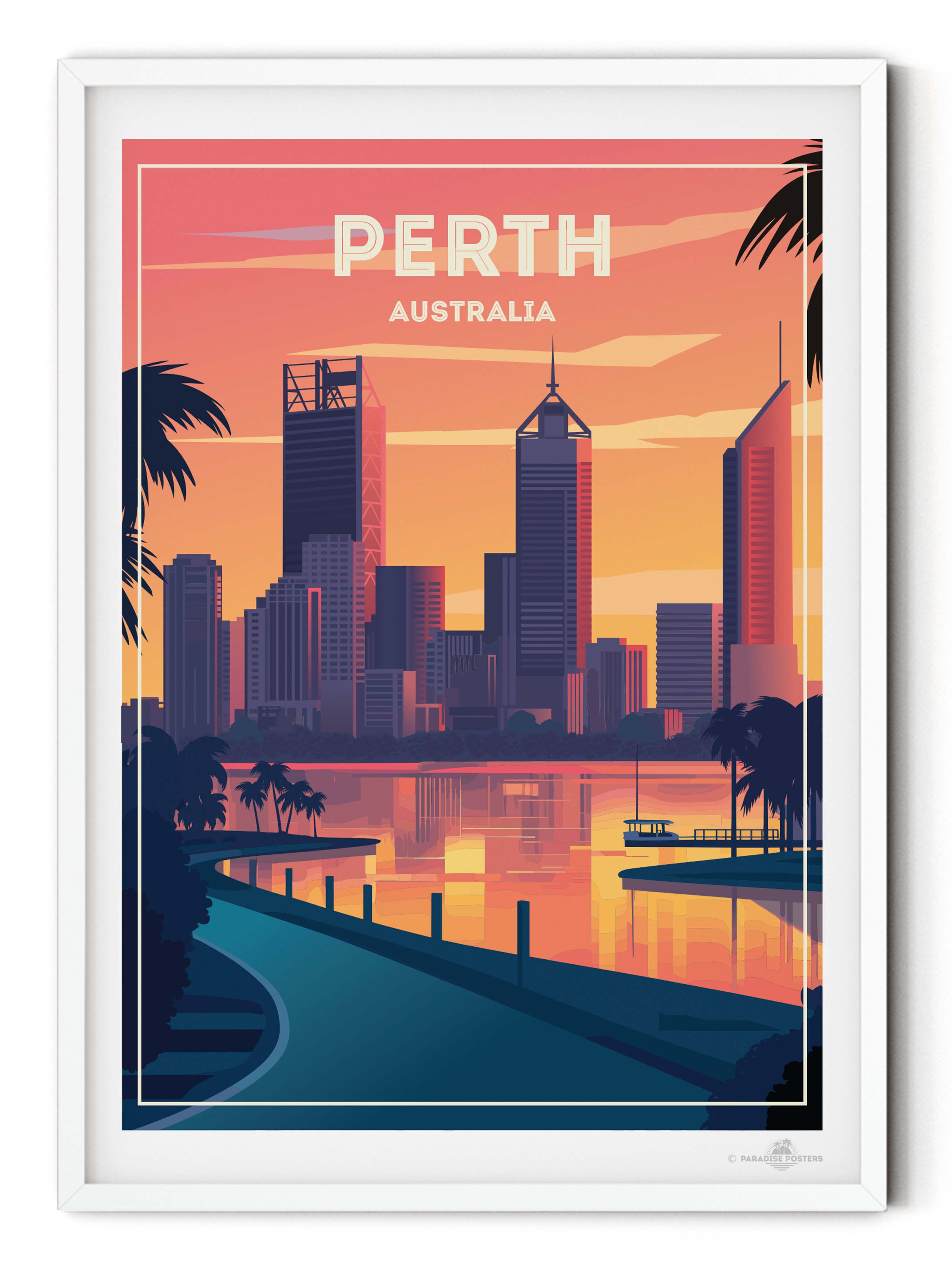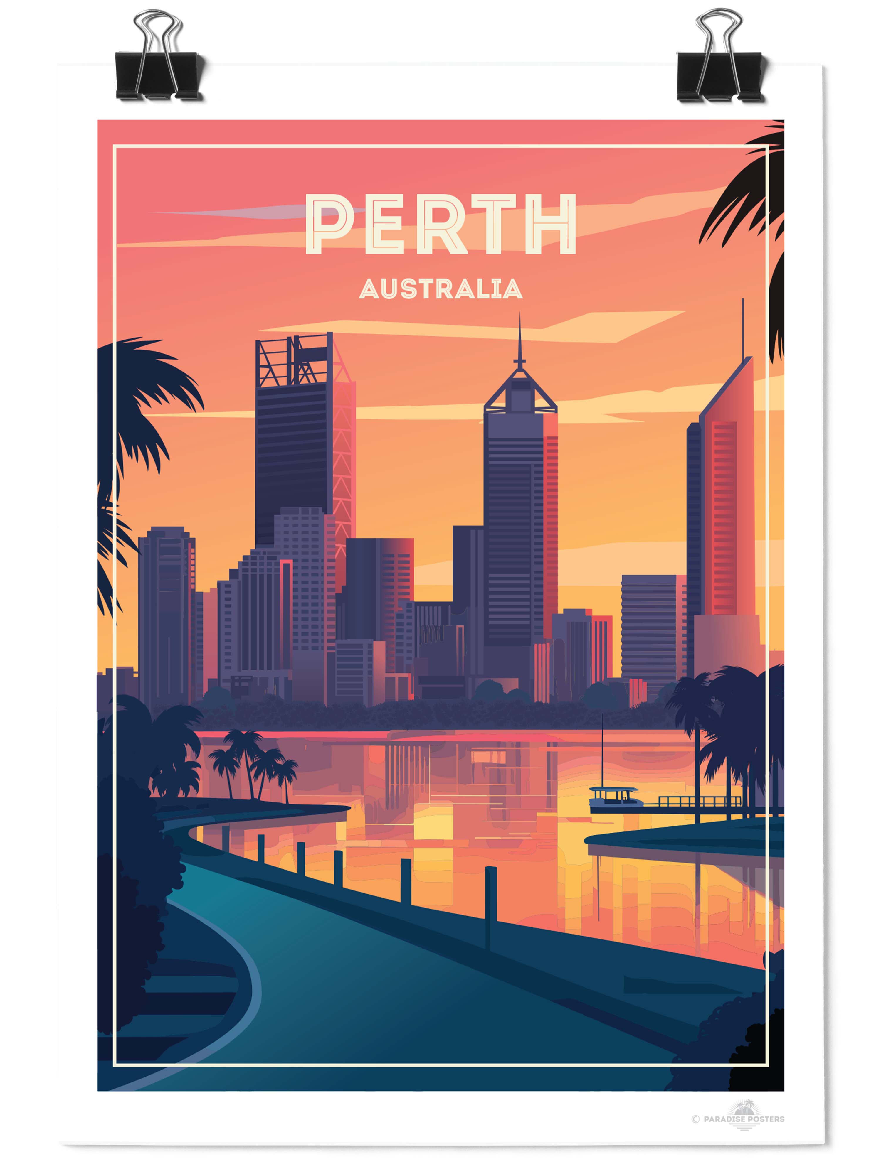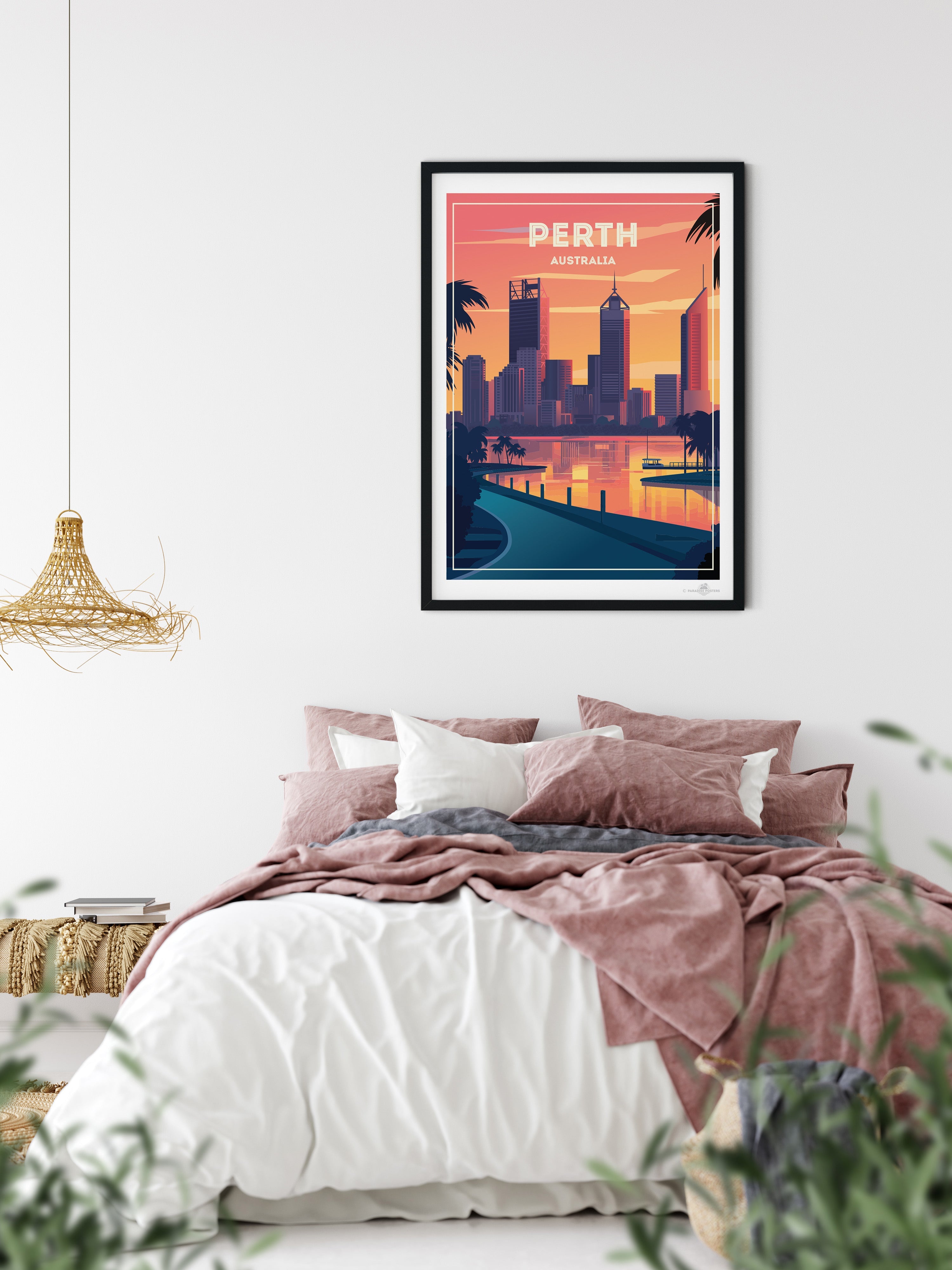 This Travel Poster captures the dazzling colours of one of Perths epic sunsets, with deep reds, yellows and purples.