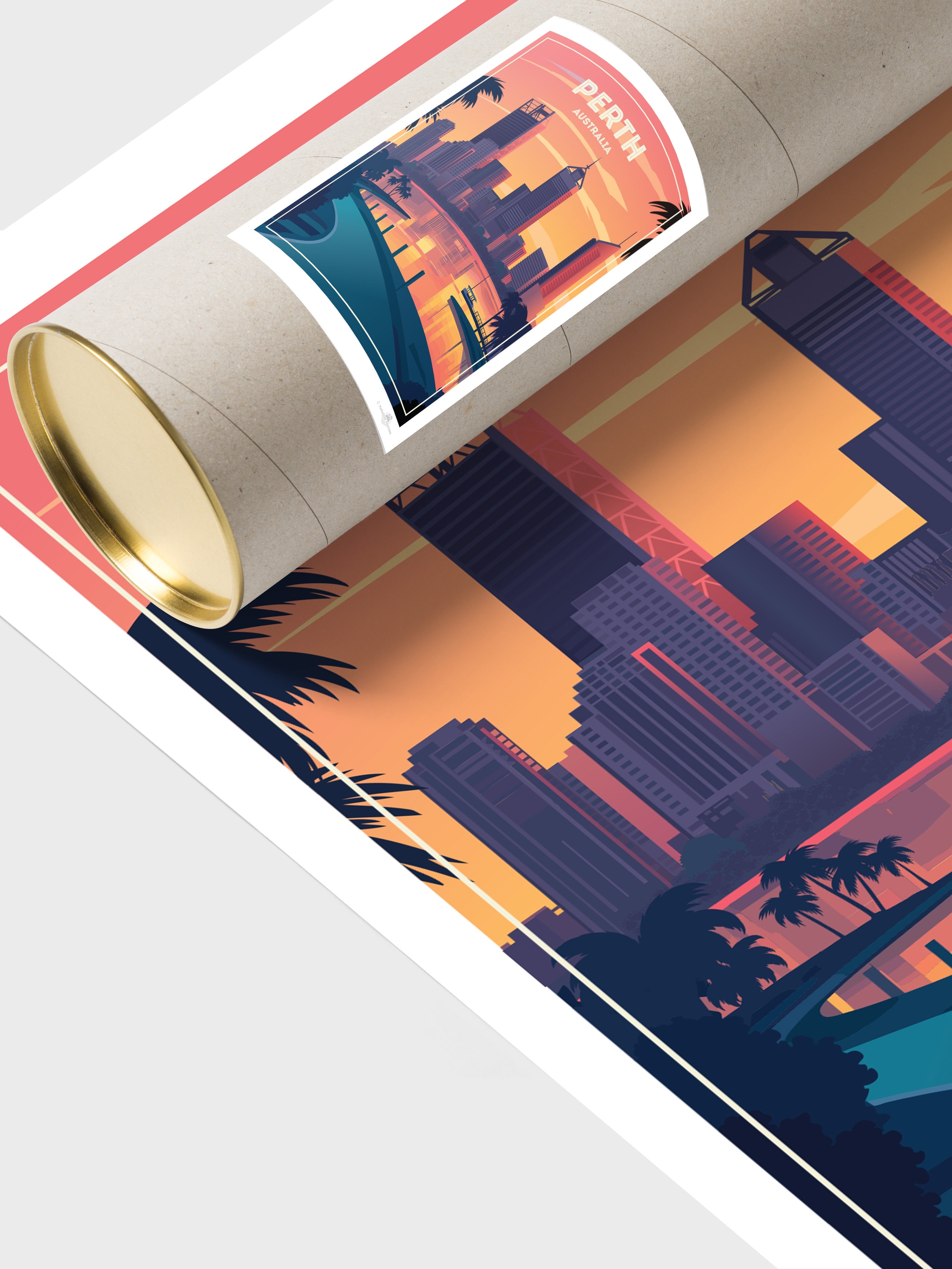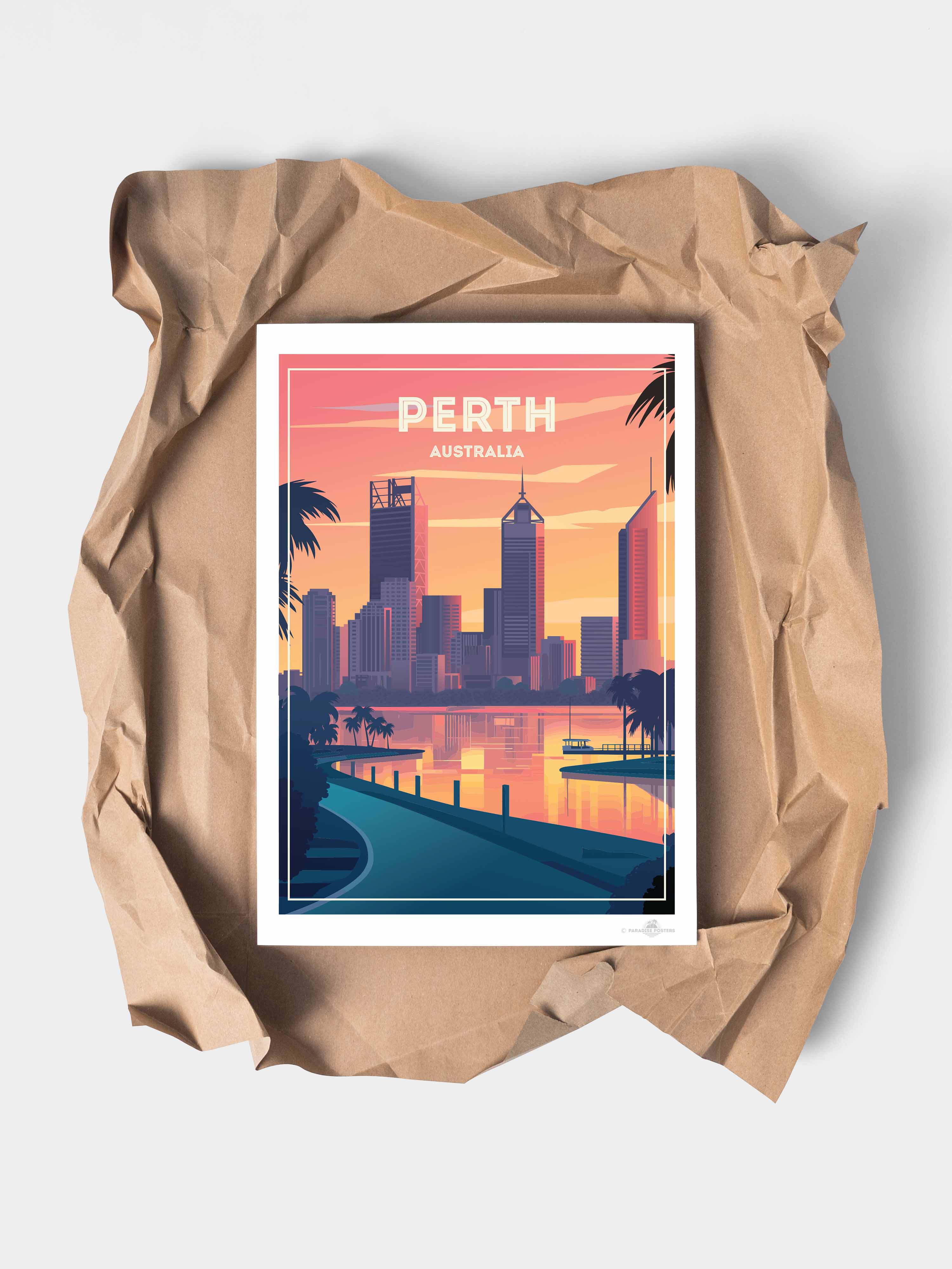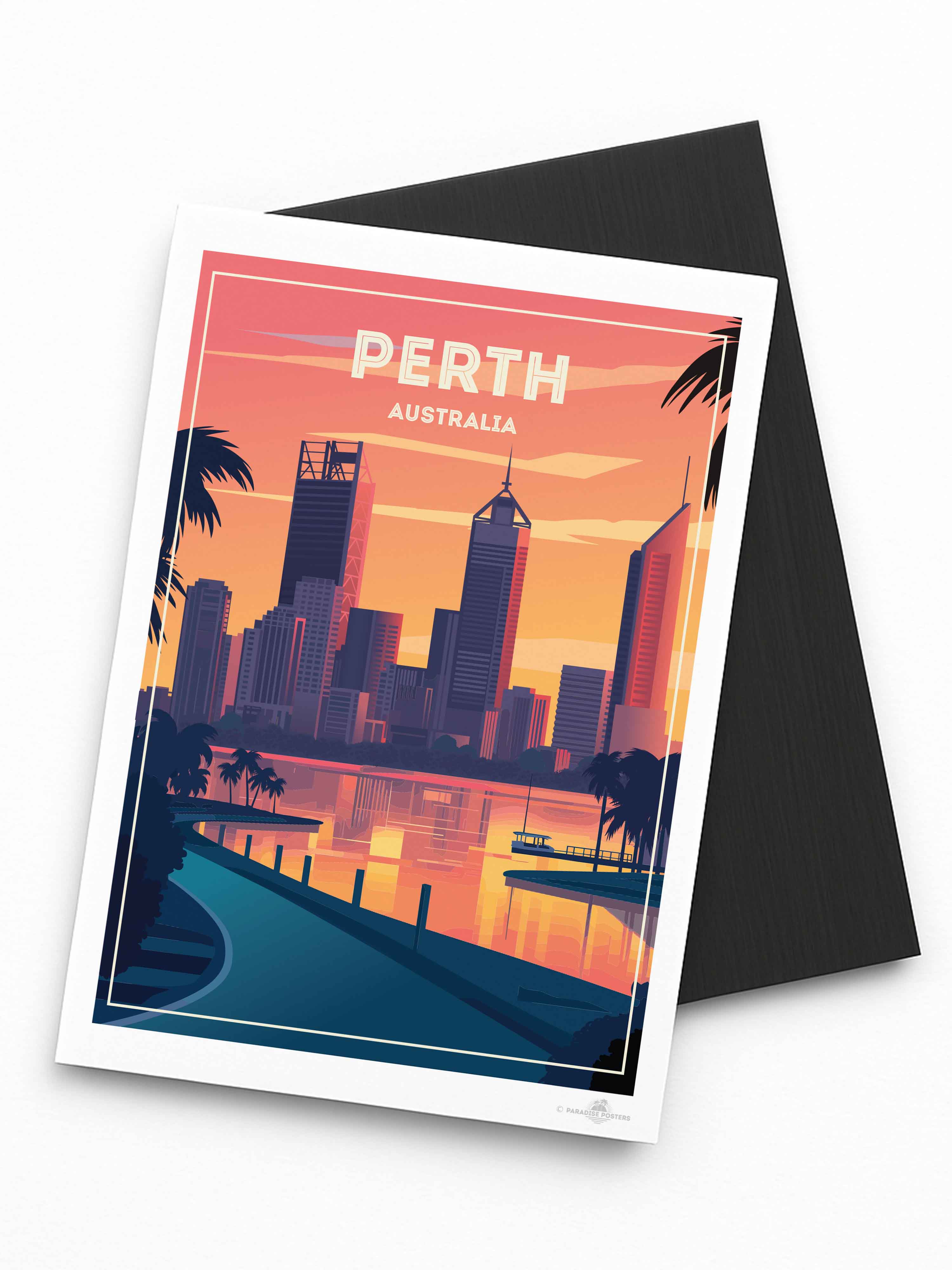 This Travel Poster captures the dazzling colours of one of Perths epic sunsets, with deep reds, yellows and purples.
