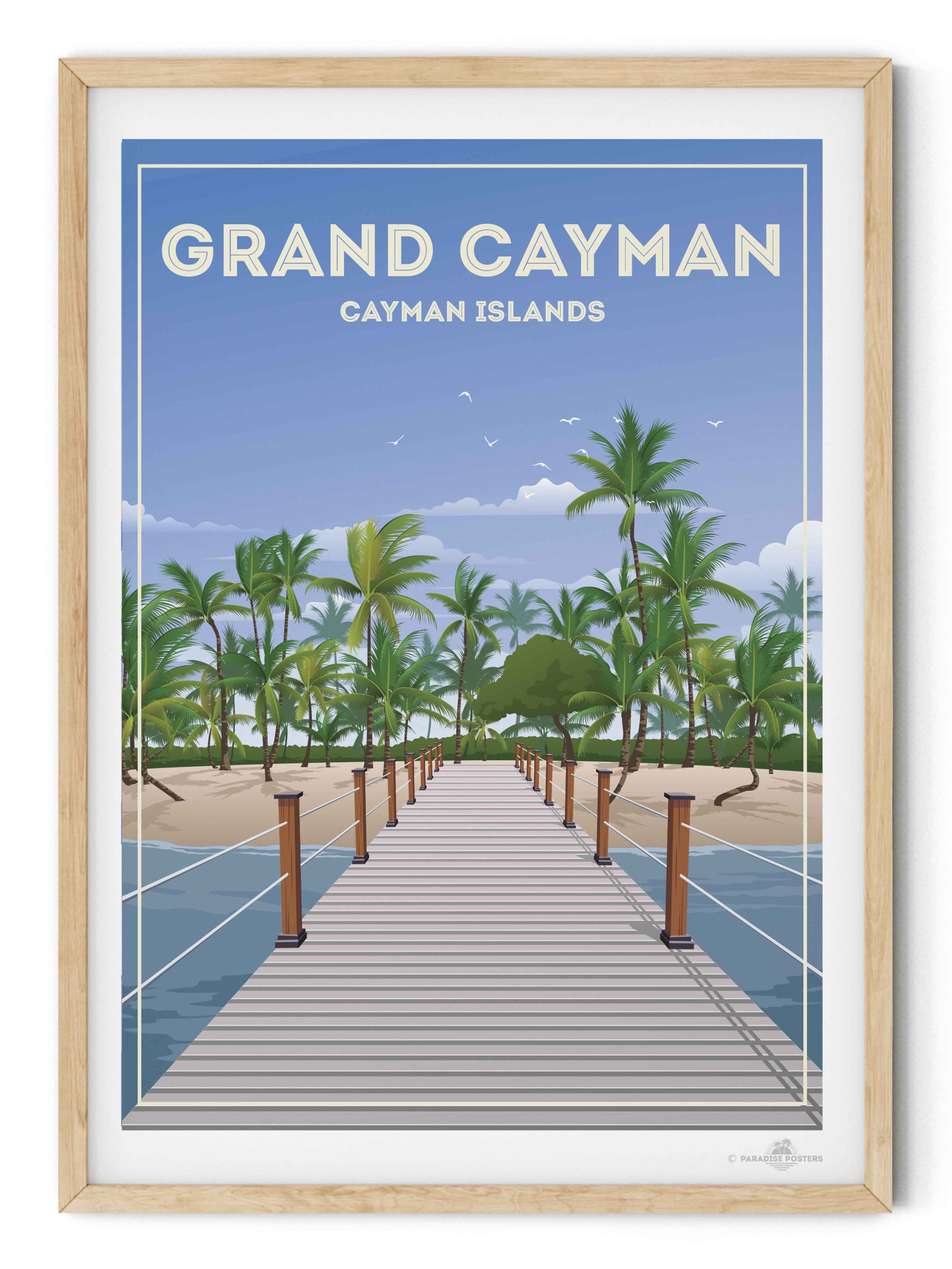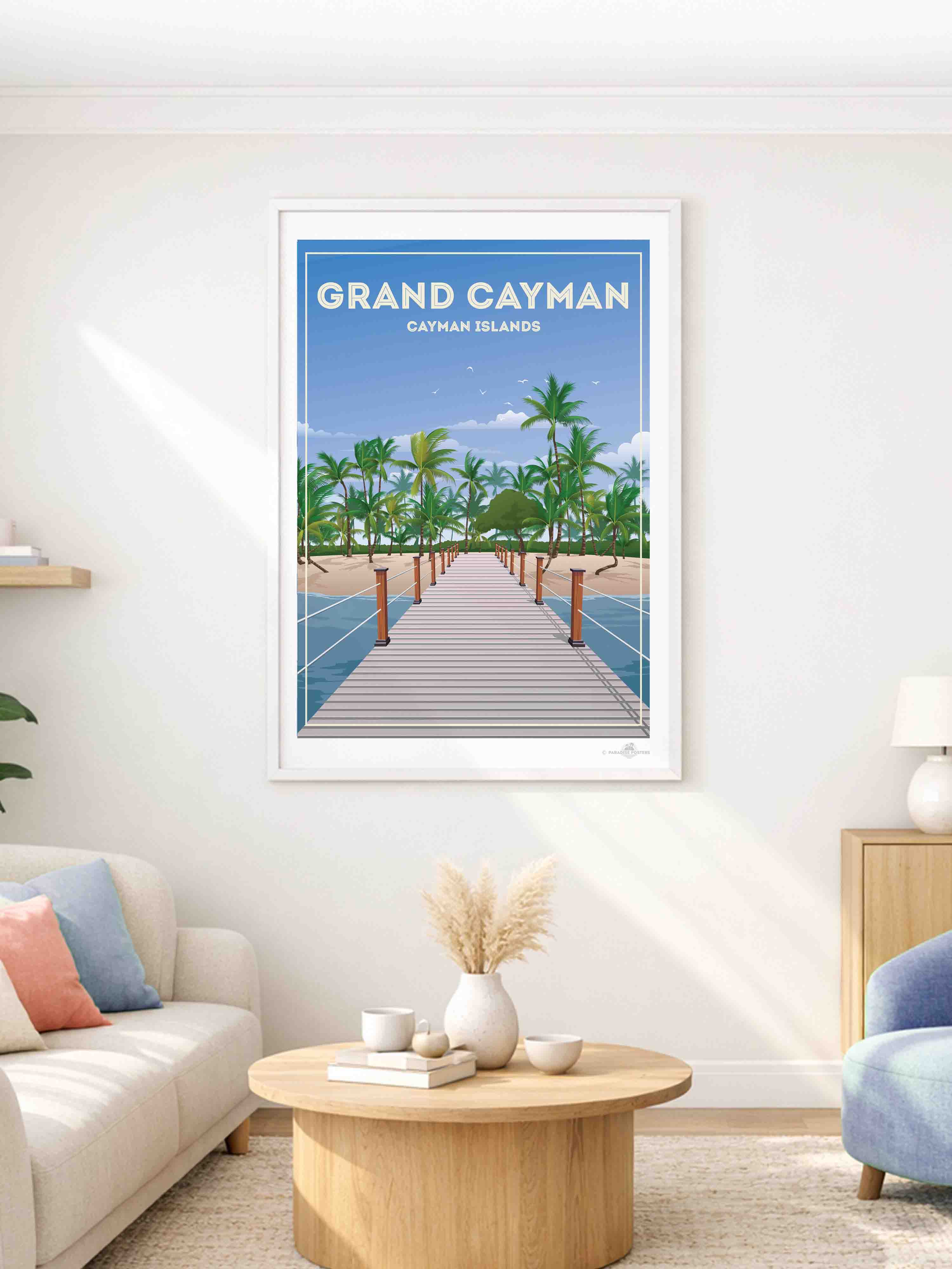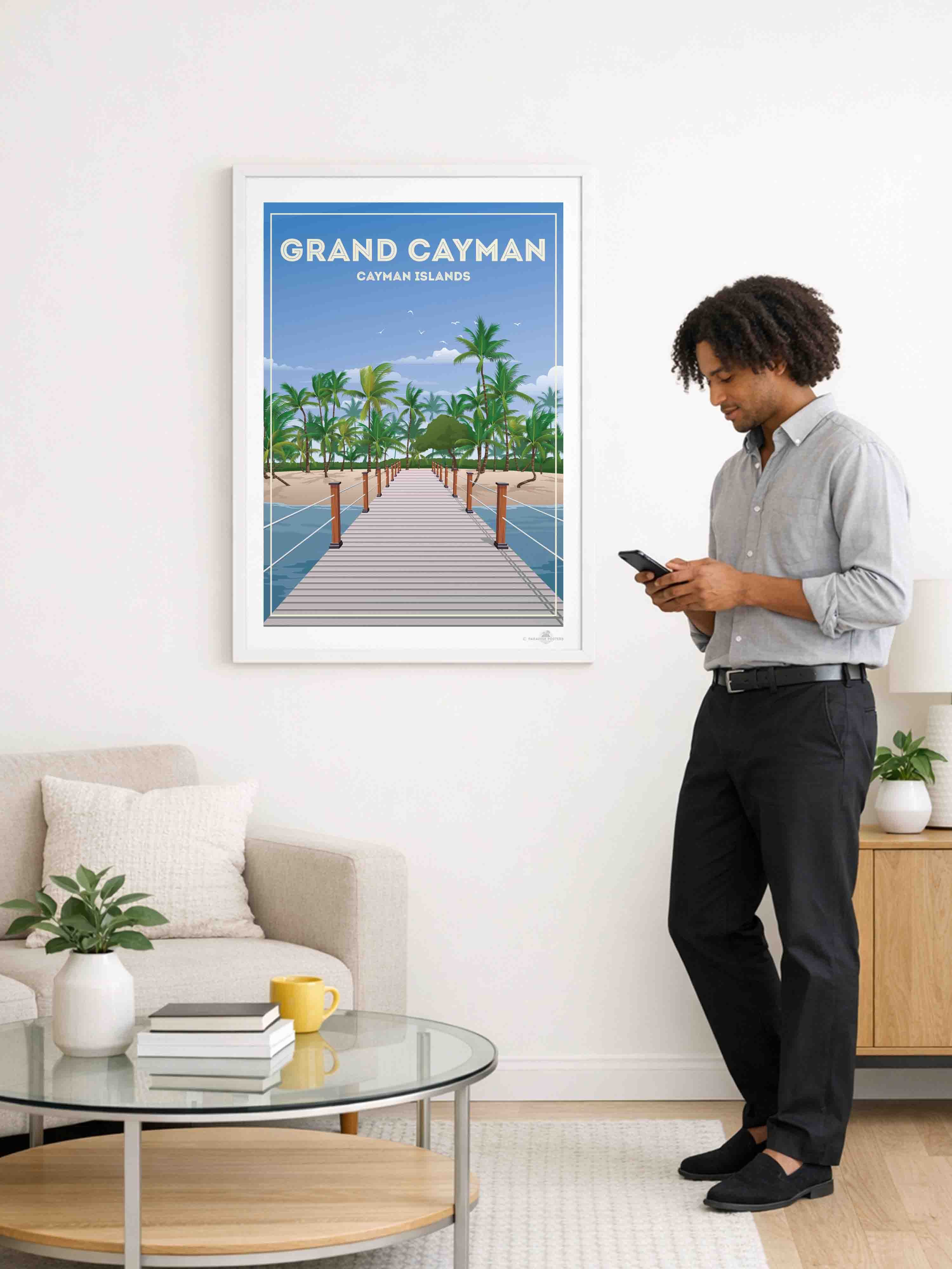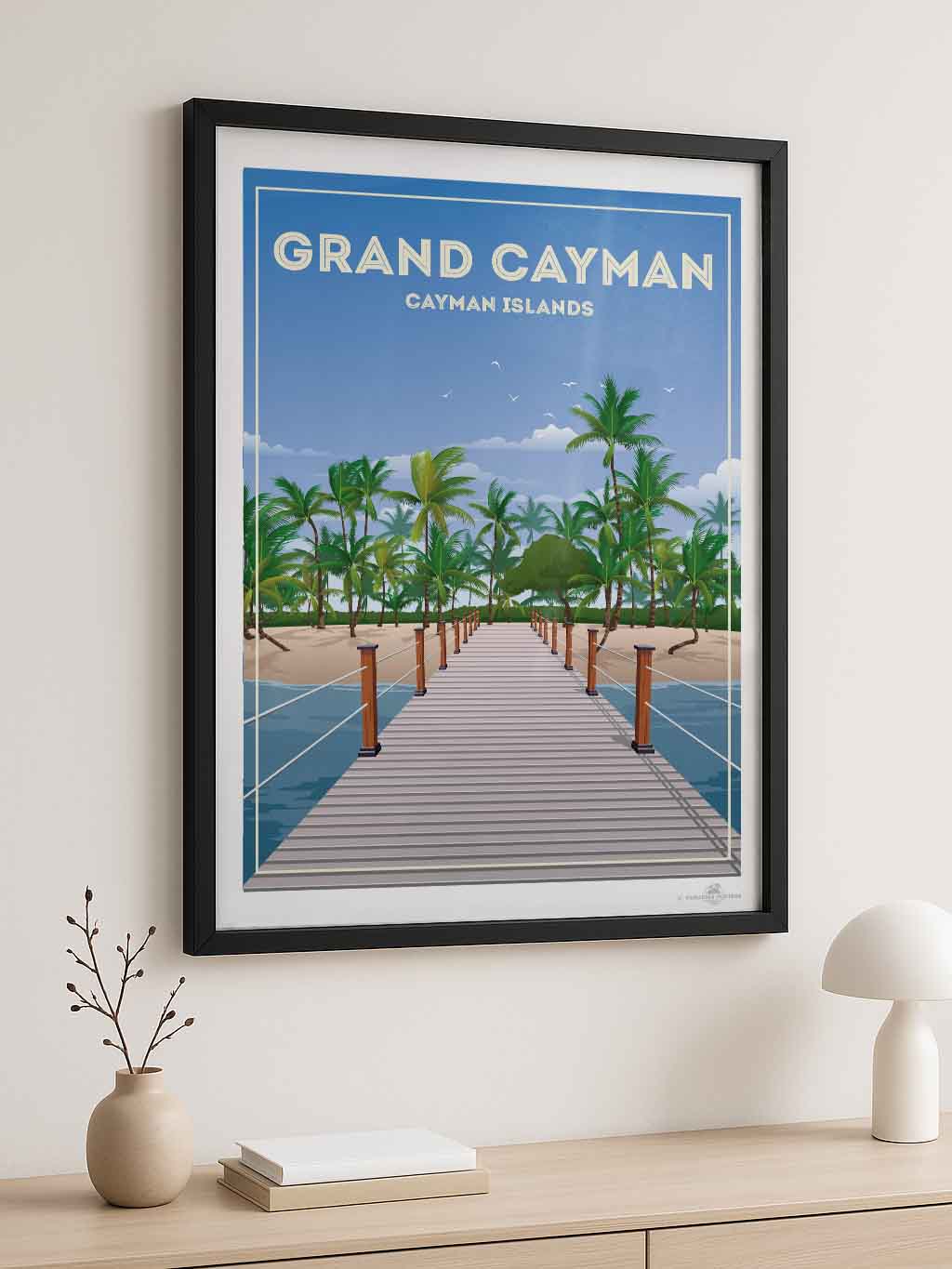 Step into the serene beauty of Grand Cayman with this sleek, minimalist travel poster. Showcasing a wooden pier stretching into calm blue waters, framed by lush green palm trees under a clear sky, it captures the quintessential tropical escape mood. The subtle shadows and gradient blues create a fresh, airy atmosphere perfect for elevating any space.