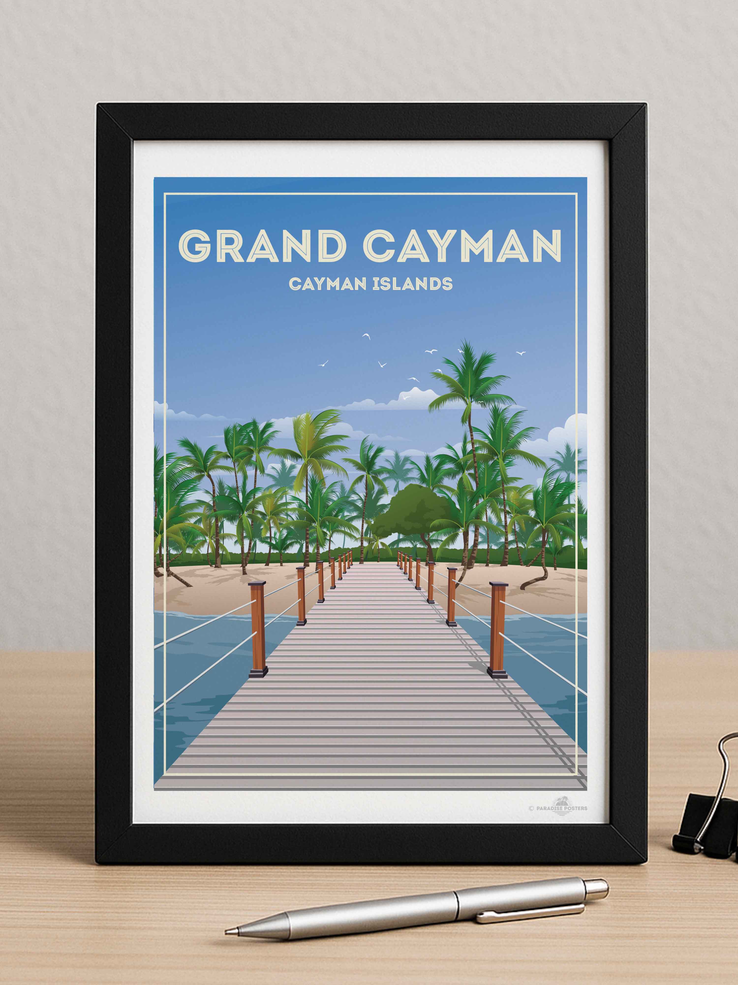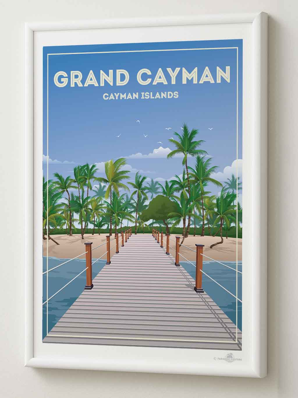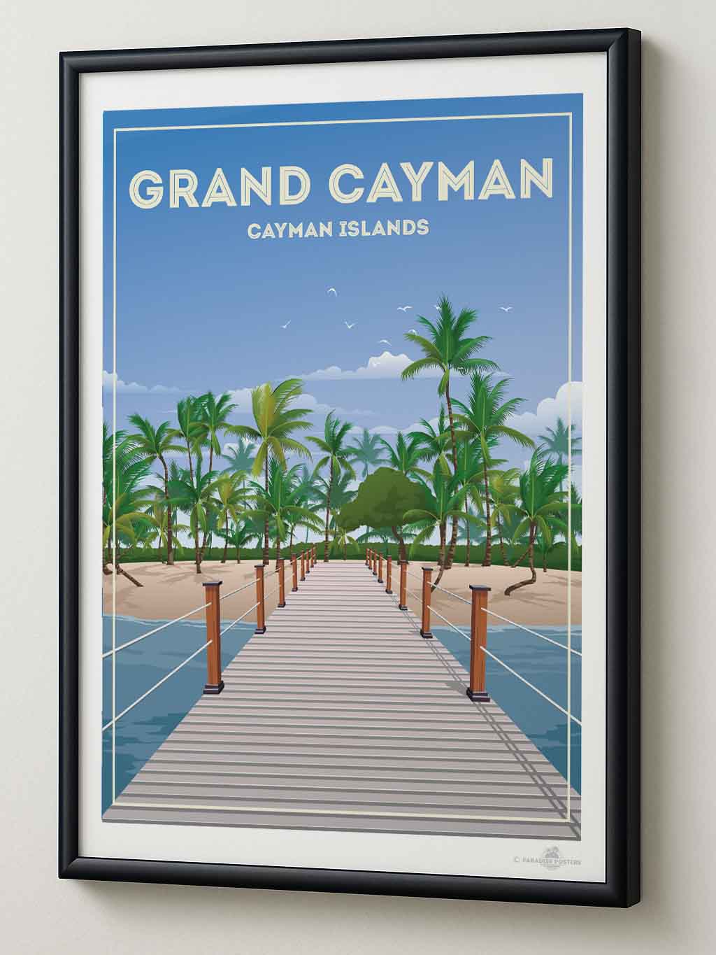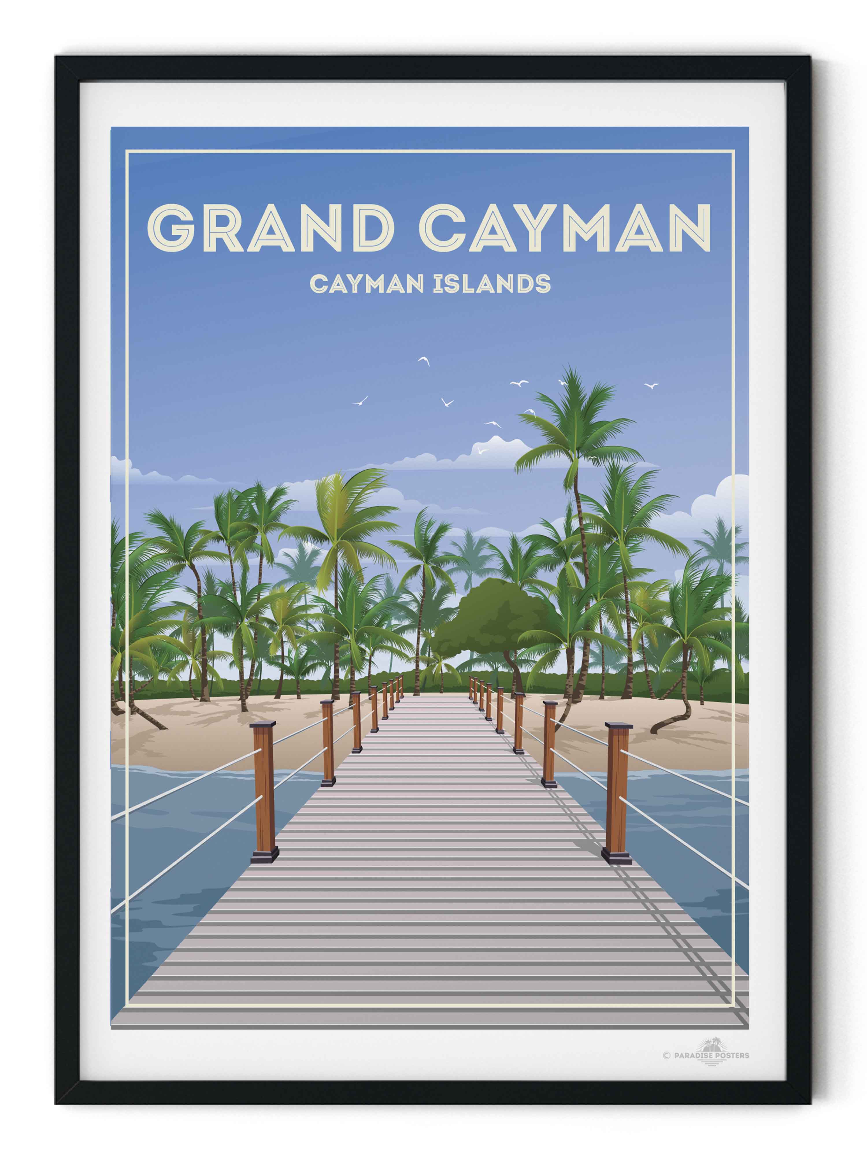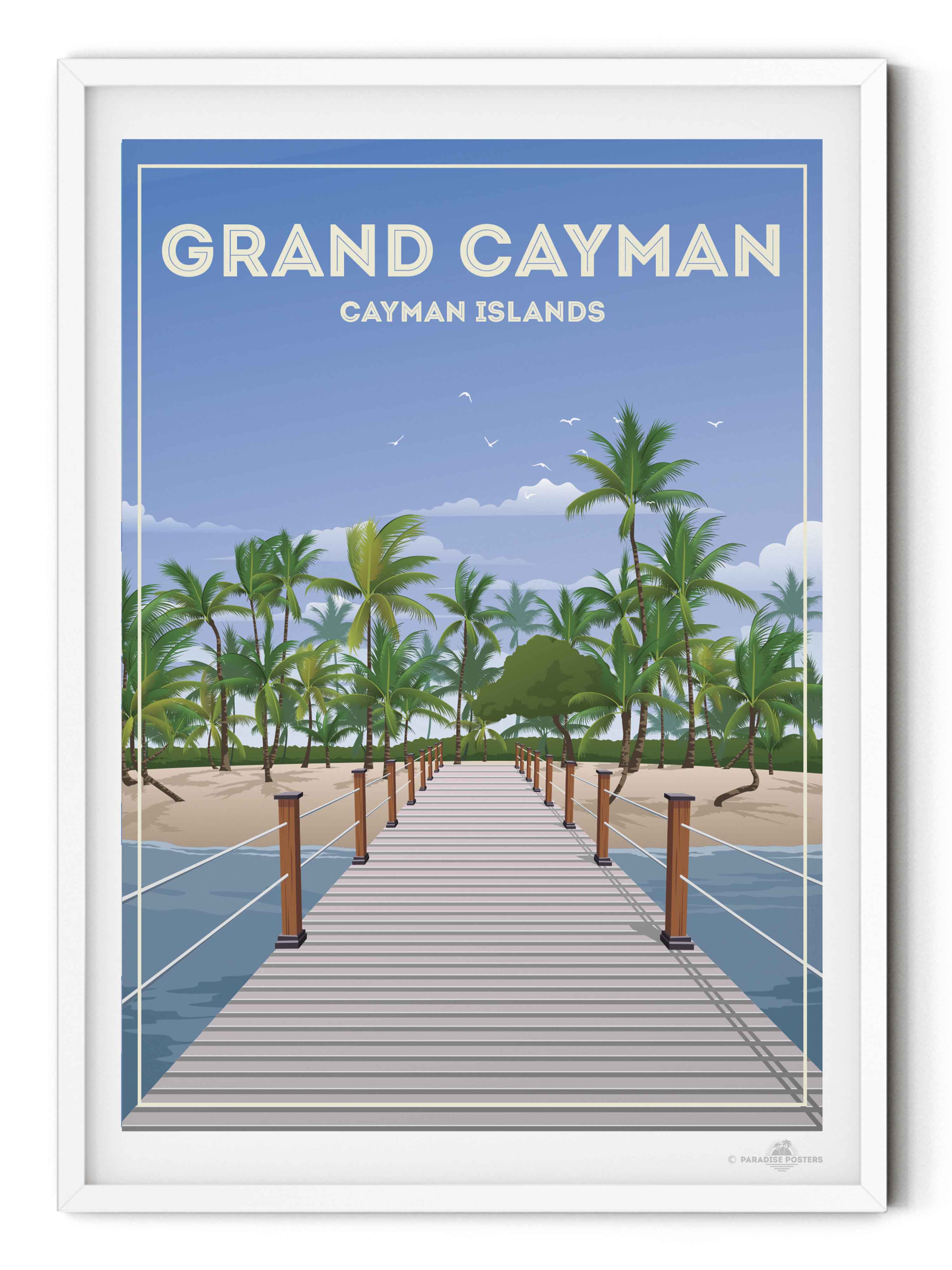 Step into the serene beauty of Grand Cayman with this sleek, minimalist travel poster. Showcasing a wooden pier stretching into calm blue waters, framed by lush green palm trees under a clear sky, it captures the quintessential tropical escape mood. The subtle shadows and gradient blues create a fresh, airy atmosphere perfect for elevating any space.
