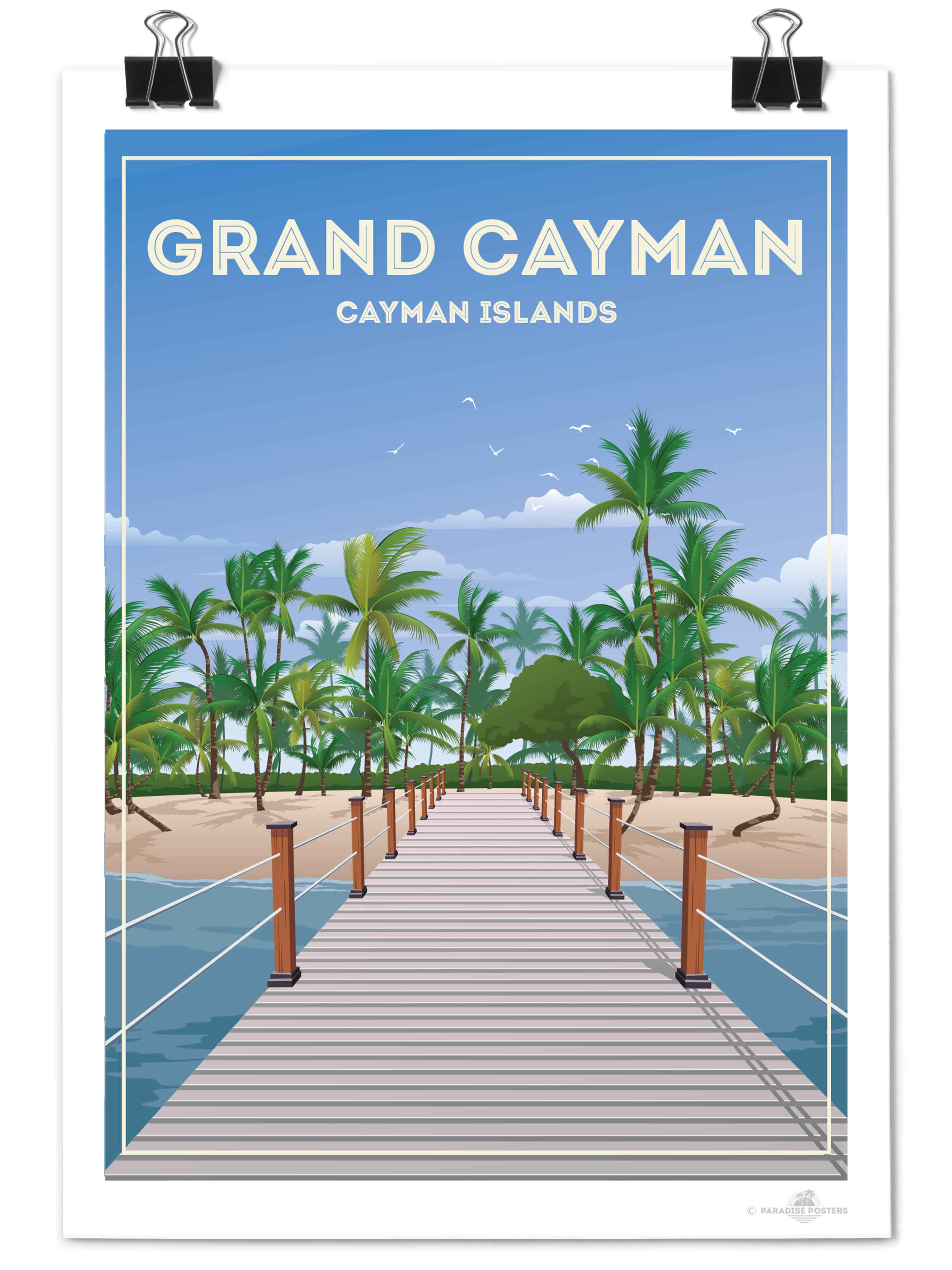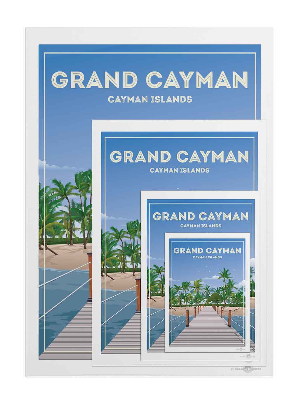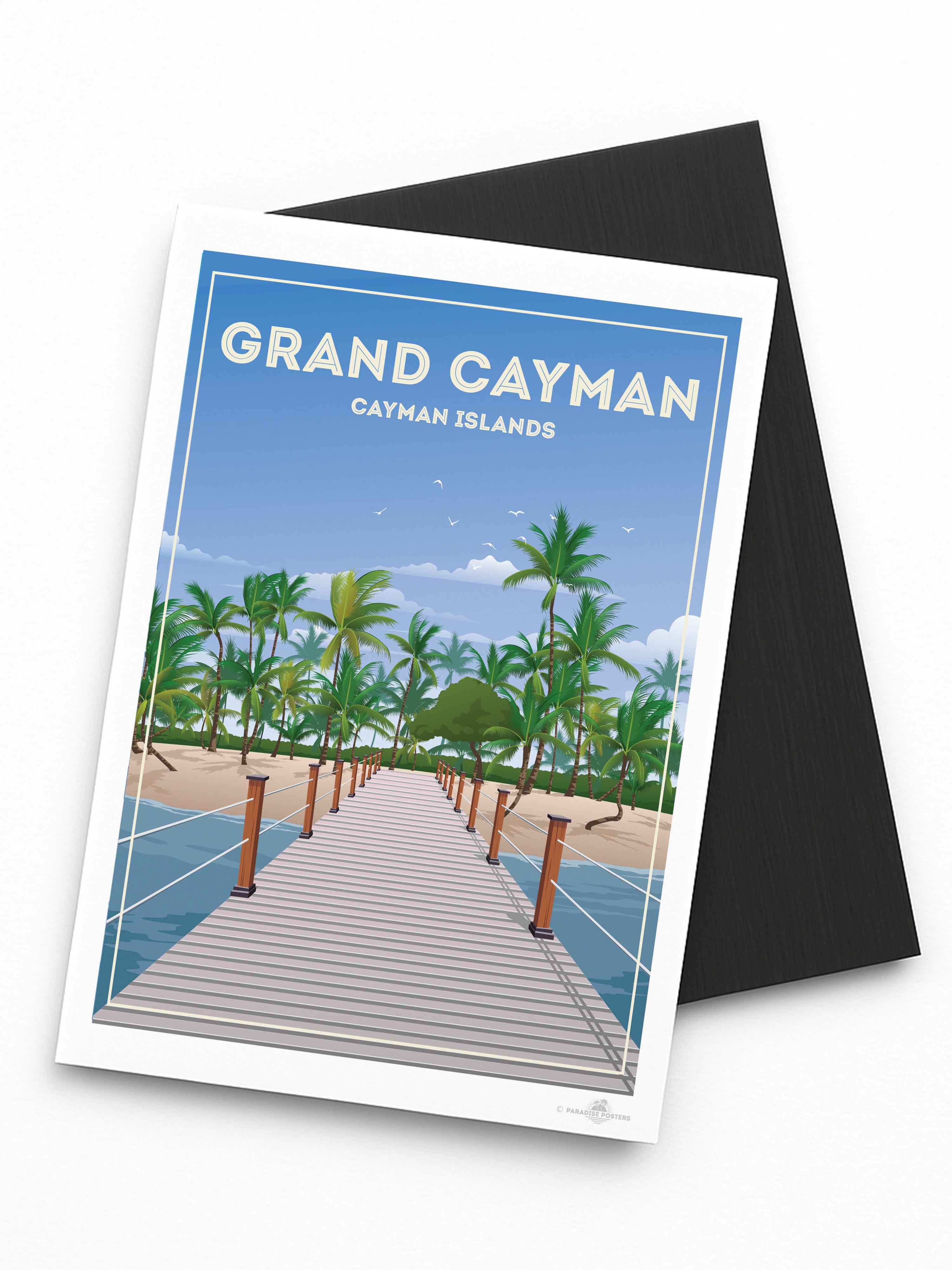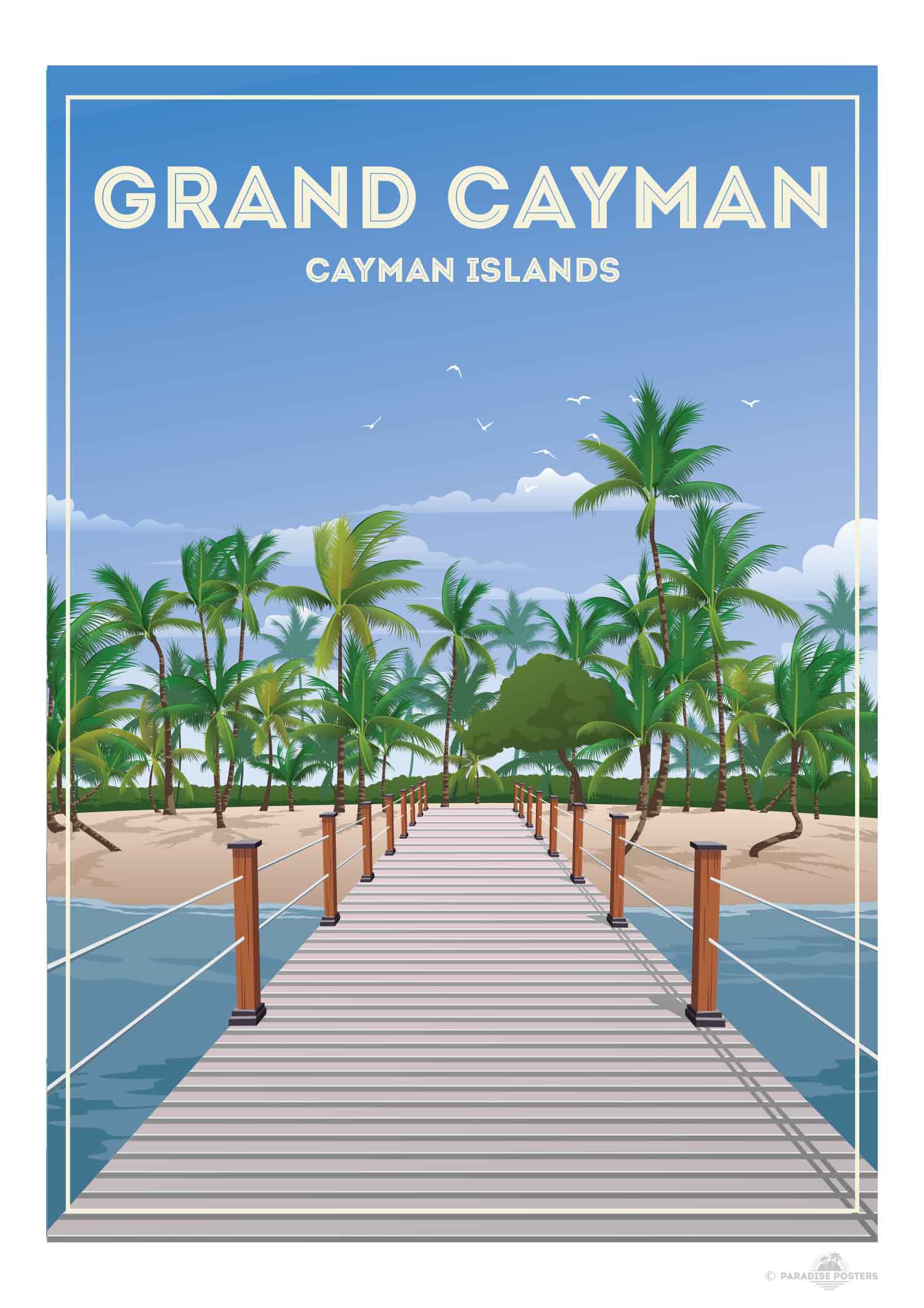 Step into the serene beauty of Grand Cayman with this sleek, minimalist travel poster. Showcasing a wooden pier stretching into calm blue waters, framed by lush green palm trees under a clear sky, it captures the quintessential tropical escape mood. The subtle shadows and gradient blues create a fresh, airy atmosphere perfect for elevating any space.