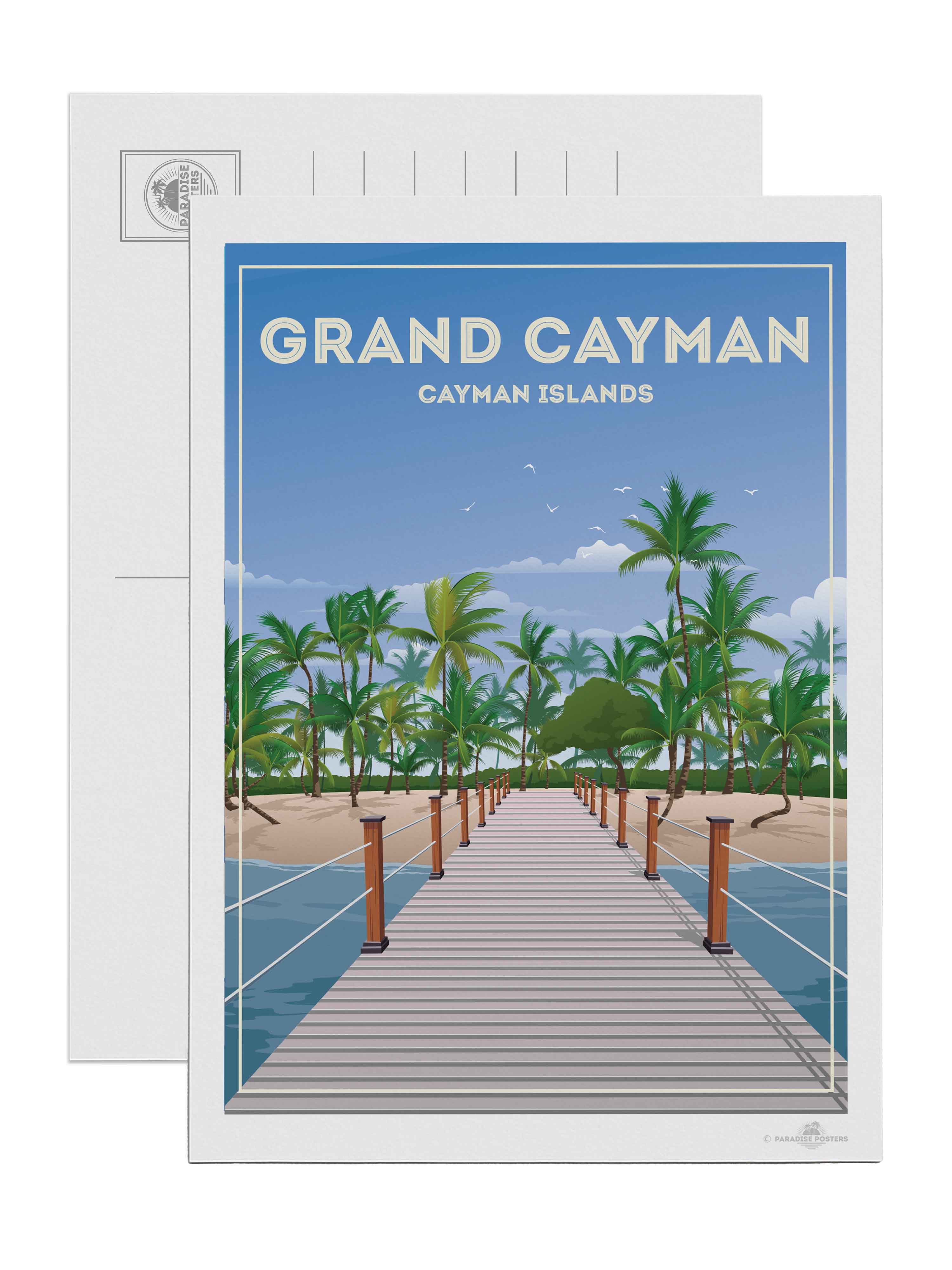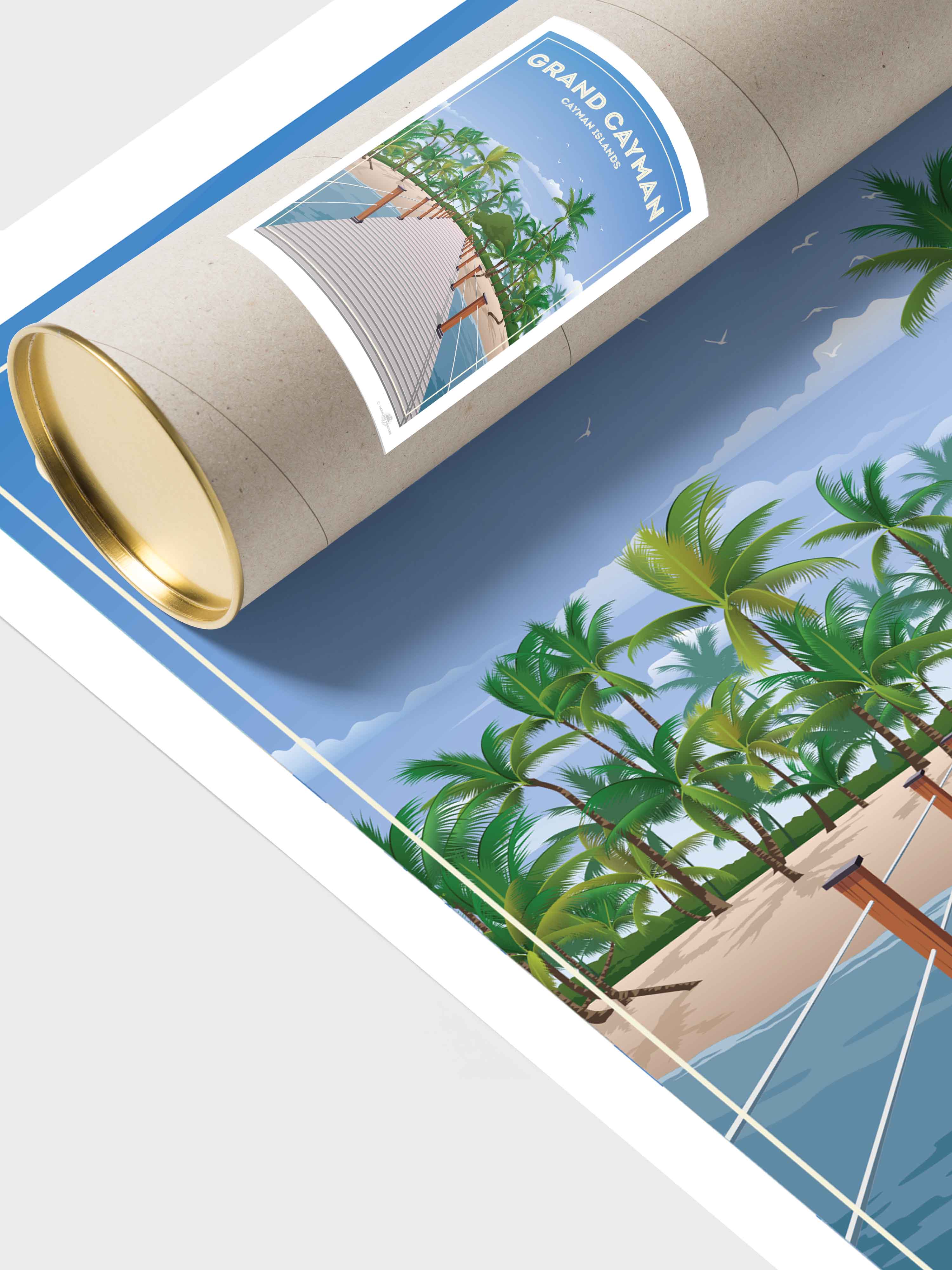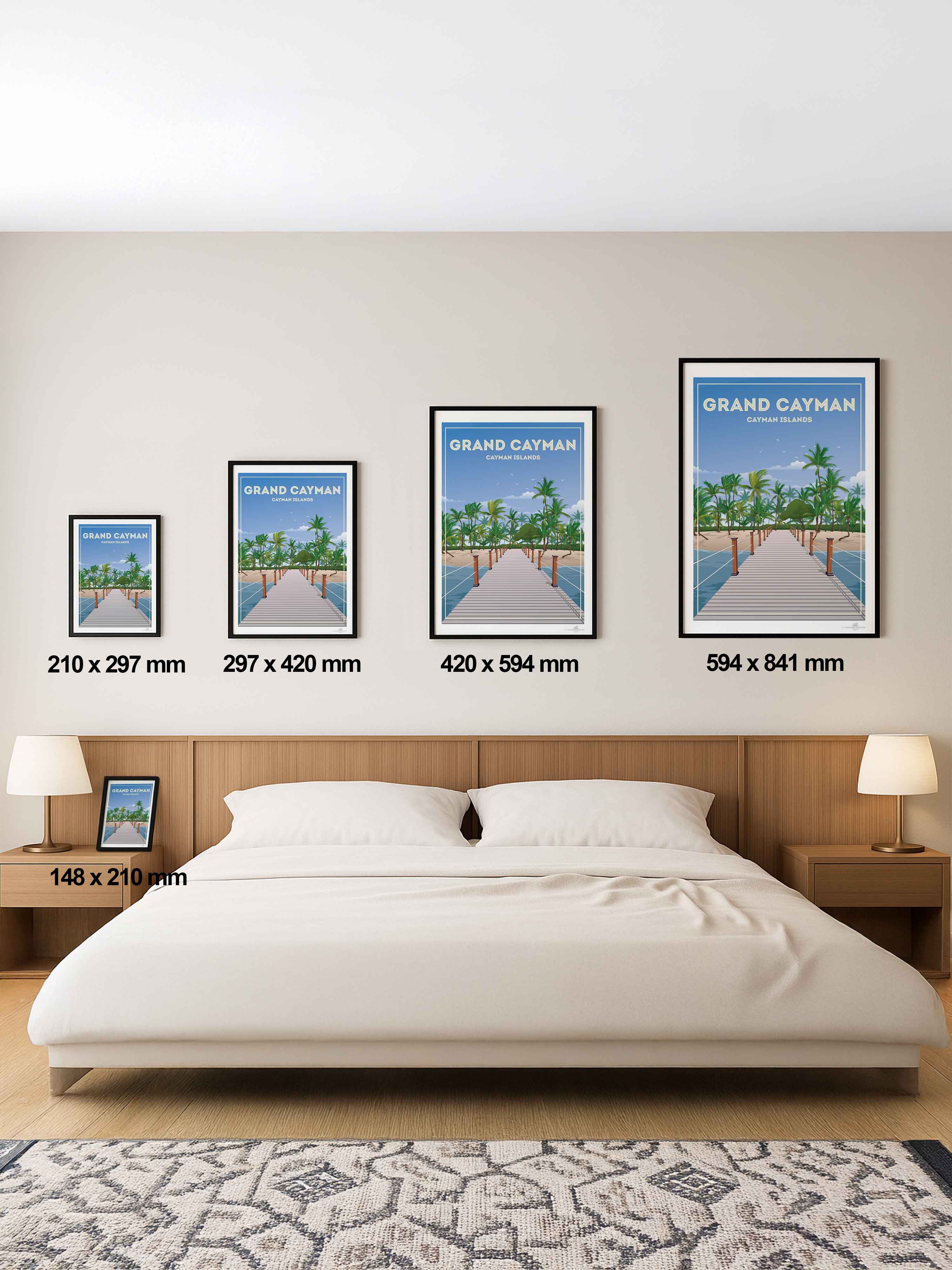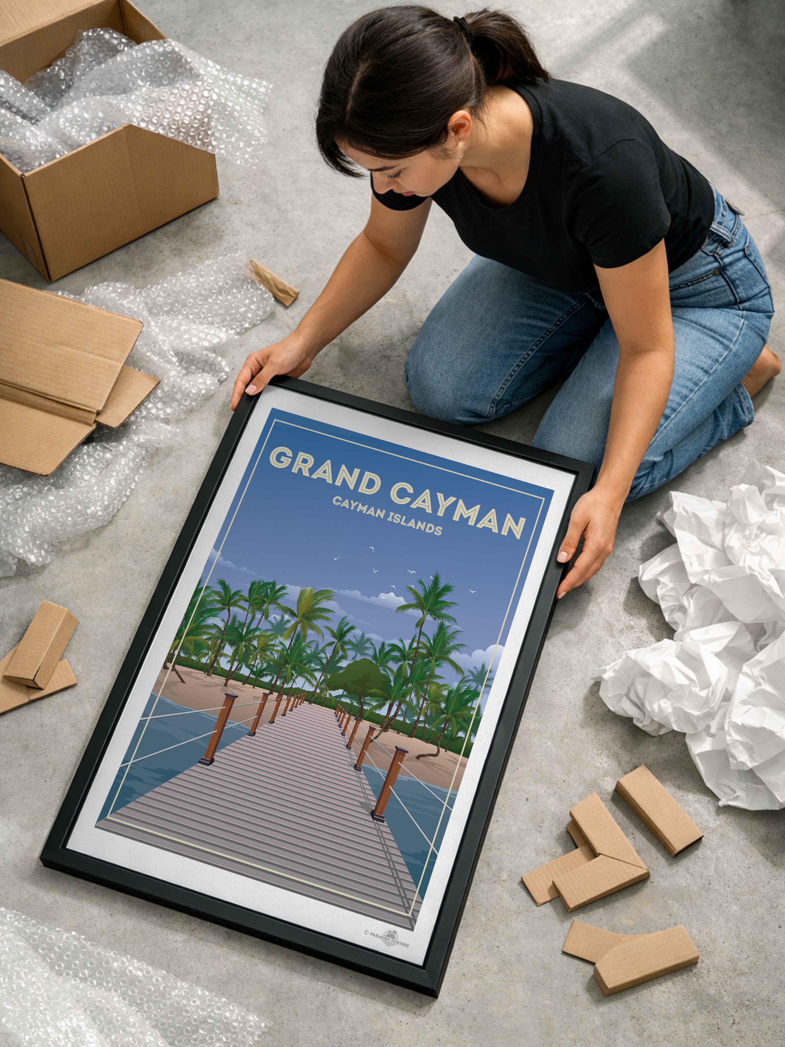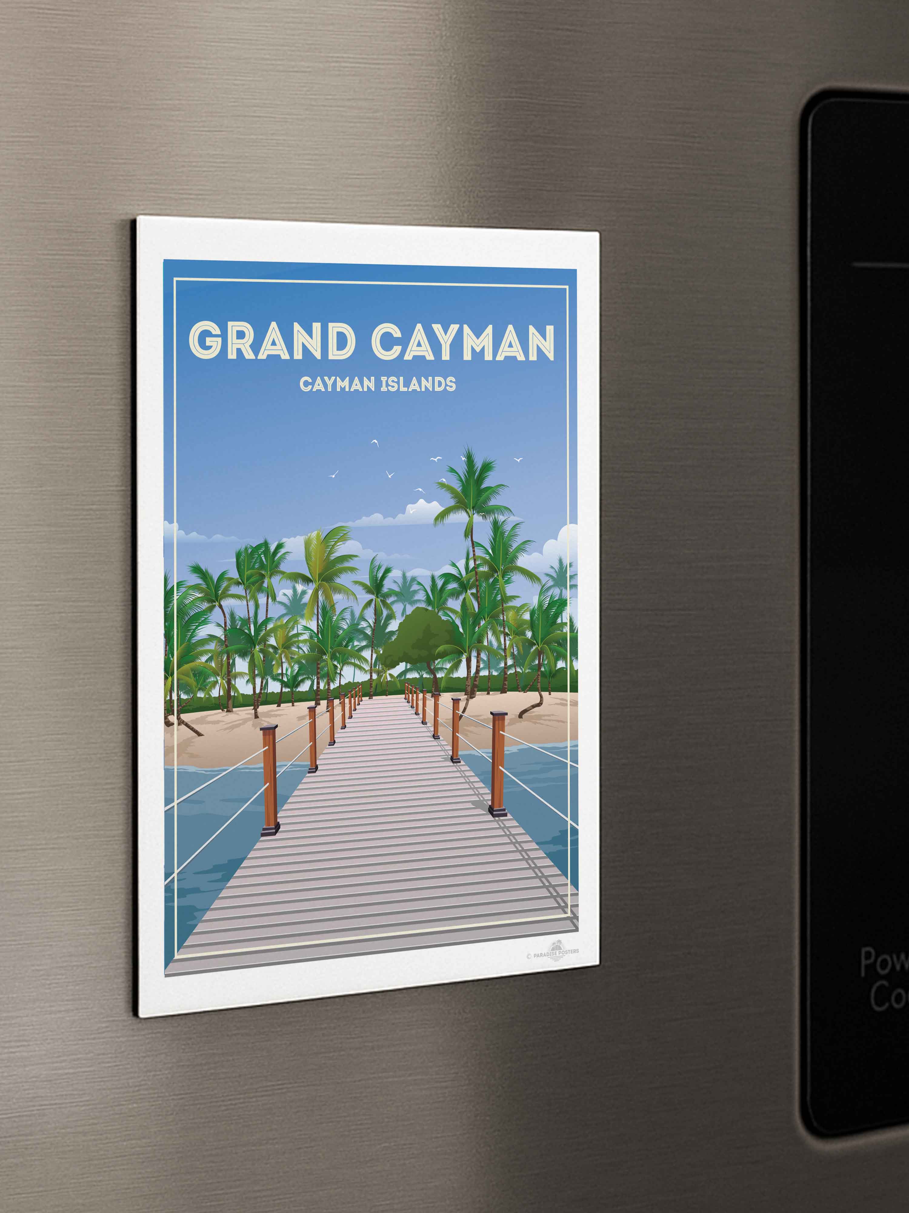 Step into the serene beauty of Grand Cayman with this sleek, minimalist travel poster. Showcasing a wooden pier stretching into calm blue waters, framed by lush green palm trees under a clear sky, it captures the quintessential tropical escape mood. The subtle shadows and gradient blues create a fresh, airy atmosphere perfect for elevating any space.