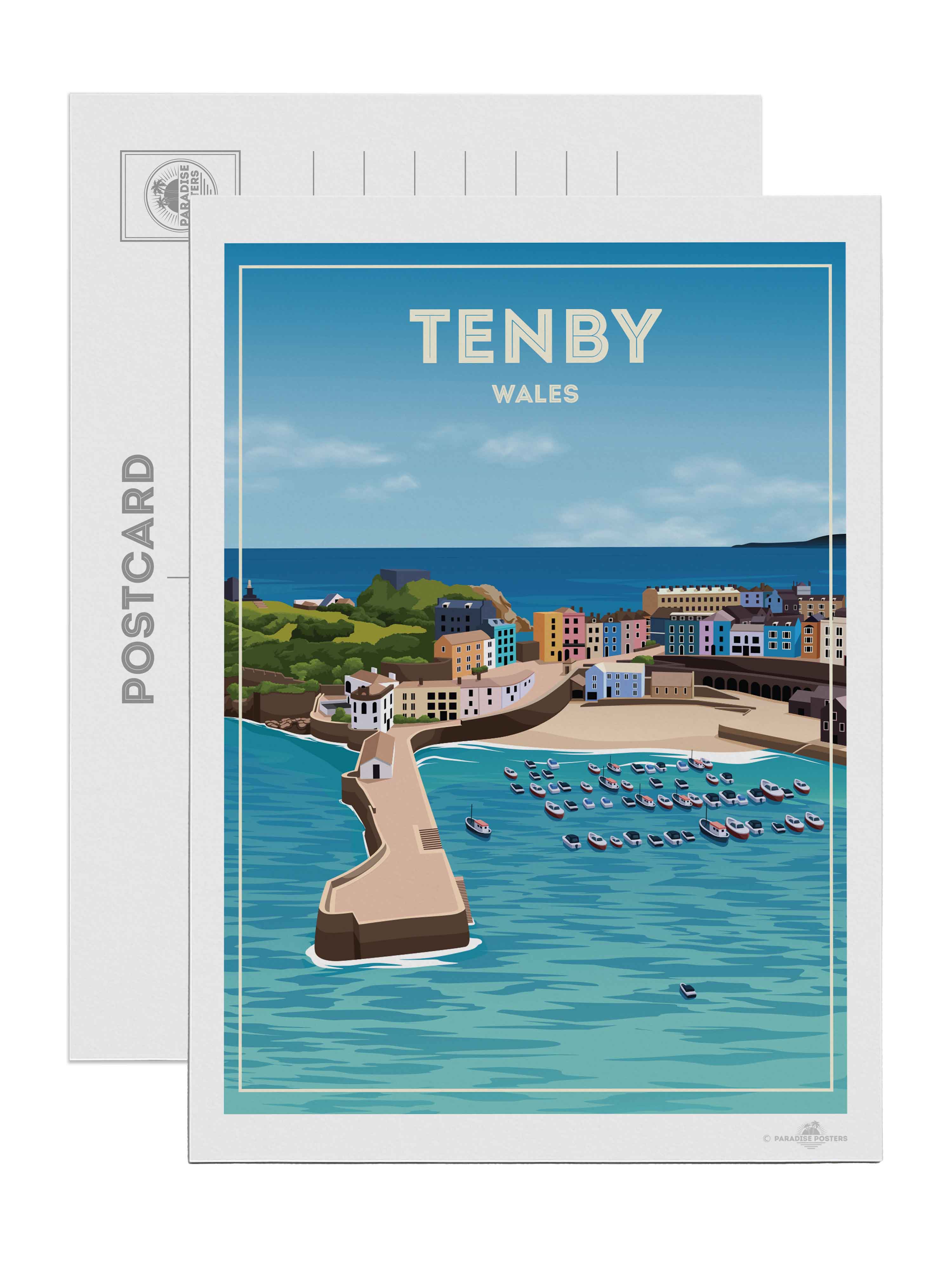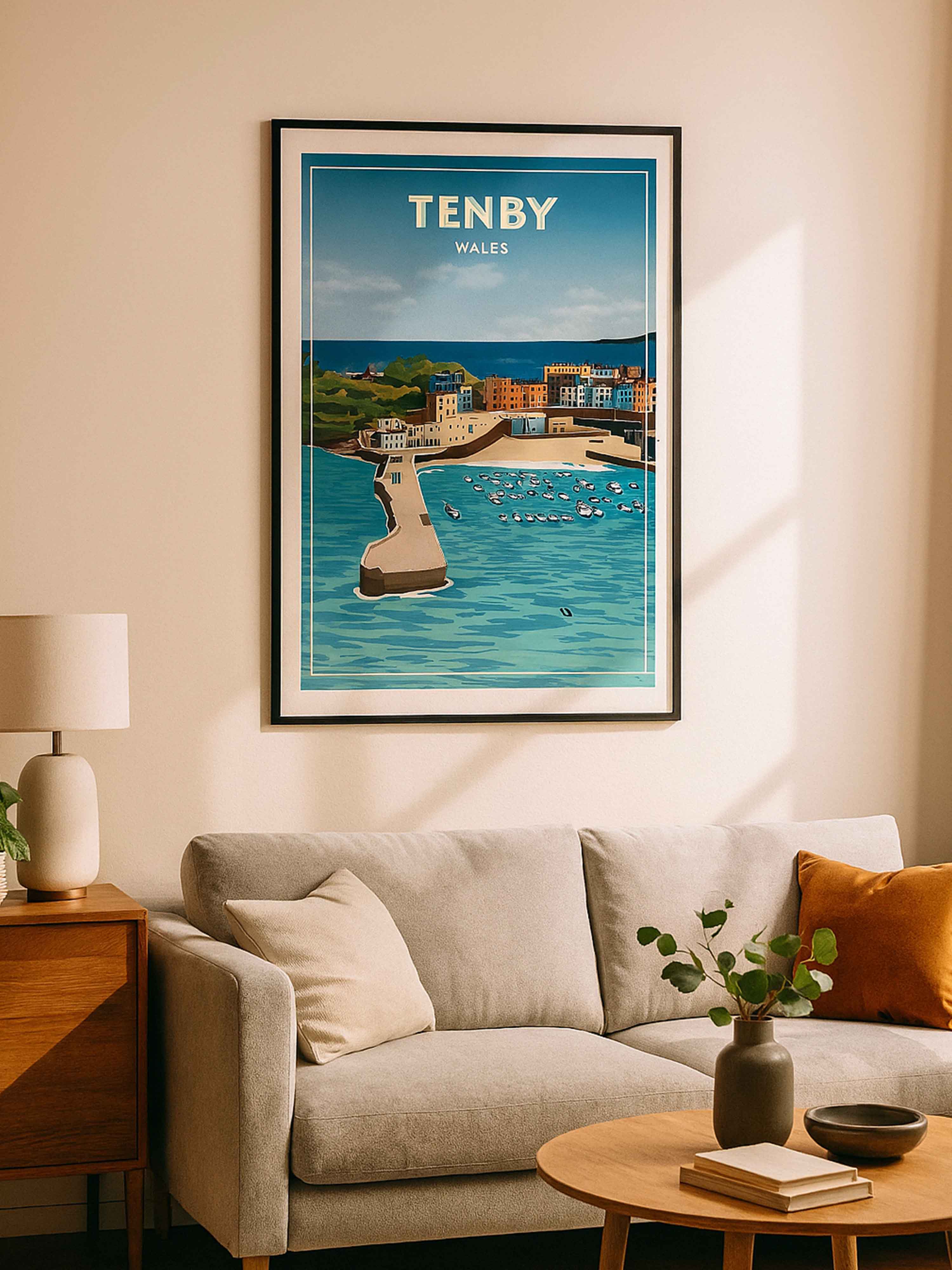 Capture the coastal charm of one of Wales’ most picturesque seaside towns with this vibrant Tenby travel poster from the UK collection. This beautifully illustrated print showcases the iconic Tenby Harbour, complete with its curved stone pier, colourful boats bobbing in the turquoise waters, and the famous row of pastel-hued buildings lining the waterfront.