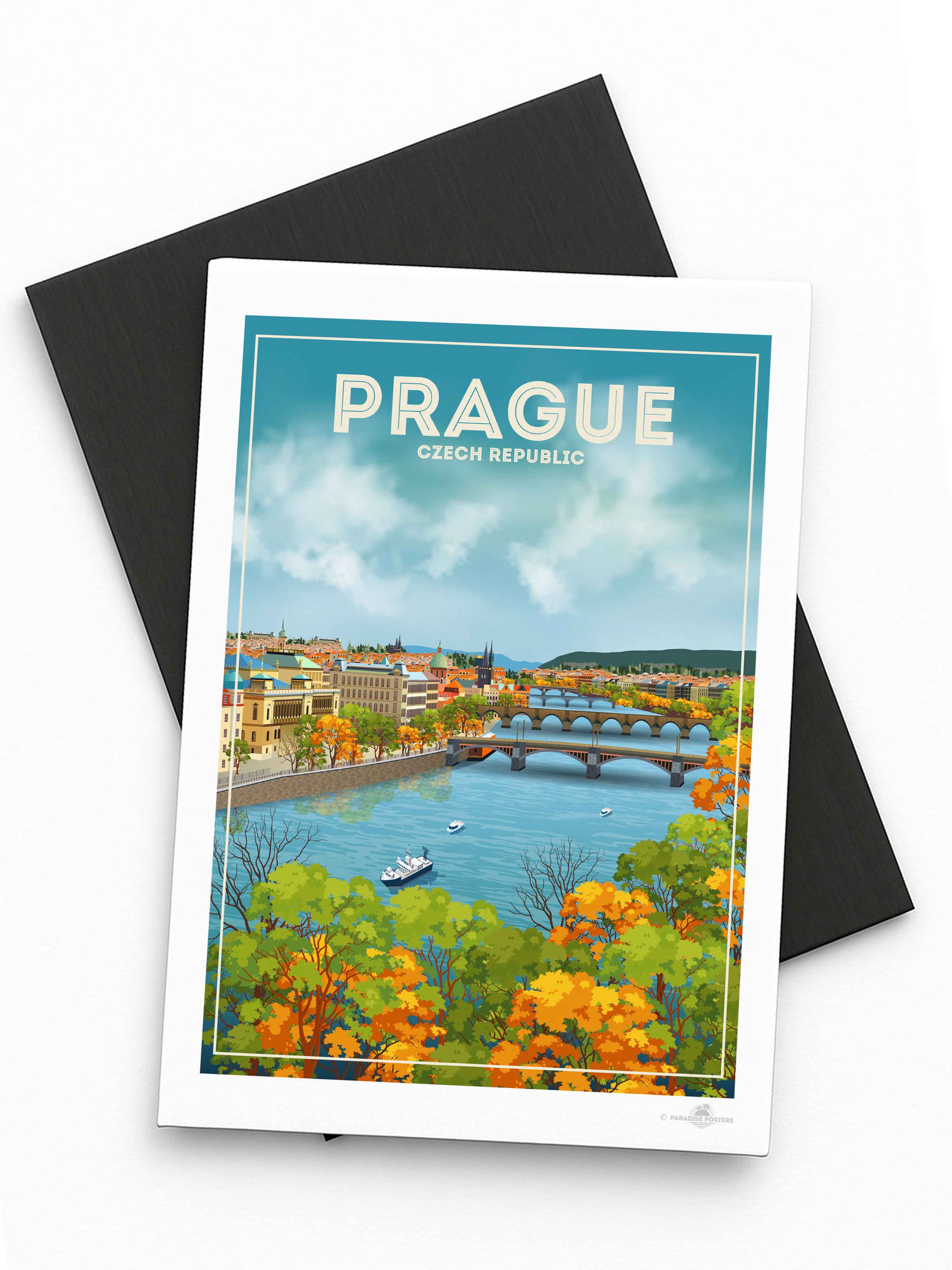 Our travel poster design features two of Prague’s best known landmarks. The Church of Mother of God before Tyn is a gothic a church that has dominated the skyline of Old Town and can be seen from all around Prague. Built in the 14th century, it features two dramatic towers that around 80 metres high. The Charles Bridge is a stone construction that’s over 500 metres long and officially a UNESCO World Heritage Site. Completed in the early 15th Century, the medieval-style structure is protected by bridge towers and was a primary connection between Prague Castle and the city's Old Town. Until the mid-19th century, it was also the only way to cross the River Vltava.