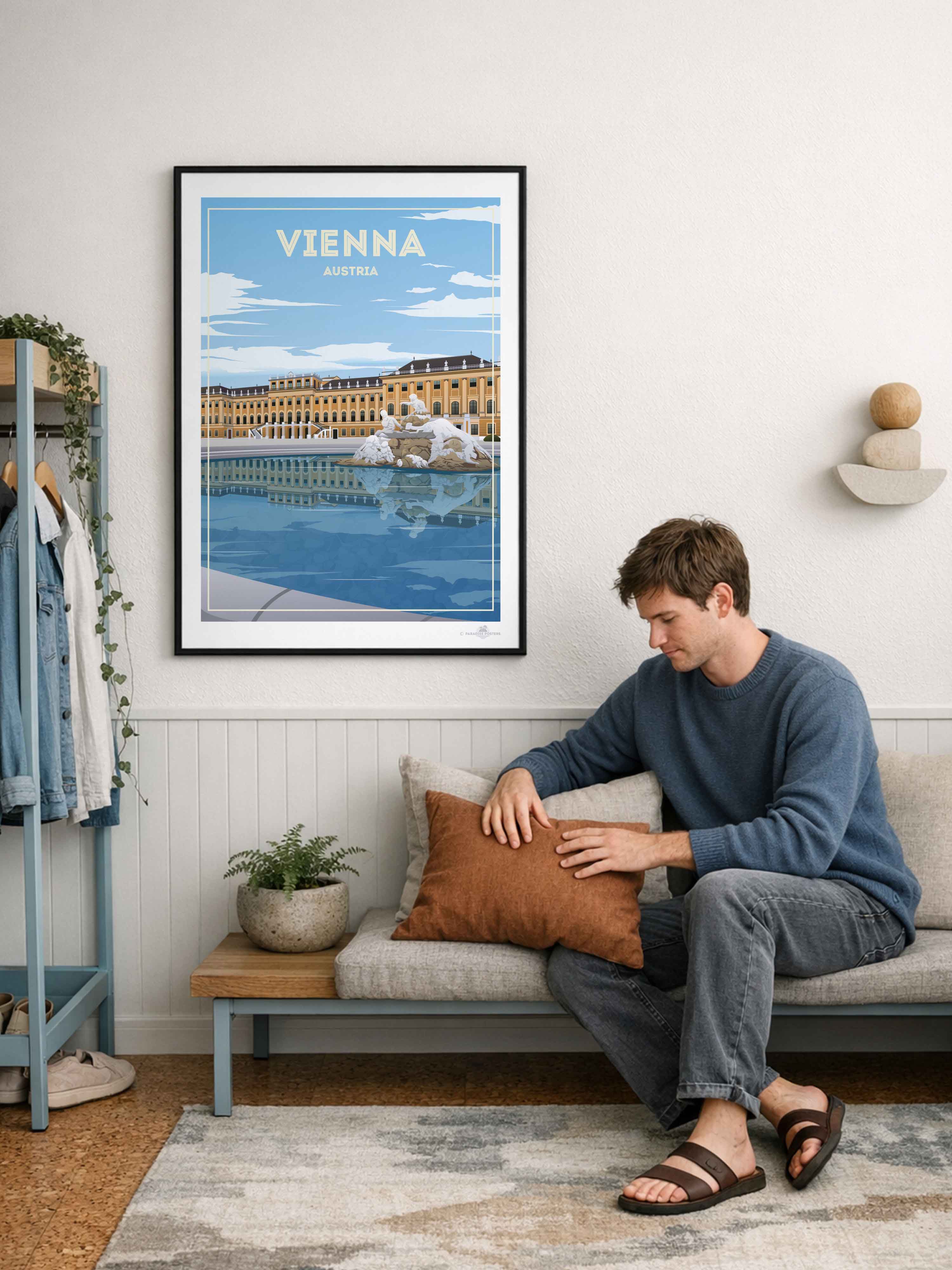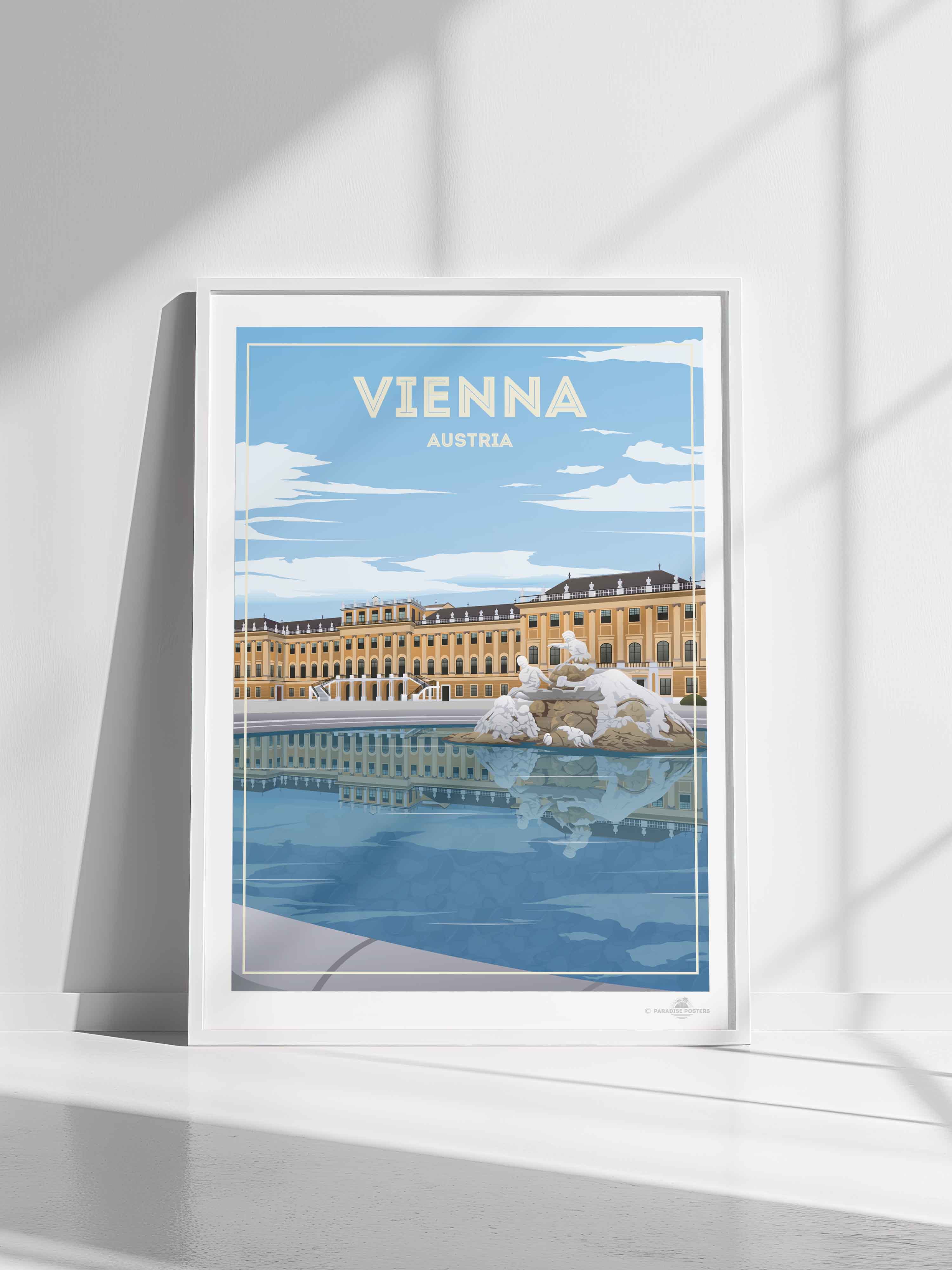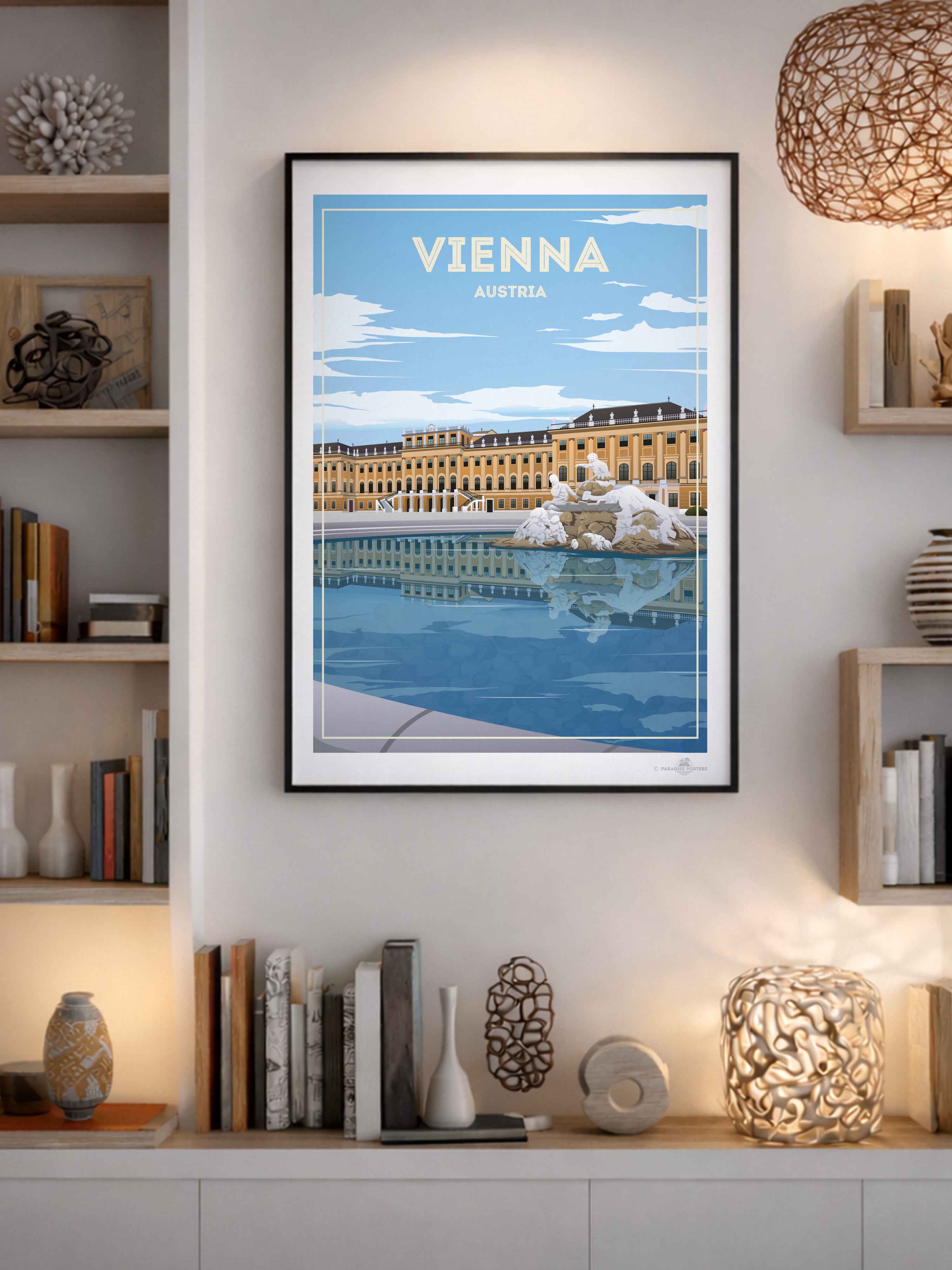 Capture the timeless elegance of Vienna, Austria, with this stunning travel poster showcasing the grandeur of Schönbrunn Palace and its tranquil fountain reflected in calm waters. The artwork’s serene blue sky and golden architecture perfectly embody Vienna’s imperial charm and refined atmosphere.