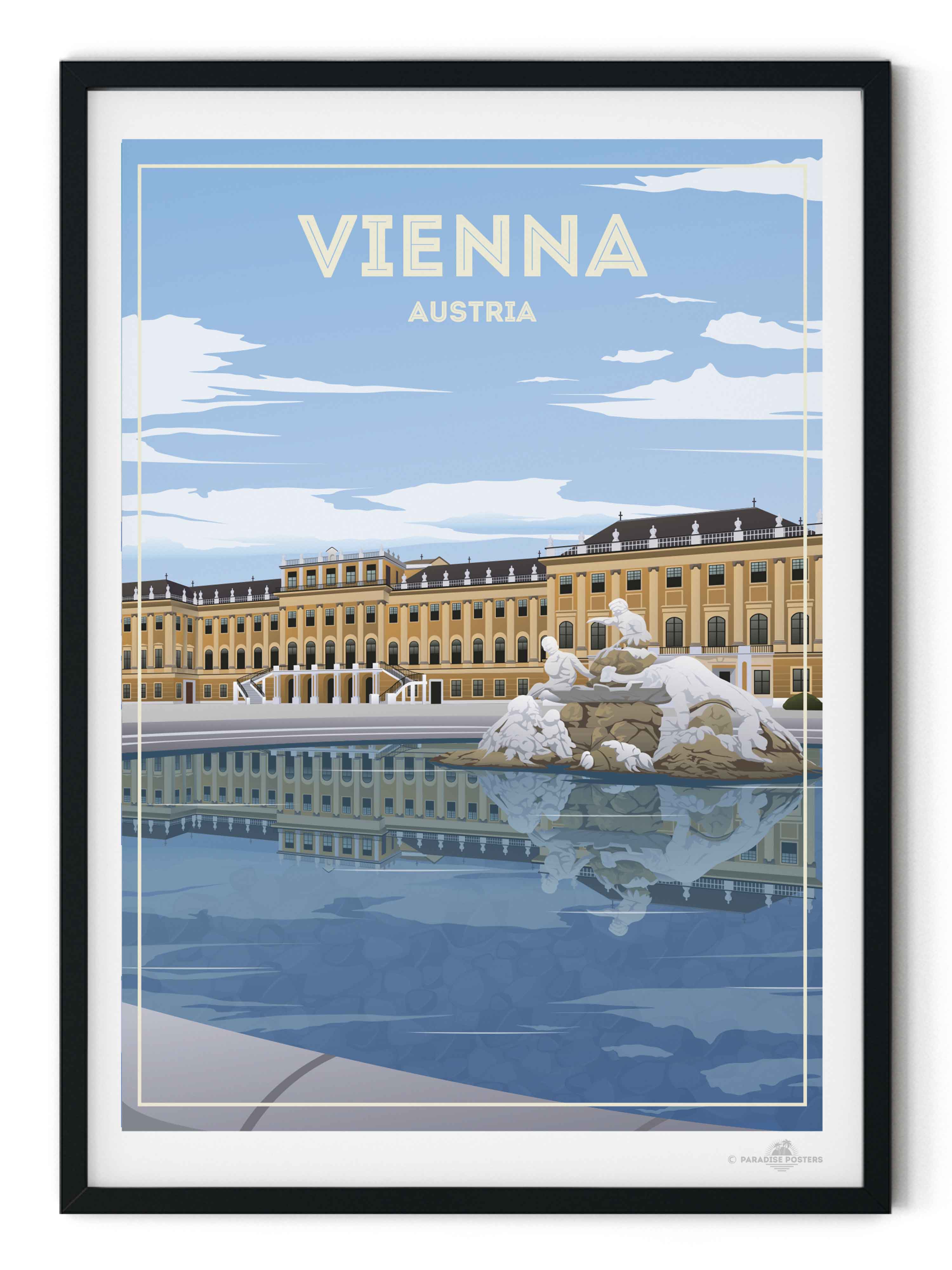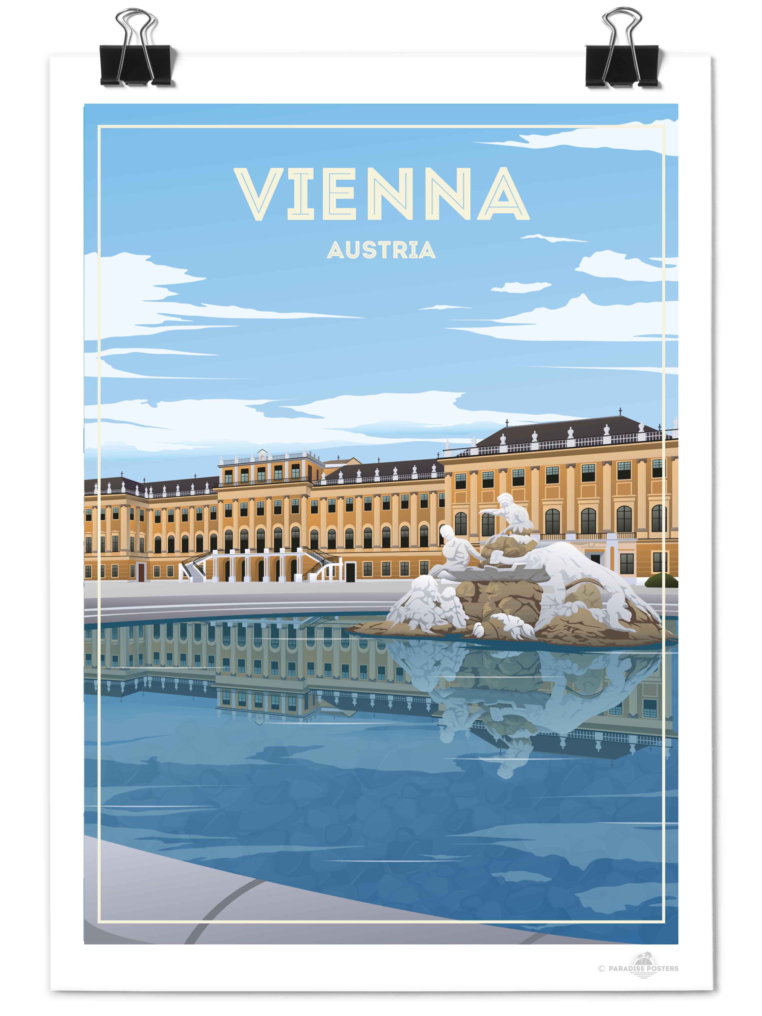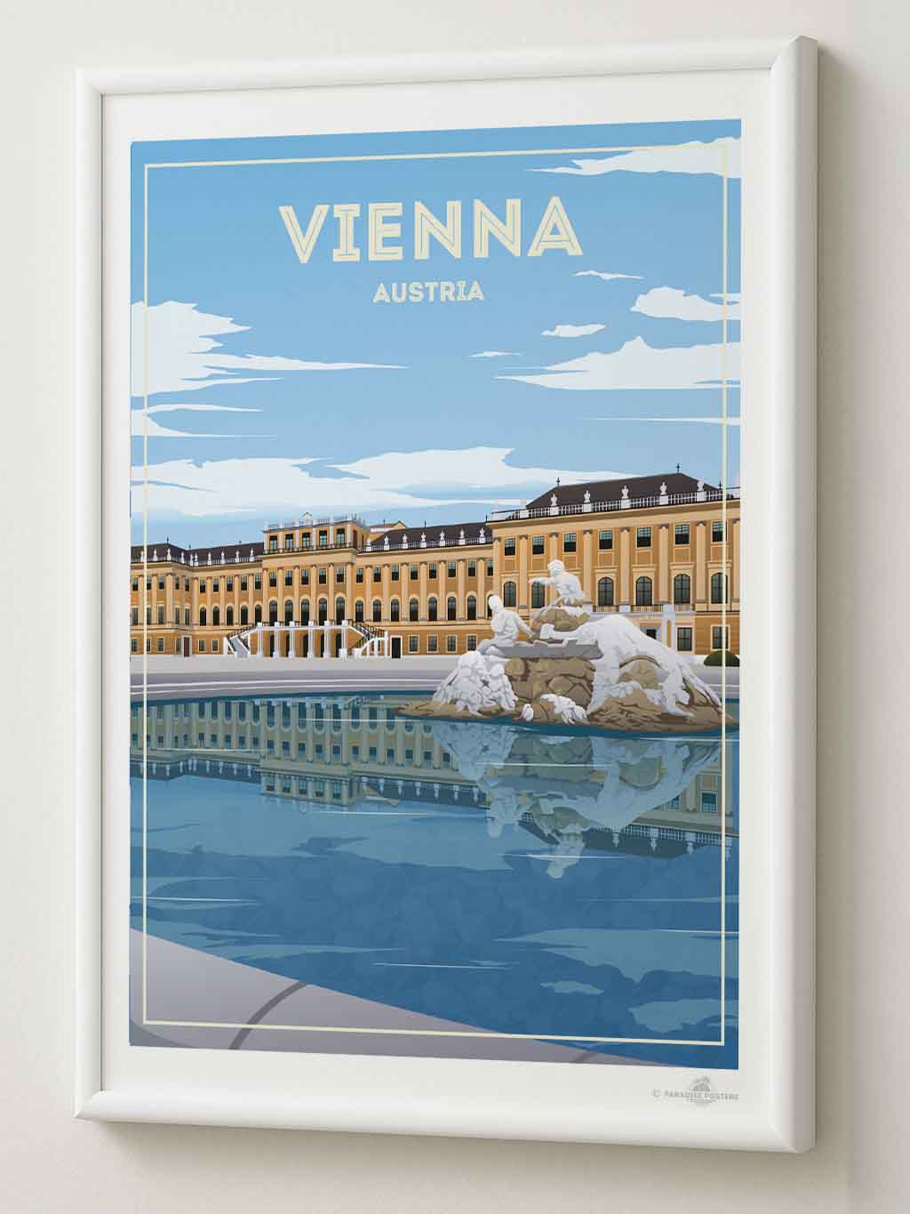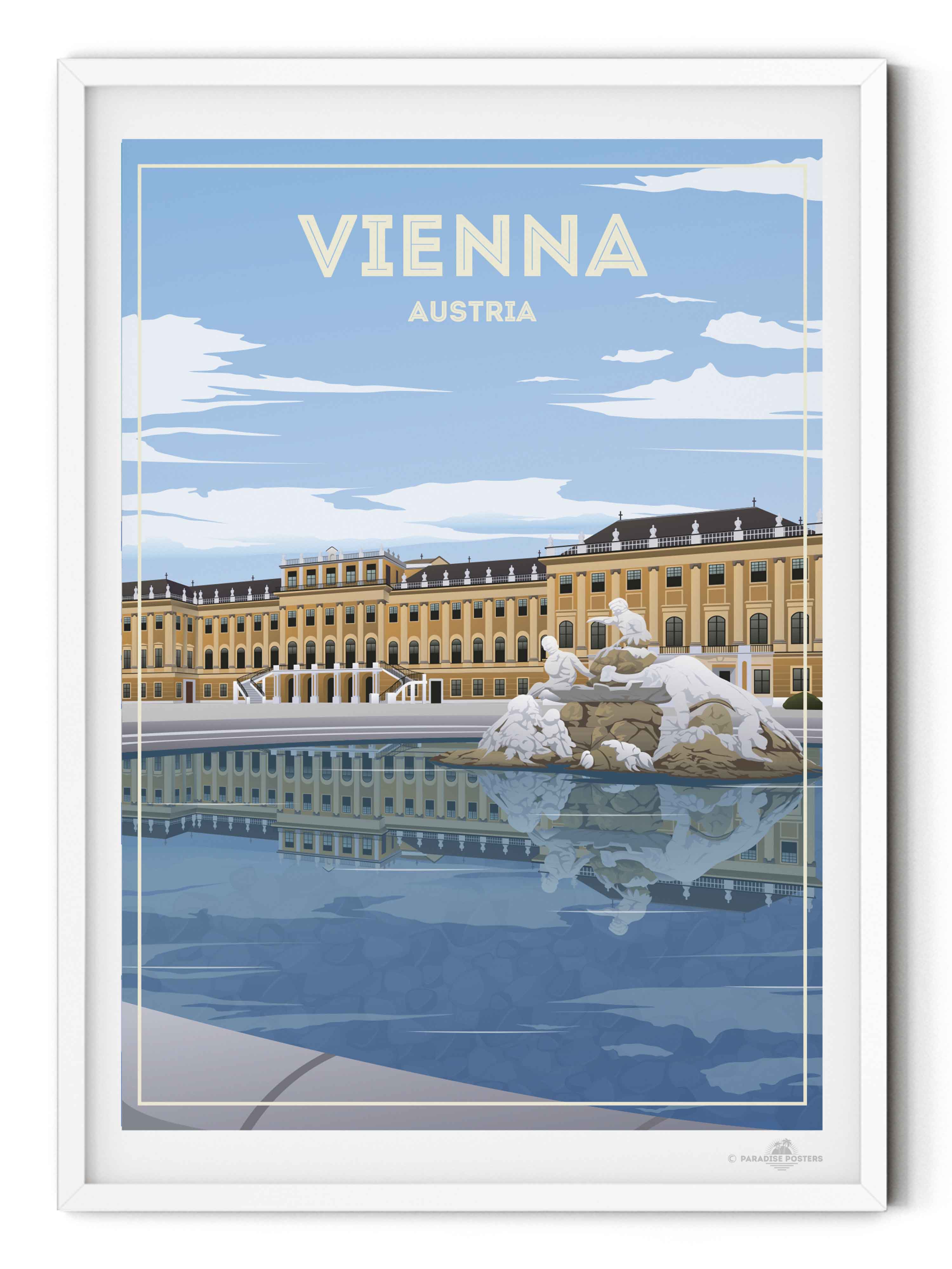 Capture the timeless elegance of Vienna, Austria, with this stunning travel poster showcasing the grandeur of Schönbrunn Palace and its tranquil fountain reflected in calm waters. The artwork’s serene blue sky and golden architecture perfectly embody Vienna’s imperial charm and refined atmosphere.