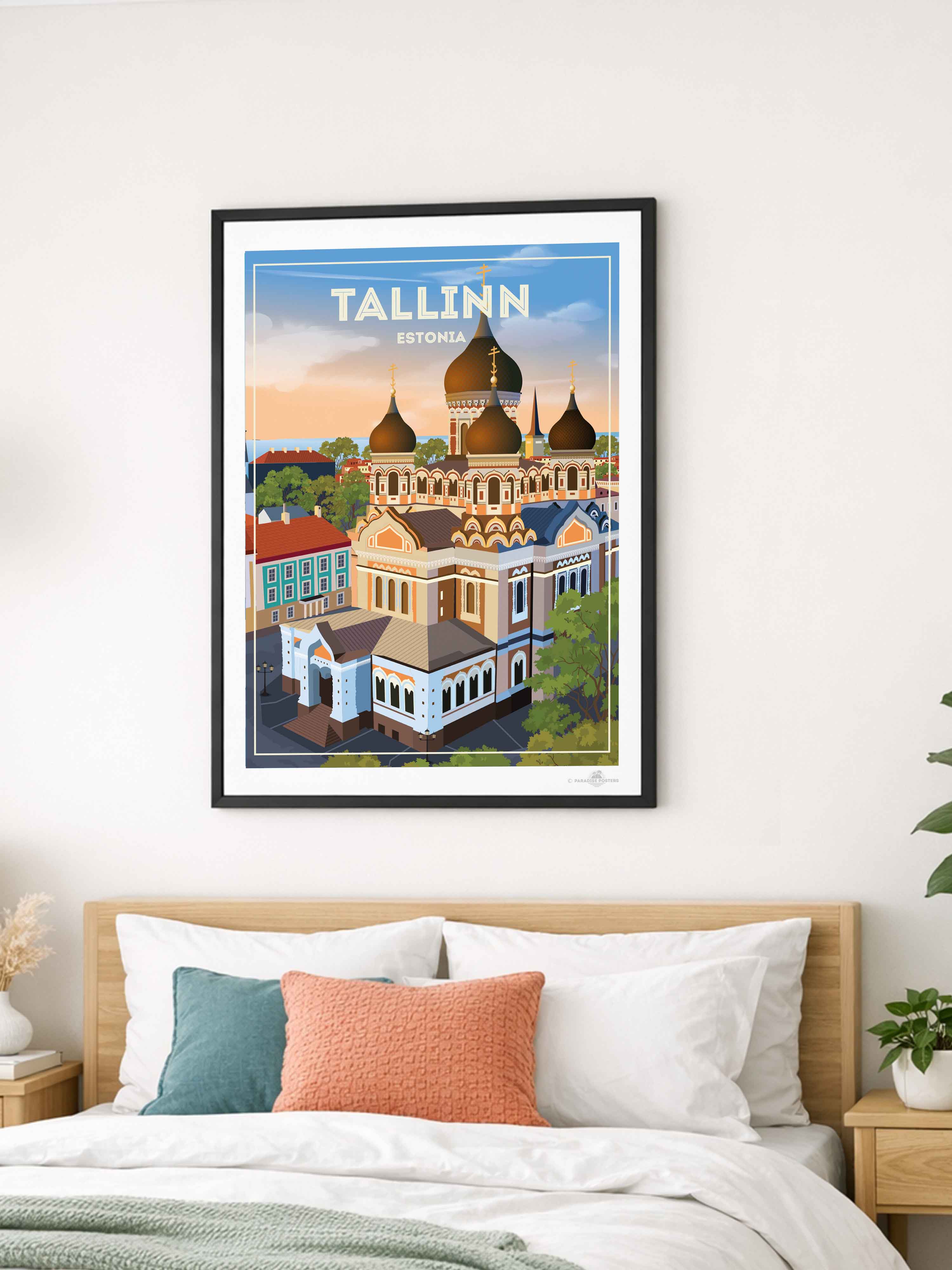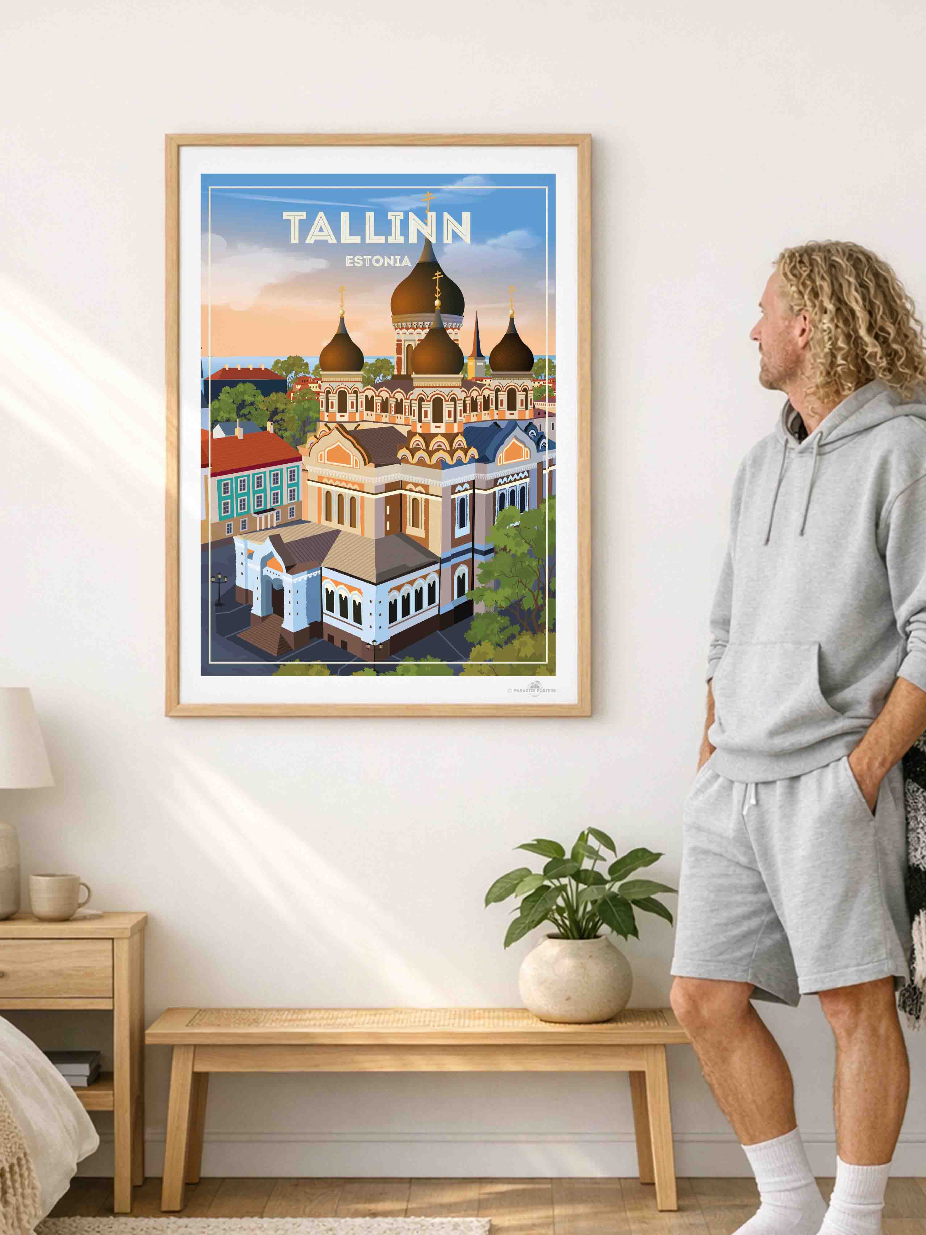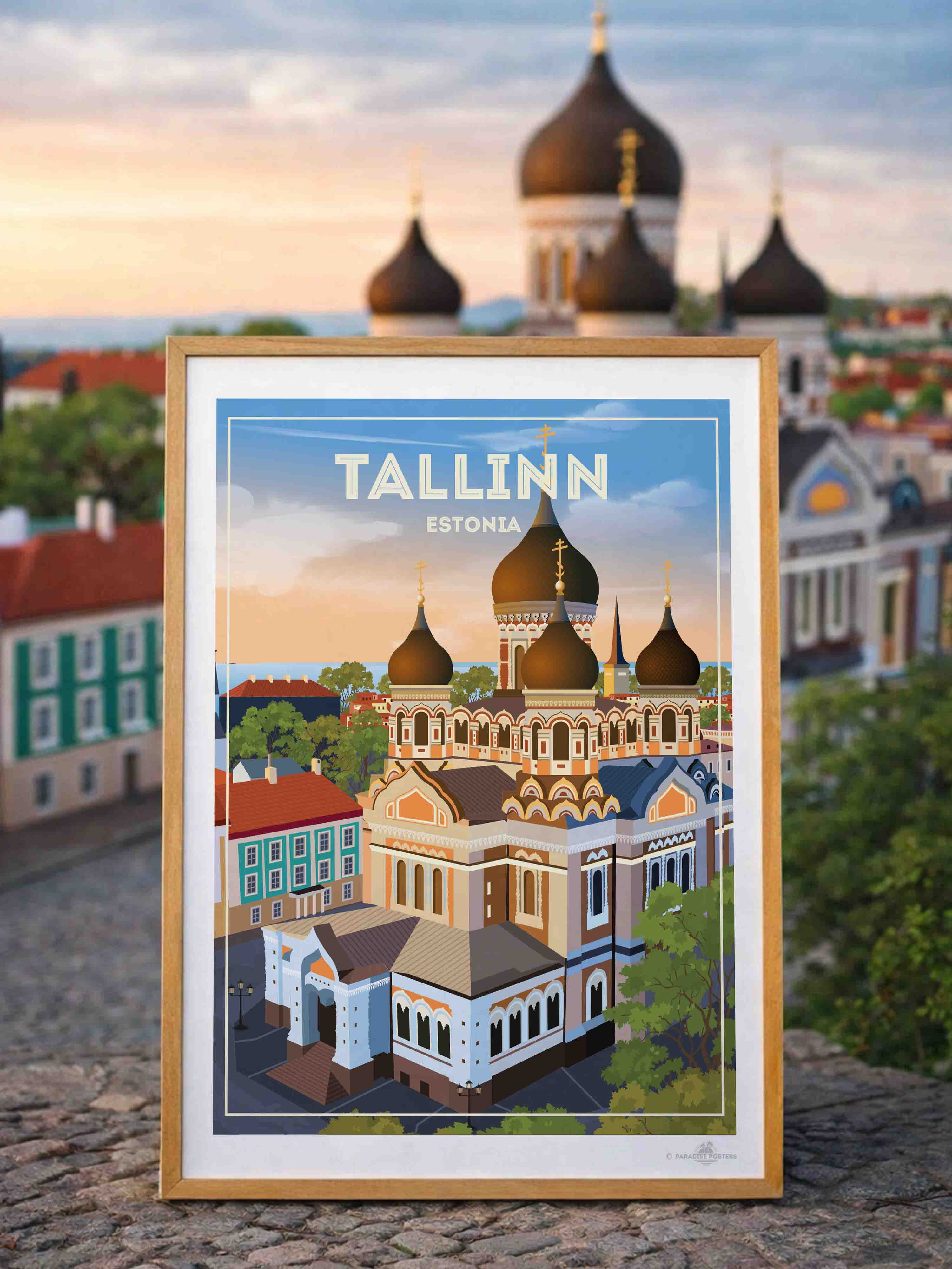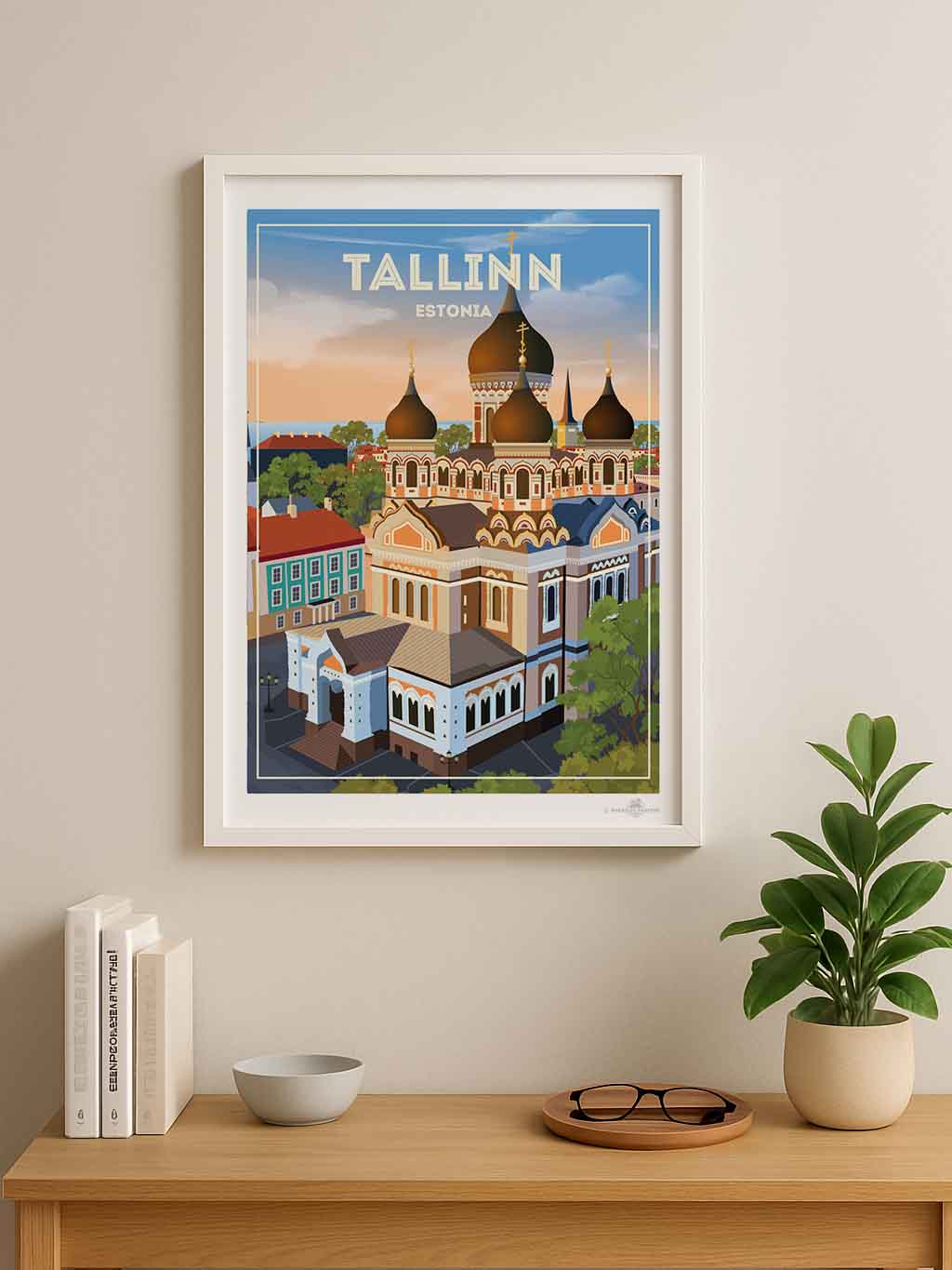 Step into the charming cityscape of Tallinn, Estonia, captured in warm, soft hues that echo a tranquil sunset sky. This artwork highlights the iconic onion domes of Tallinn’s historic architecture, set against a serene backdrop of pastel blues and gentle oranges.
