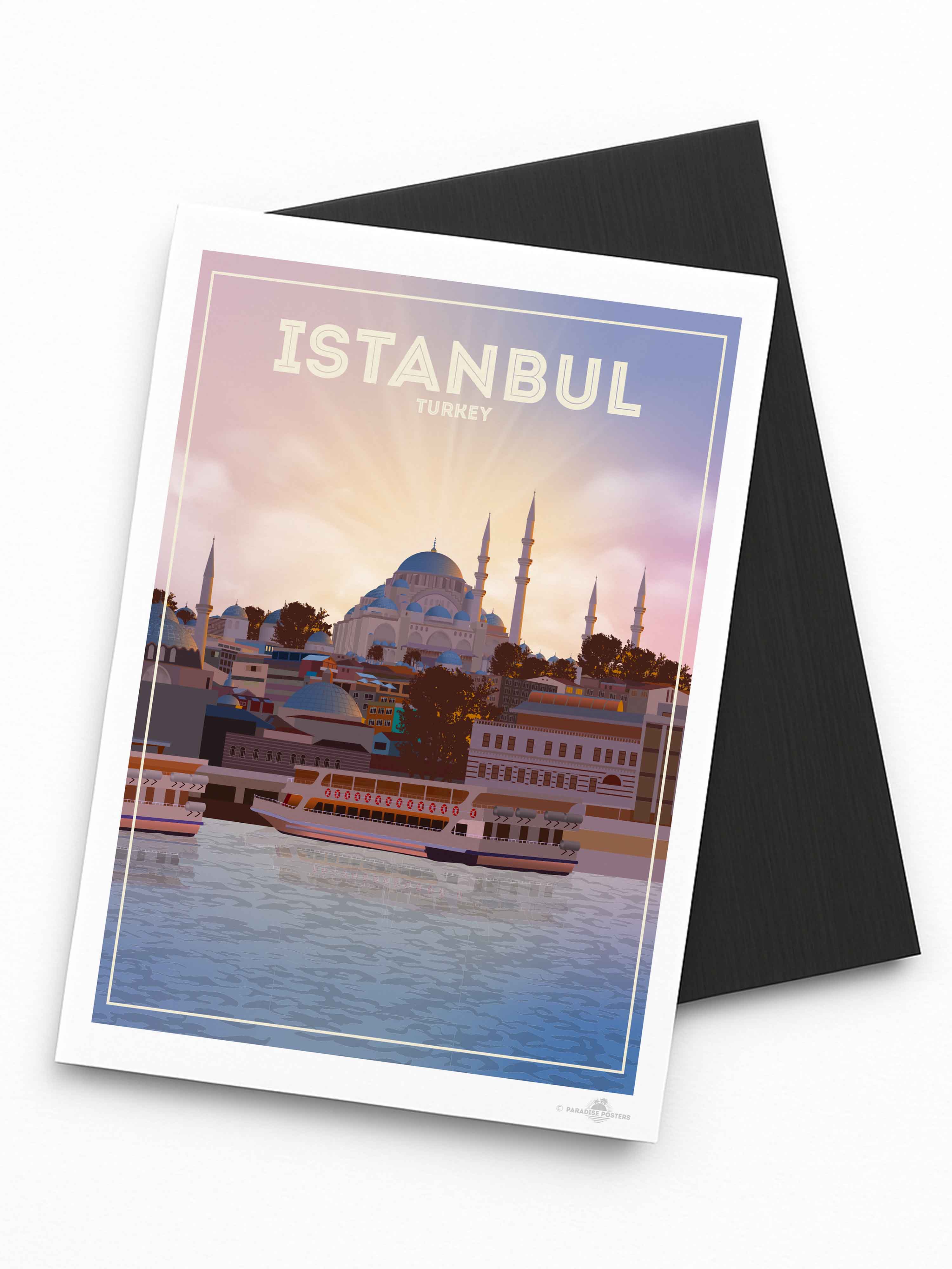 El hermoso edificio que se ve al otro lado del río Bósforo en el diseño de nuestro póster es la Mezquita del Sultán Ahmed, más conocida como la Mezquita Azul. Inaugurada en 1616, fue construida originalmente para reafirmar el poder otomano; hoy en día sigue siendo una mezquita en funcionamiento y uno de los lugares turísticos más populares de Estambul. Su impactante diseño cuenta con 13 cúpulas, 6 minaretes (torres) y está decorada con 20.000 piezas de cerámica vidriada pintadas a mano con diferentes patrones de tuplas. Los niveles inferiores están iluminados por sus 200 vidrieras.