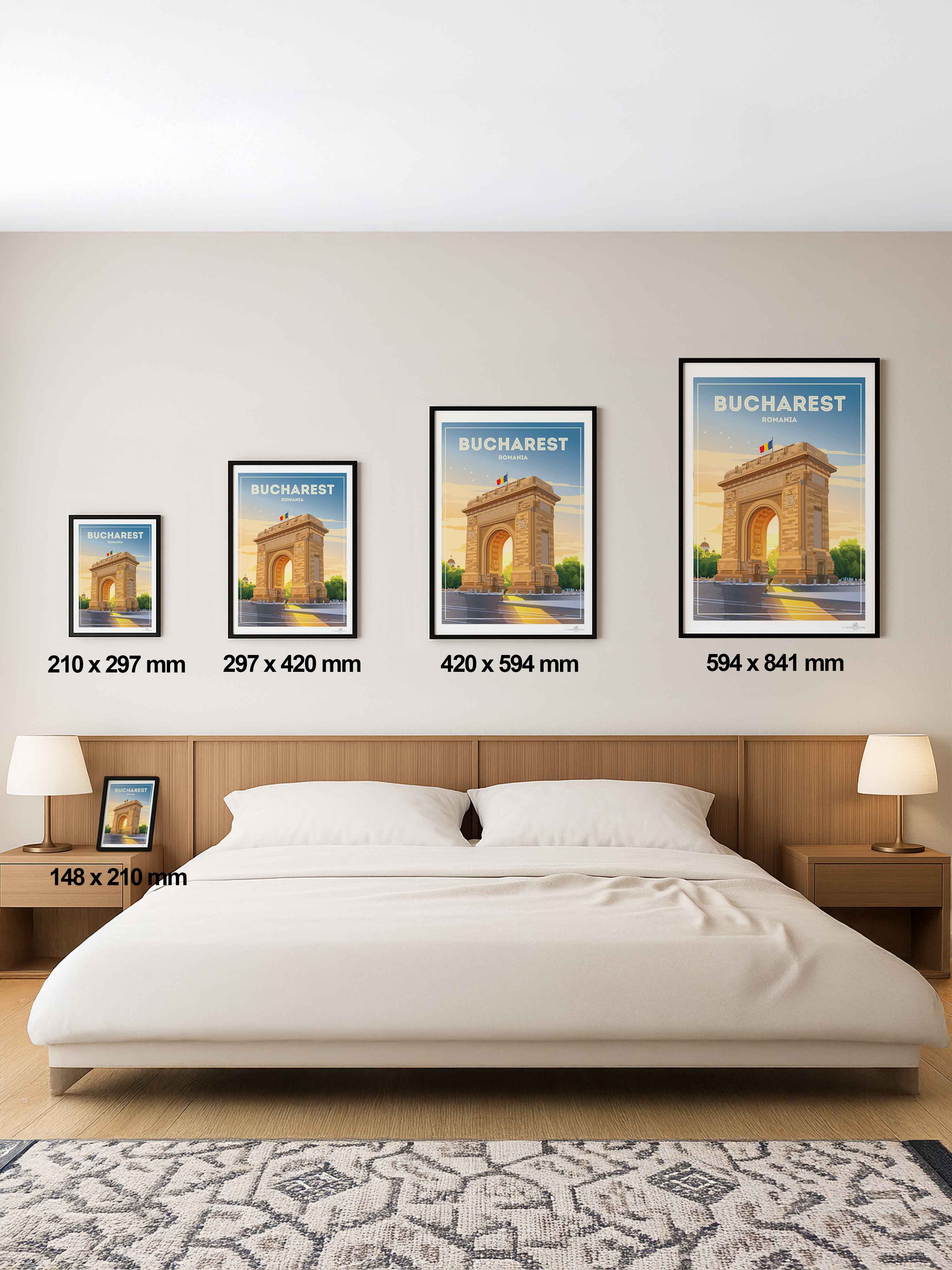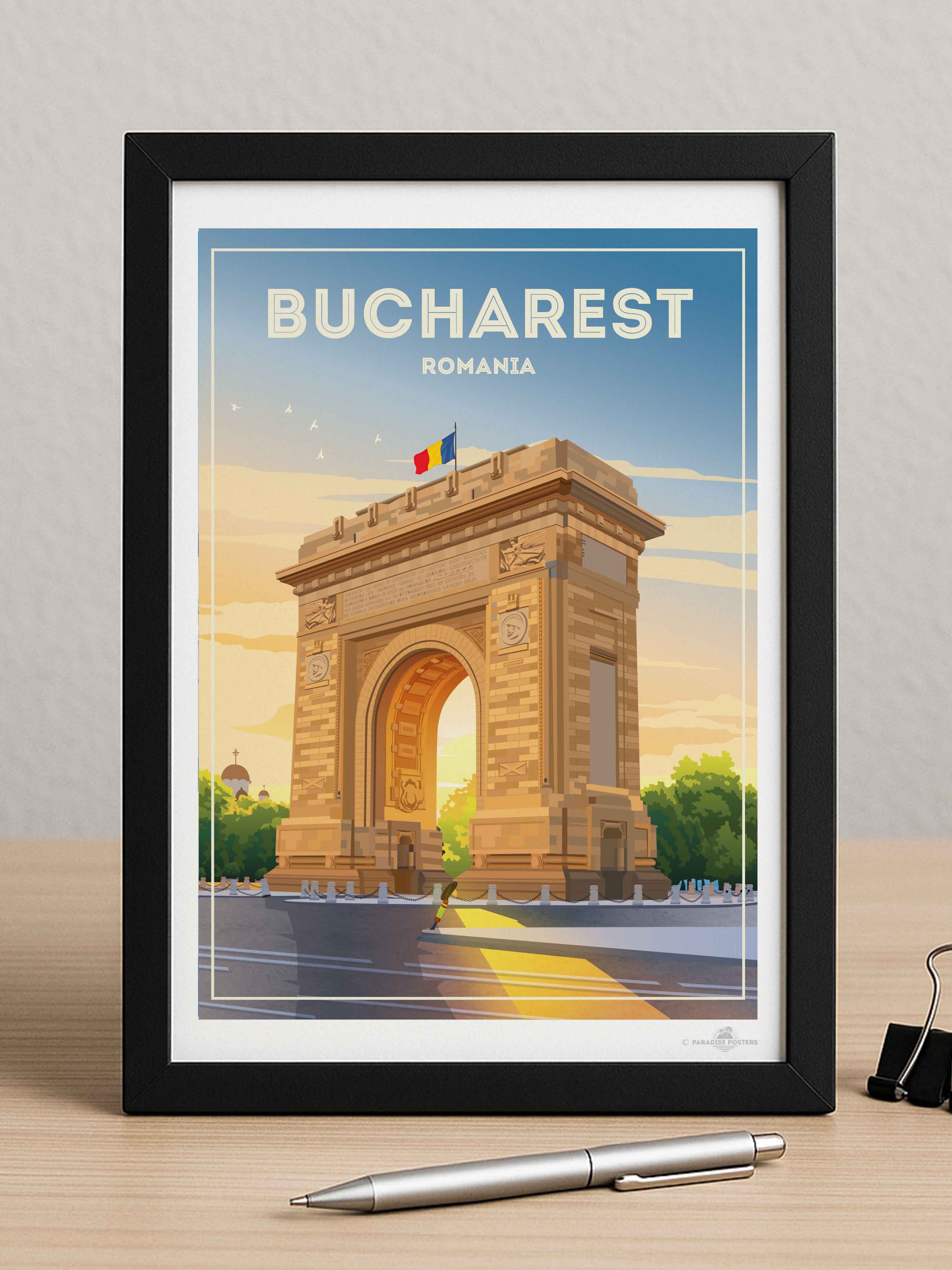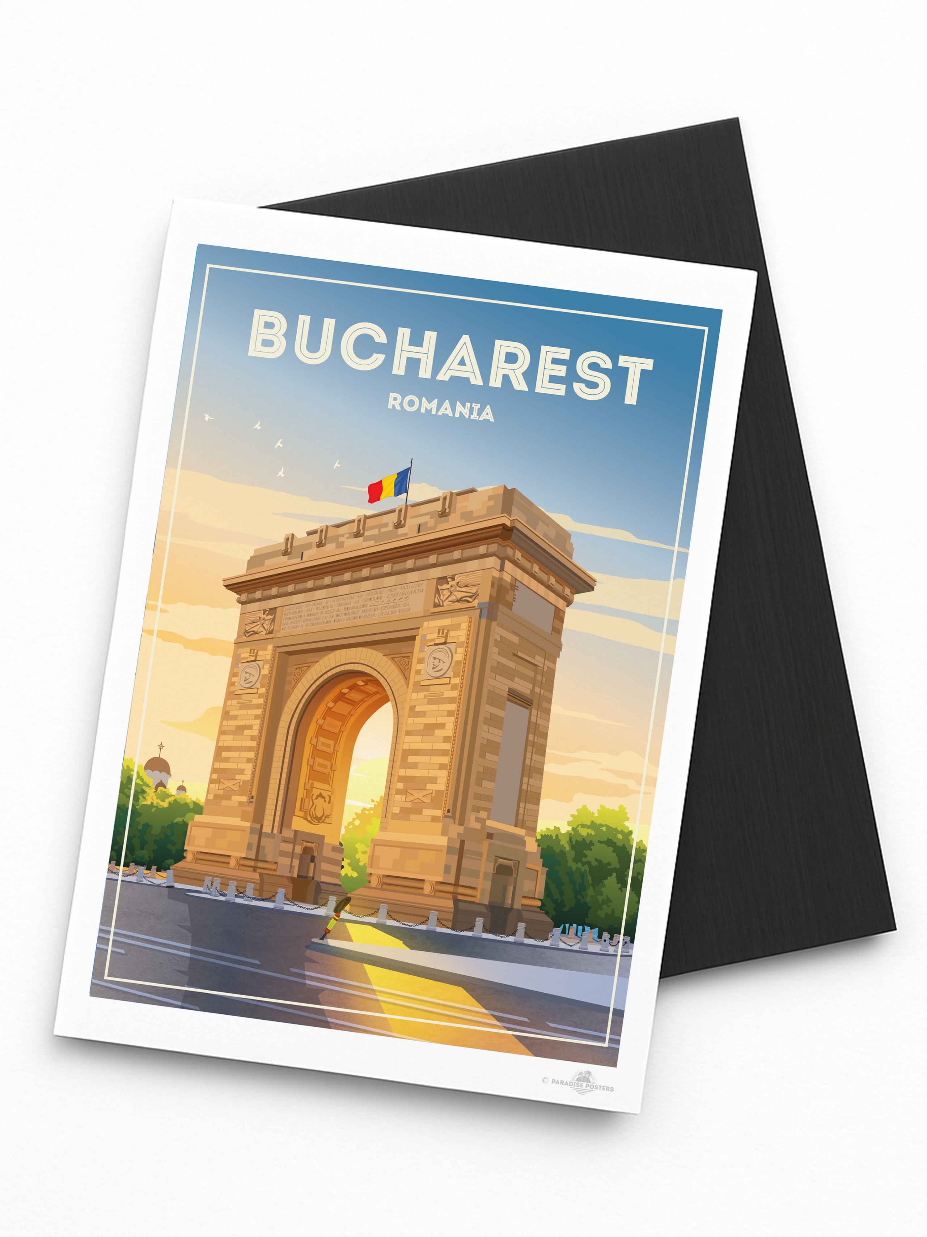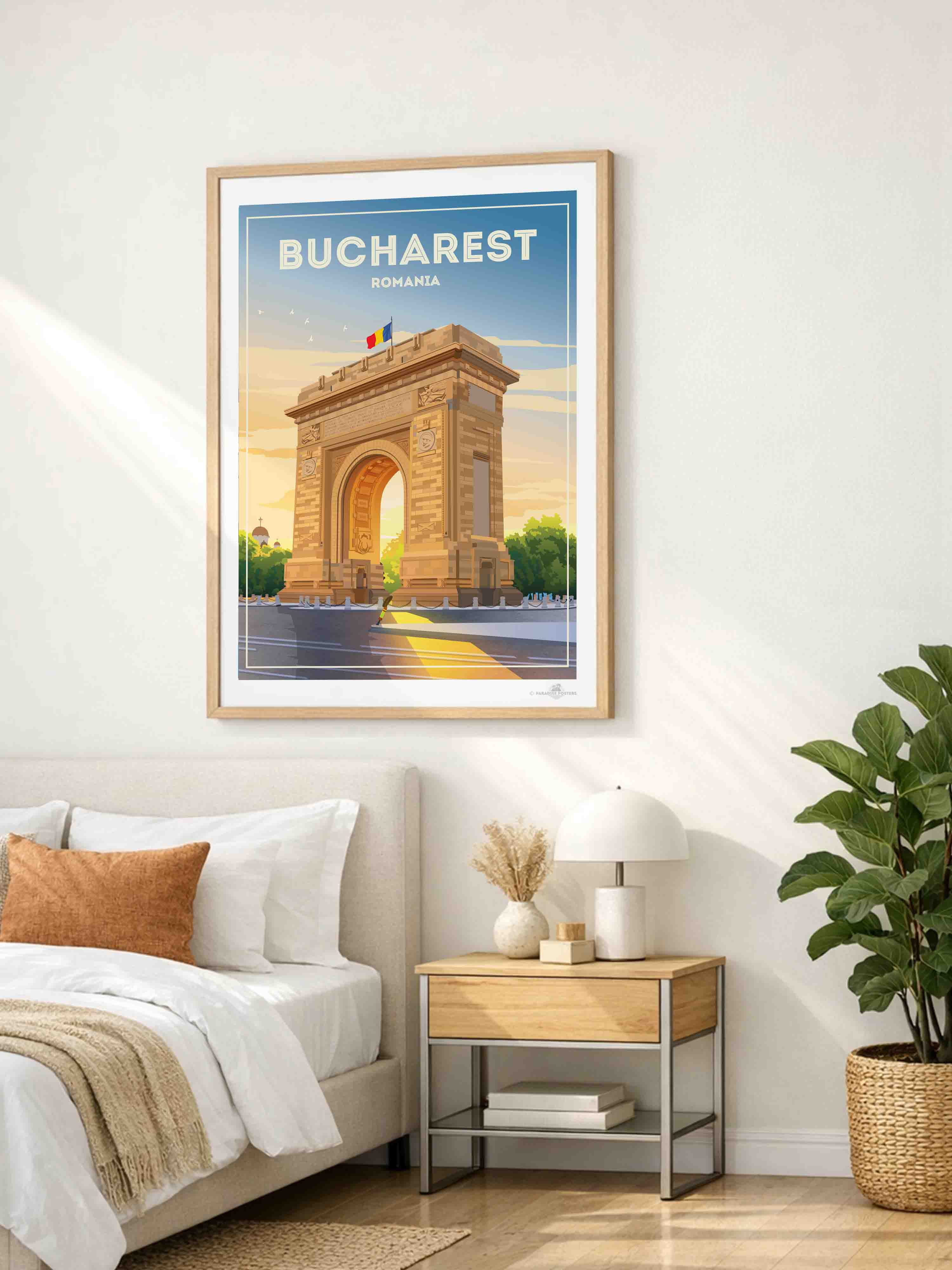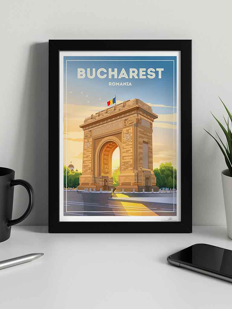 Representado en un estilo retro estilizado, el póster resalta los detalles arquitectónicos de la capital de Rumania con líneas limpias y una paleta vibrante que encaja perfectamente en un interior clásico o contemporáneo. Imagina esta pieza de arte enriqueciendo tu sala de estar, dormitorio u oficina, impregnando el espacio con encanto cultural y energía tranquila.