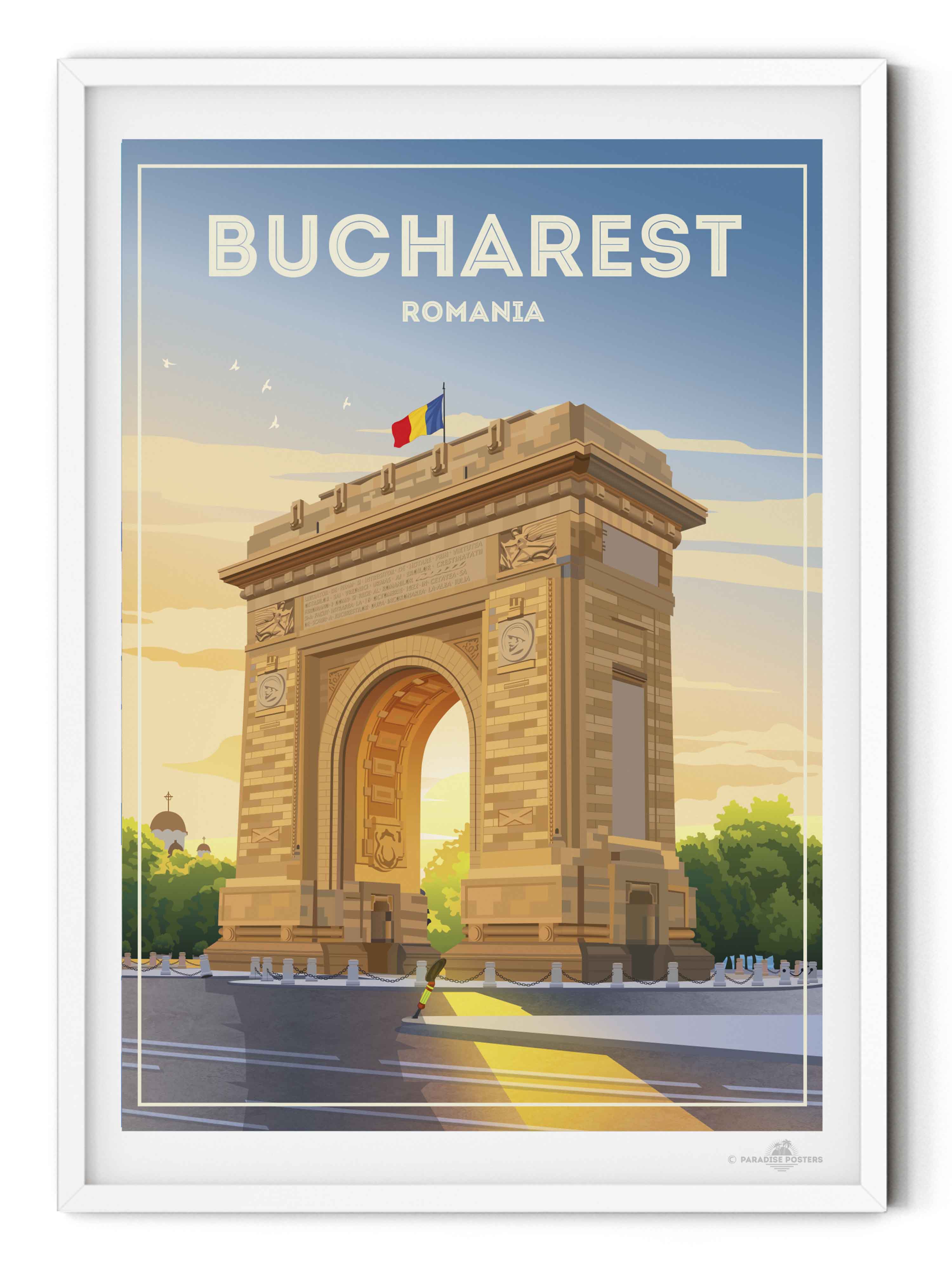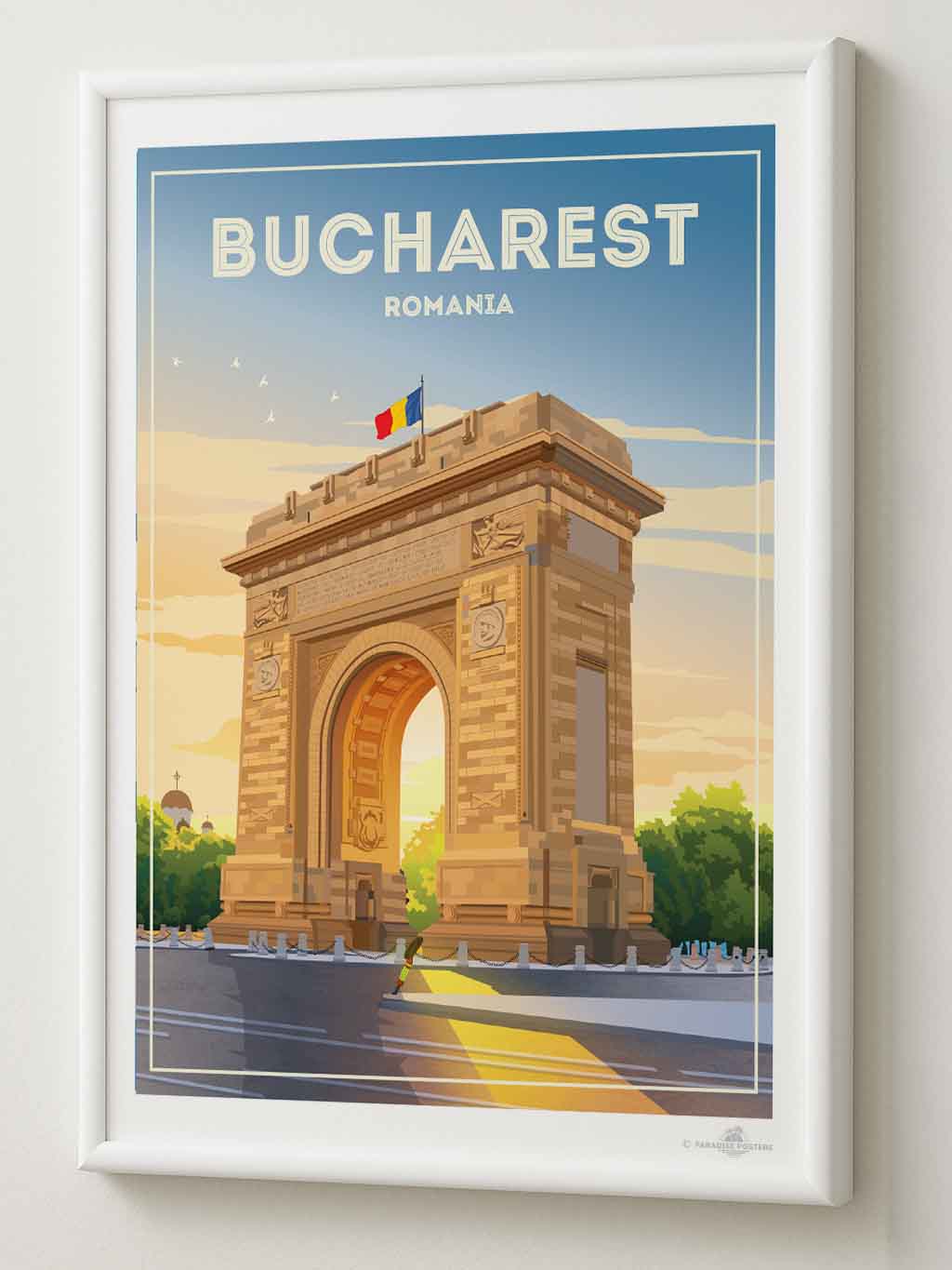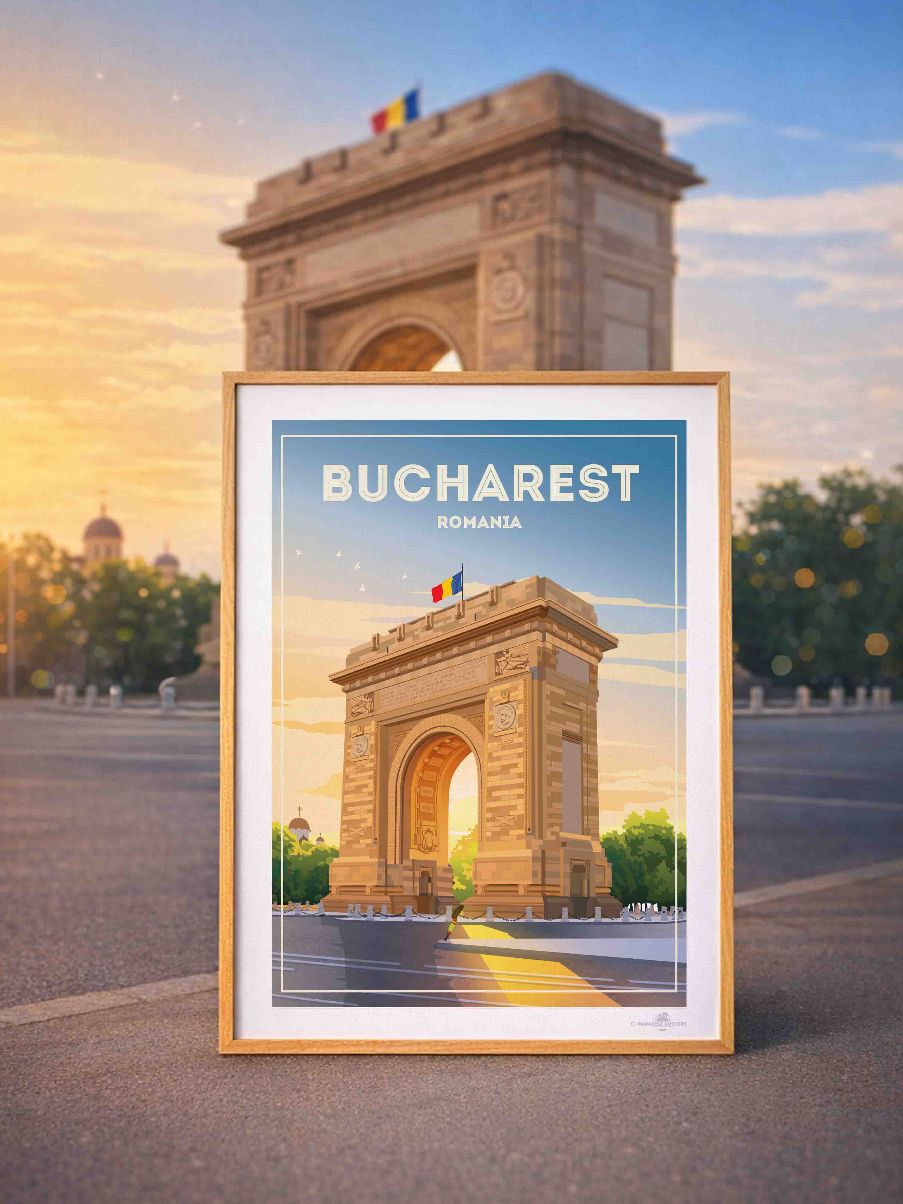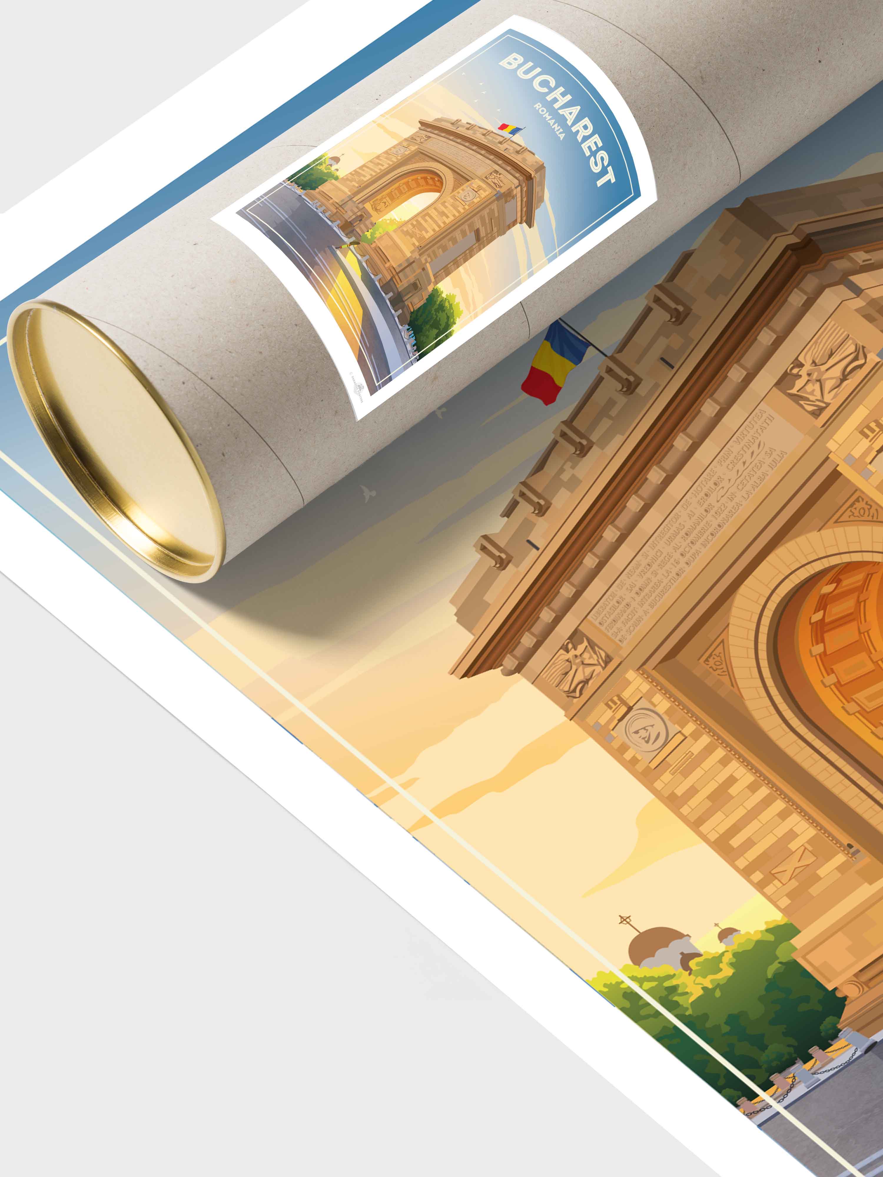 Representado en un estilo retro estilizado, el póster resalta los detalles arquitectónicos de la capital de Rumania con líneas limpias y una paleta vibrante que encaja perfectamente en un interior clásico o contemporáneo. Imagina esta pieza de arte enriqueciendo tu sala de estar, dormitorio u oficina, impregnando el espacio con encanto cultural y energía tranquila.