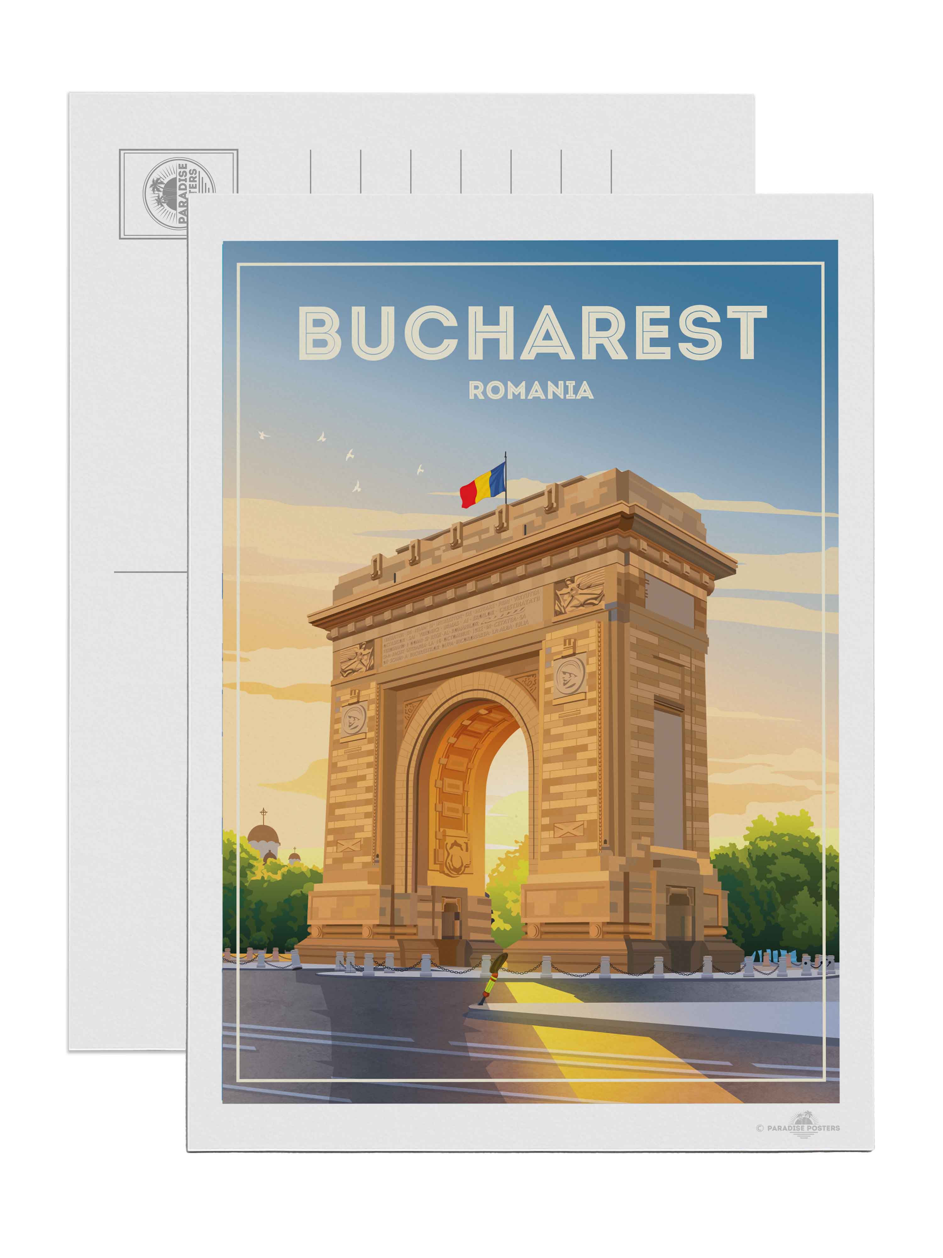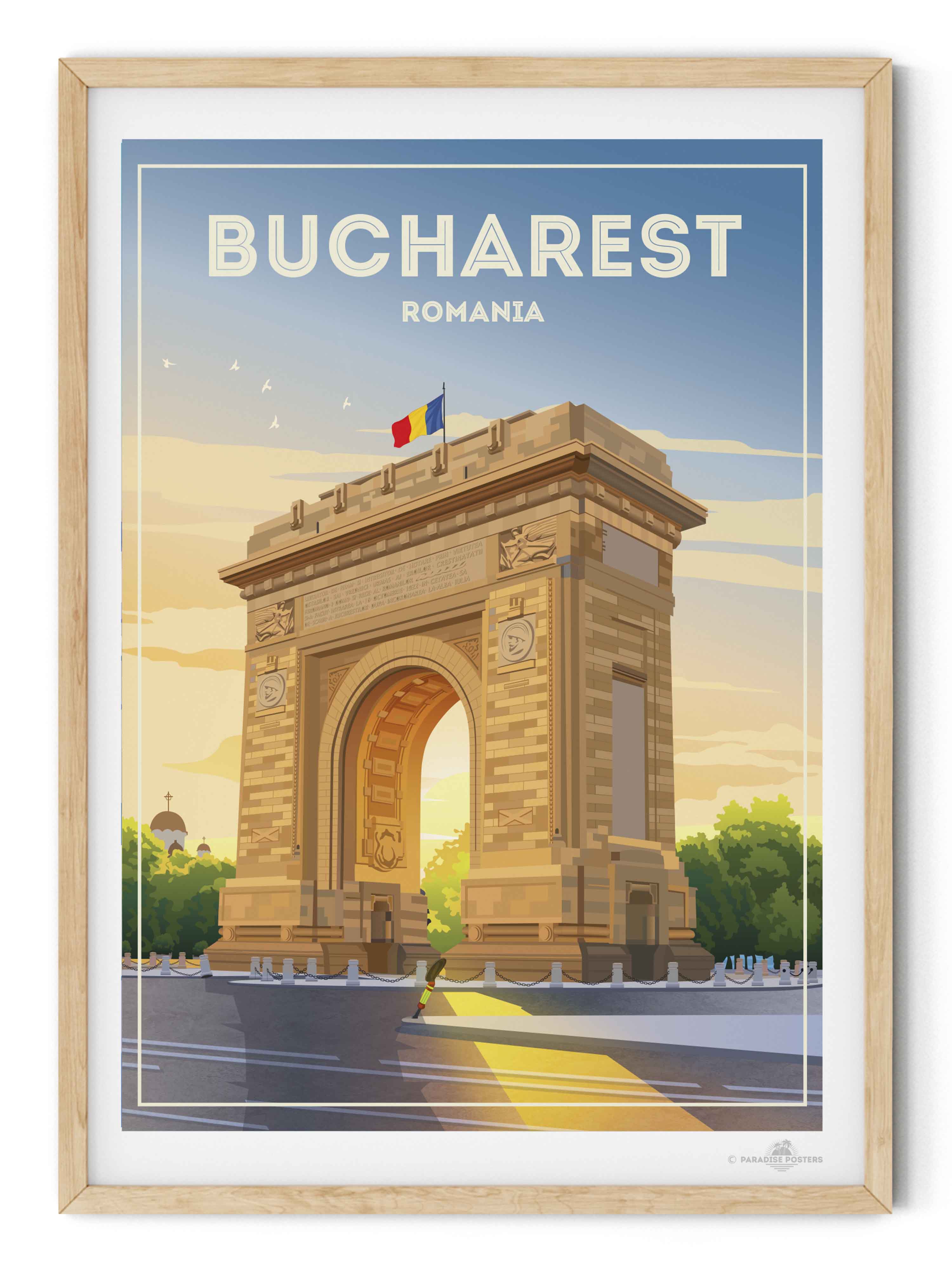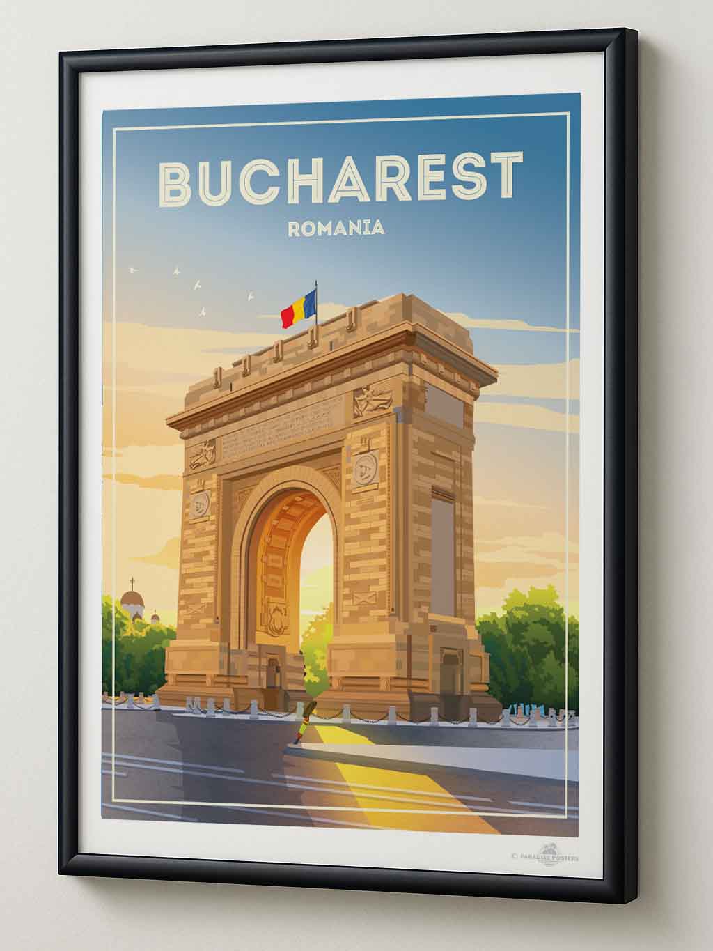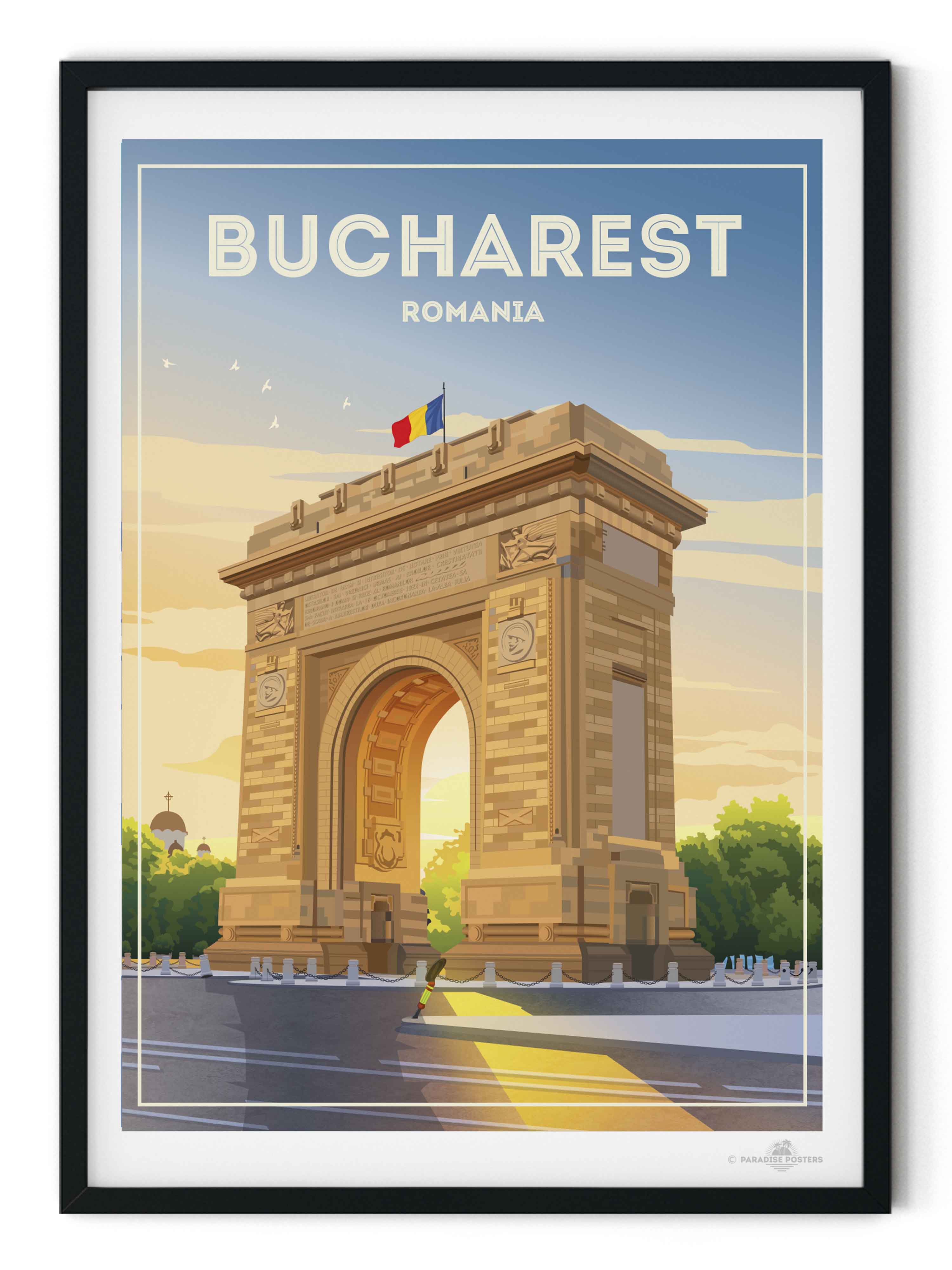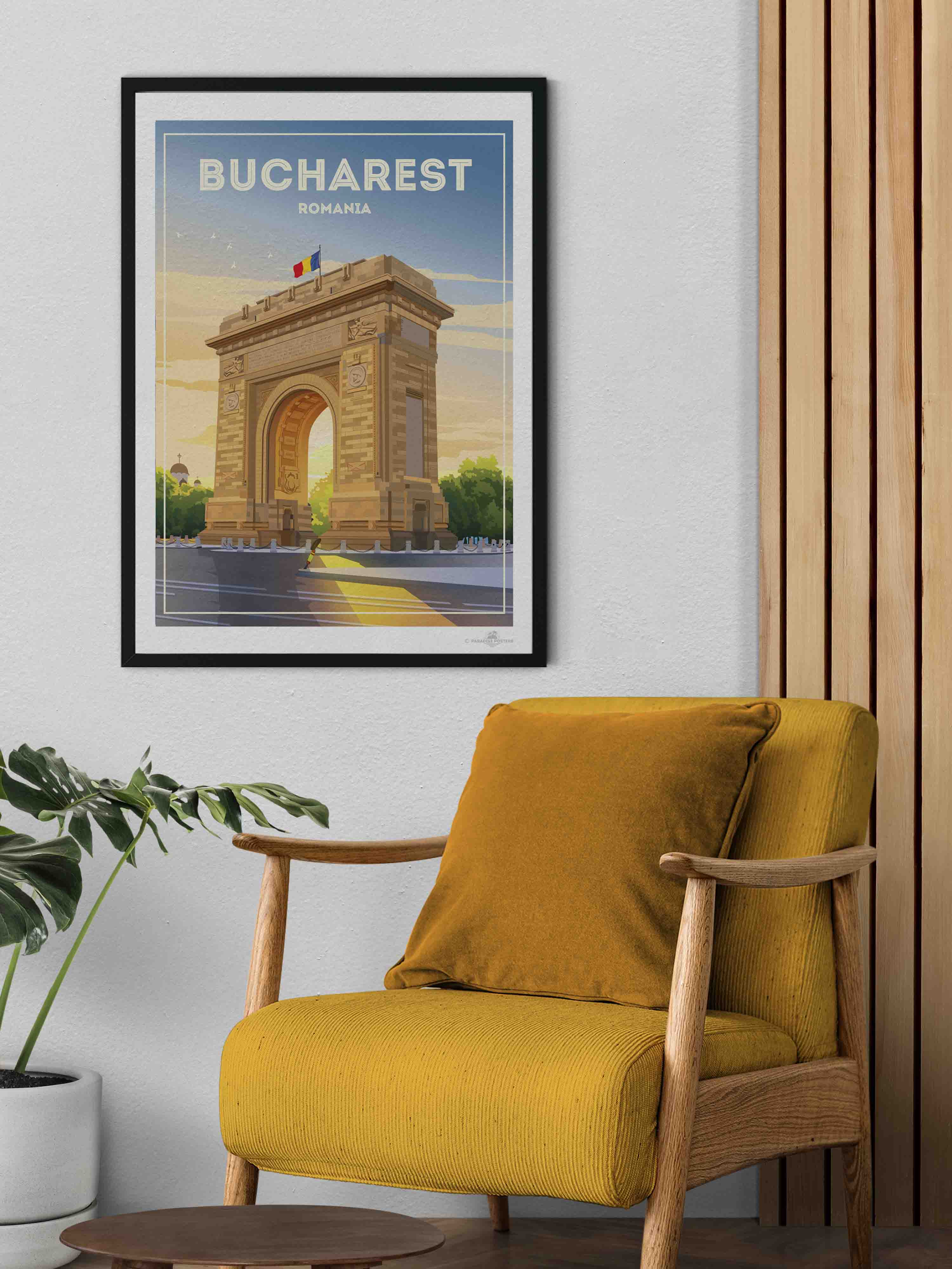 Representado en un estilo retro estilizado, el póster resalta los detalles arquitectónicos de la capital de Rumania con líneas limpias y una paleta vibrante que encaja perfectamente en un interior clásico o contemporáneo. Imagina esta pieza de arte enriqueciendo tu sala de estar, dormitorio u oficina, impregnando el espacio con encanto cultural y energía tranquila.