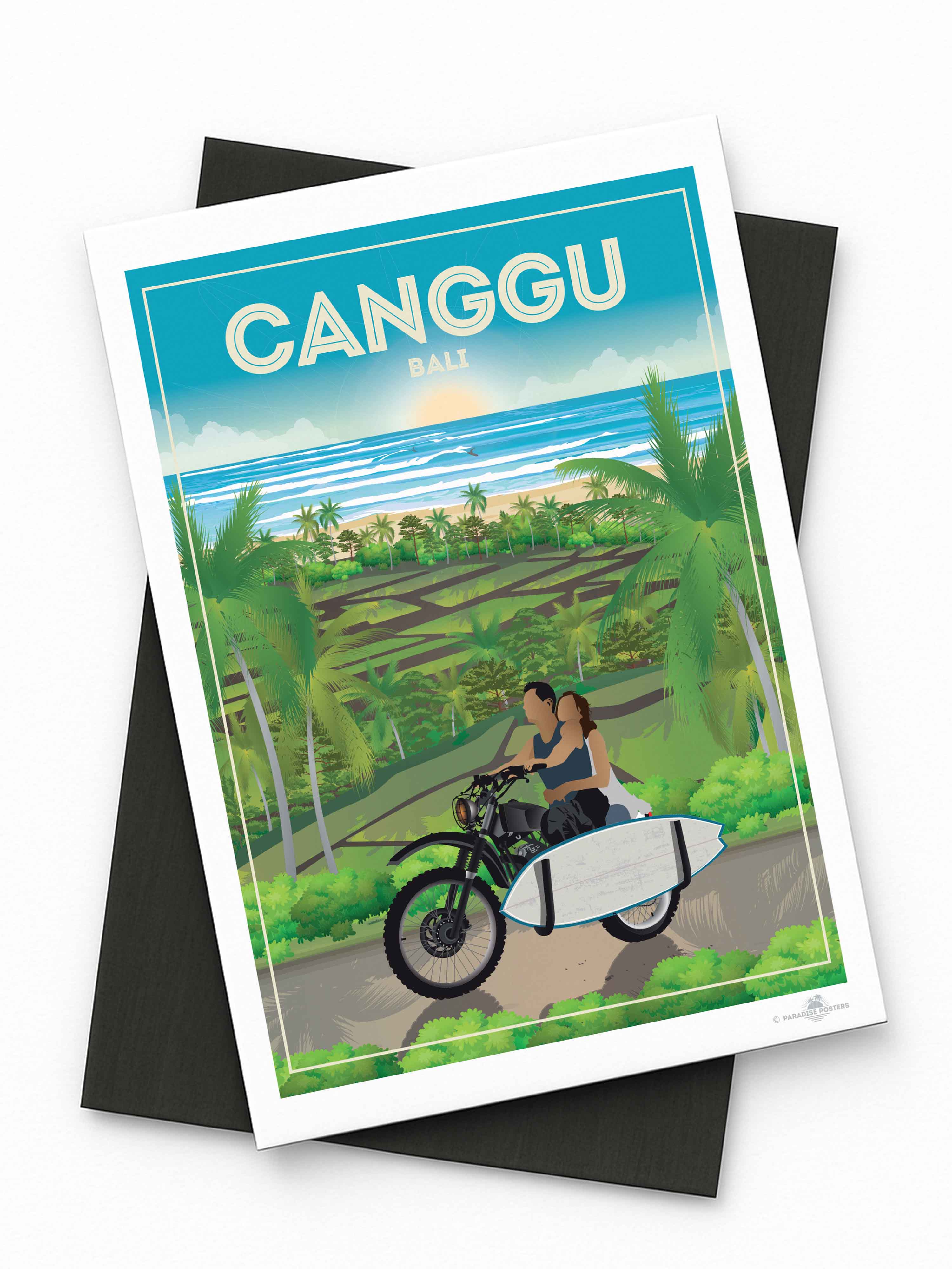 De nombreux habitants vous diront que le meilleur moyen de découvrir Bali (et la façon dont ils ont tendance à se déplacer) est en scooter, c'est pourquoi nous avons choisi ce thème comme sujet de notre affiche. Imaginez-vous en train de parcourir le paysage luxuriant avec le vent dans la tête et l'odeur de l'océan dans les narines. La vie insulaire à son meilleur.