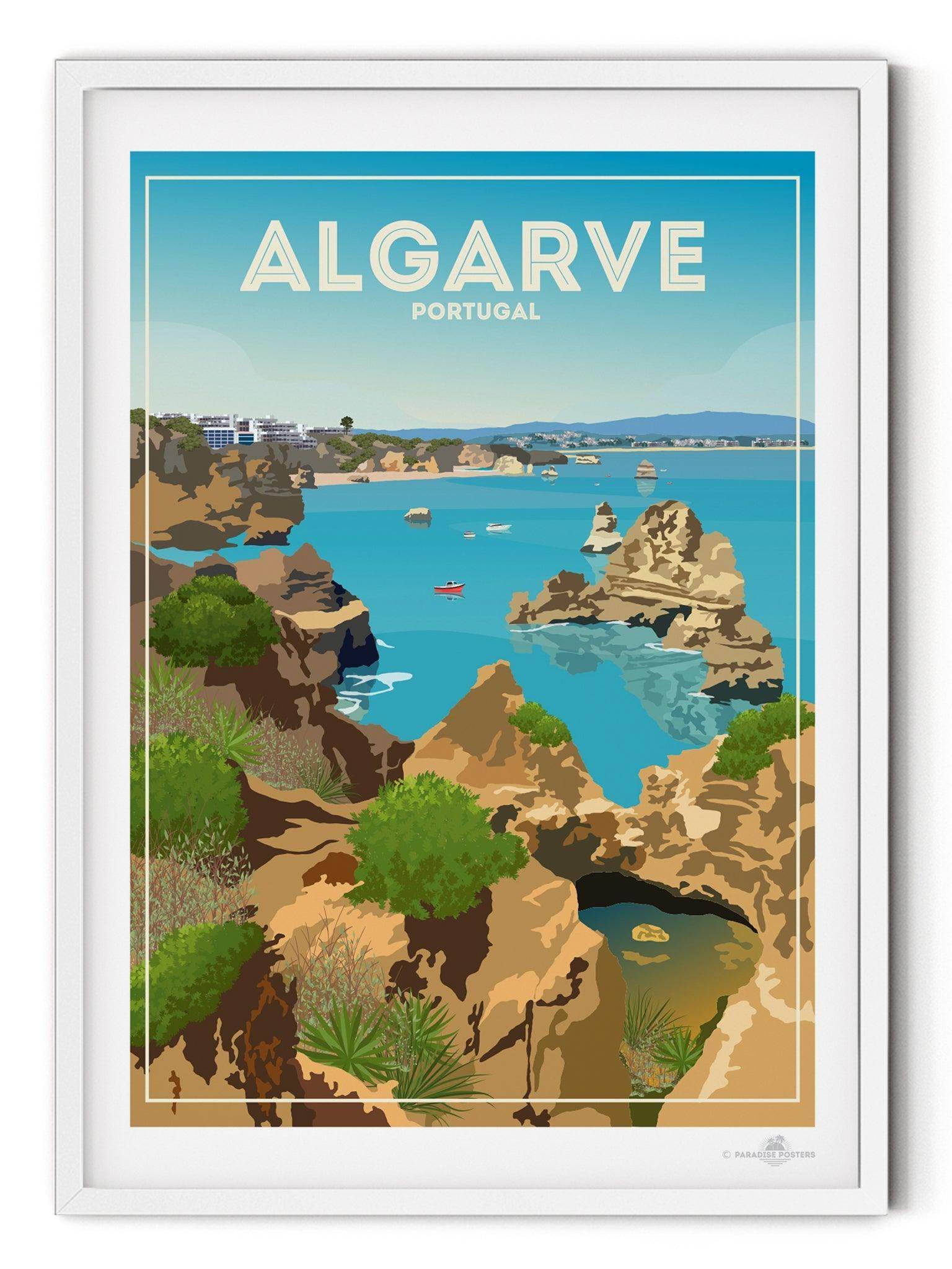 La parte dell'Algarve raffigurata nel nostro poster a Lagos, si pronuncia La Goosh. La città ha avuto origine come città marinara ed è riuscita a conservare gran parte del suo carattere originale, nonostante sia molto apprezzata dai turisti internazionali. I visitatori possono godersi una passeggiata lungo le strade acciottolate, gustare pesce fresco o ammirare le scogliere di Ponta da Piedade. Questo tratto unico e suggestivo della costa portoghese è costituito da archi di roccia calcarea, pilastri marini e grotte nascoste, che creano un effetto spettacolare sullo sfondo del turchese del Mar Mediterraneo.