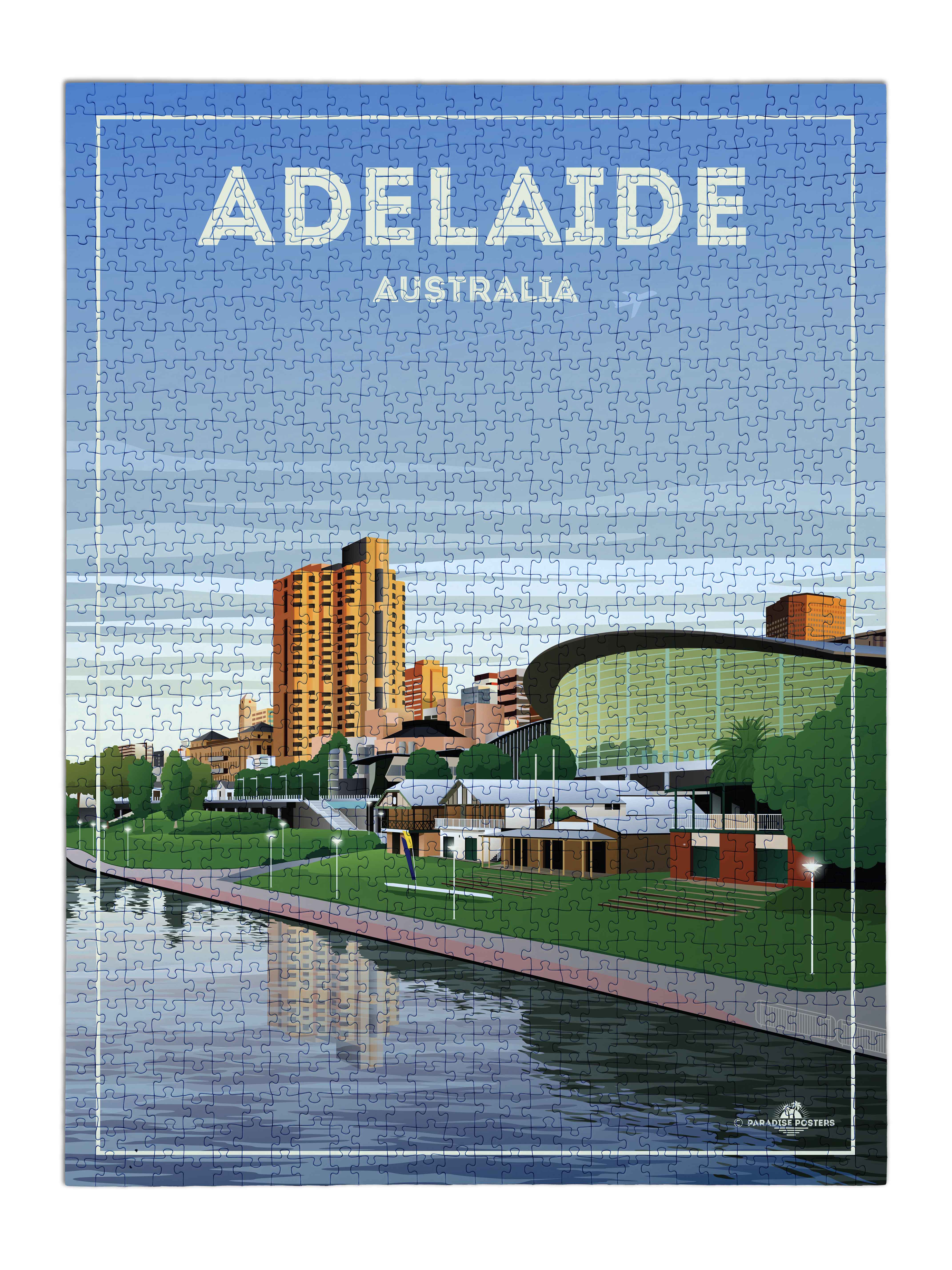 Step into the calm elegance of Adelaide’s skyline bathed in soft morning light. This artwork captures the city's architectural charm alongside the gentle flow of the river, framed by a tranquil sky where a solitary plane hints at adventure beyond.