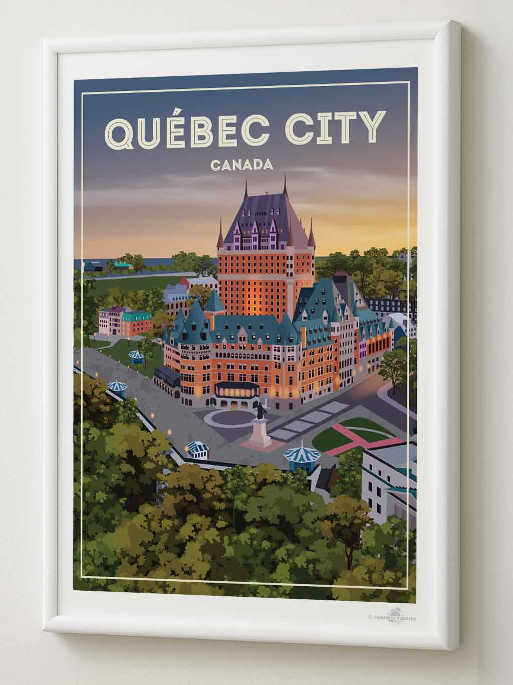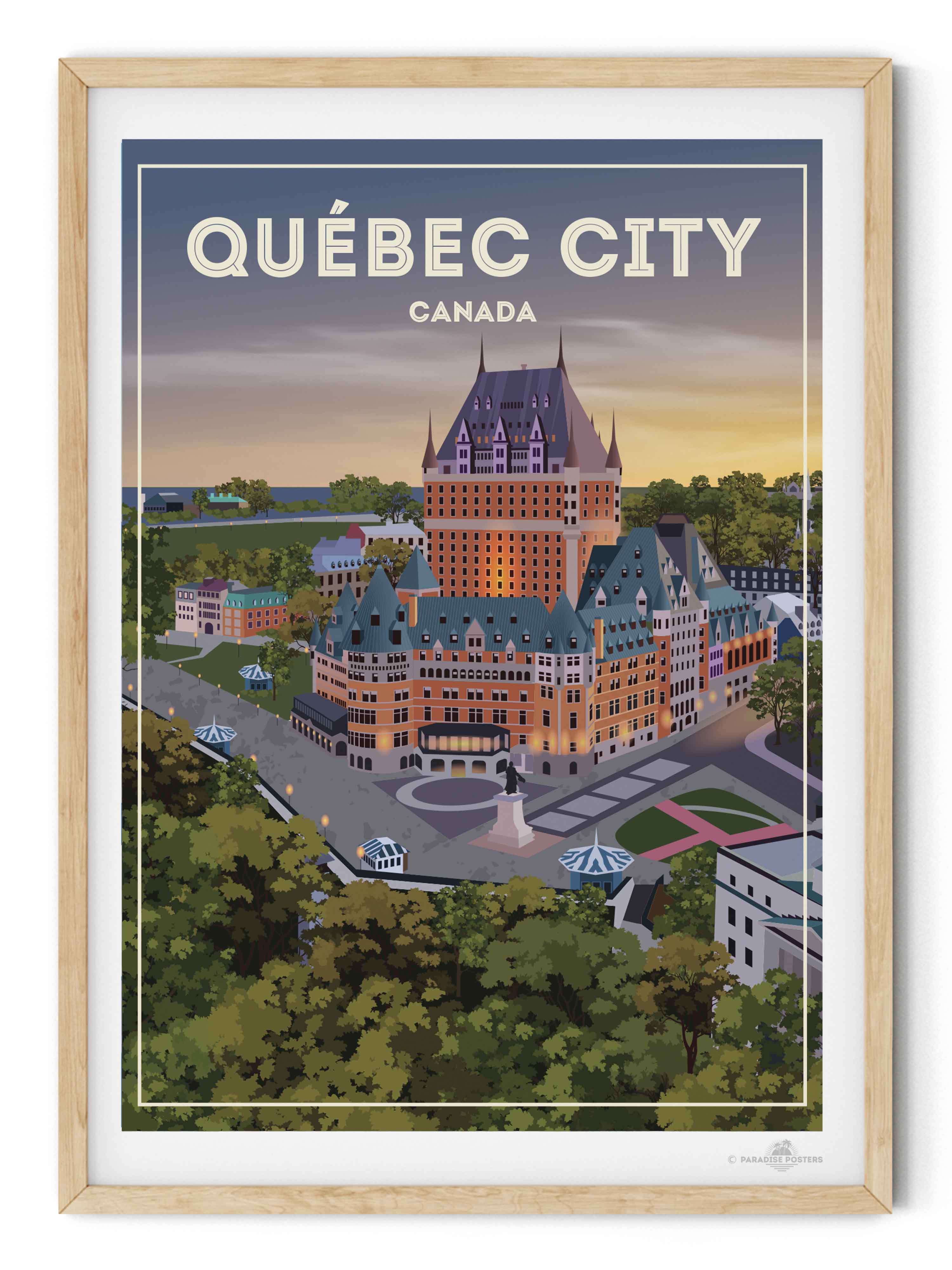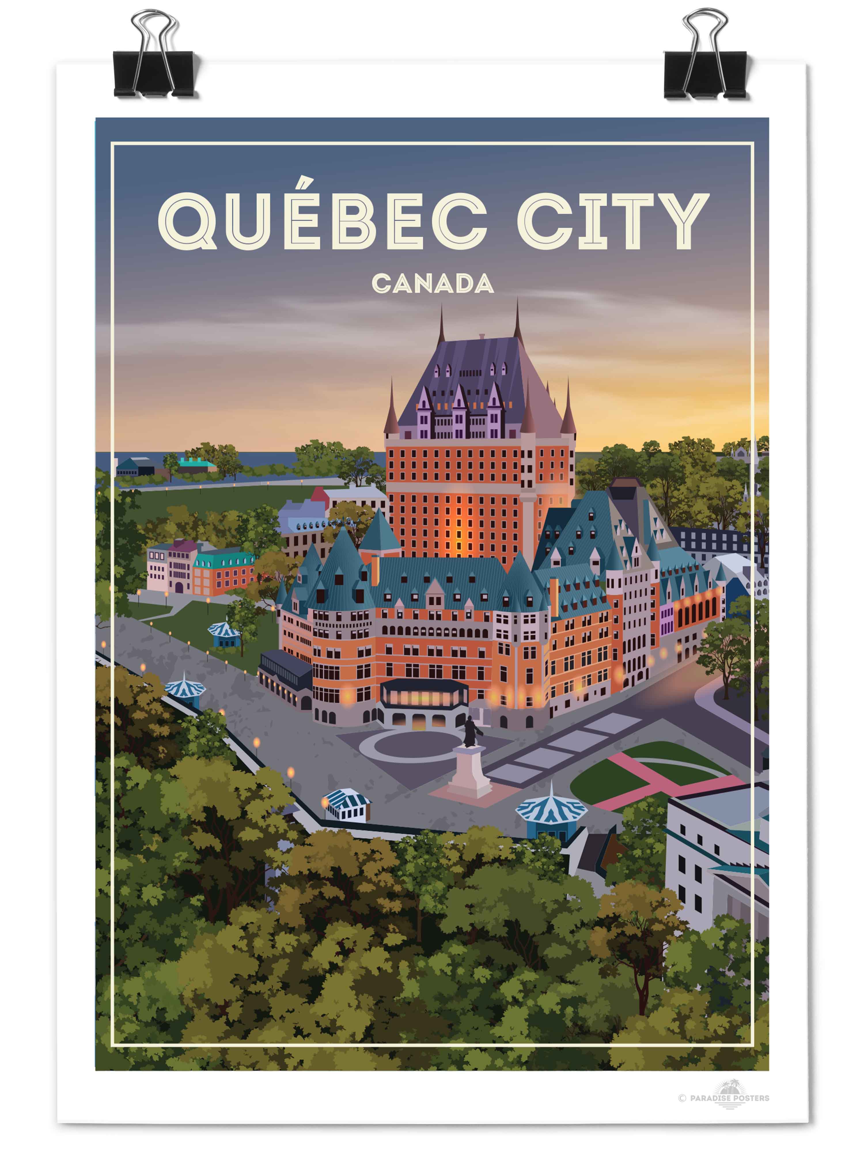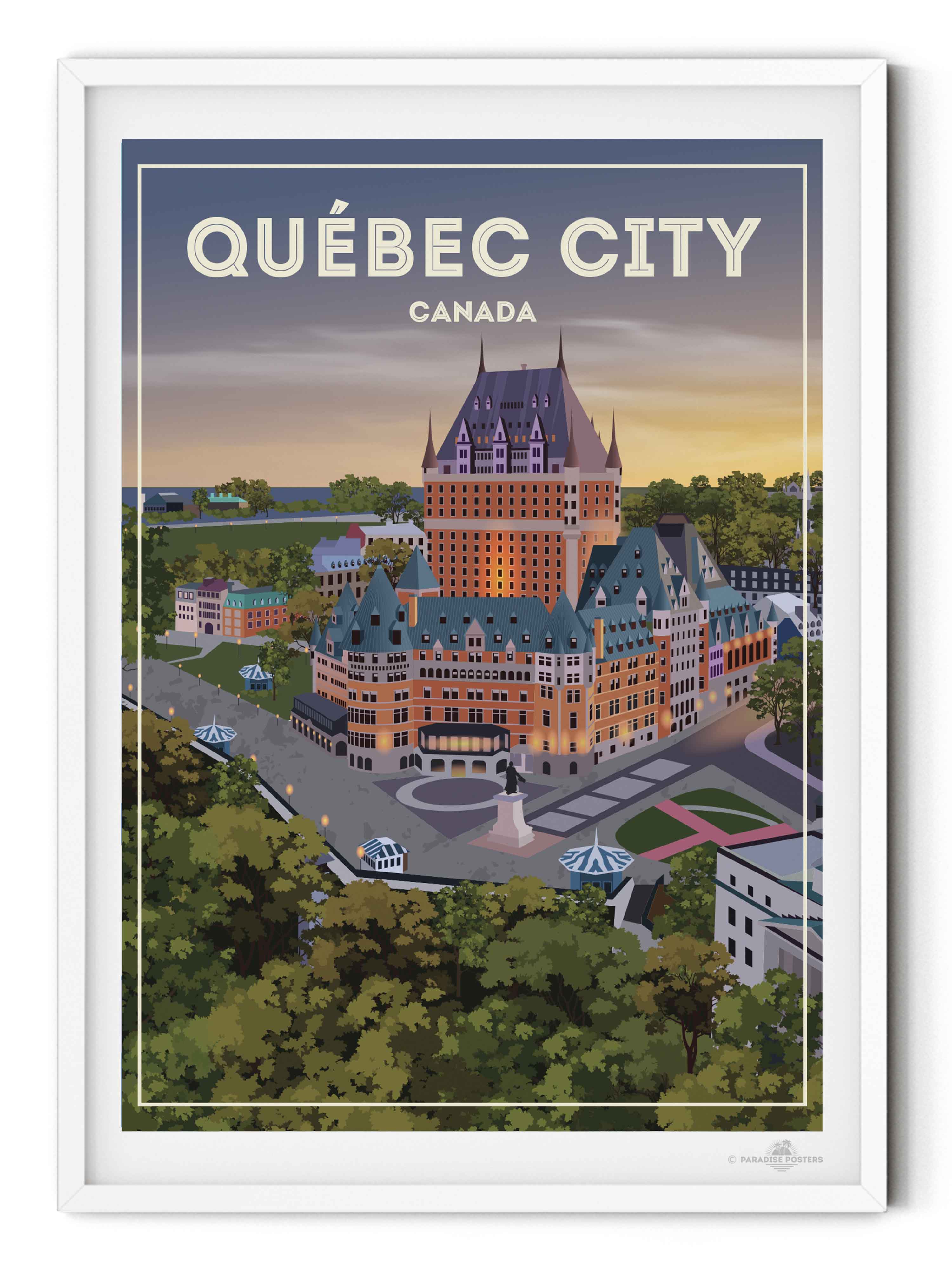 Step into the serene charm of Québec City at twilight with this beautifully illustrated poster. The iconic Château Frontenac stands majestically, its warm lights glowing against a dusk sky that blends soft purples and amber hues. The detailed urban scene, framed by lush green trees, invites a moment of calm and reflection.