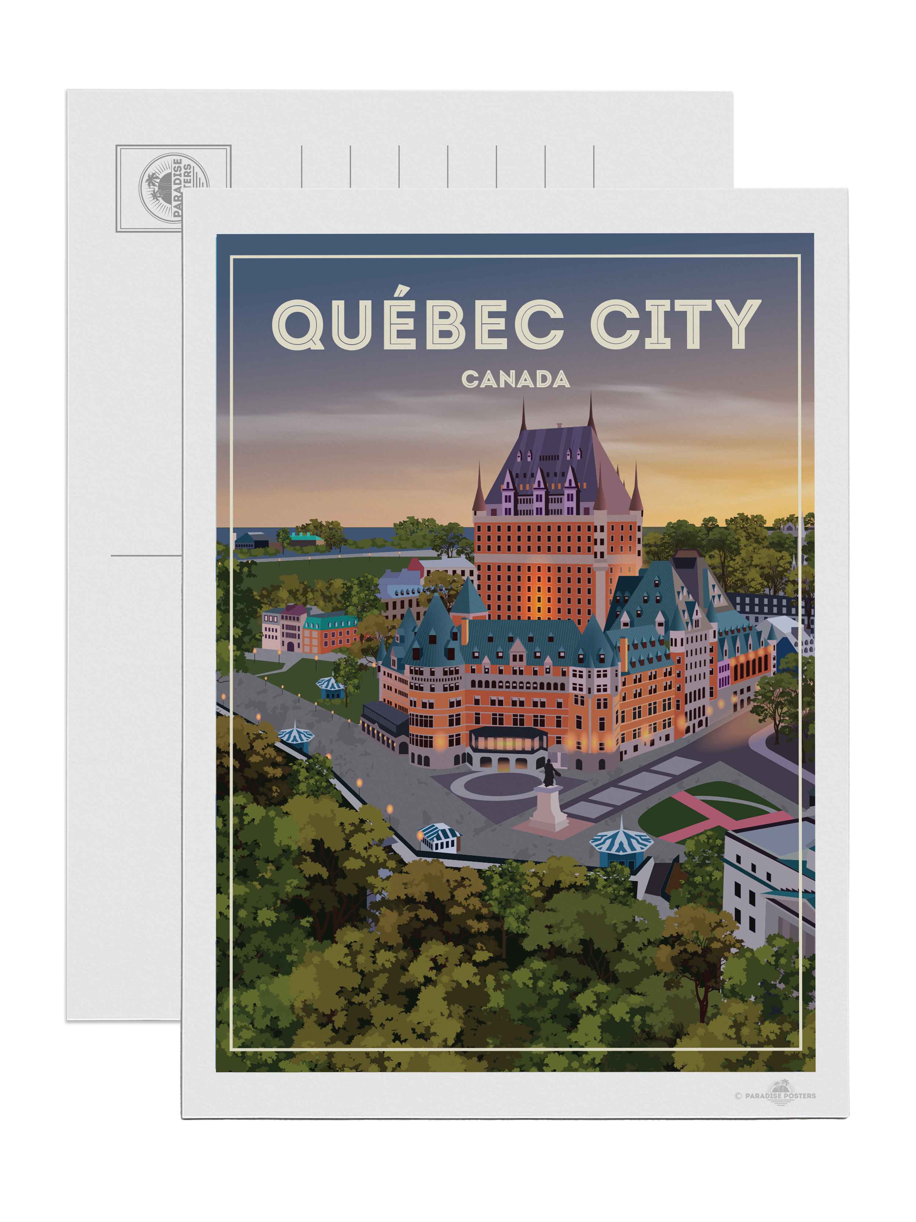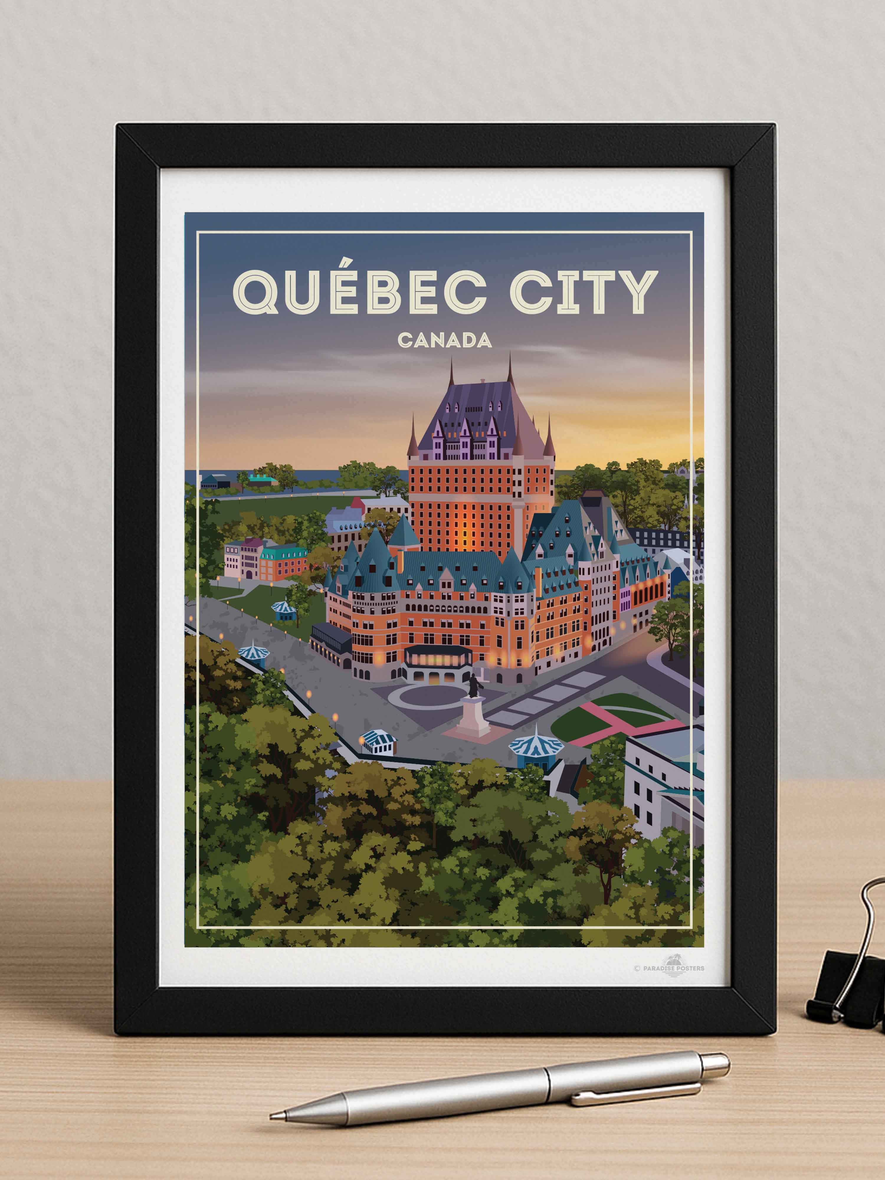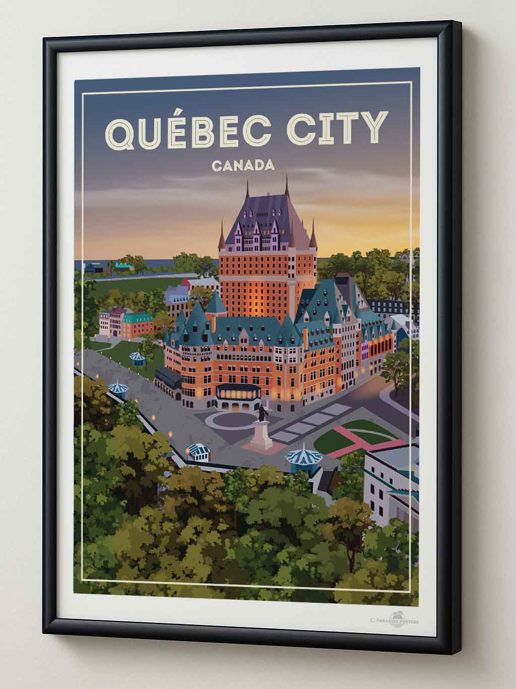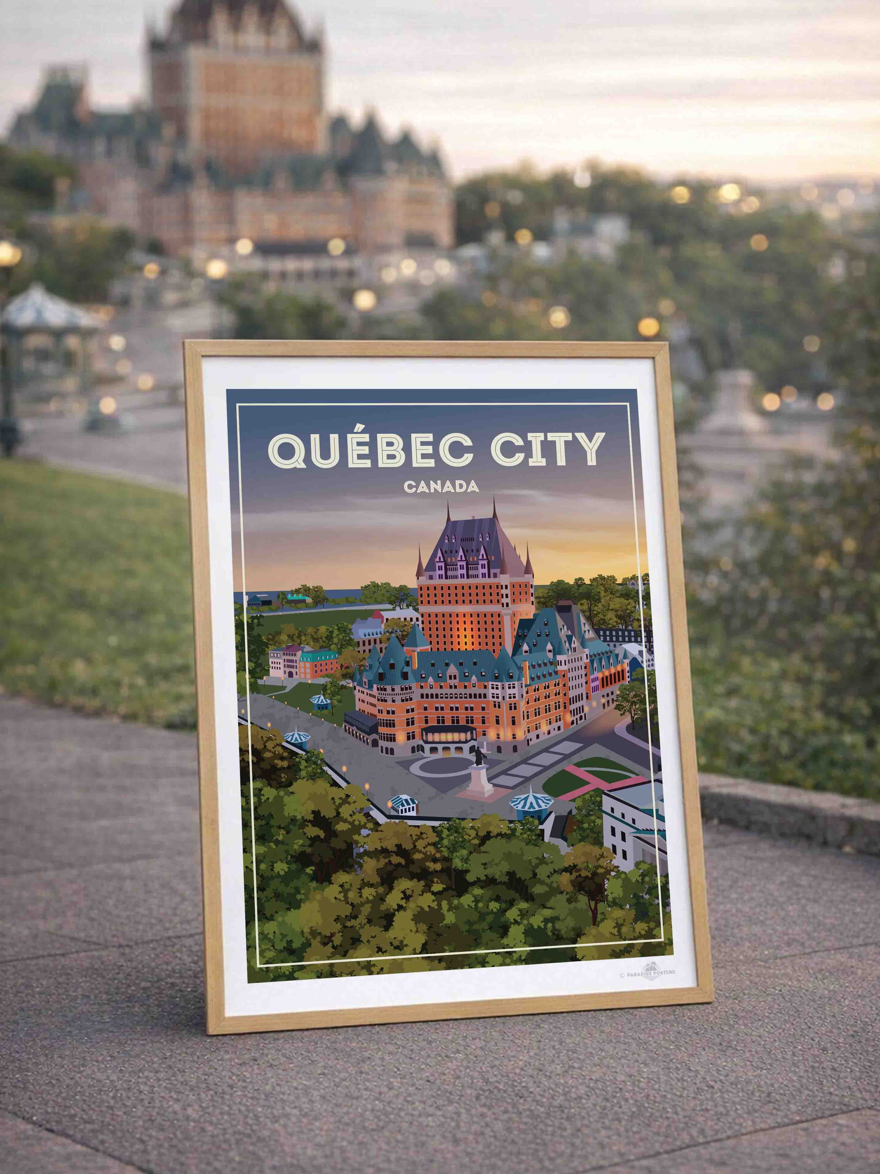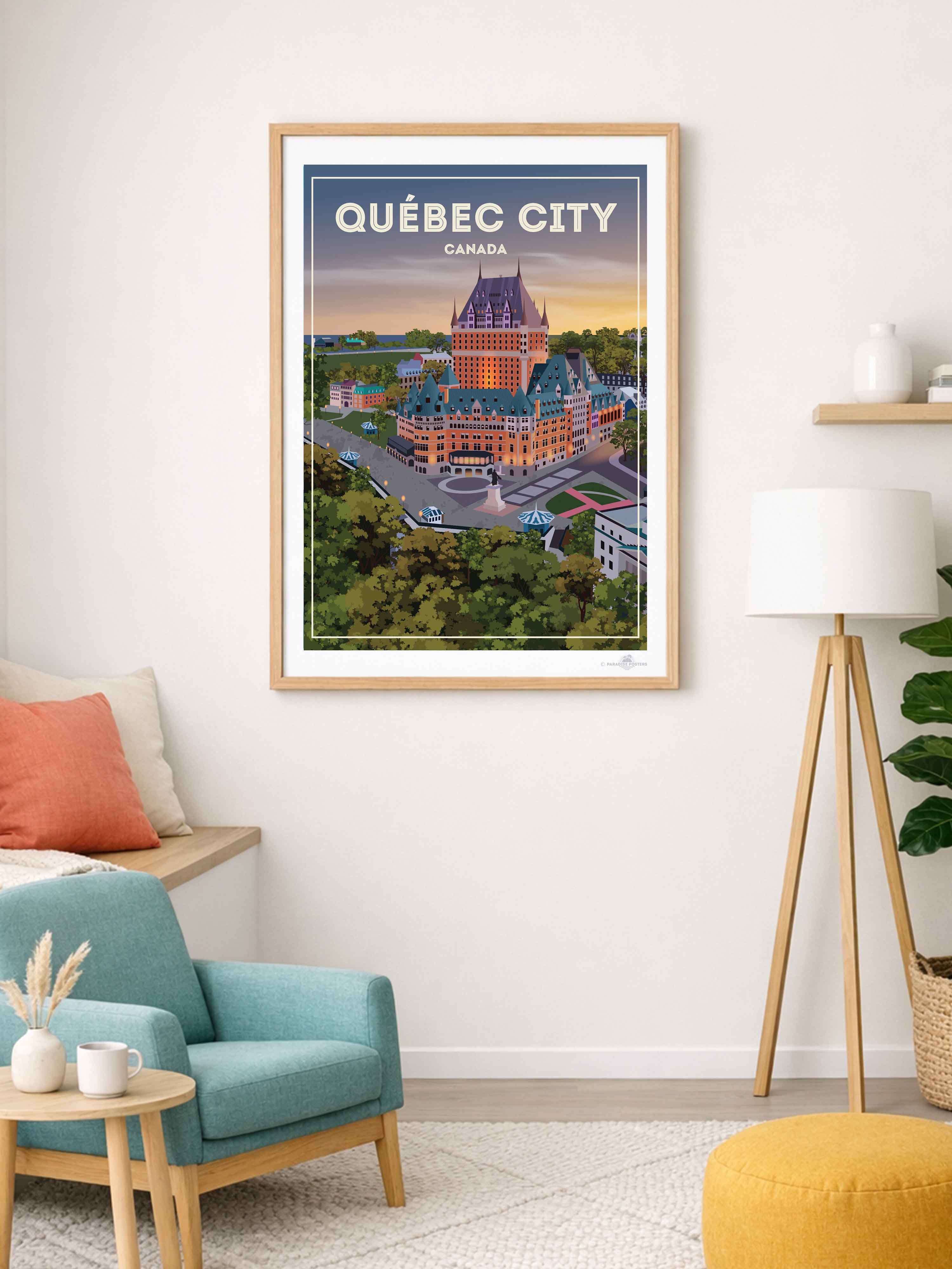 Step into the serene charm of Québec City at twilight with this beautifully illustrated poster. The iconic Château Frontenac stands majestically, its warm lights glowing against a dusk sky that blends soft purples and amber hues. The detailed urban scene, framed by lush green trees, invites a moment of calm and reflection.