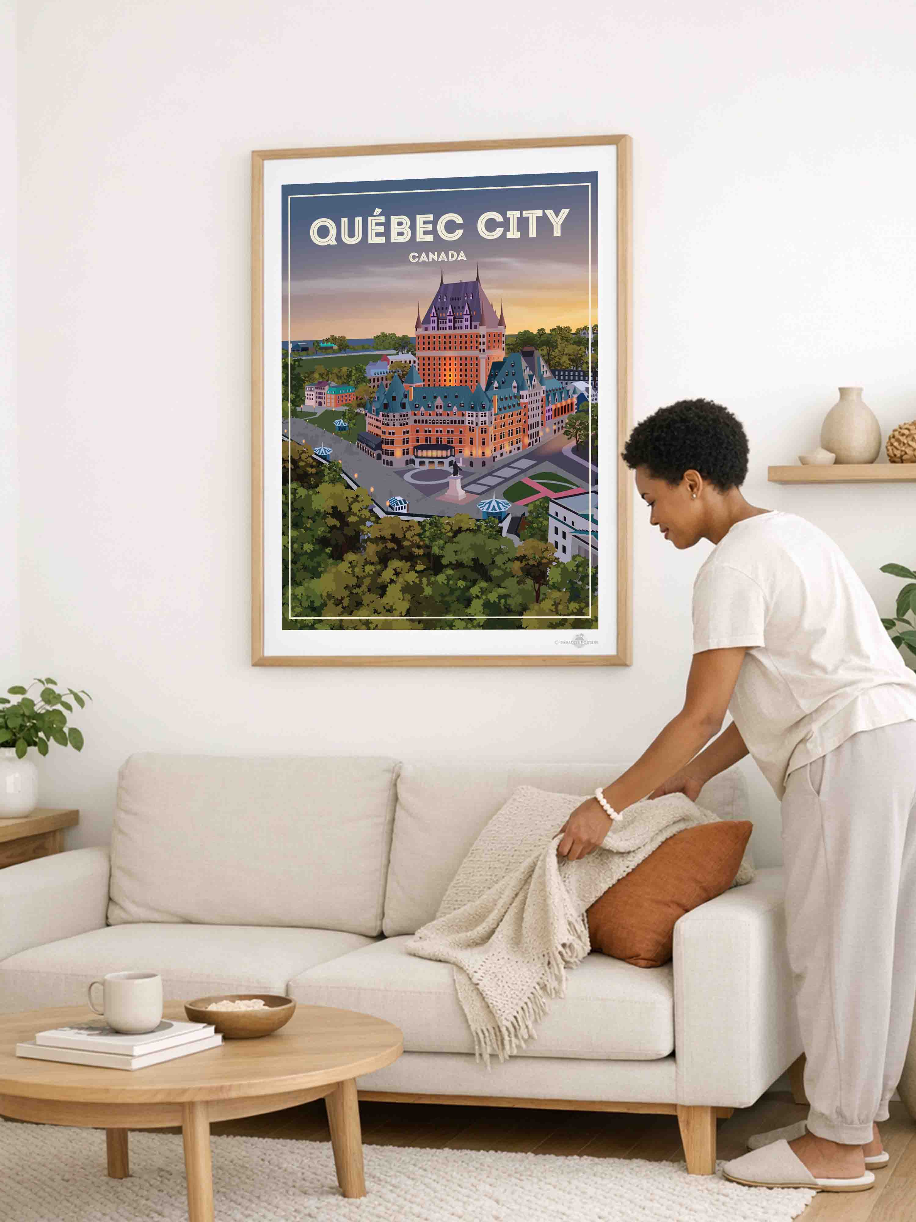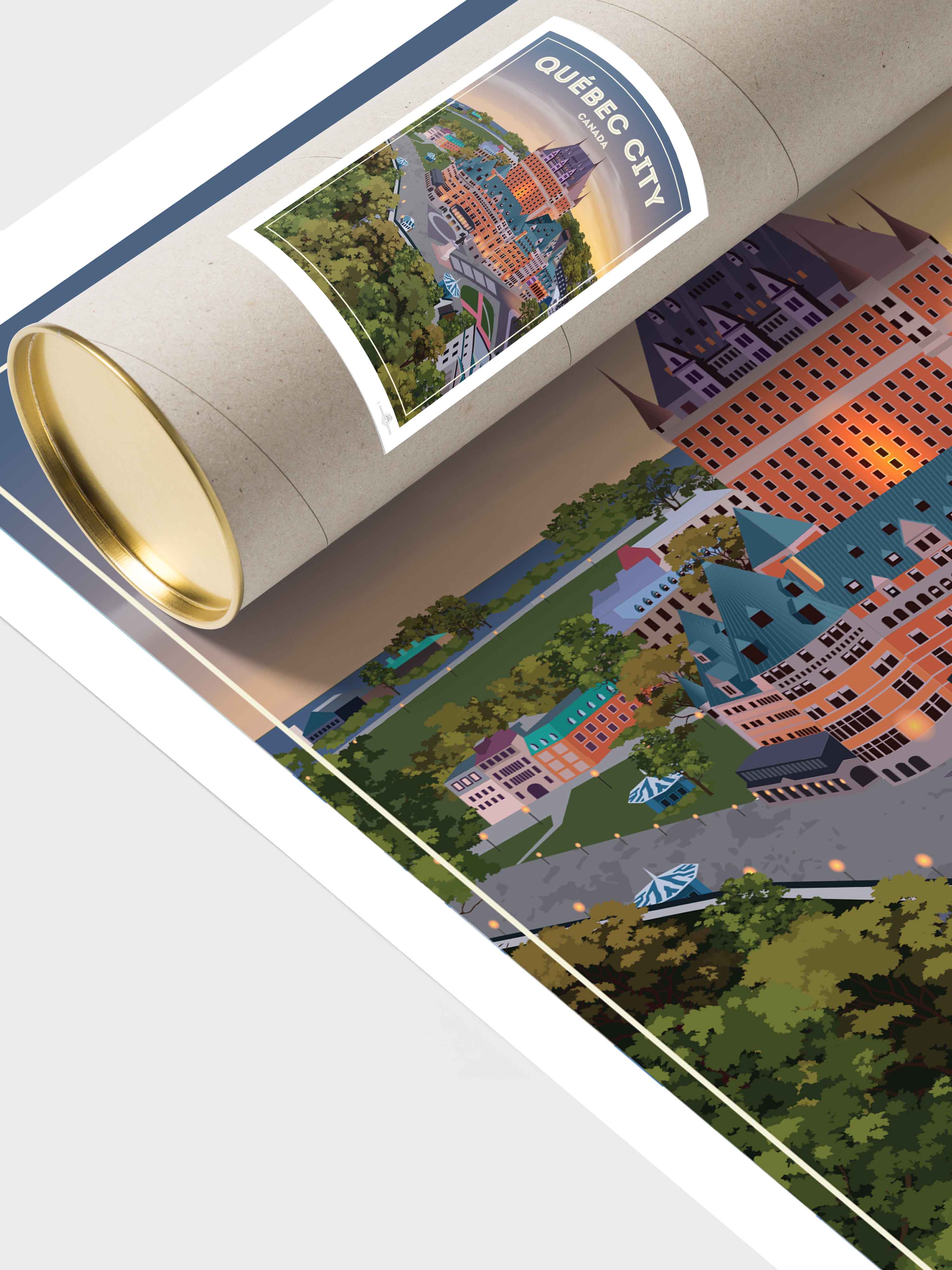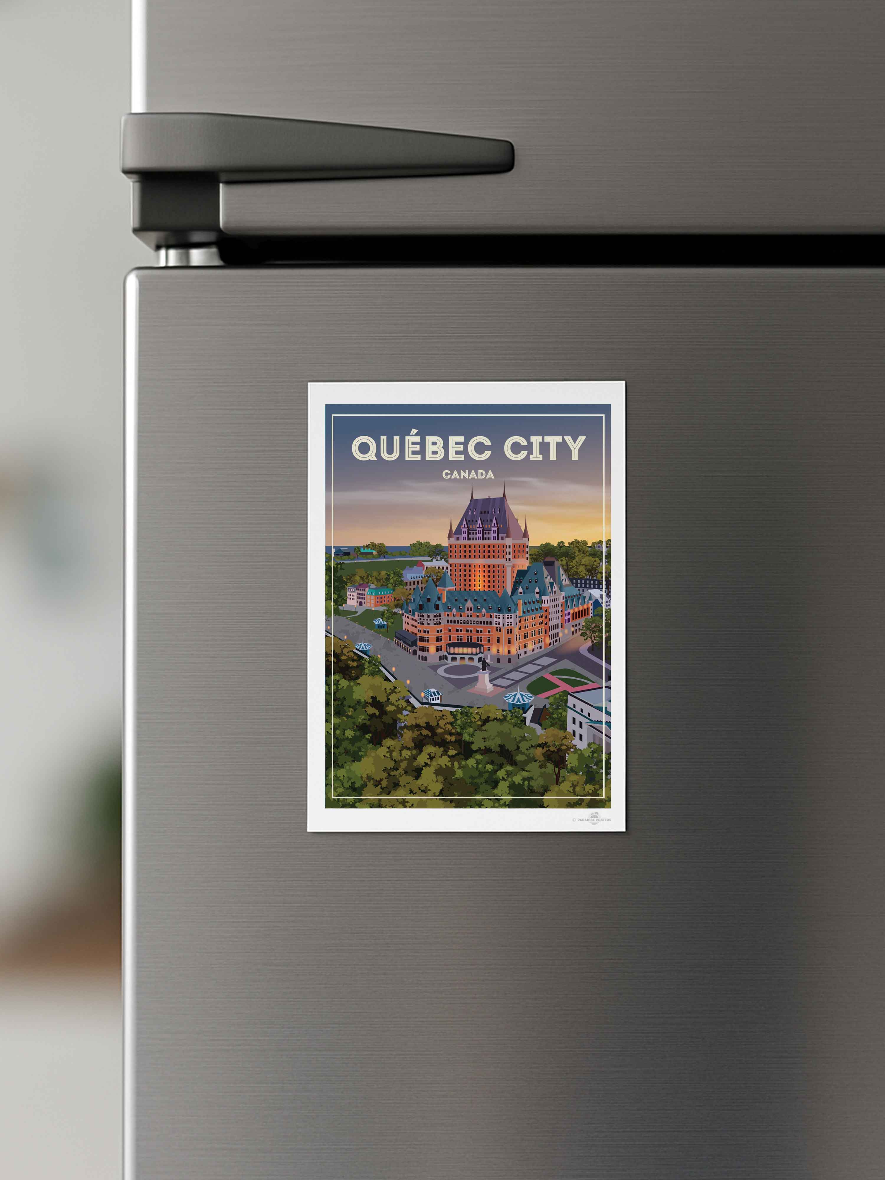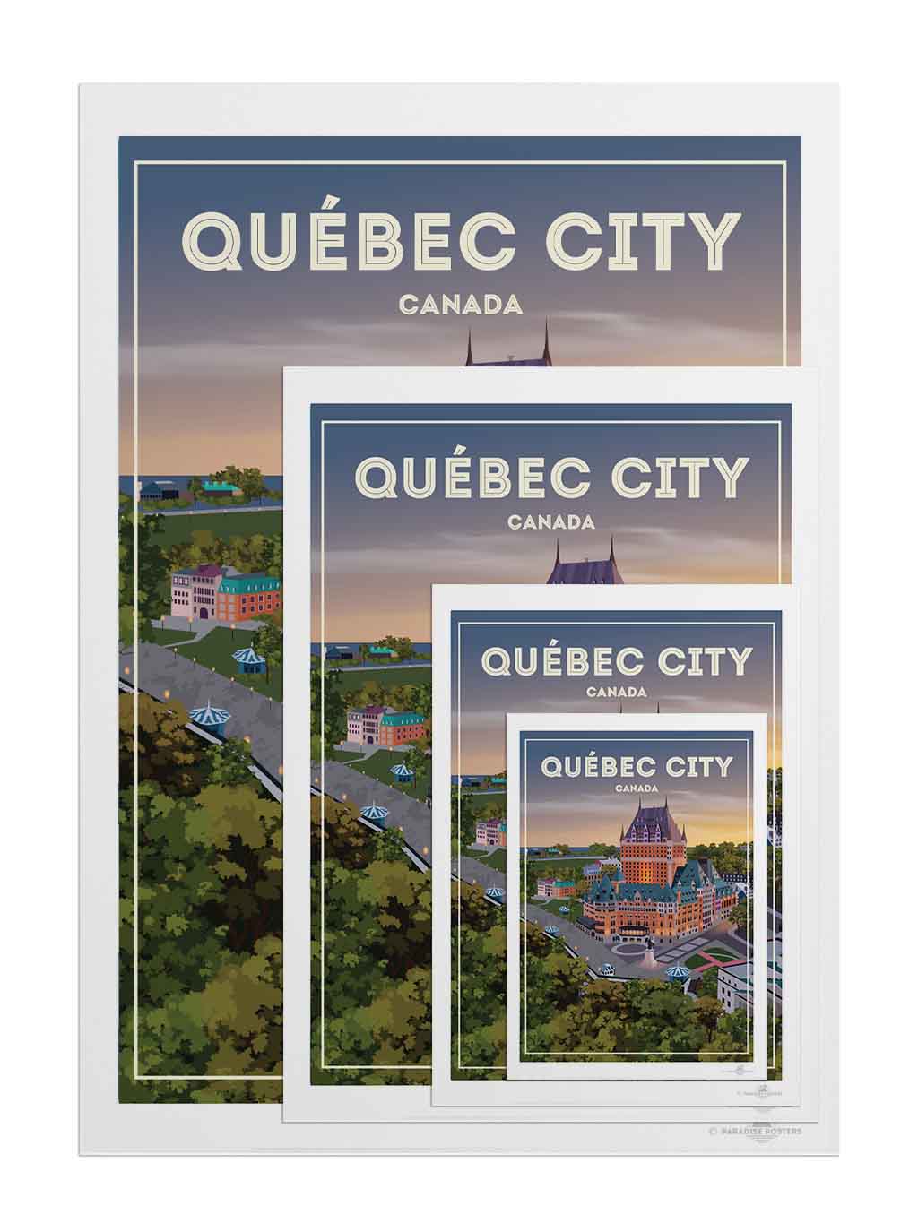 Step into the serene charm of Québec City at twilight with this beautifully illustrated poster. The iconic Château Frontenac stands majestically, its warm lights glowing against a dusk sky that blends soft purples and amber hues. The detailed urban scene, framed by lush green trees, invites a moment of calm and reflection.