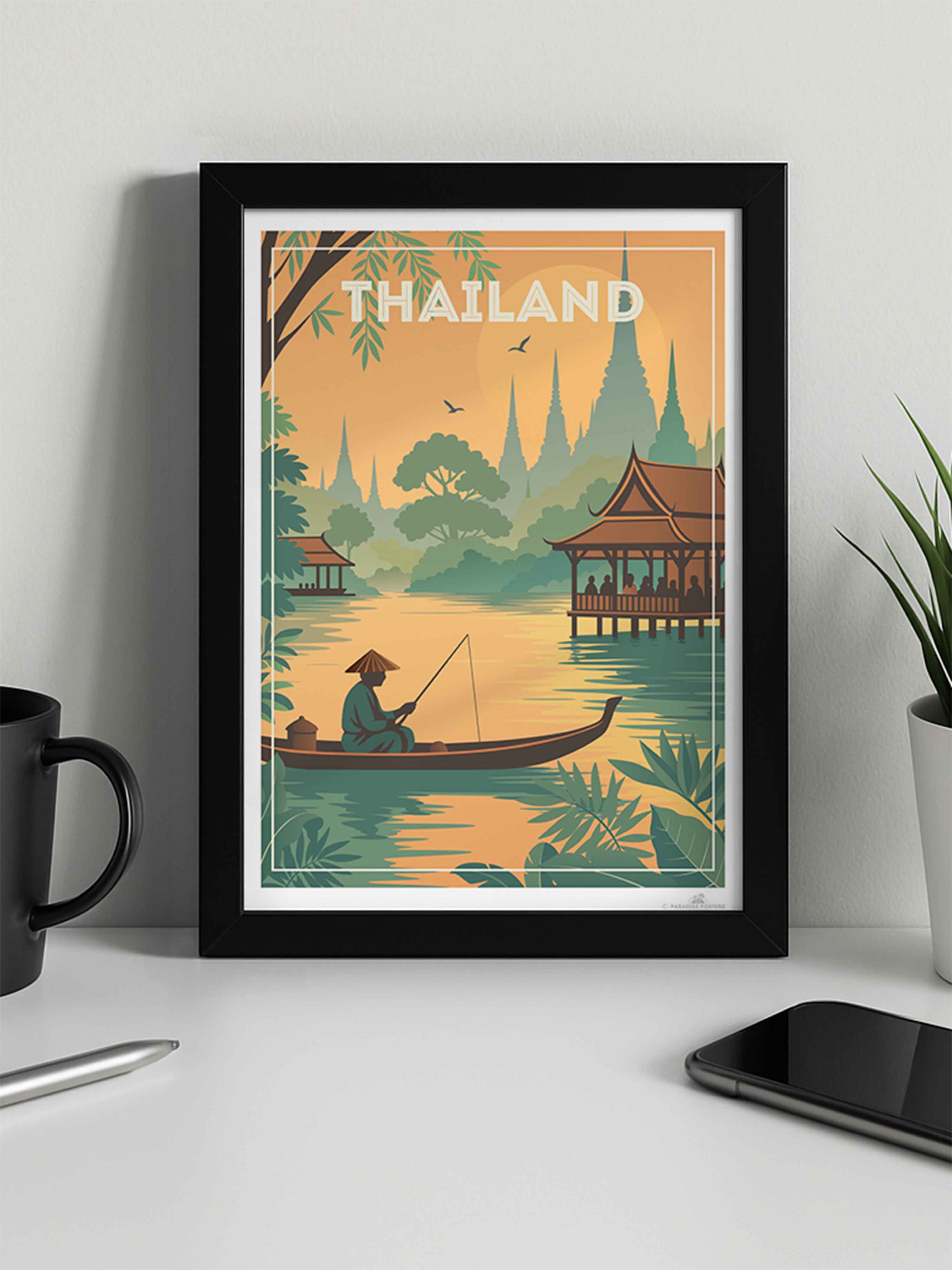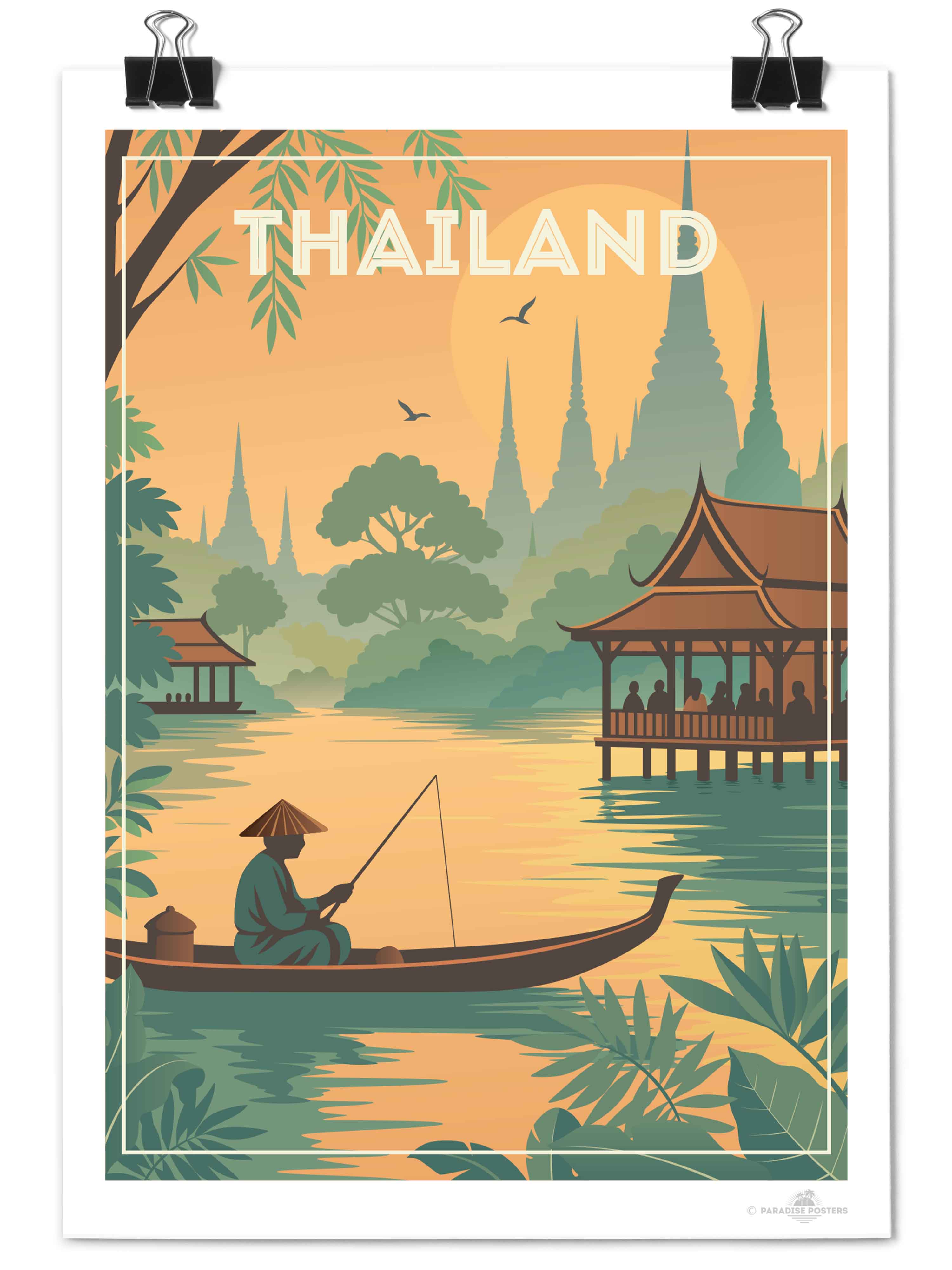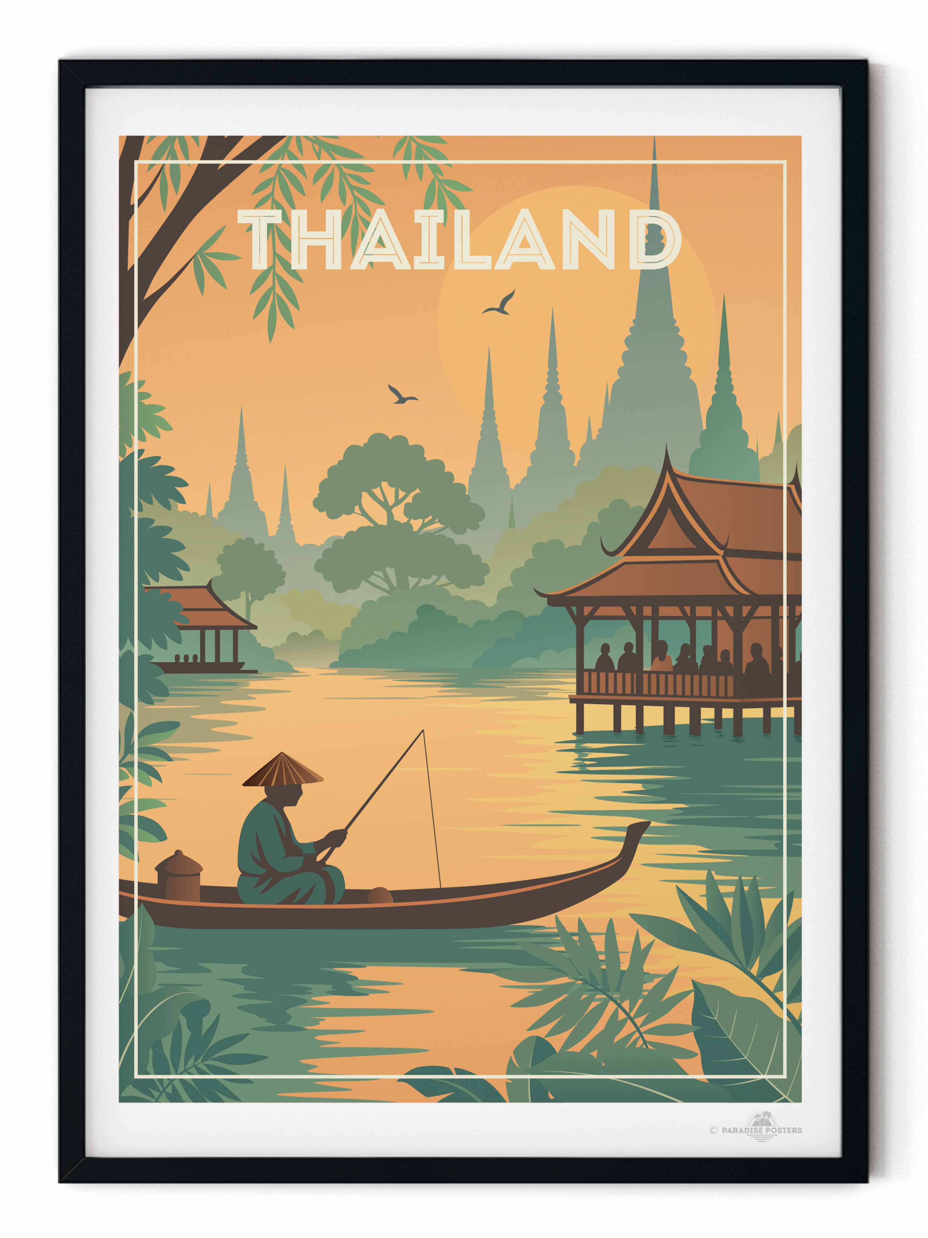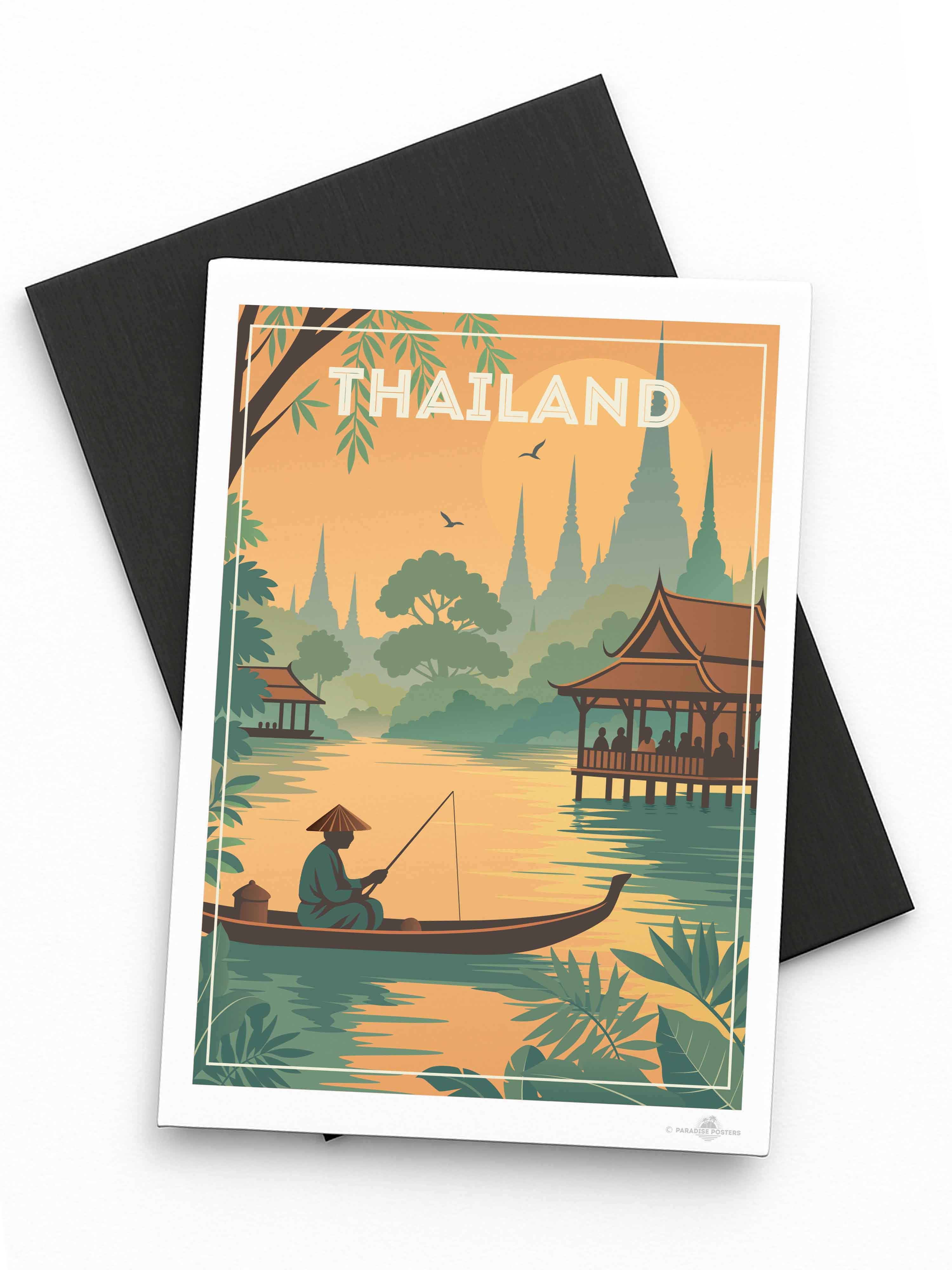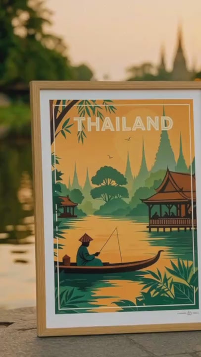 Step into the tranquil beauty of Thailand with this evocative travel poster from our Thailand collection. This serene scene captures a lone fisherman gliding through golden waters at sunset, surrounded by lush jungle foliage and silhouetted temple spires rising in the distance. Traditional Thai architecture frames the peaceful riverside, evoking the country's rich culture, spirituality, and harmony with nature.