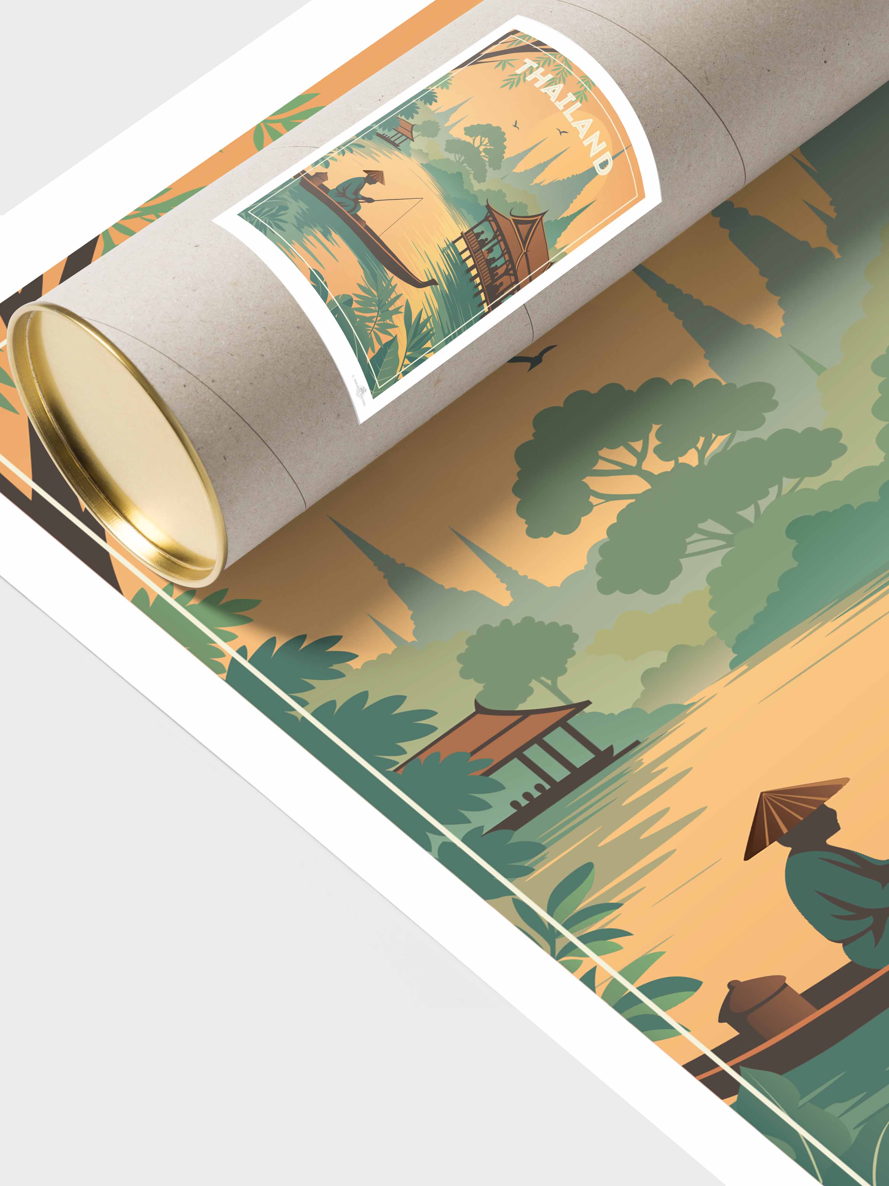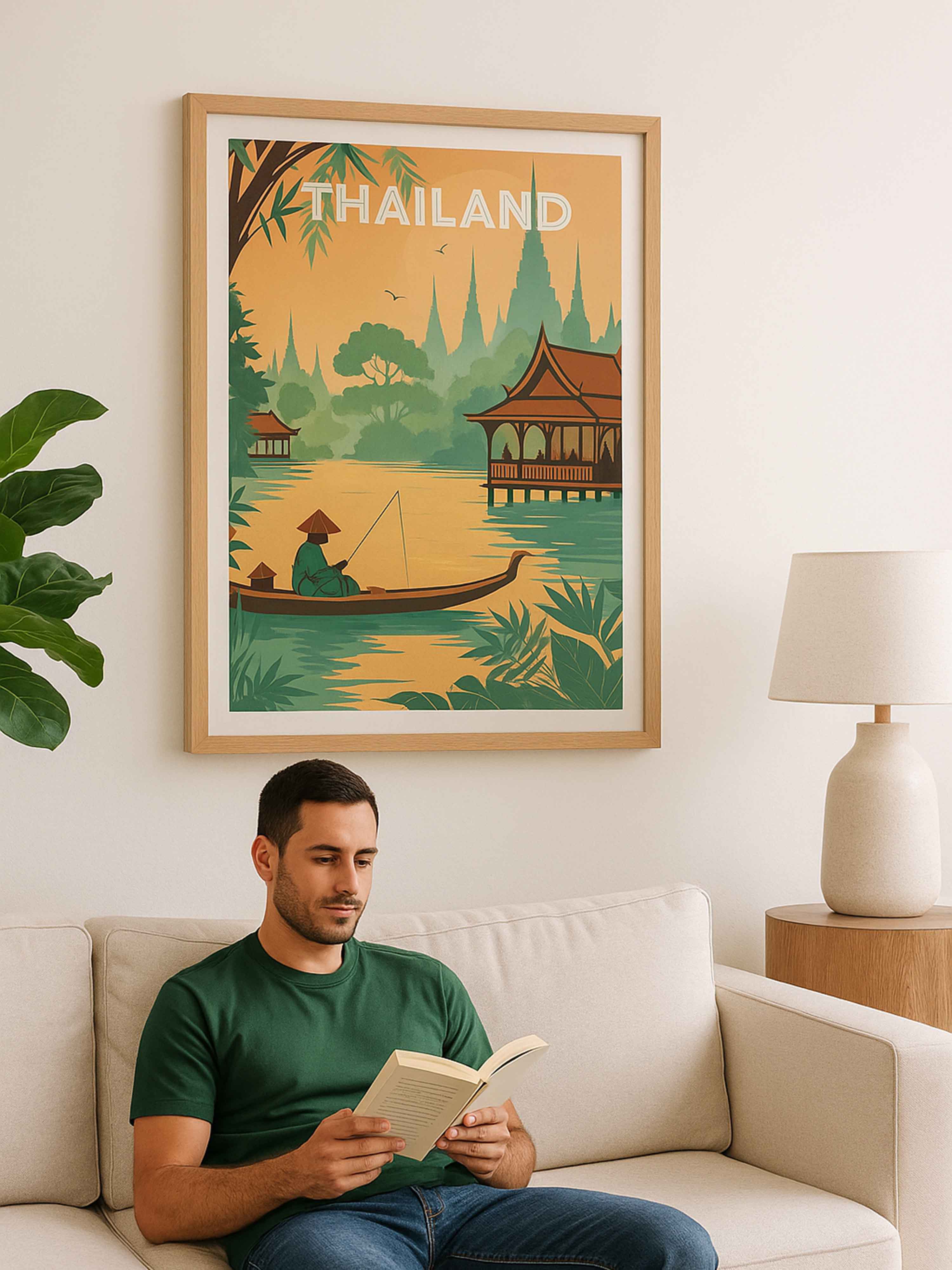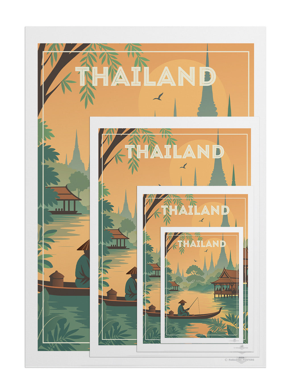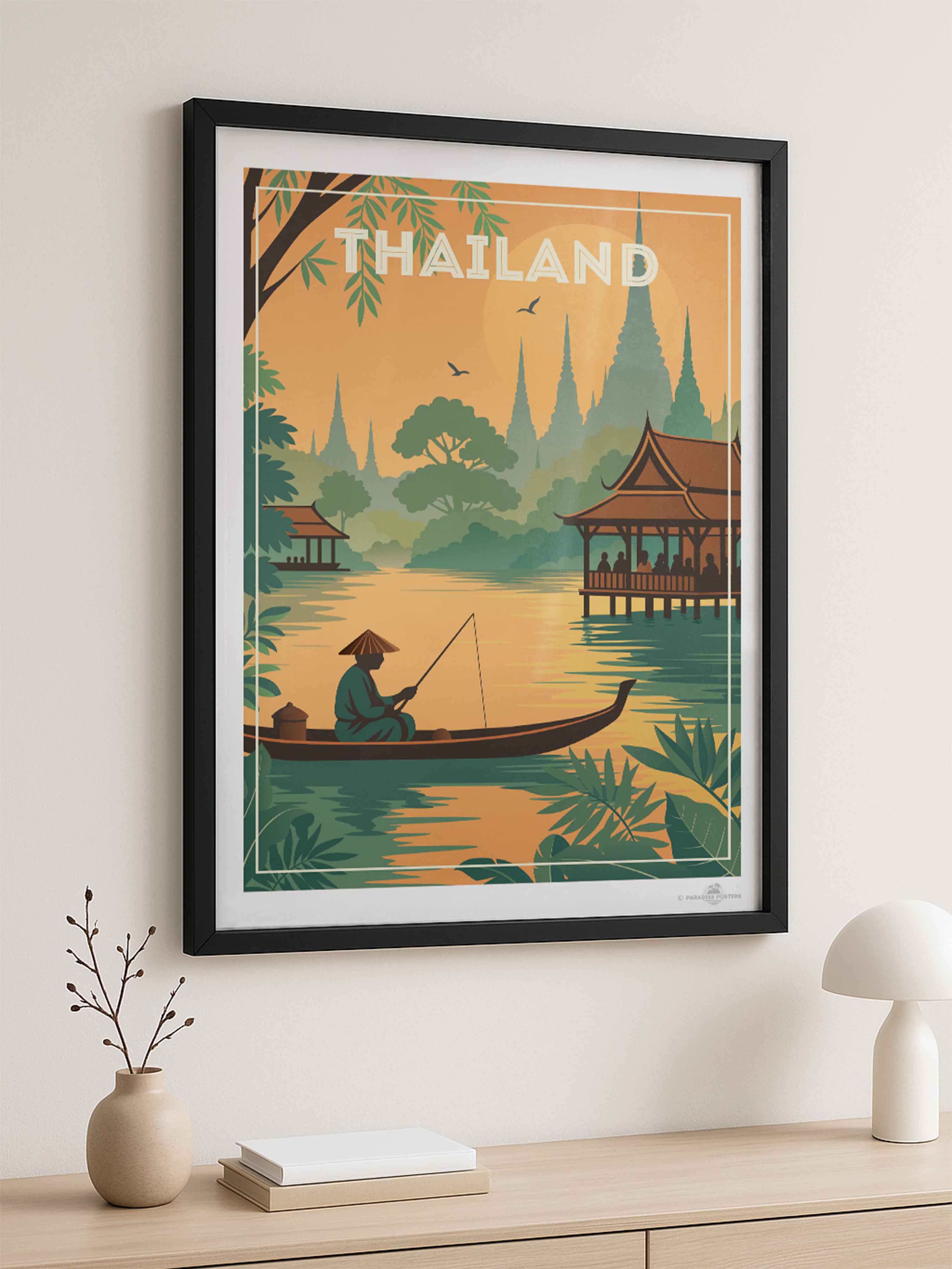 Step into the tranquil beauty of Thailand with this evocative travel poster from our Thailand collection. This serene scene captures a lone fisherman gliding through golden waters at sunset, surrounded by lush jungle foliage and silhouetted temple spires rising in the distance. Traditional Thai architecture frames the peaceful riverside, evoking the country's rich culture, spirituality, and harmony with nature.
